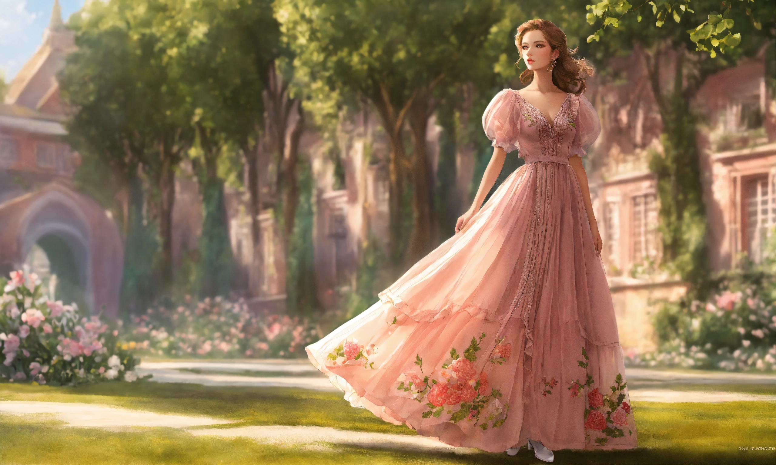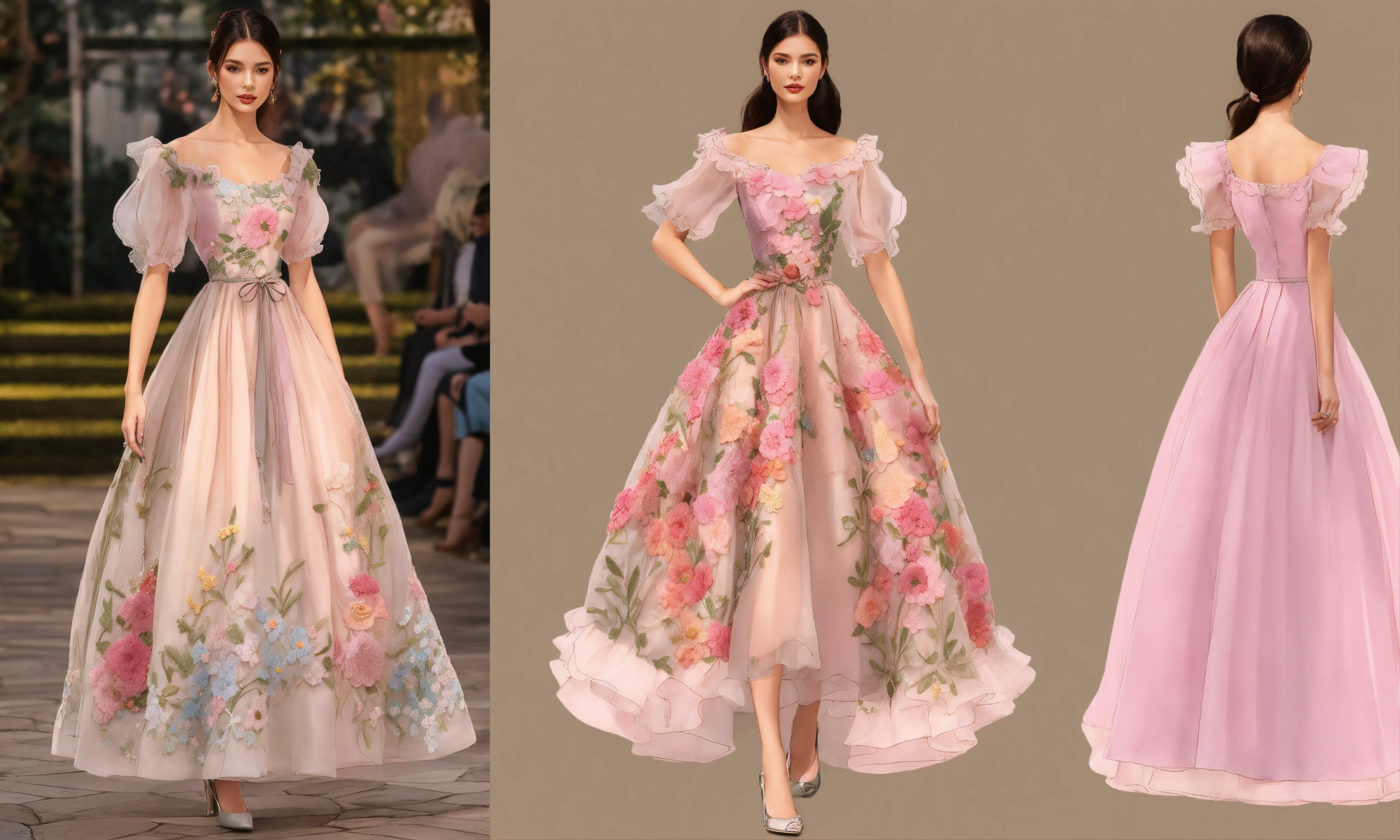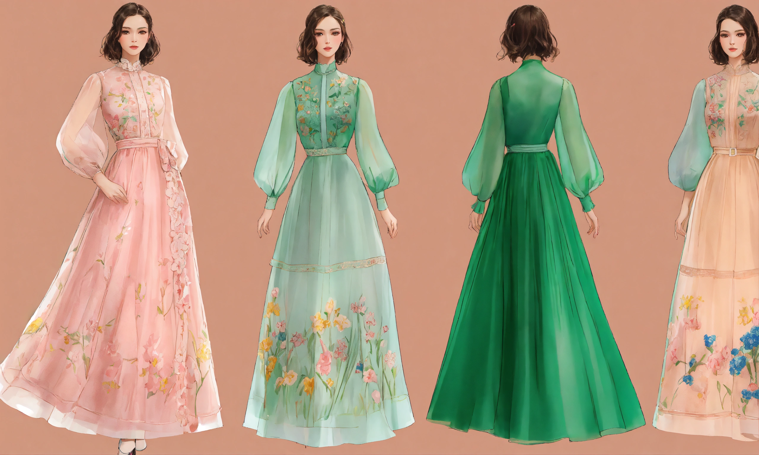 Illustrate a pretty spring dress with sleeves and a flowy skirt. illustrate dress with organdy, embroidery, and ruffles. 2023 fashion. photorealistic full-length. fashion plate