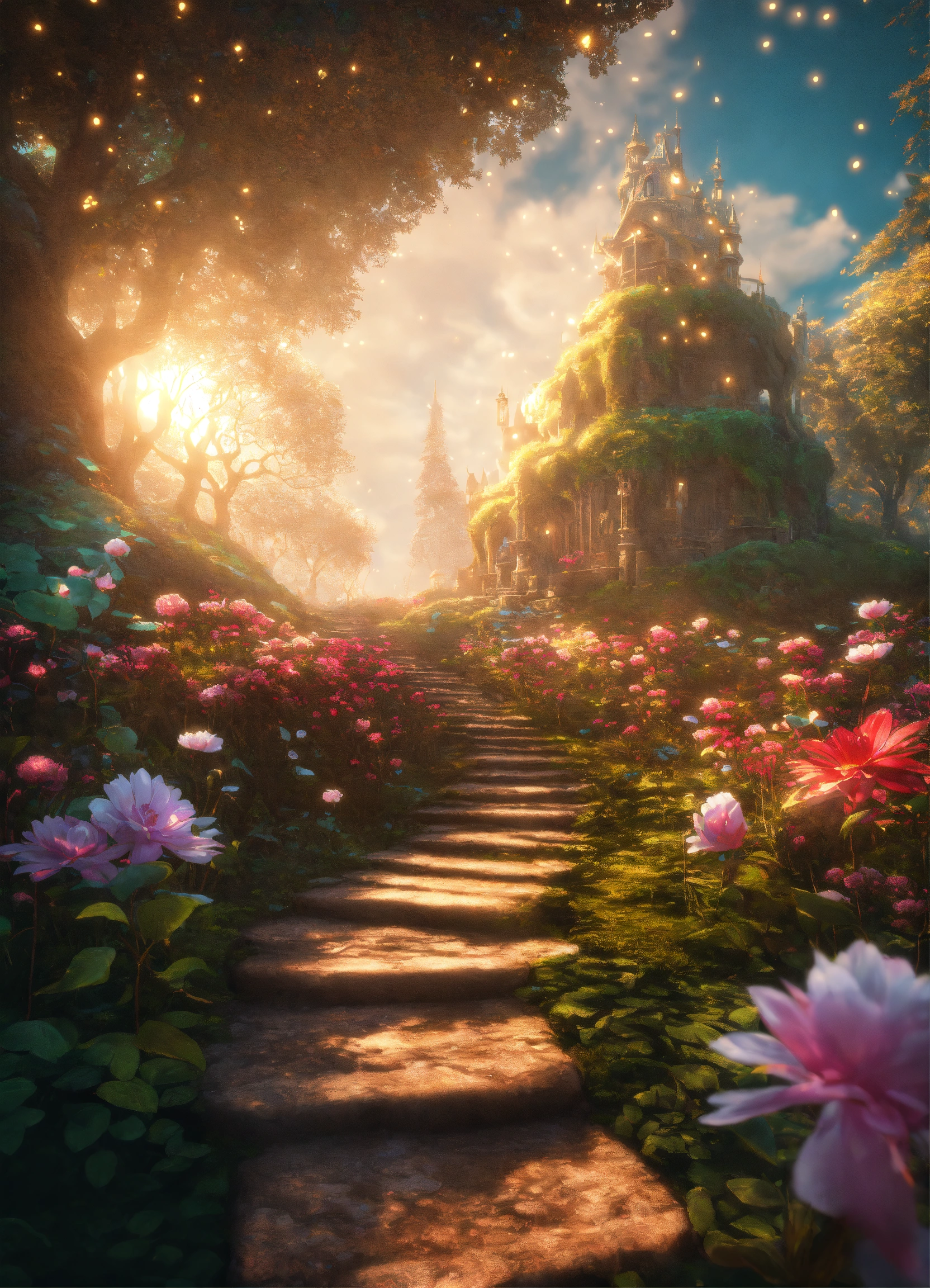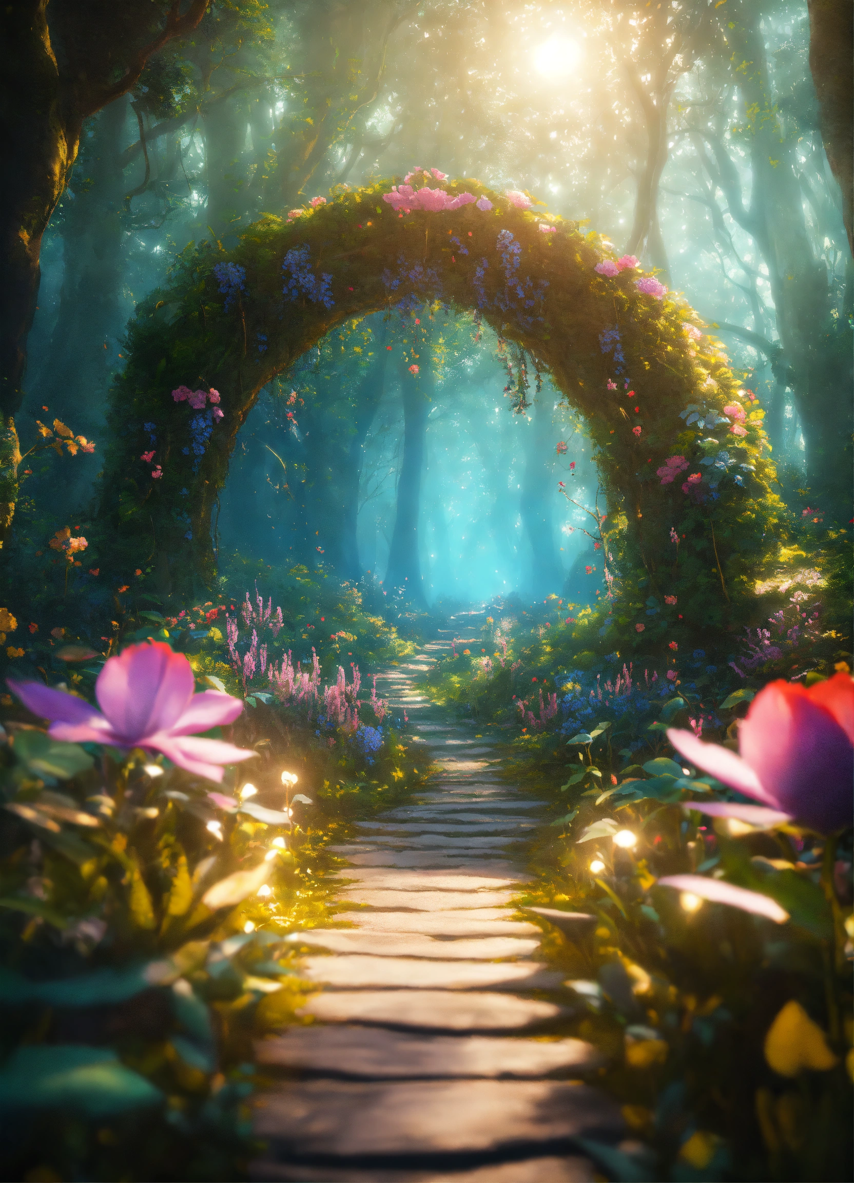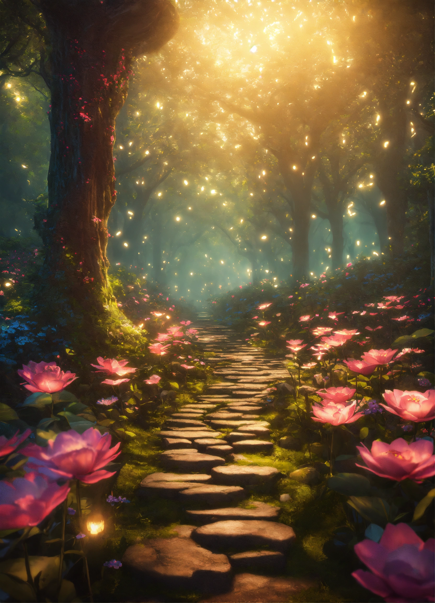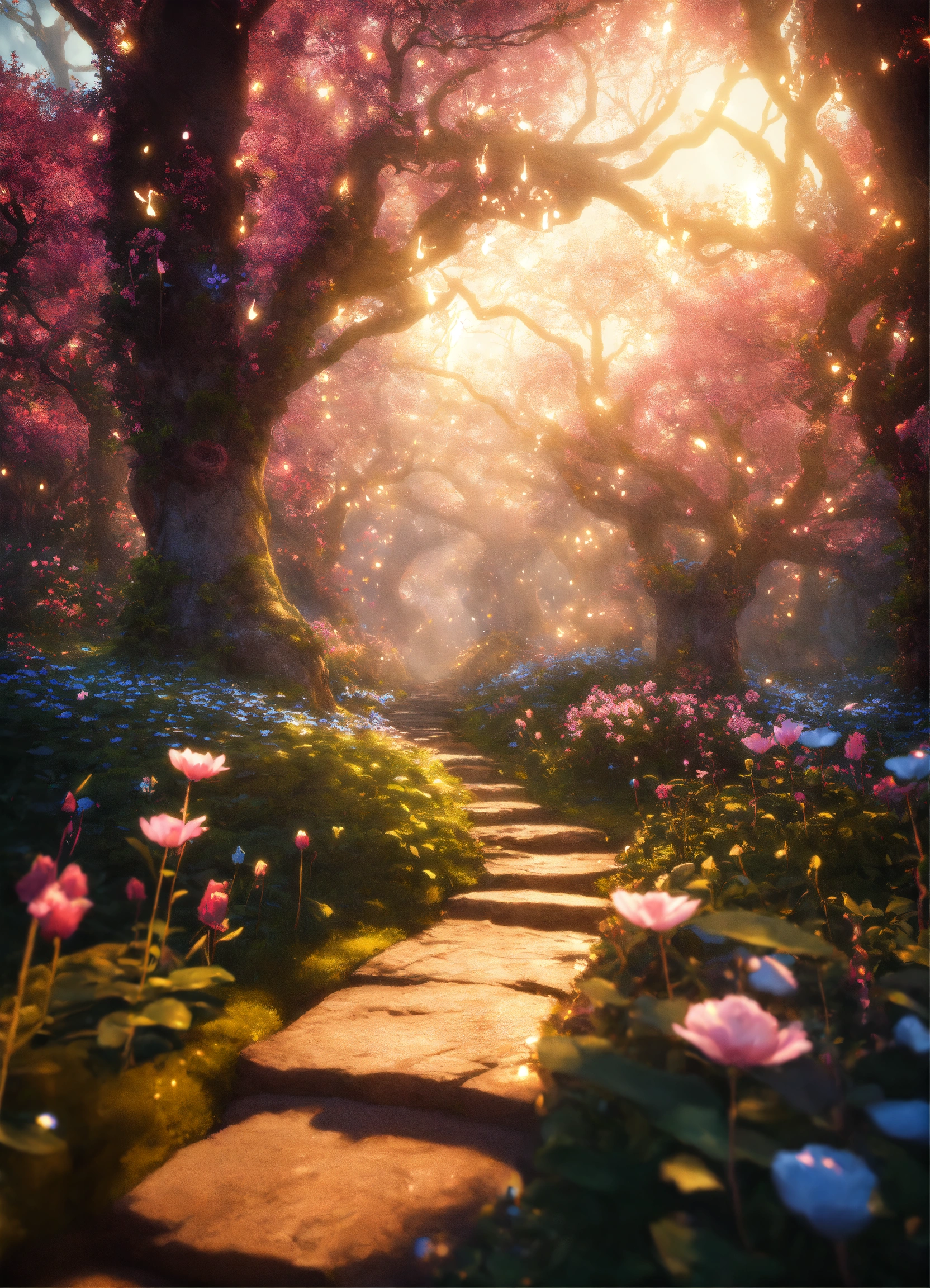 A path through enchanted woods with gigantic enchanted flowers, surreal, intricate details, epic scene, beautiful ethereal illumination, fairytale, magical, unreal engine