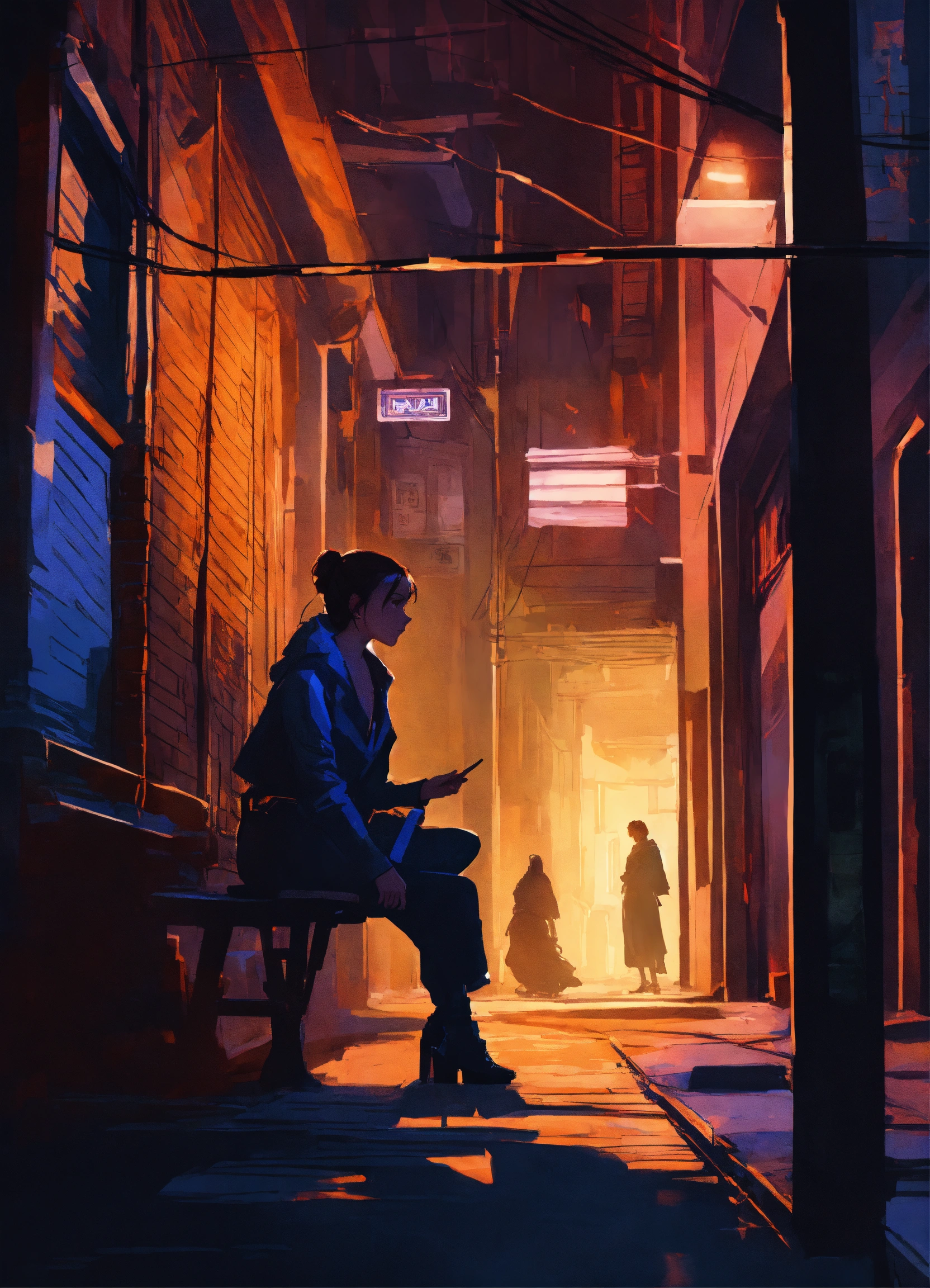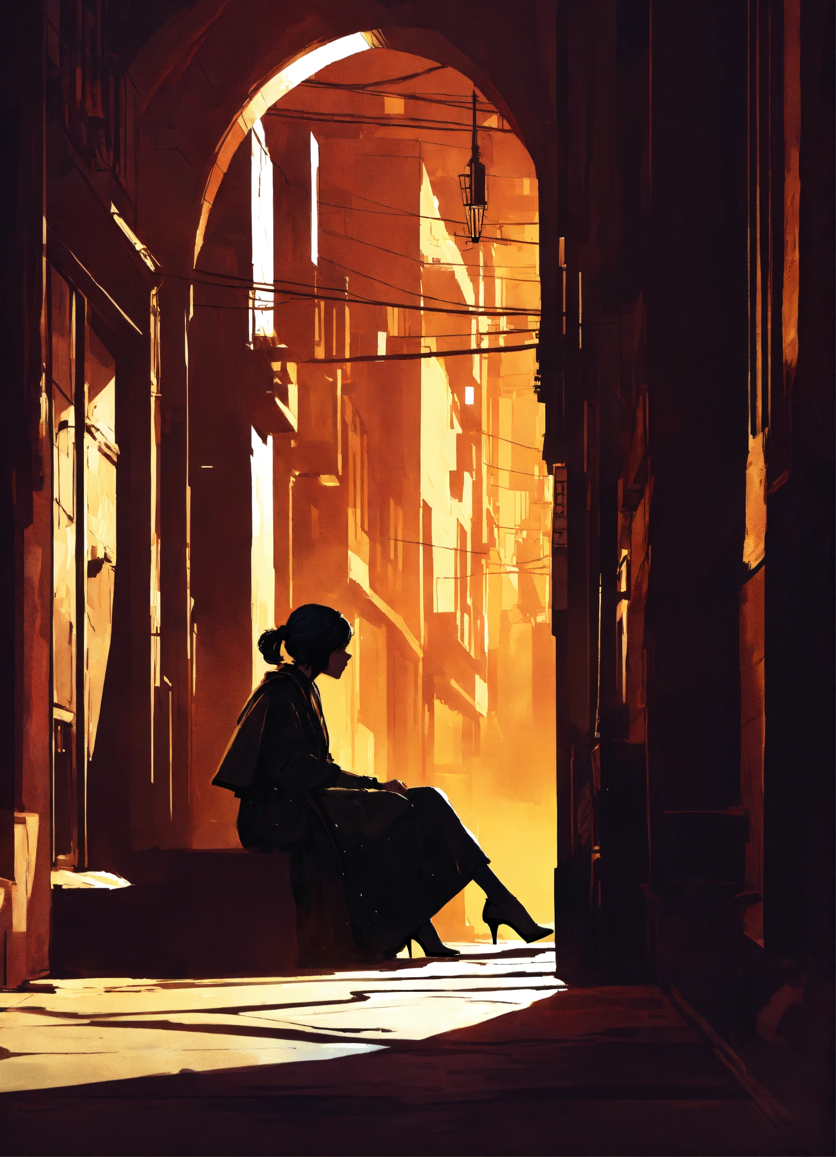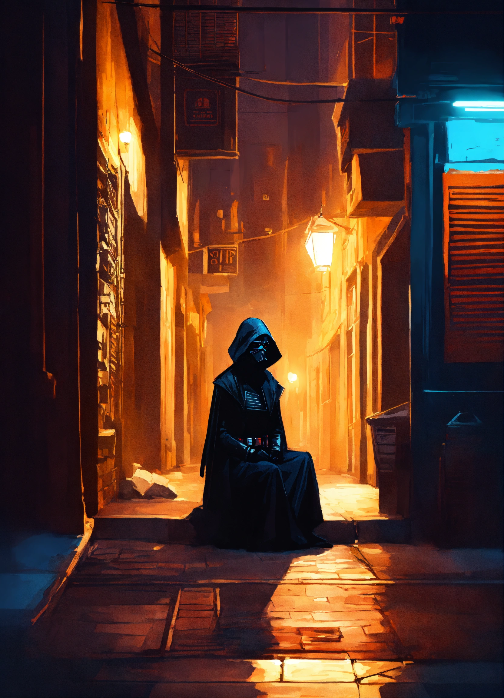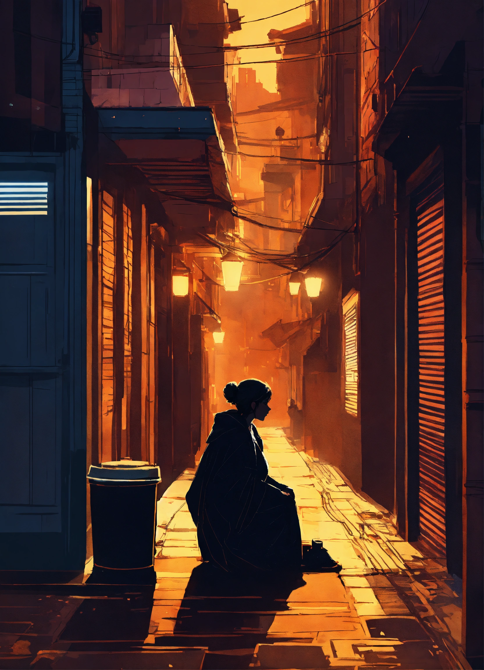 Character concept art of a star wars silhouetted woman sitting in the shadows of an alleyway at night