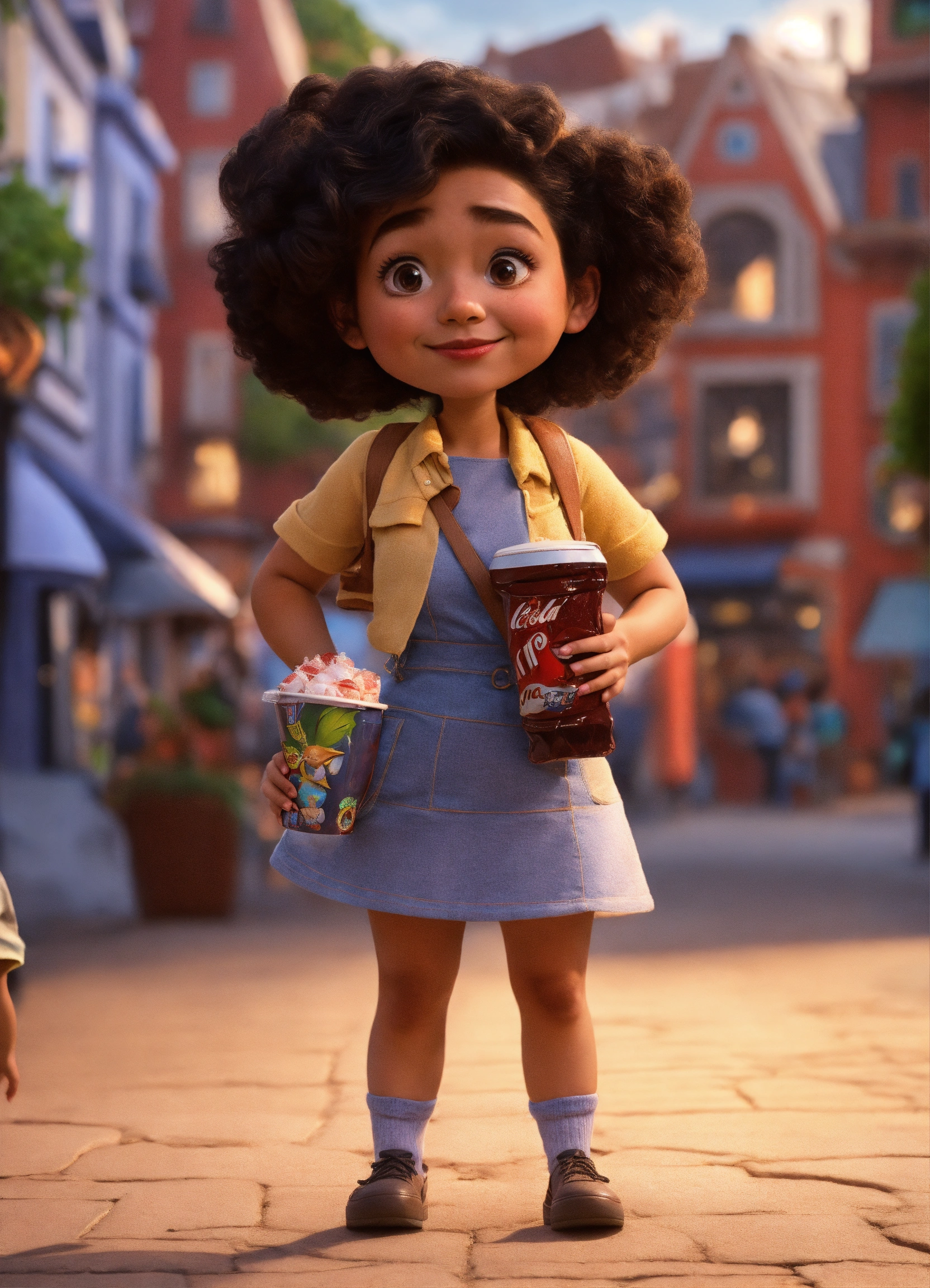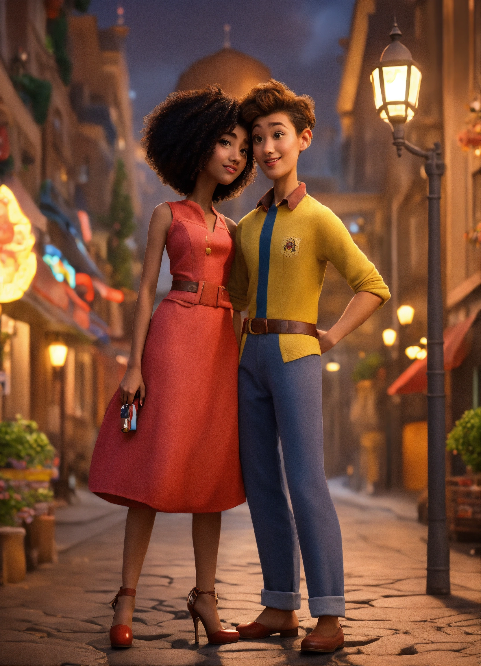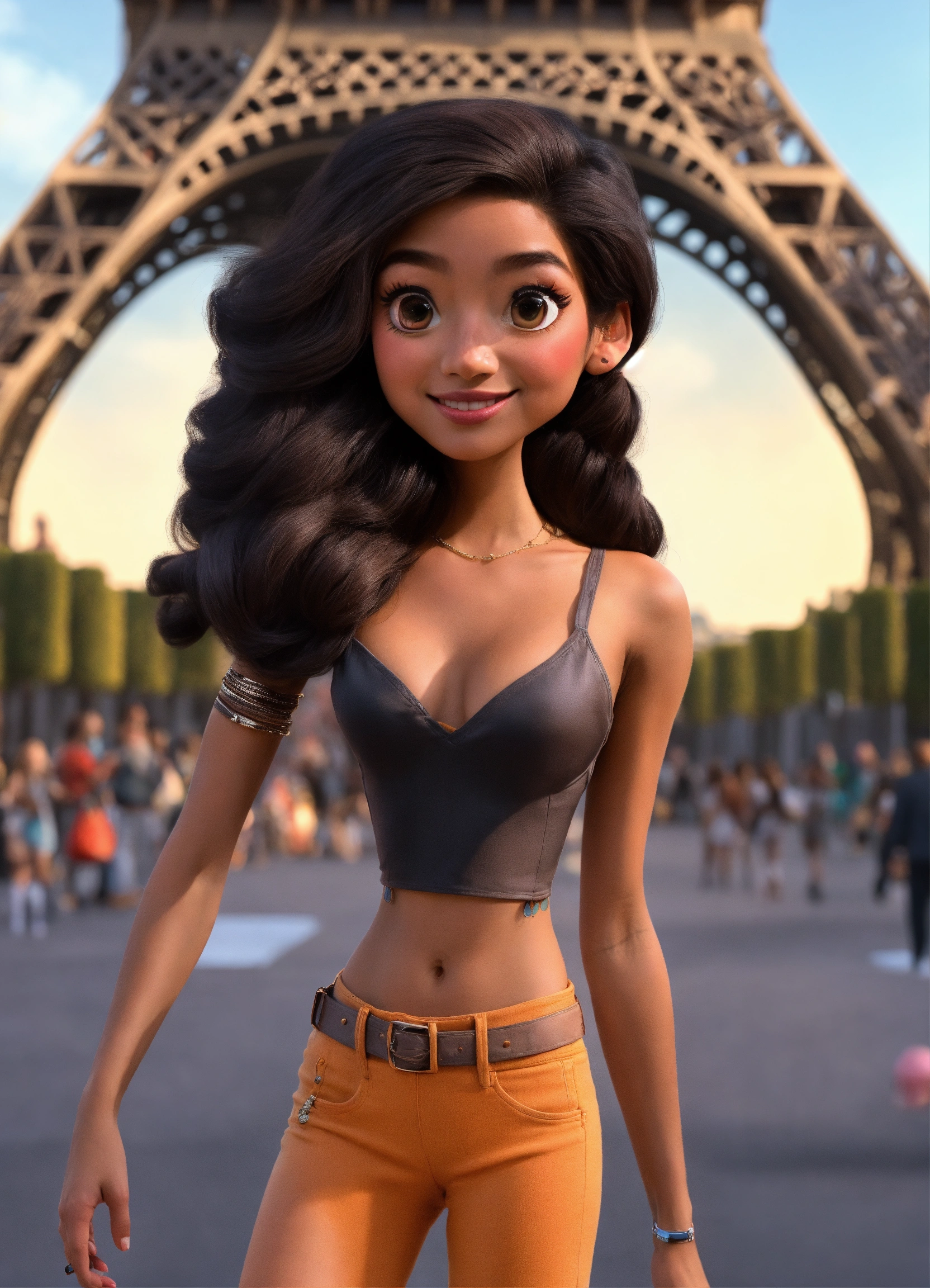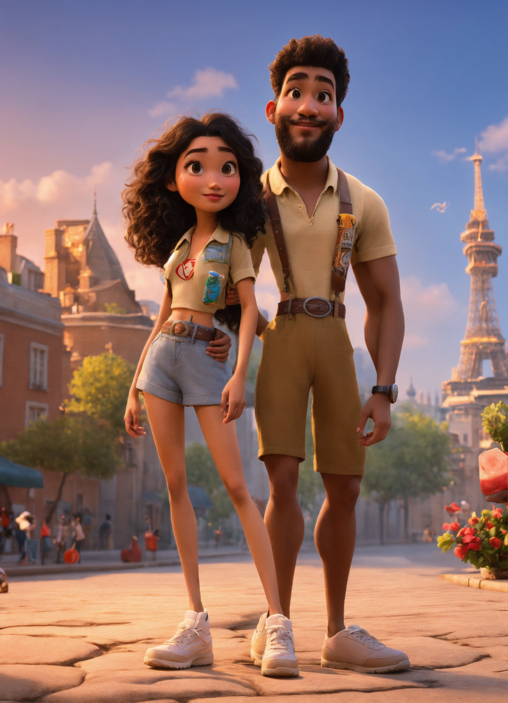 User creame una imagen al estilo pixar, personajes de animación en 3d, 2 personas, una mujer bajita de estrecha cintura y amplias caderas y gluteos y un hombre alto y esbelto, ambos vestidos con ropa casual, ella que sea de piel blanca, pelo negro lacio y largo. el pelo negro largo con una cola hacia atras y raspado a los lados de su cabeza, ambos mirando a cámara en una pose juntos y te fondo la torre de parís