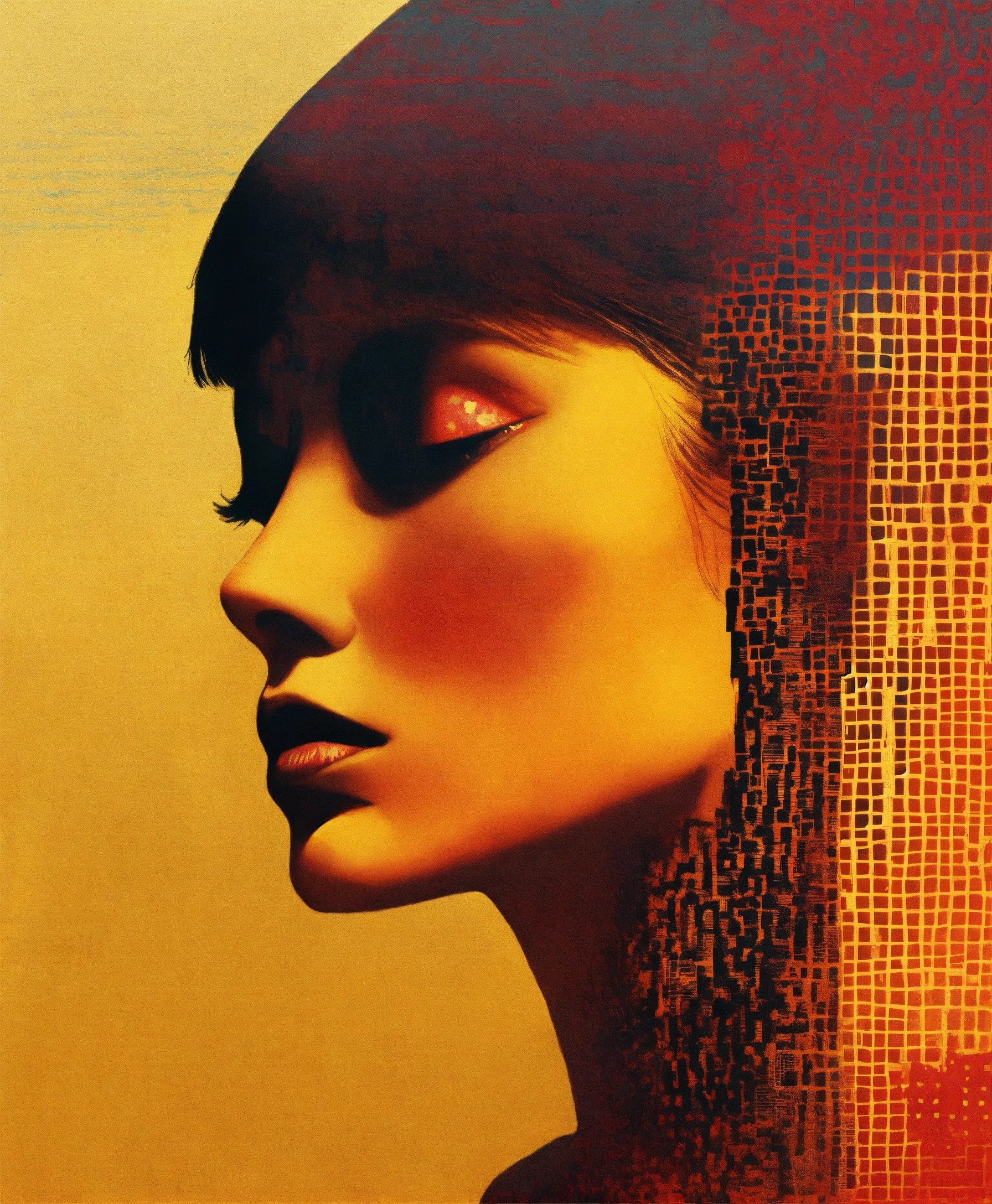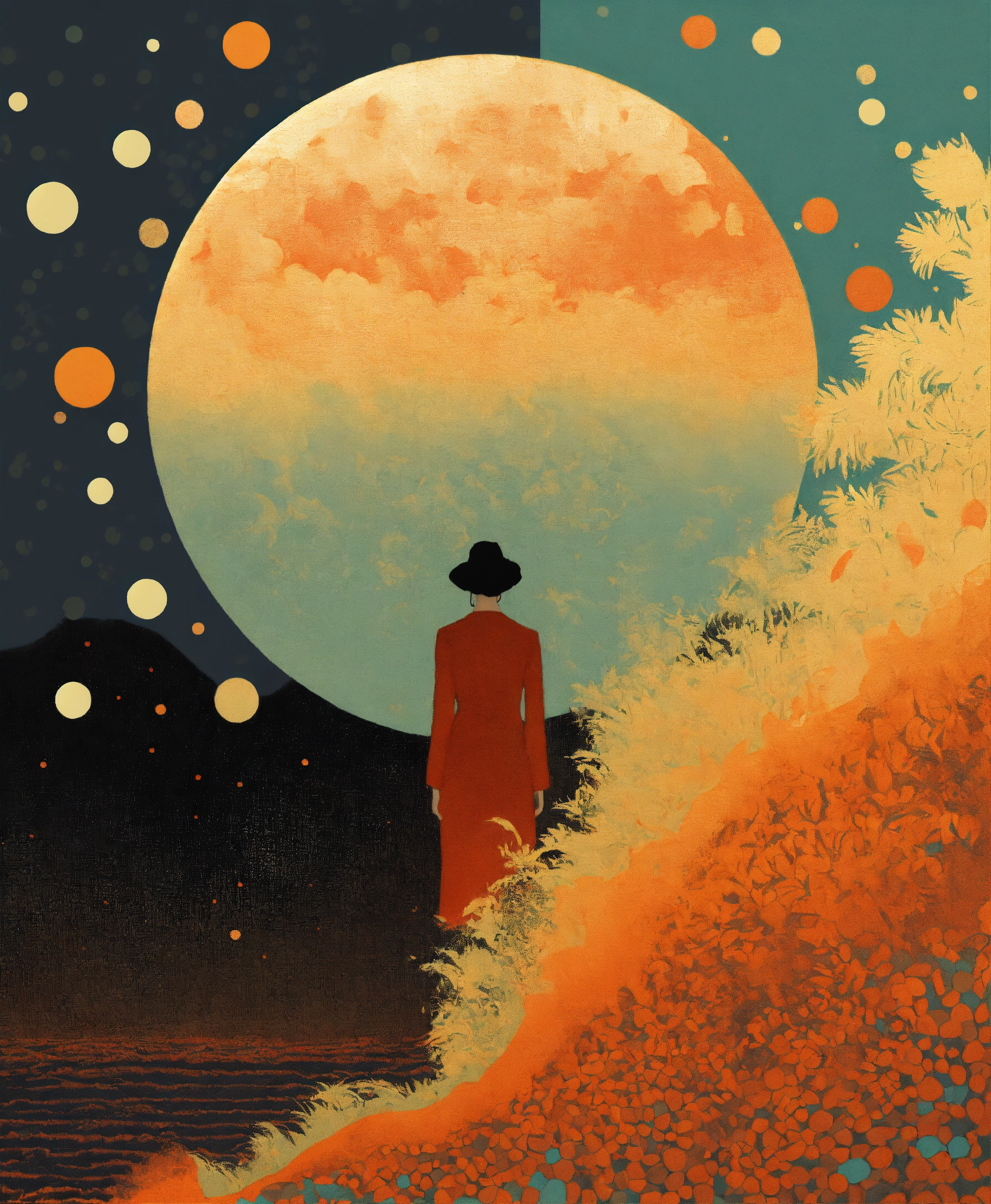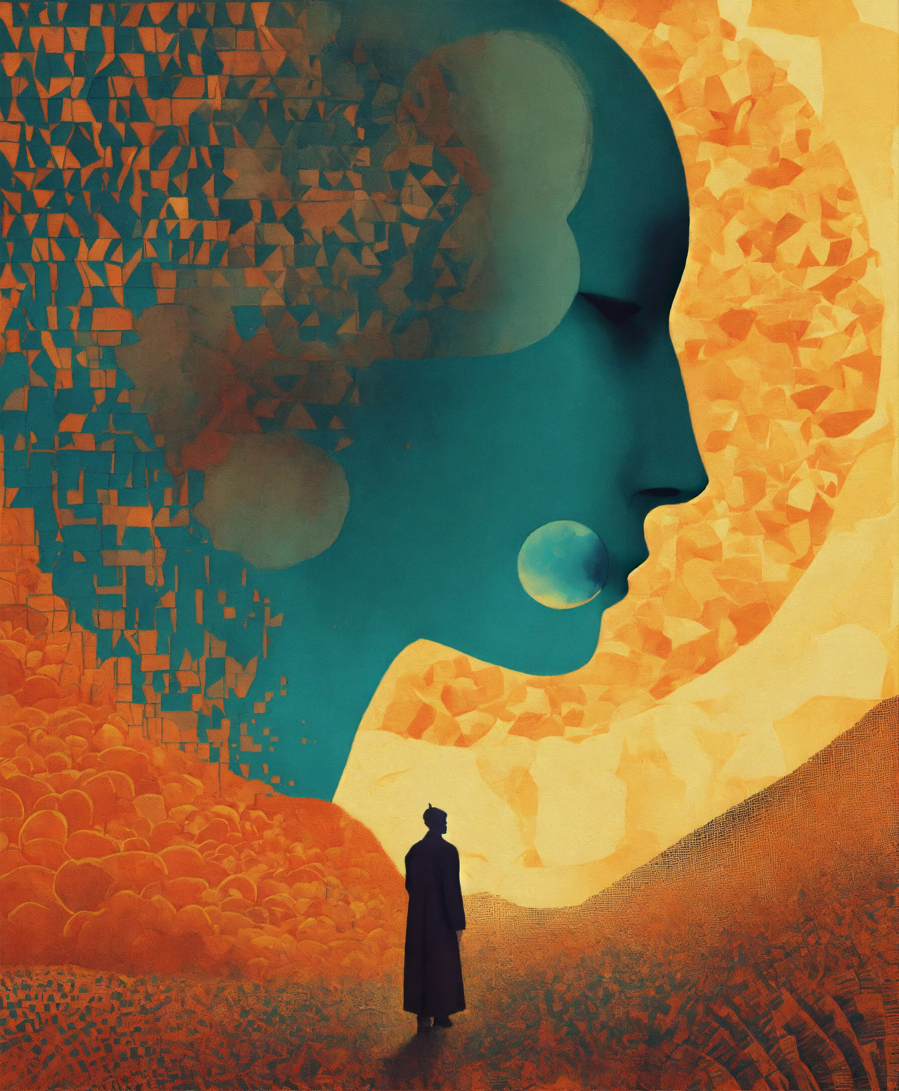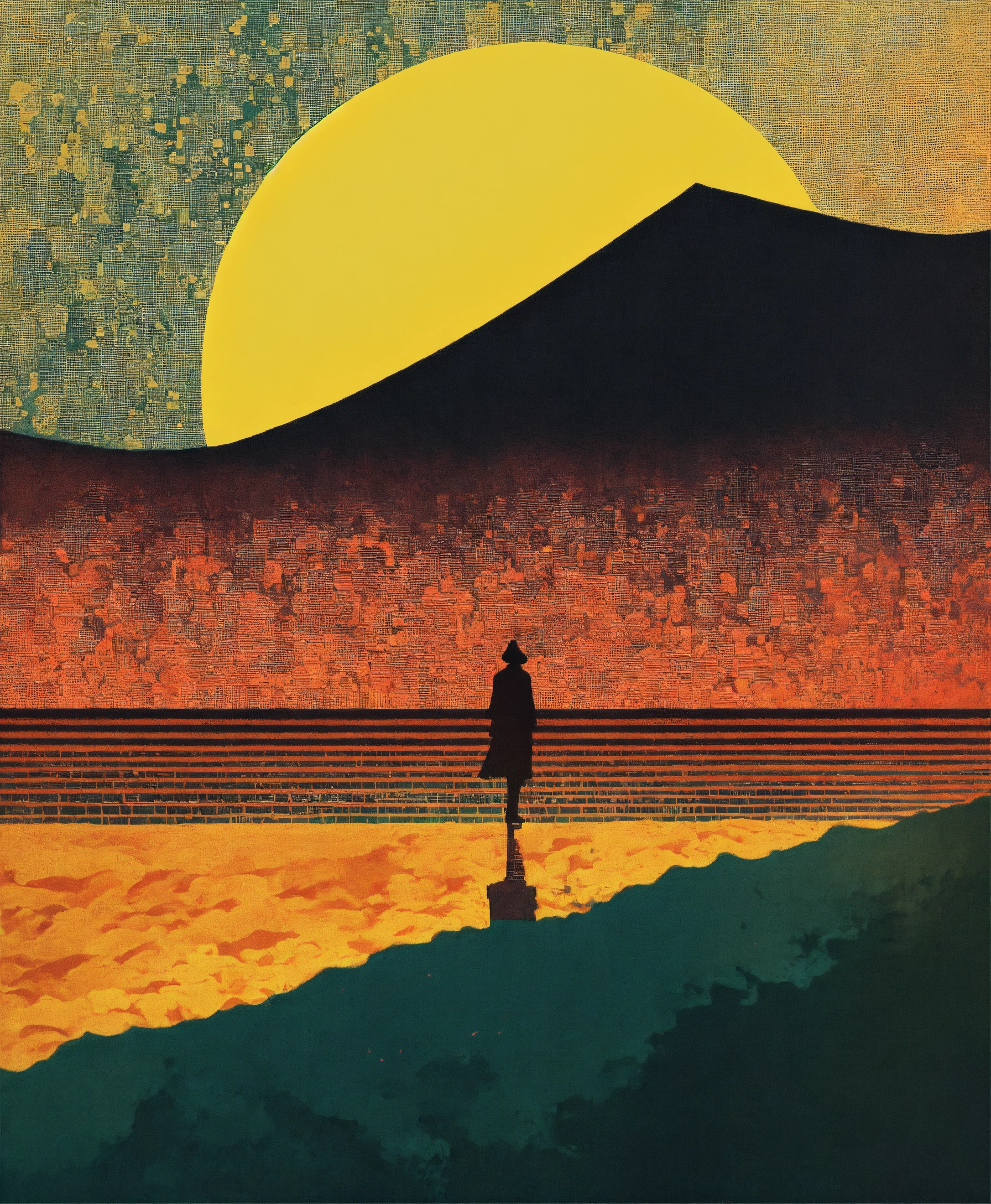 Sun profile + halftone pattern + editorial illustration of the memento morti + higly textured, genre defining mixed media collage painting + fringe absurdism + award winning halftone pattern illustration + simple flowing shapes + subtle shadows + paper texture + minimalist color scheme + inspired by zdzisław beksiński.
