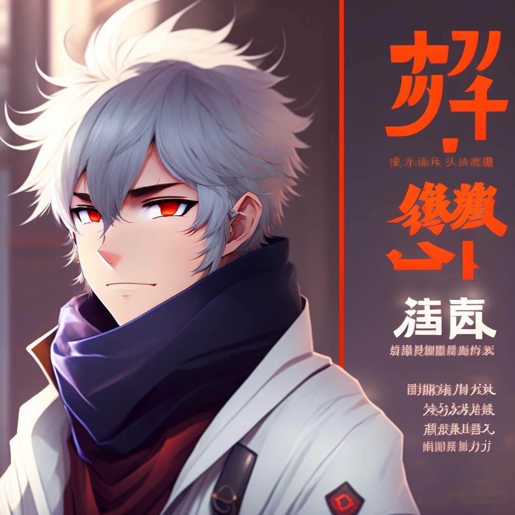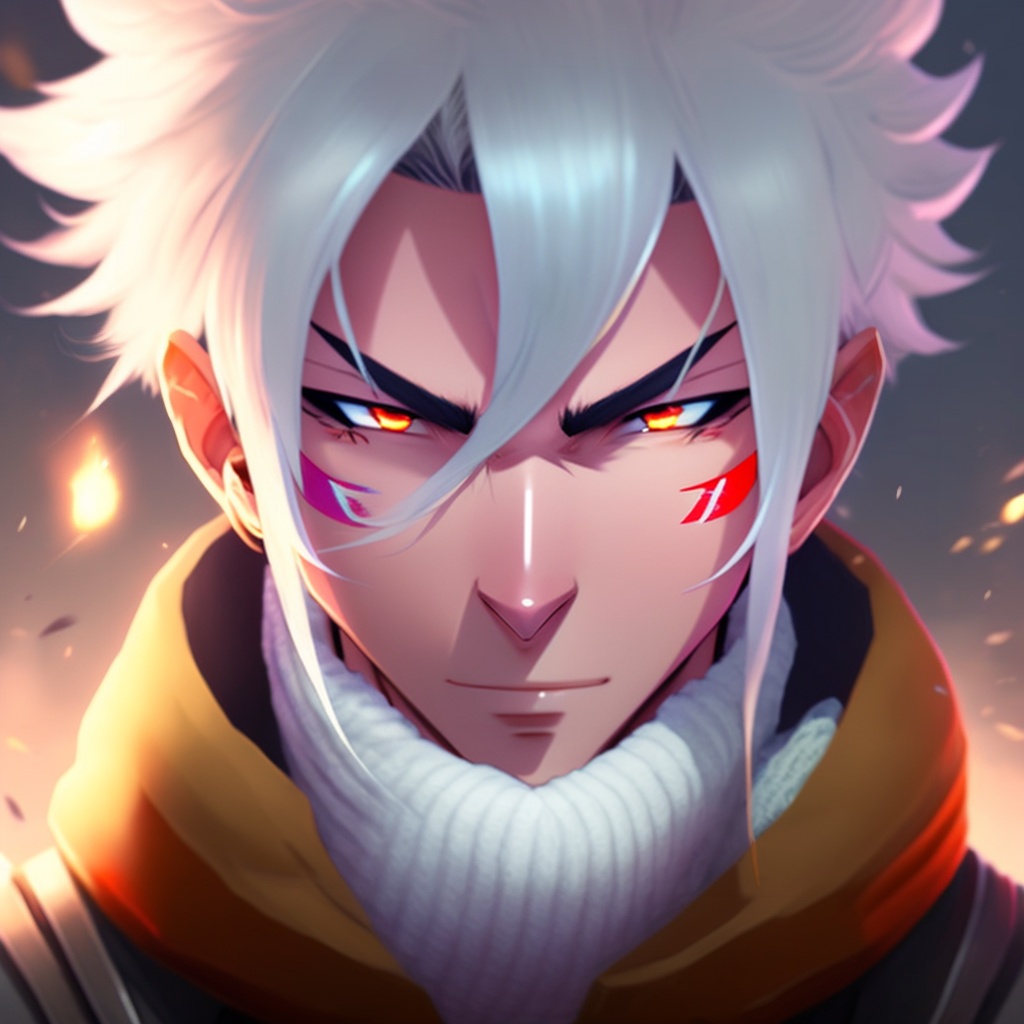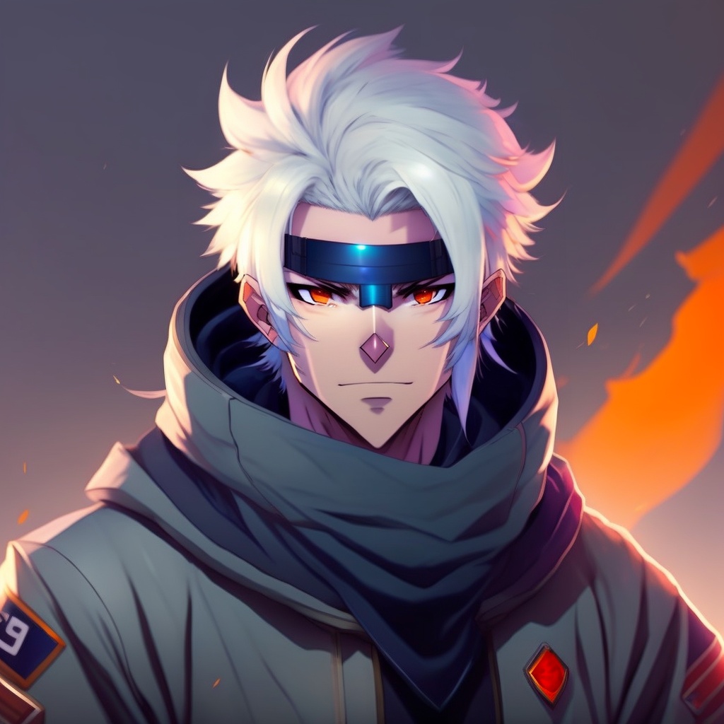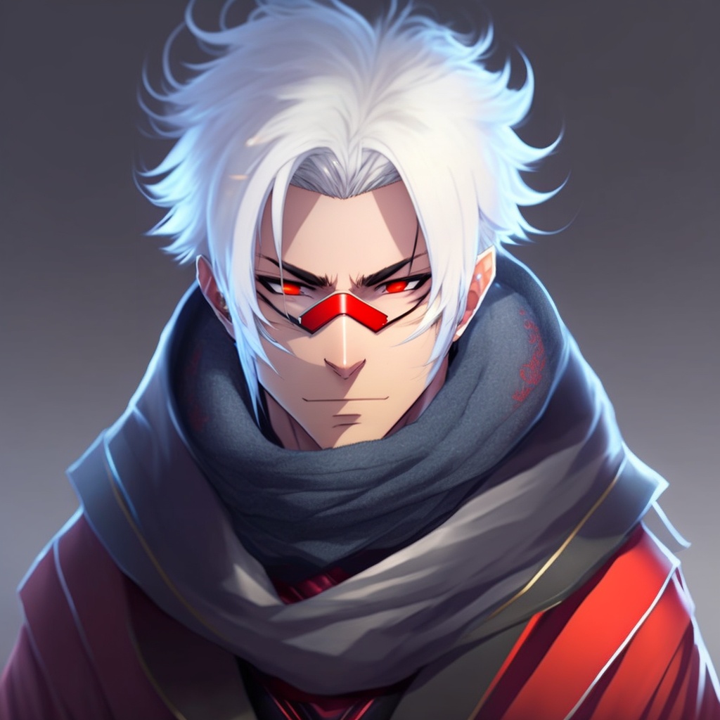 Male character, anime style, white hair, a scarf that covers his mouth, like a ninja stile, big red eyes and messy hair
