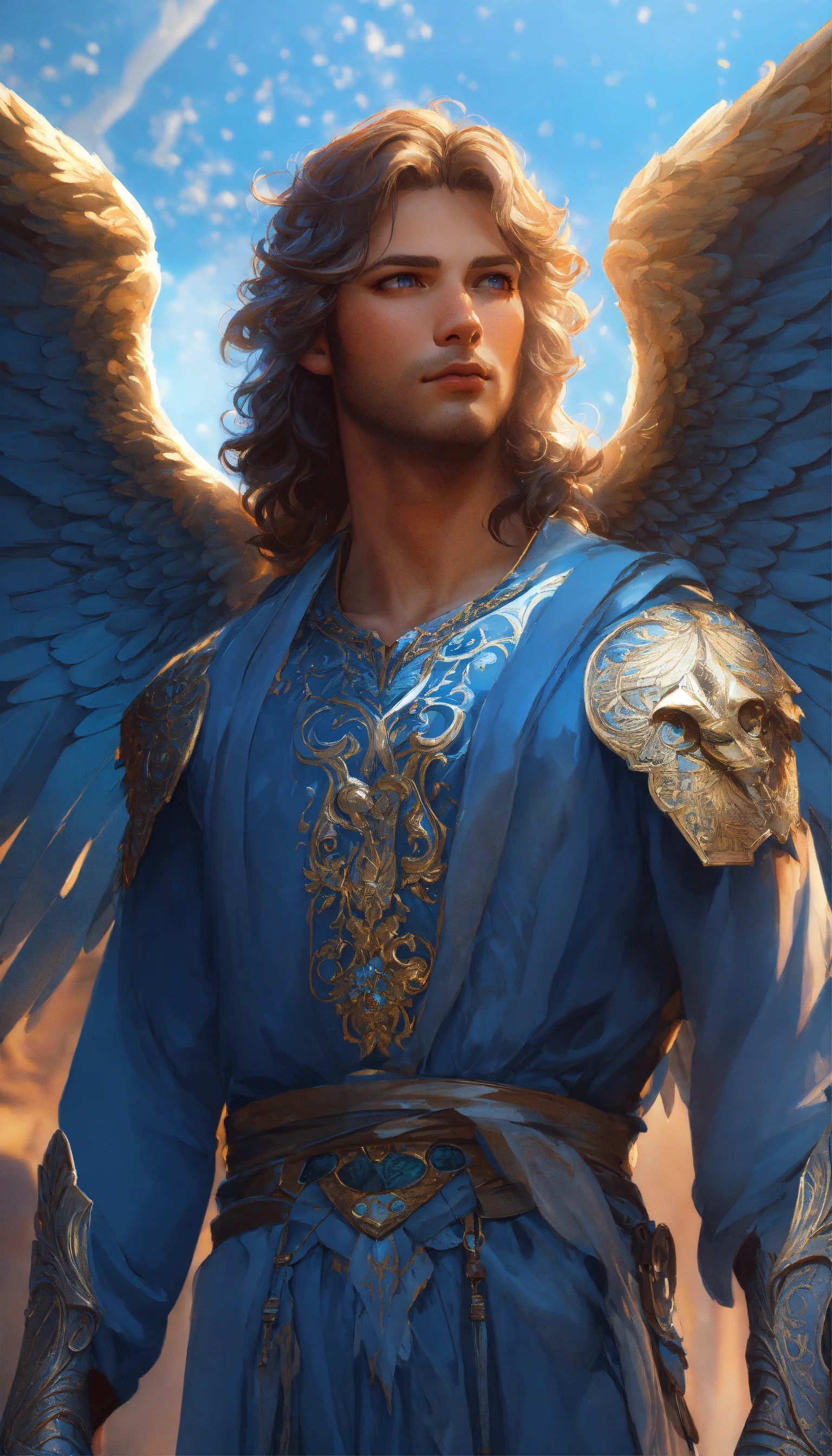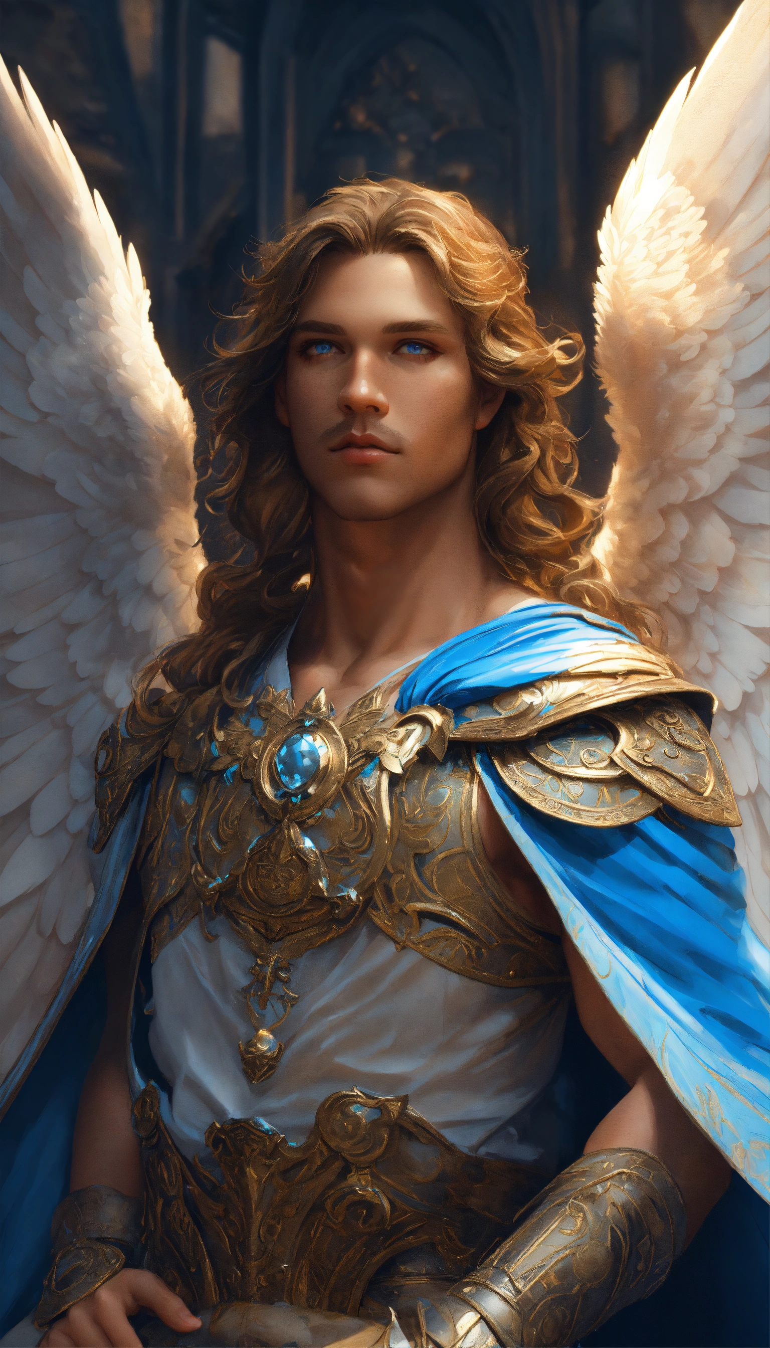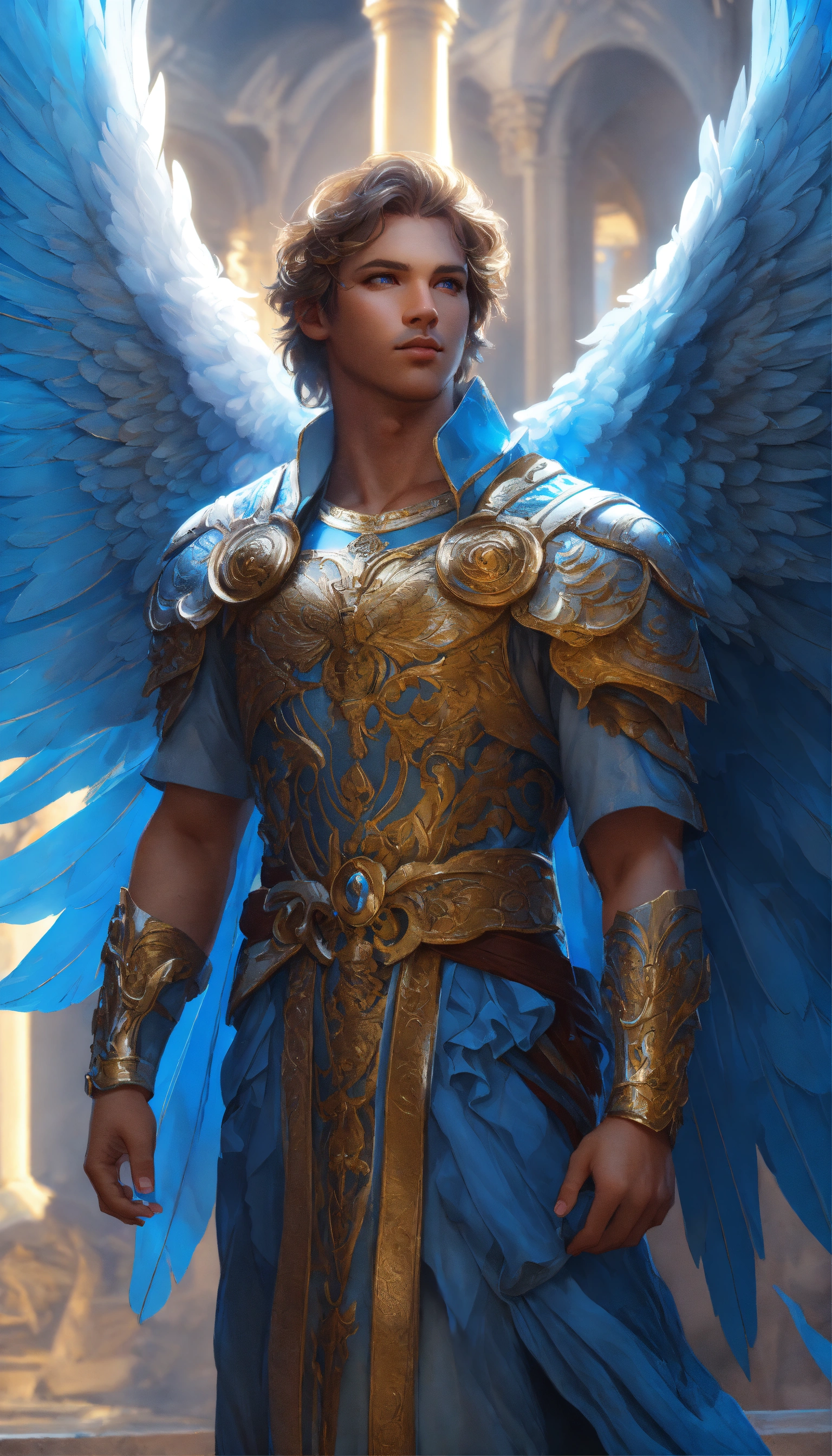 Male angel, wings, intricate, headshot, highly detailed, digital painting, art station, real, 3d, large detailed blue wings, very light eyes and deep gaze, blue warrior dress, mystical, focus sharp, cinematic lighting, 8k, illustration, art by artgerm and greg rutkowski, alphonse mucha, cgsociety