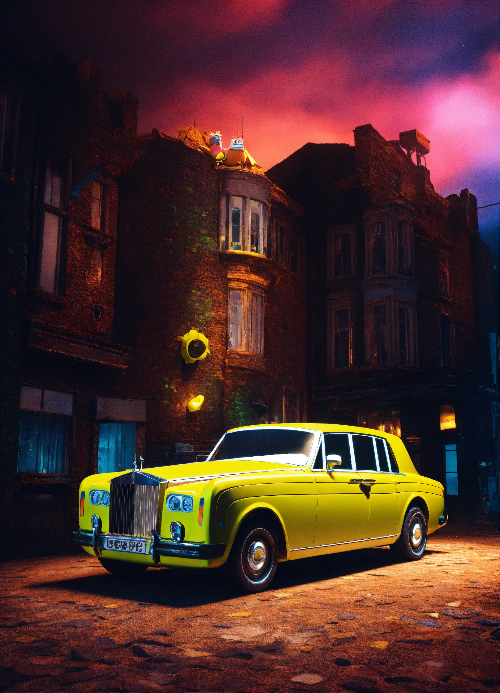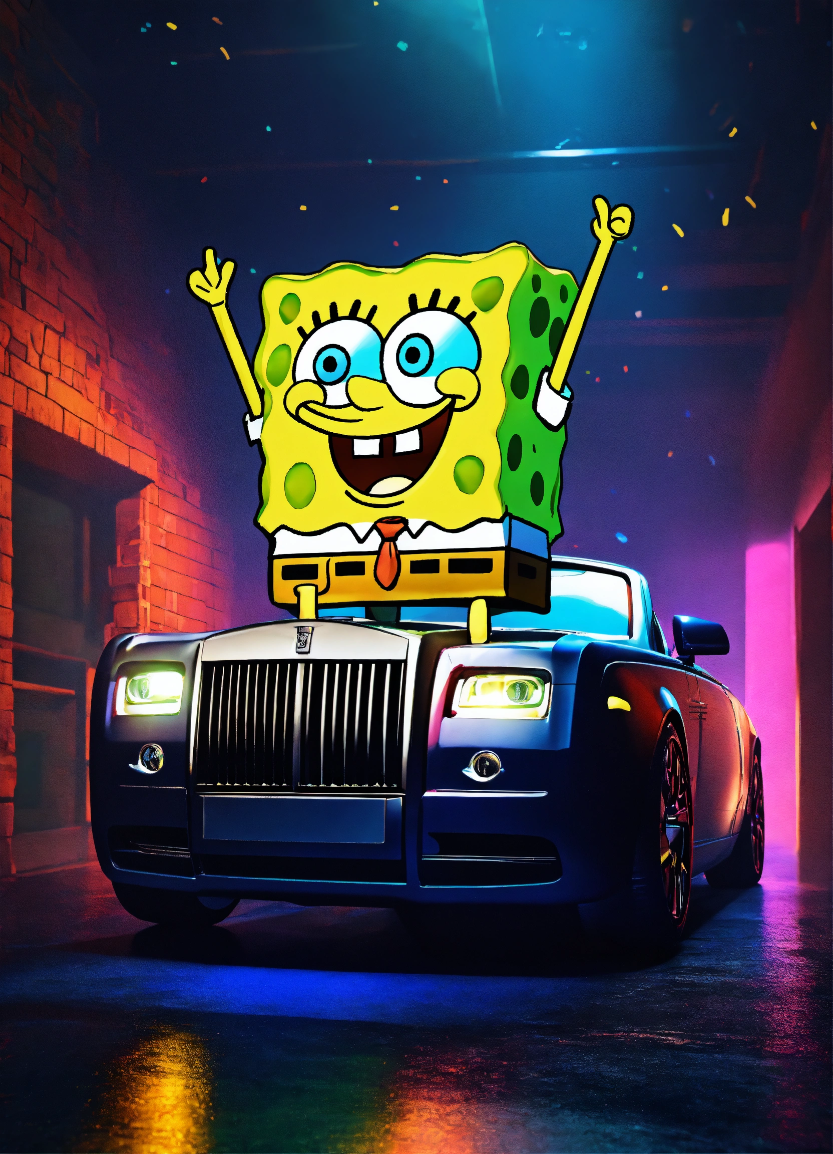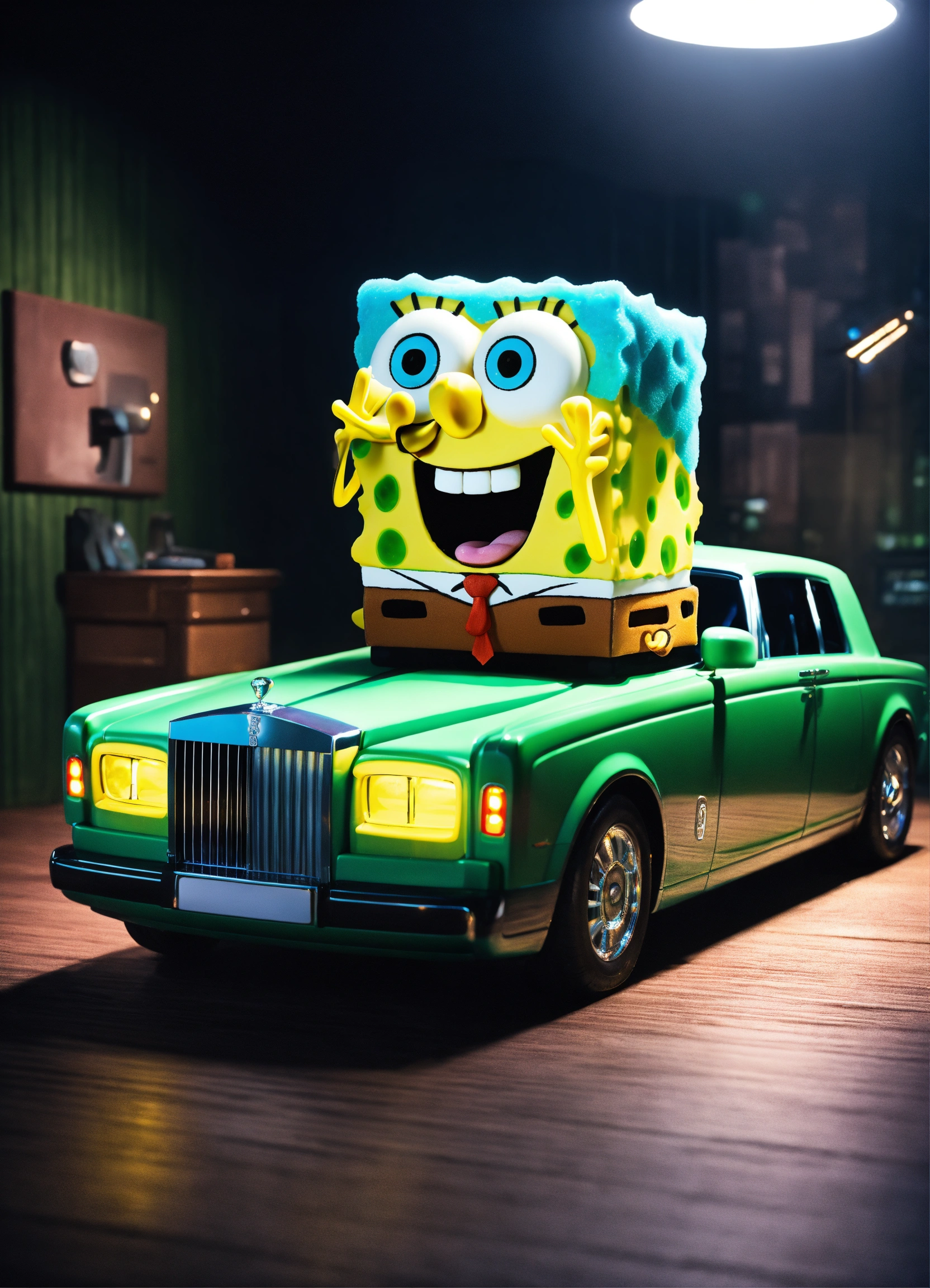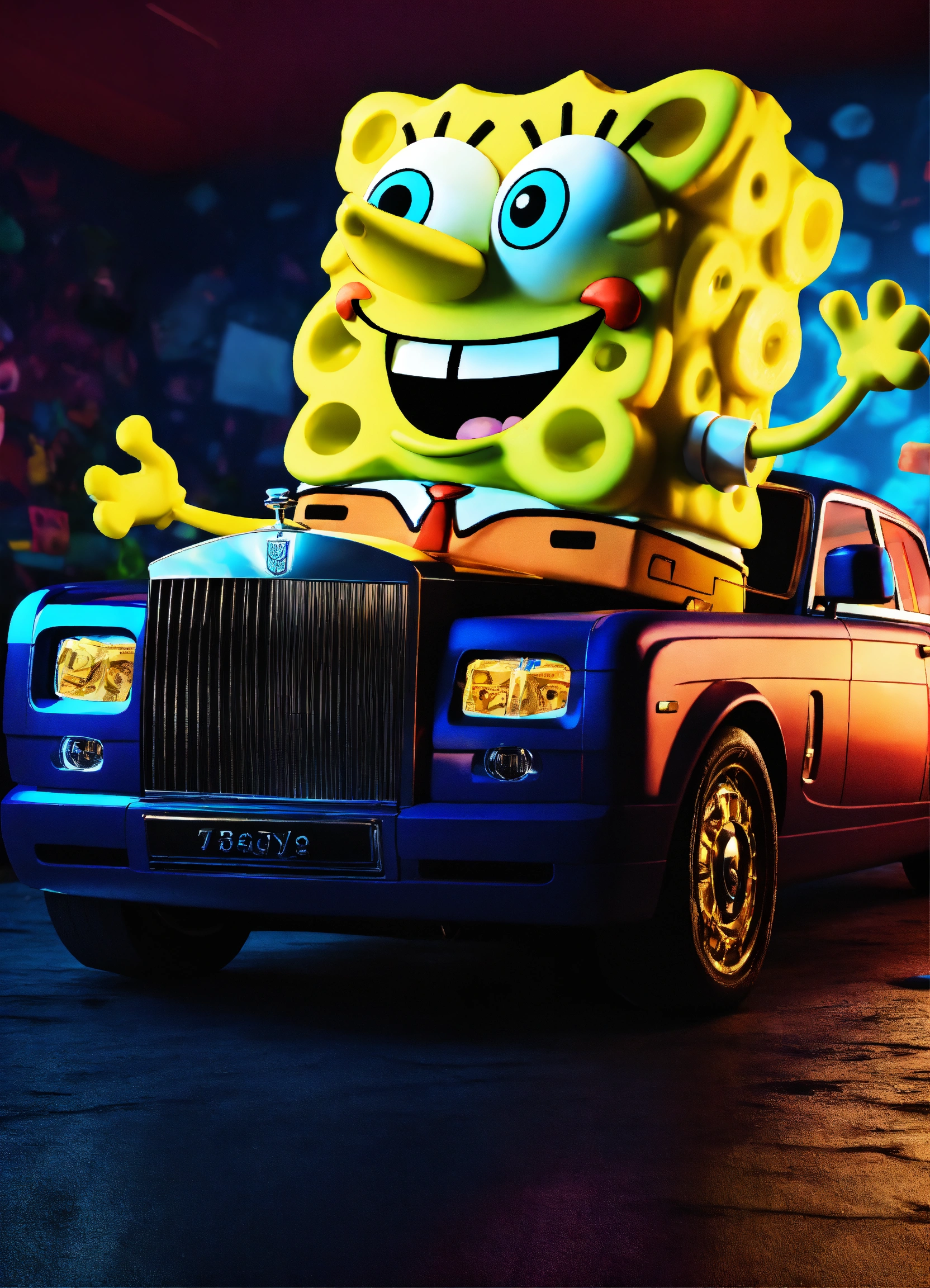 3d spongebob squarepants flexing cash on top of a rolls royce in a dark room