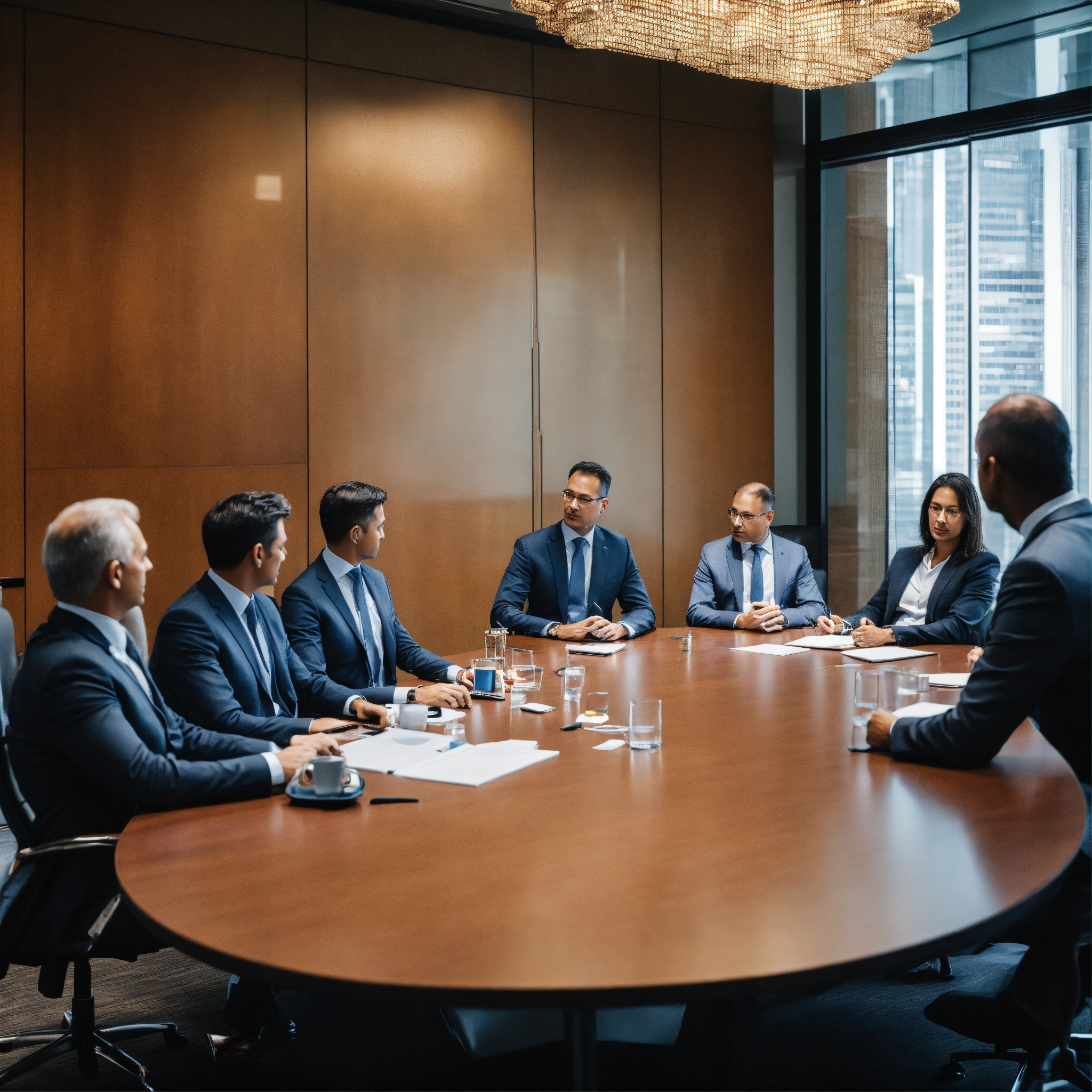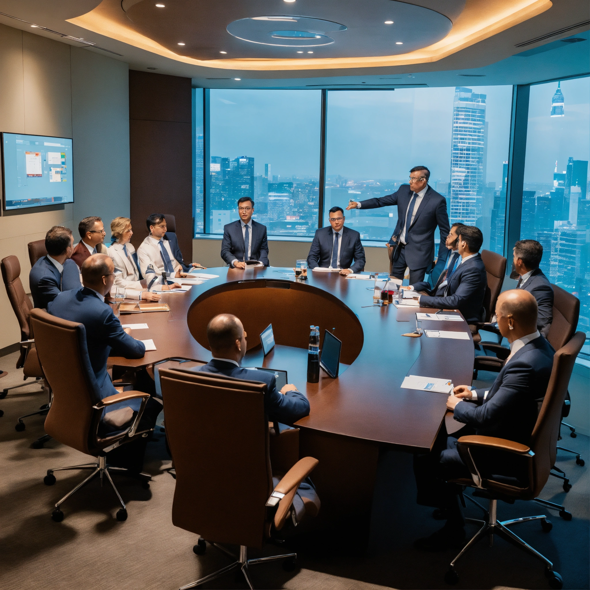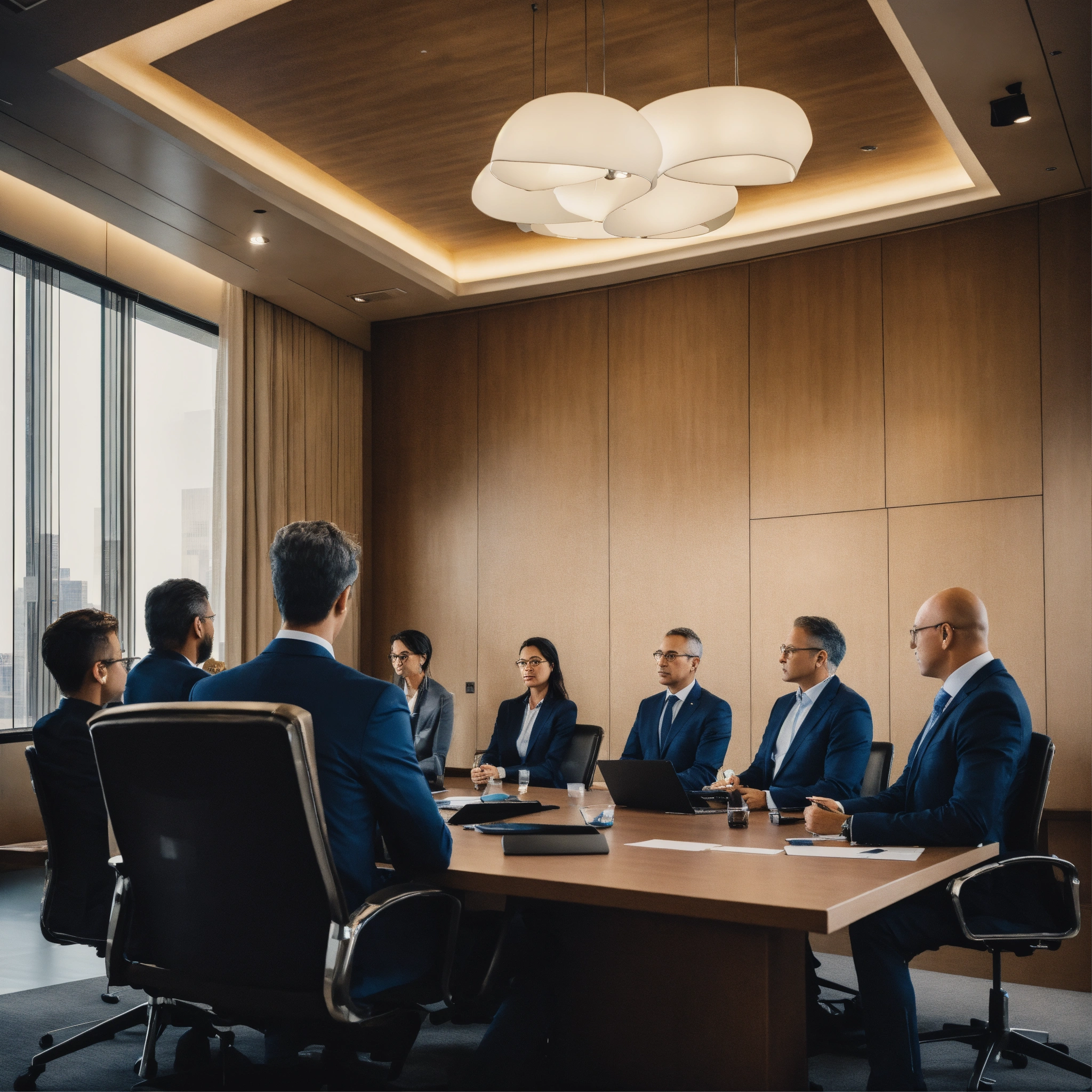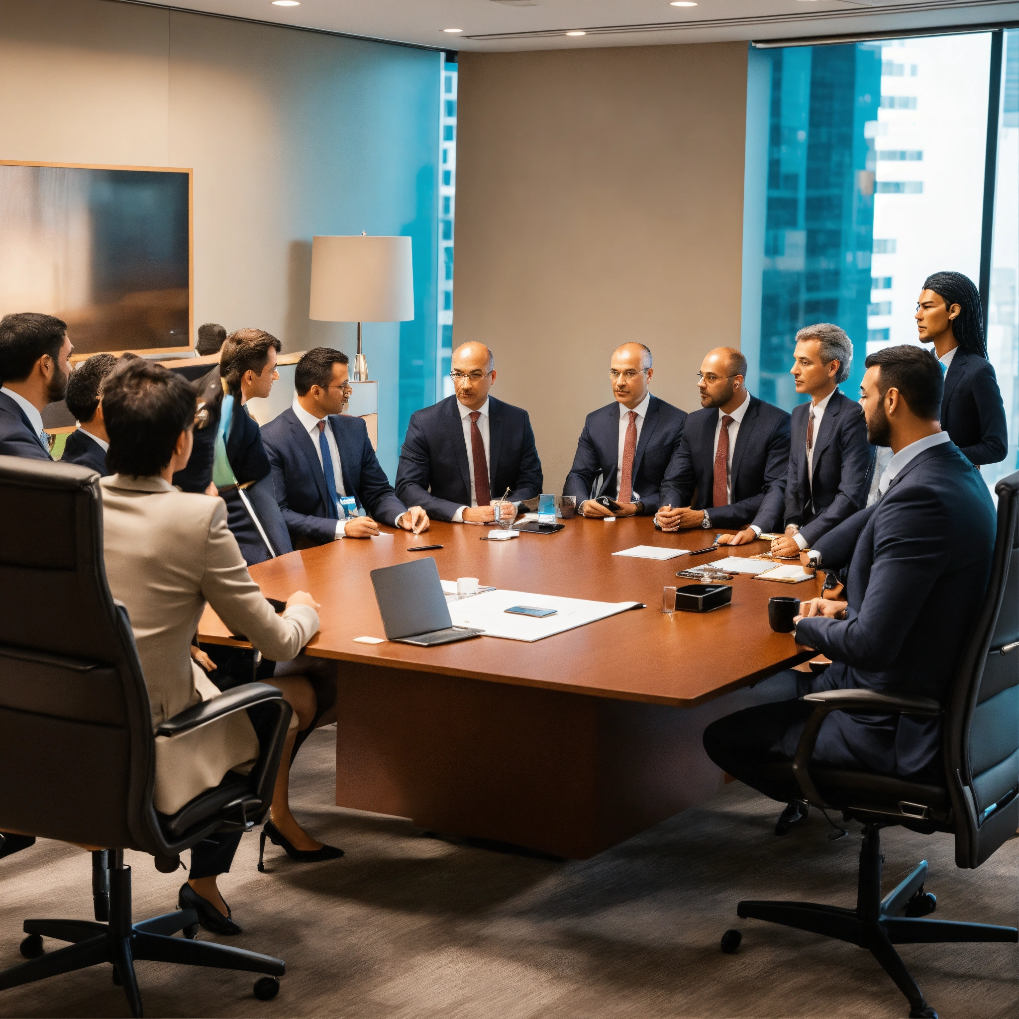 Several c suite executives and one humanoid sitting in the board room planning business strategy