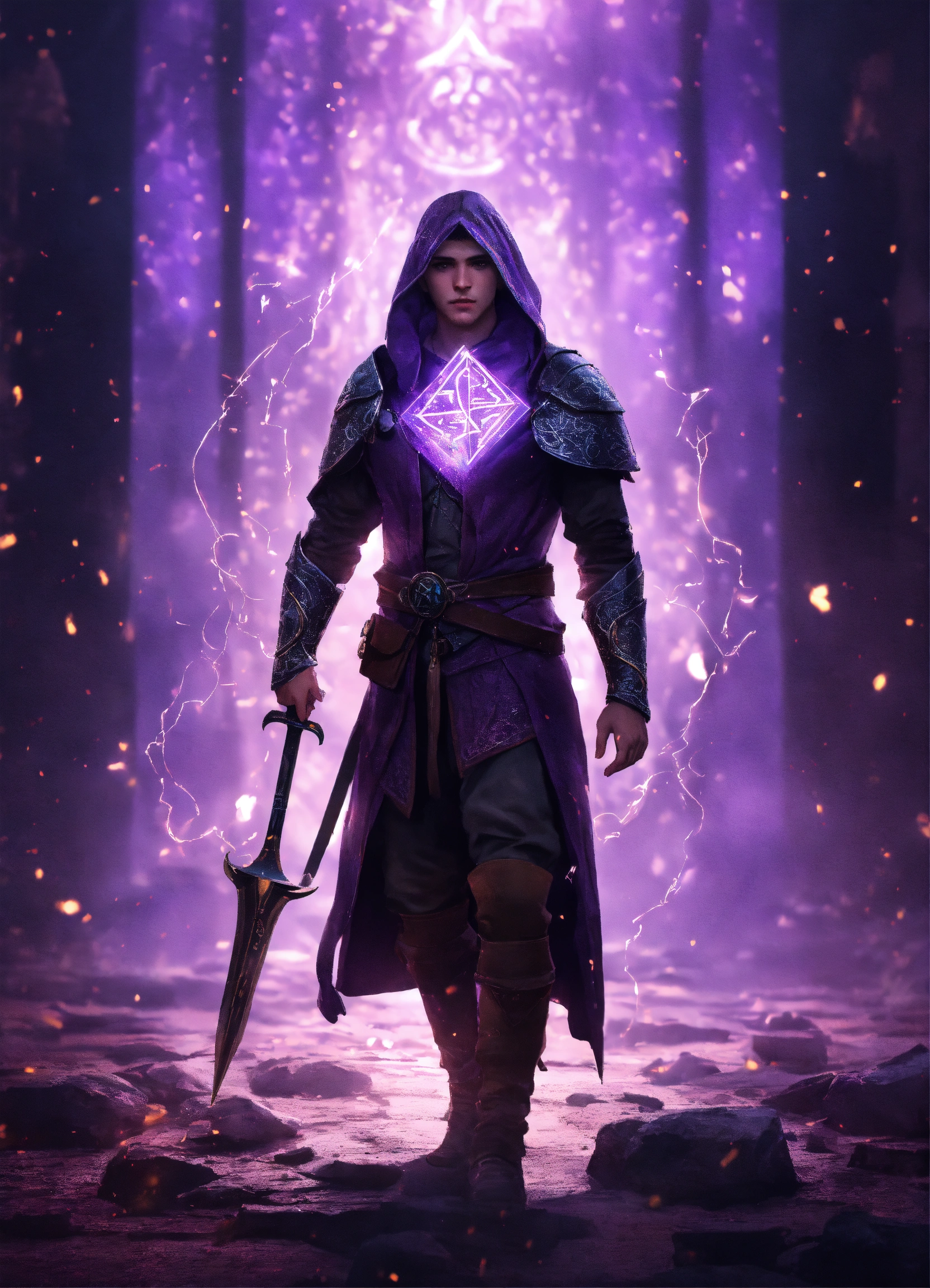 A realistic full body portrait of a medival young rune mage, drowing purple magic rune, mighty magic, neutral background, moody, photorealistic, cinematic scene, super detailed, hyper realistic, bright lights, 8 k