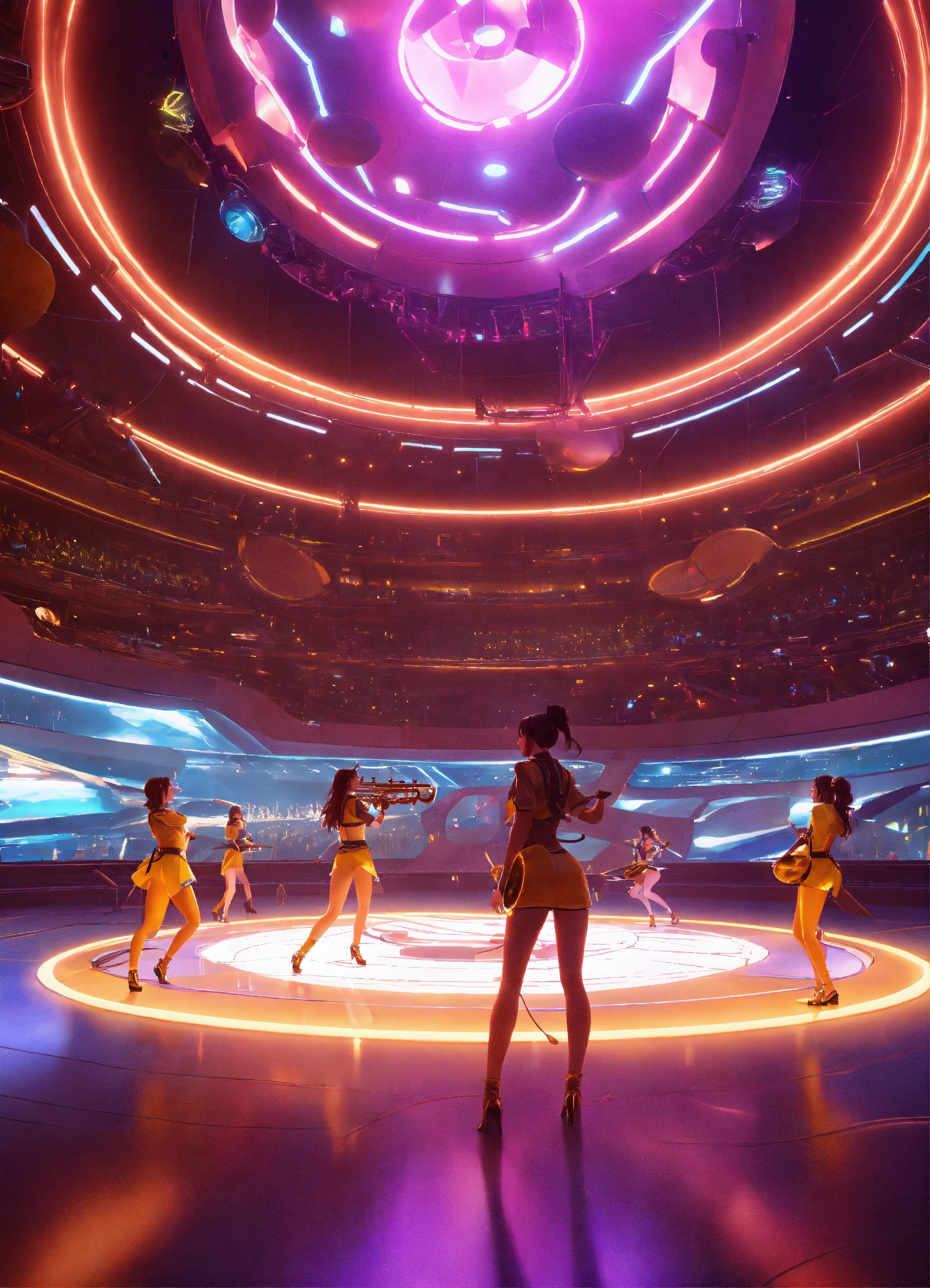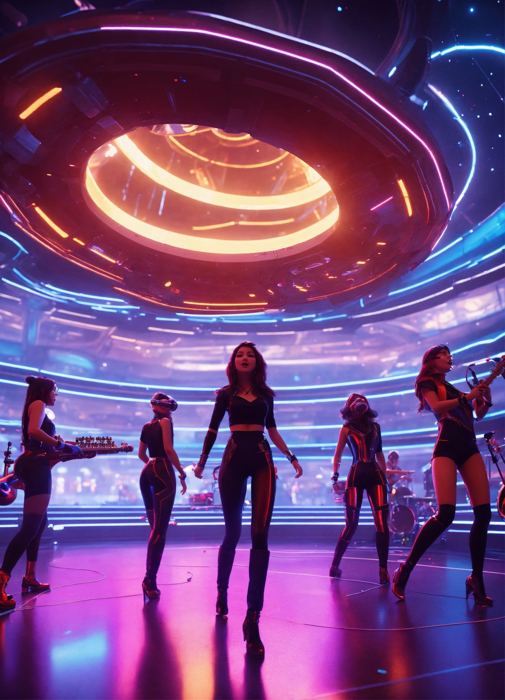 A band plays at a futuristic arena at fancy spaceport, beautiful girls dance to the music, realistic, futuristic, sci fi, 8k, unreal engine, analog controls, cartoon, pixar, disney