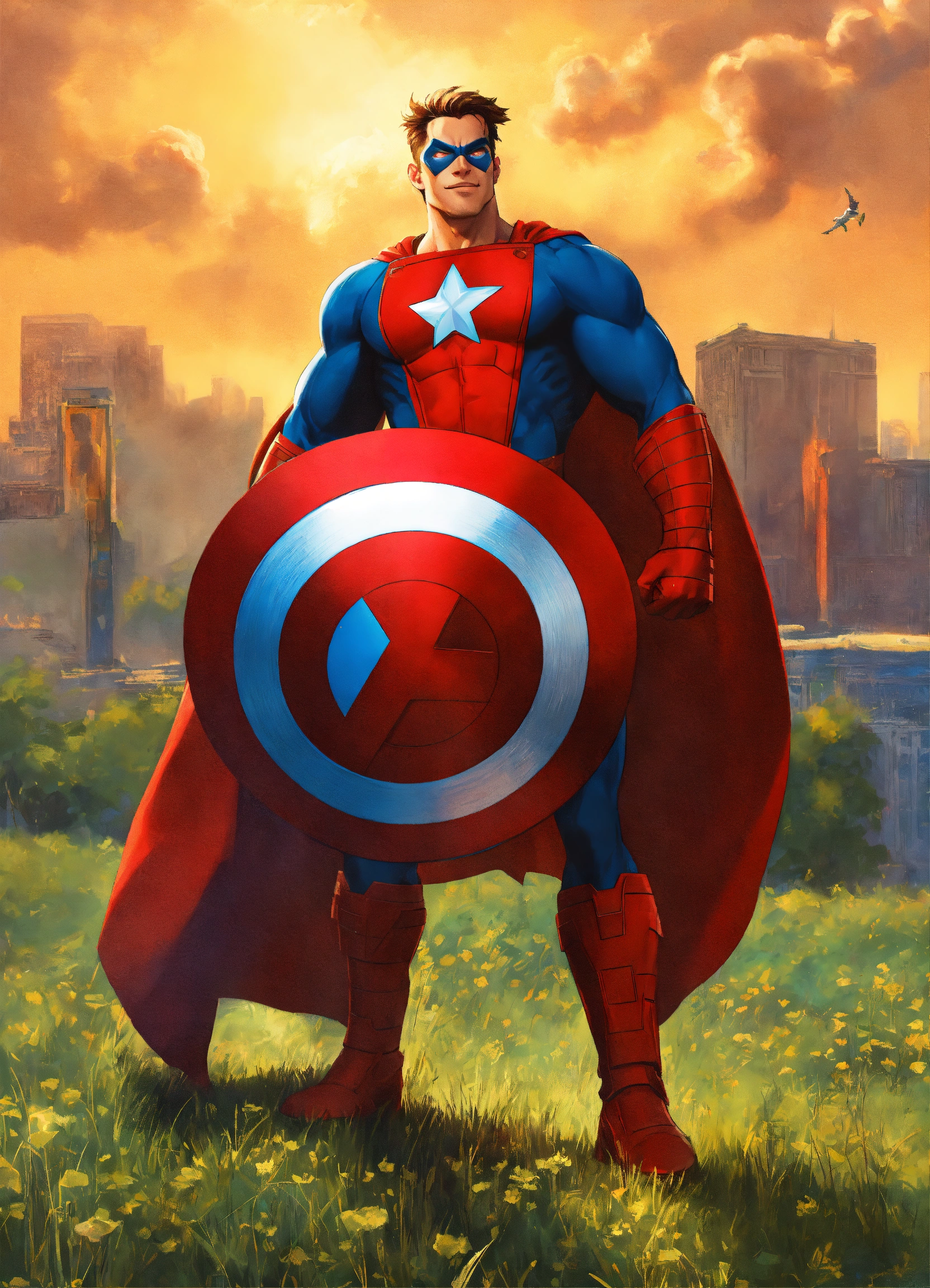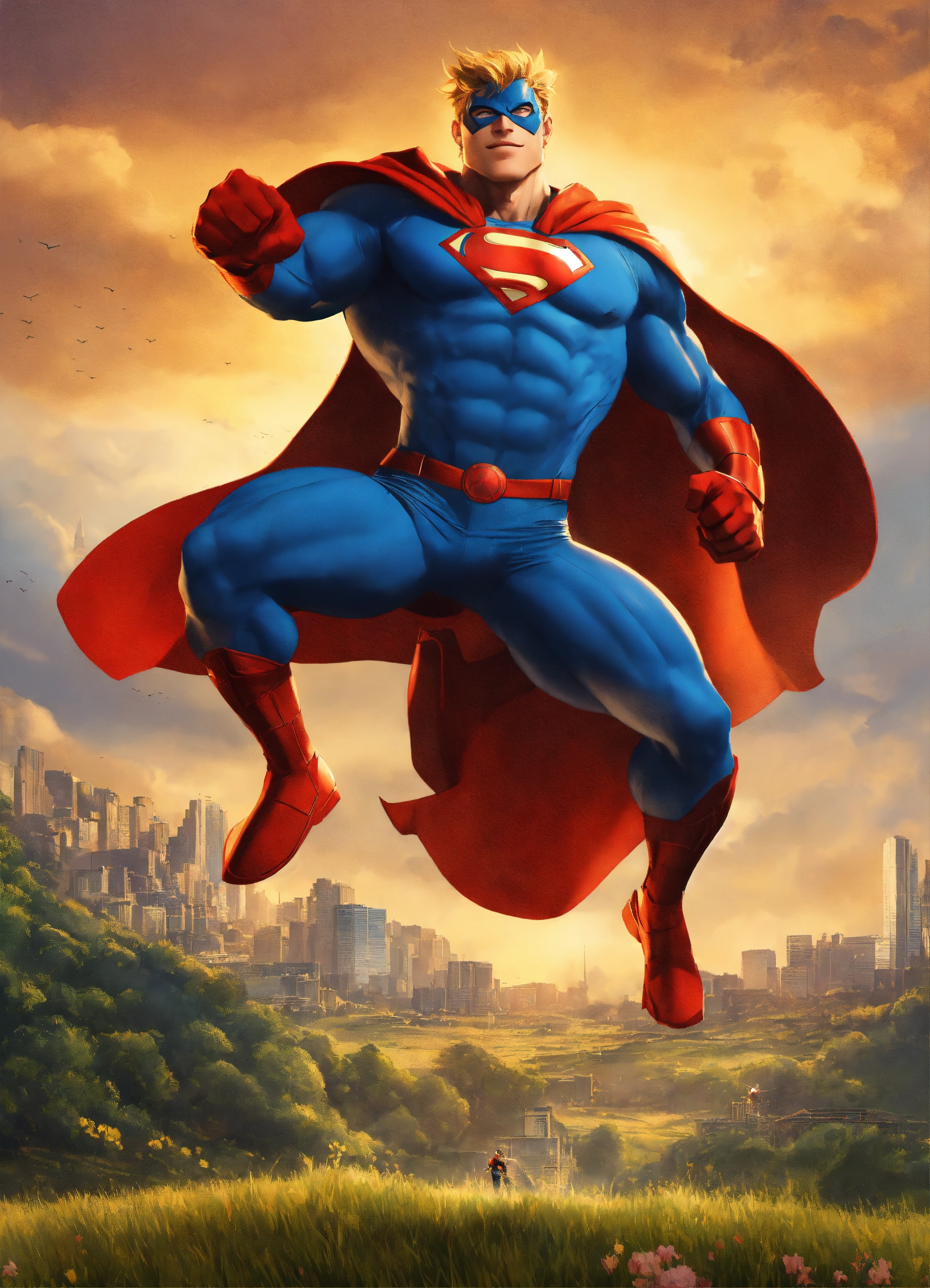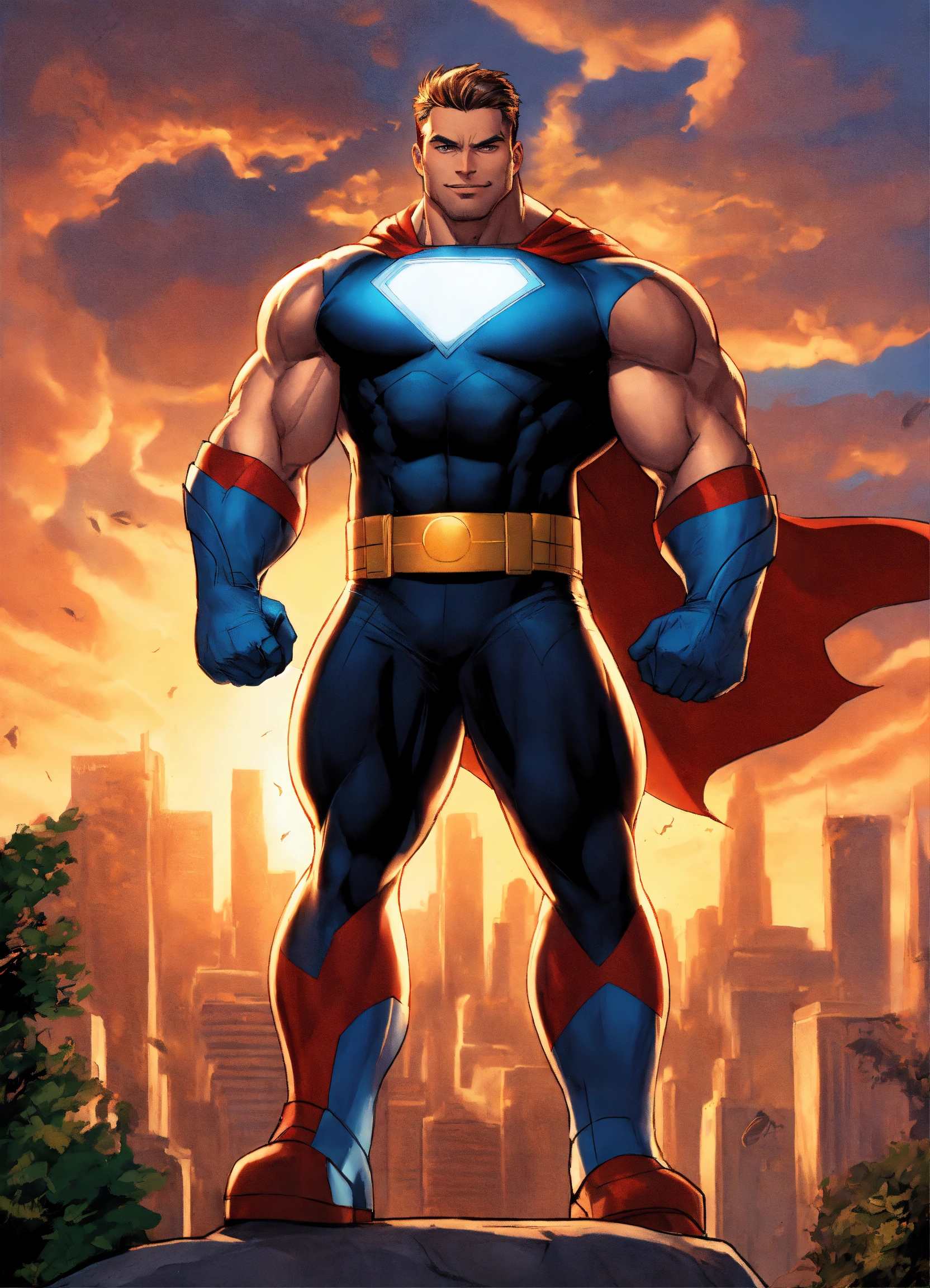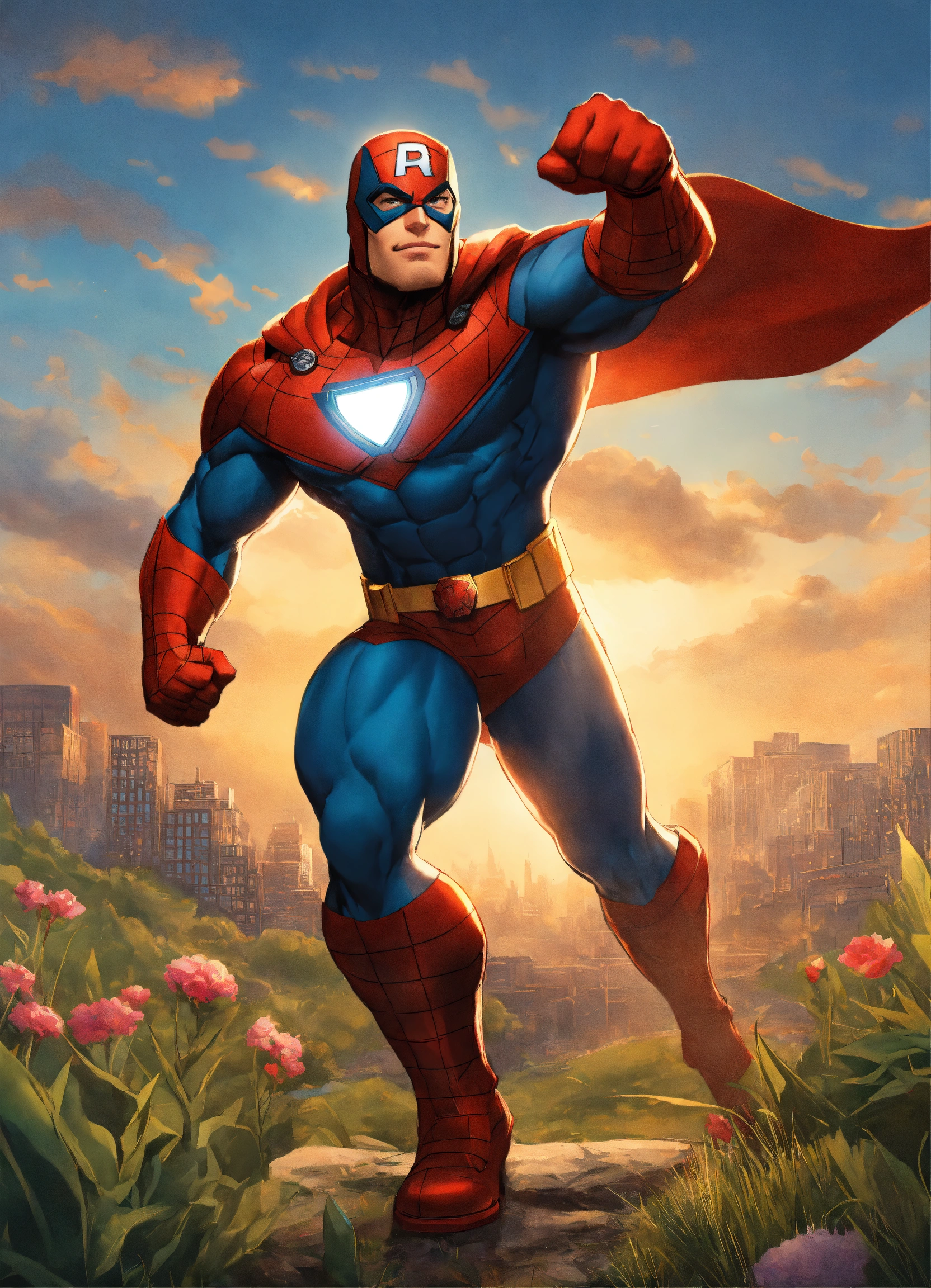 - max stands proudly exuding the strength and charisma of a marvel superhero. with a funny and smiley look his presence is iconic, radiating the aura of a guardian and protector. max has a chiseled, heroic appearance reminiscent of marvel's most valiant characters, and his animated movements maintain the enchanting style of pixar animation. with his strong, muscular physique, max embodies the essence of a superhero, adding an exciting dimension to the scene in the meadow.