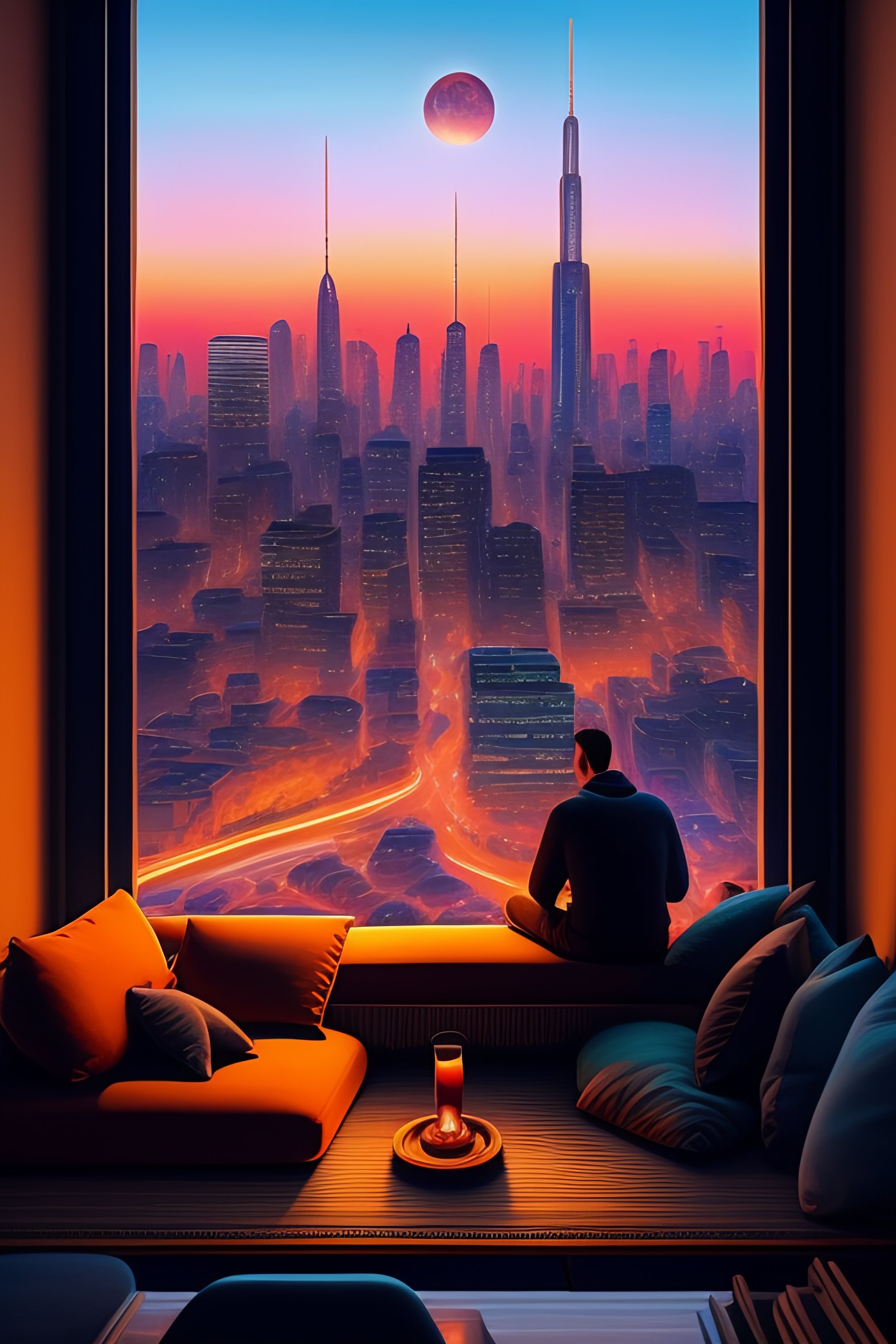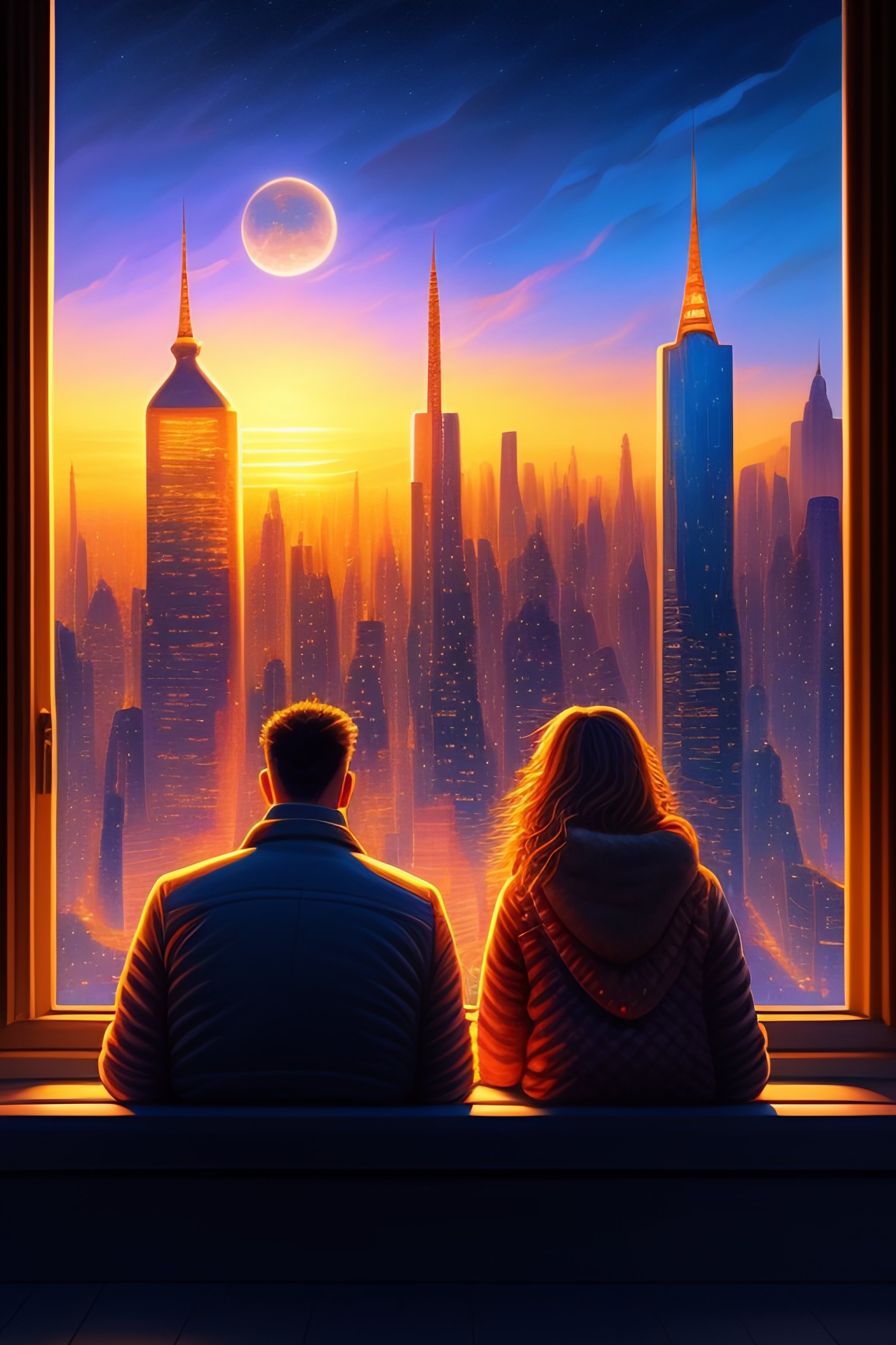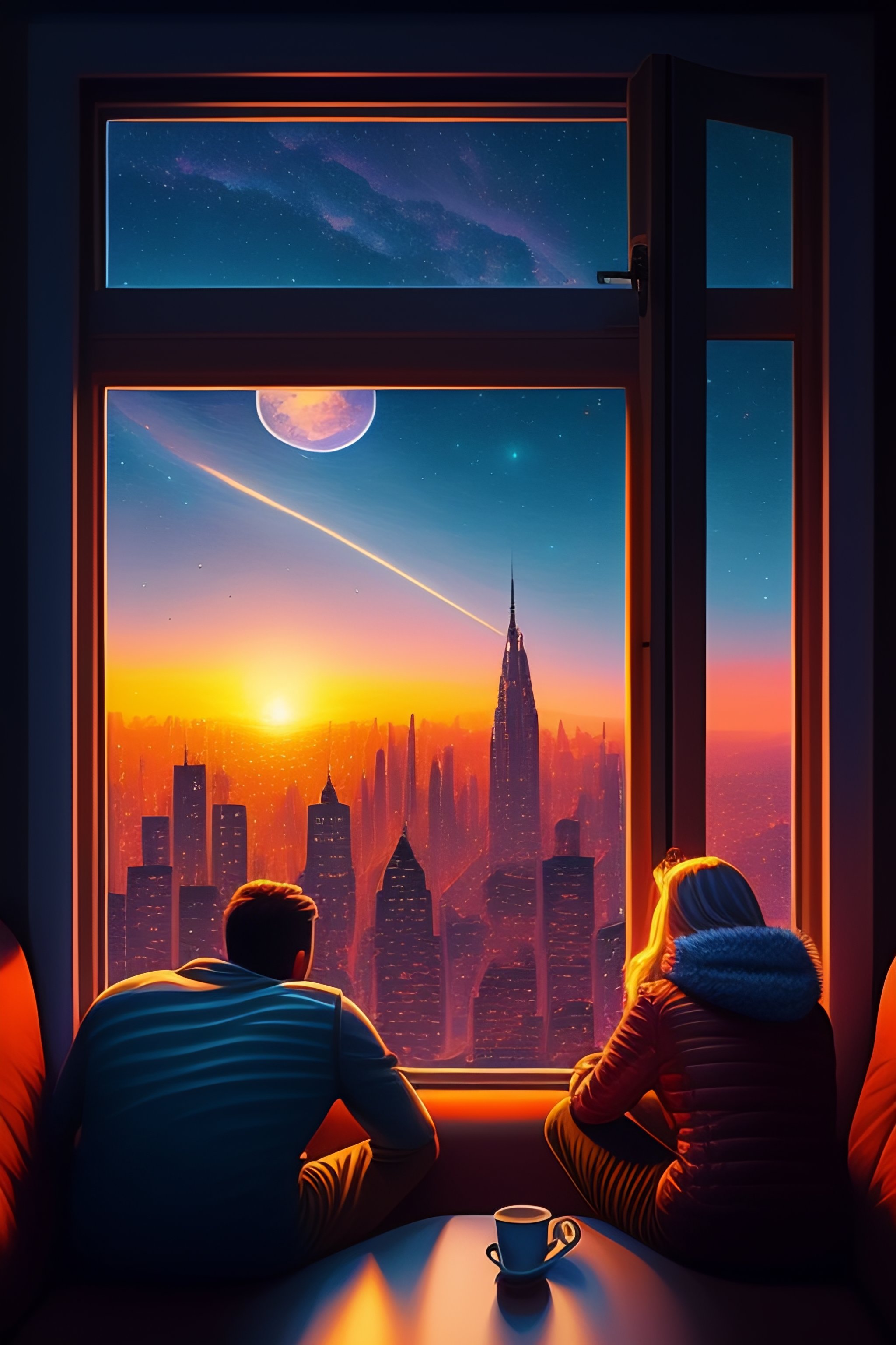 A man and woman sit on a couch and stare through the window to the city, extremely detailed painting, beautiful glowing, centered, symmetry, painted, intricate, volumetric lighting, beautiful, sharp focus, ultra detailed, in the style of dan mumford and marc simonetti, astrophotography