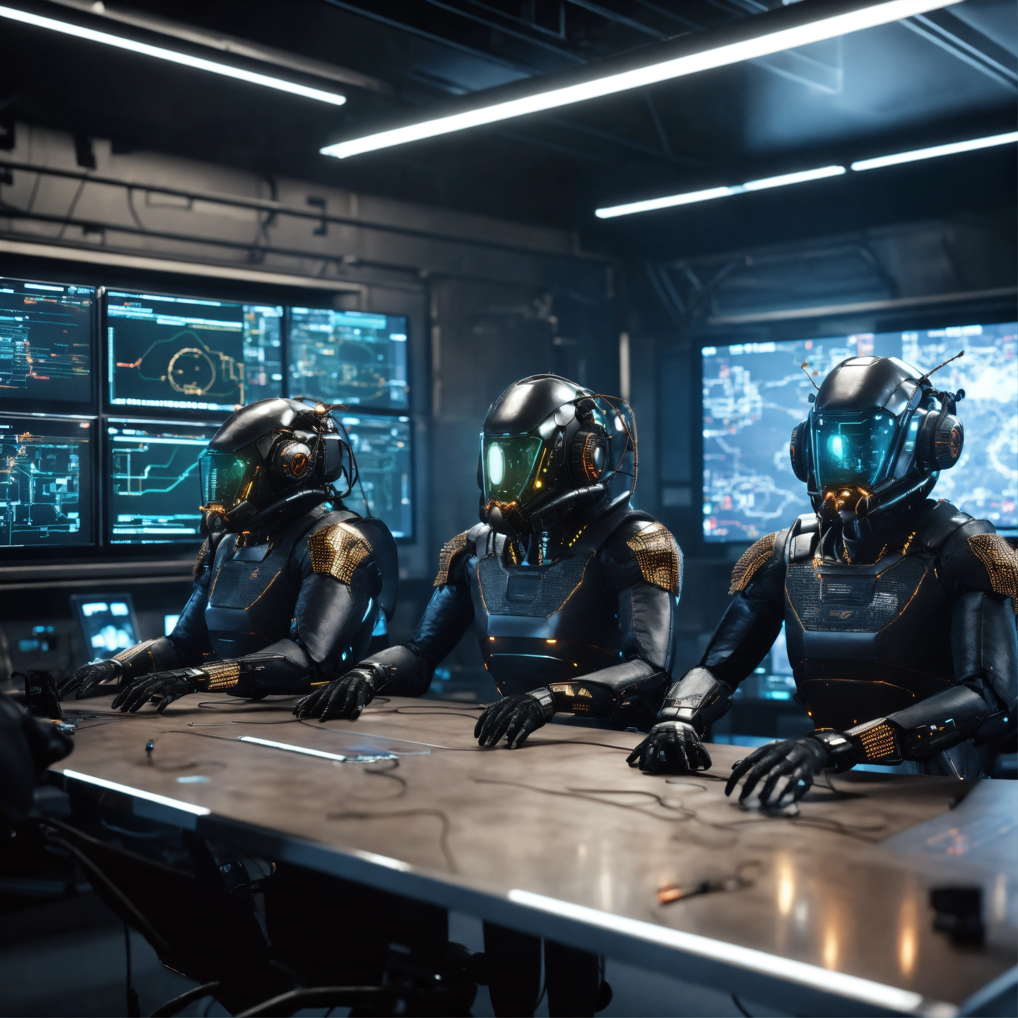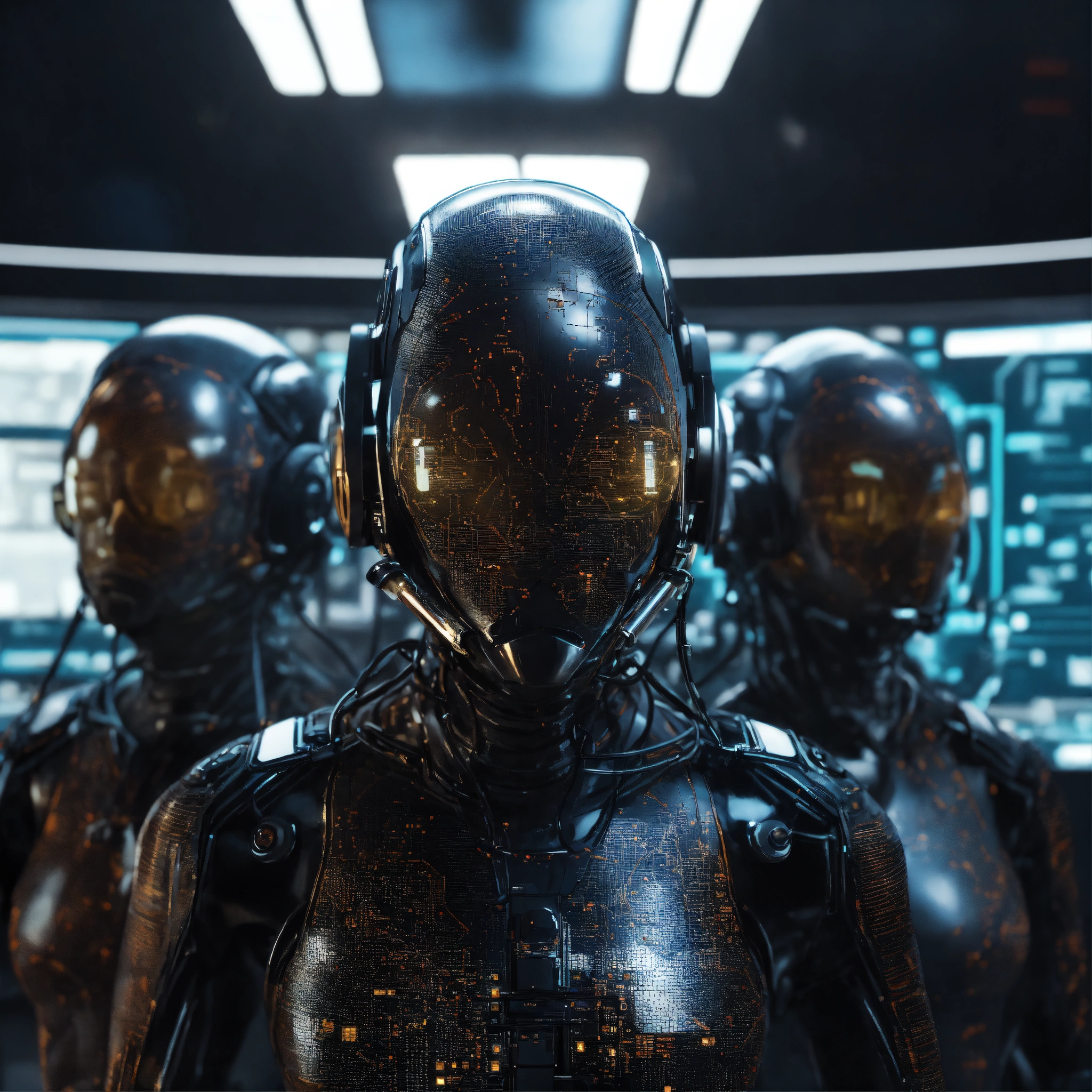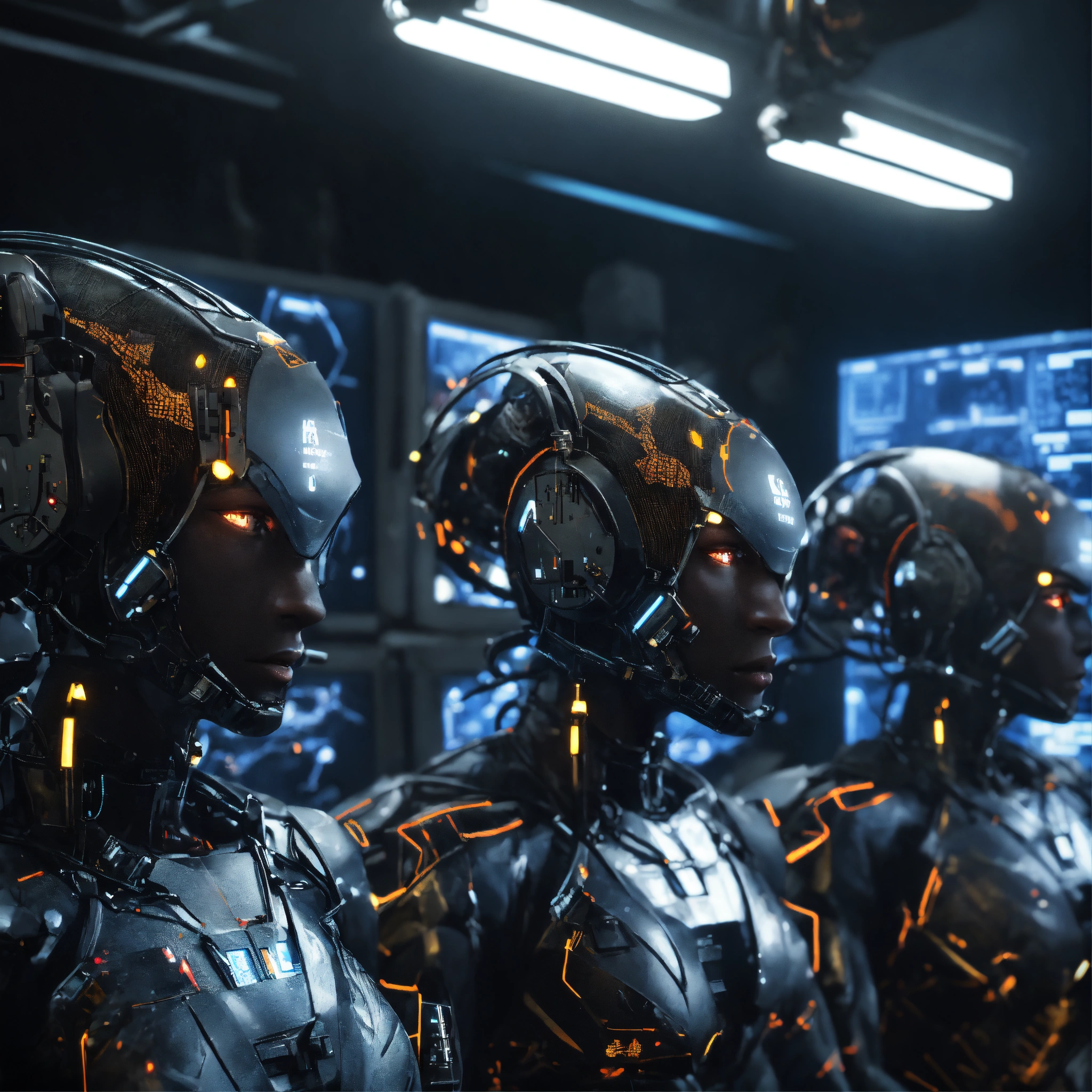 Group of 3 black cockroach faced humanoids with detailed circuit markings, morphing into a human face, in a hi tech control room, realistic, 8k, unreal engine