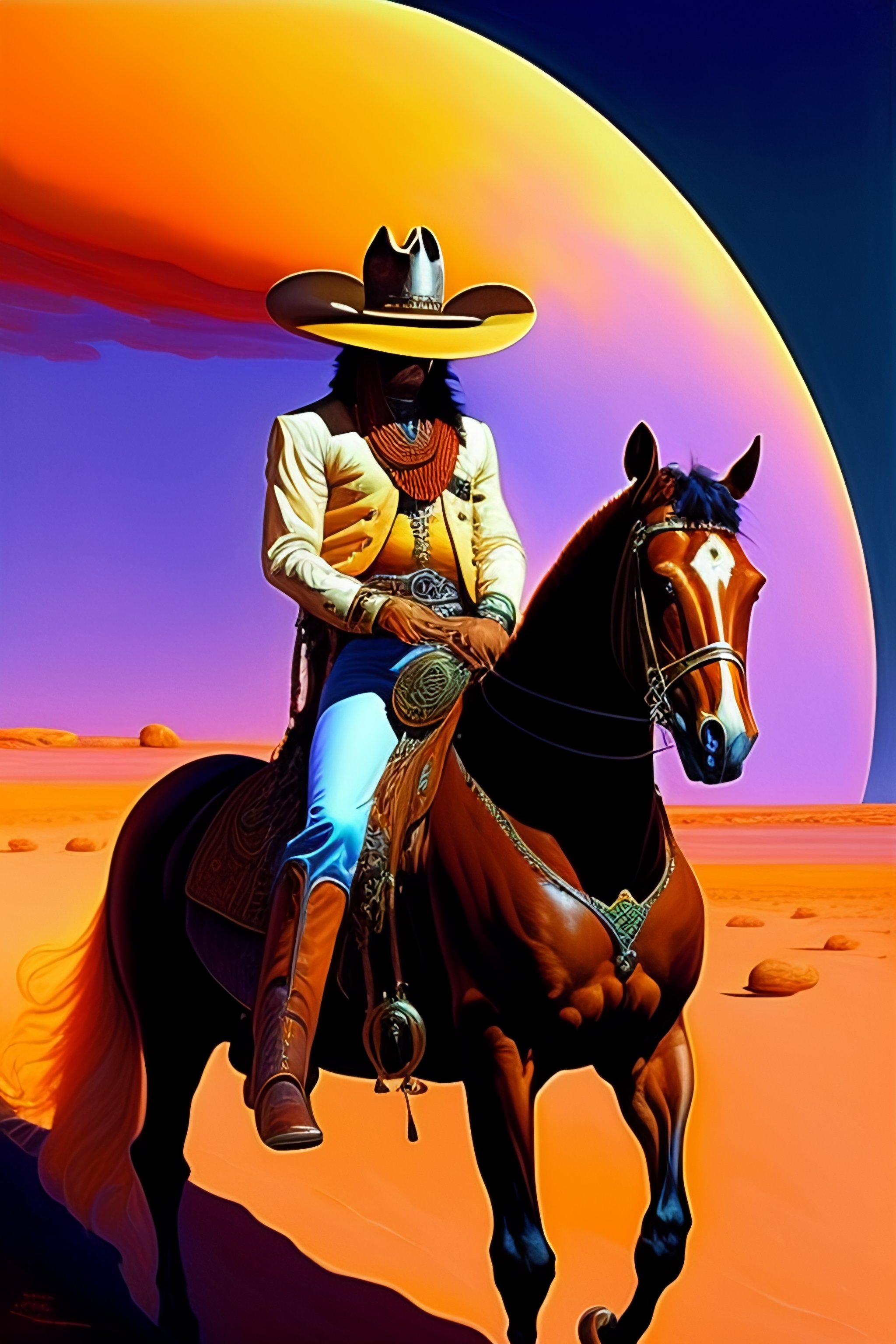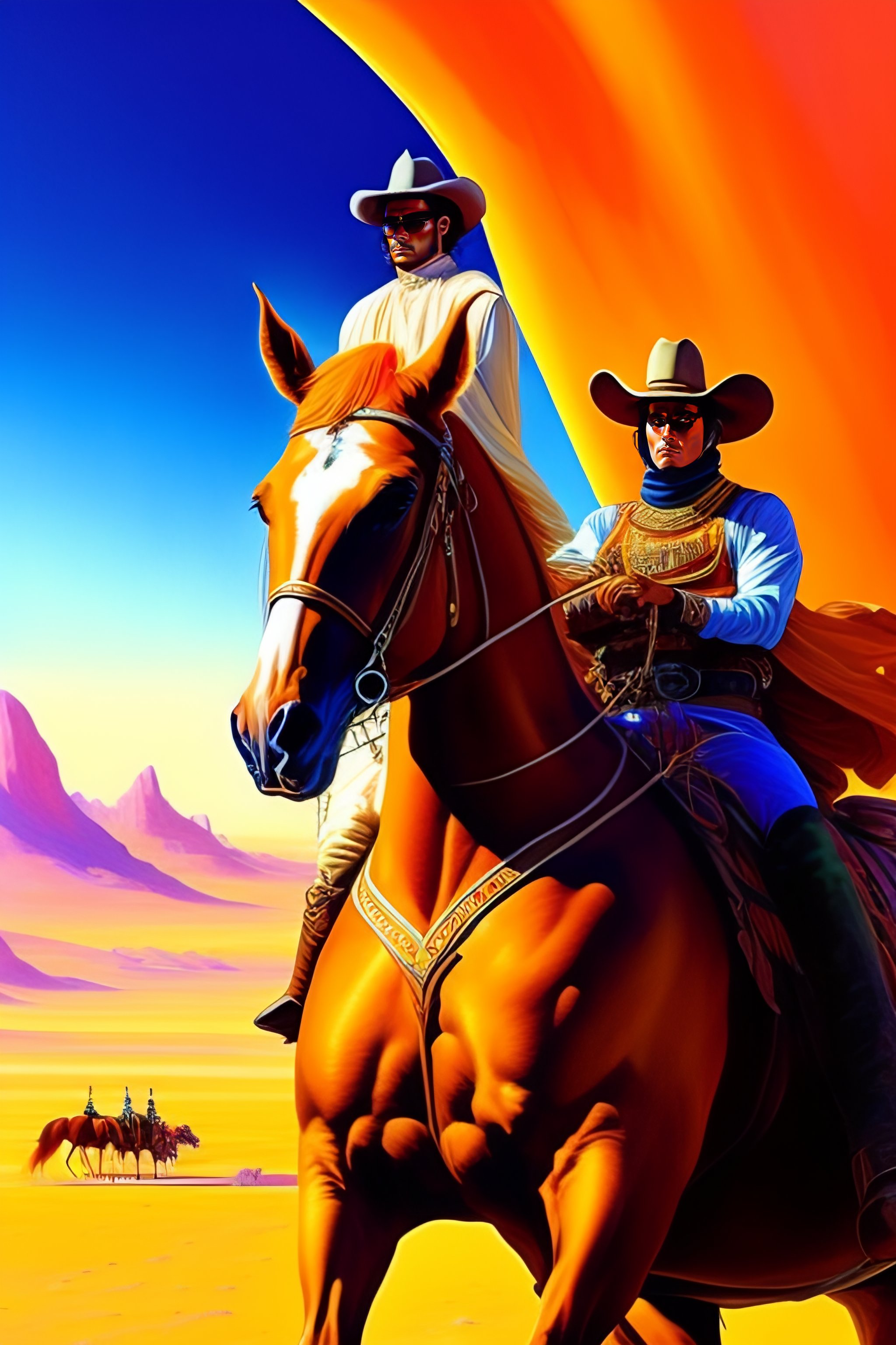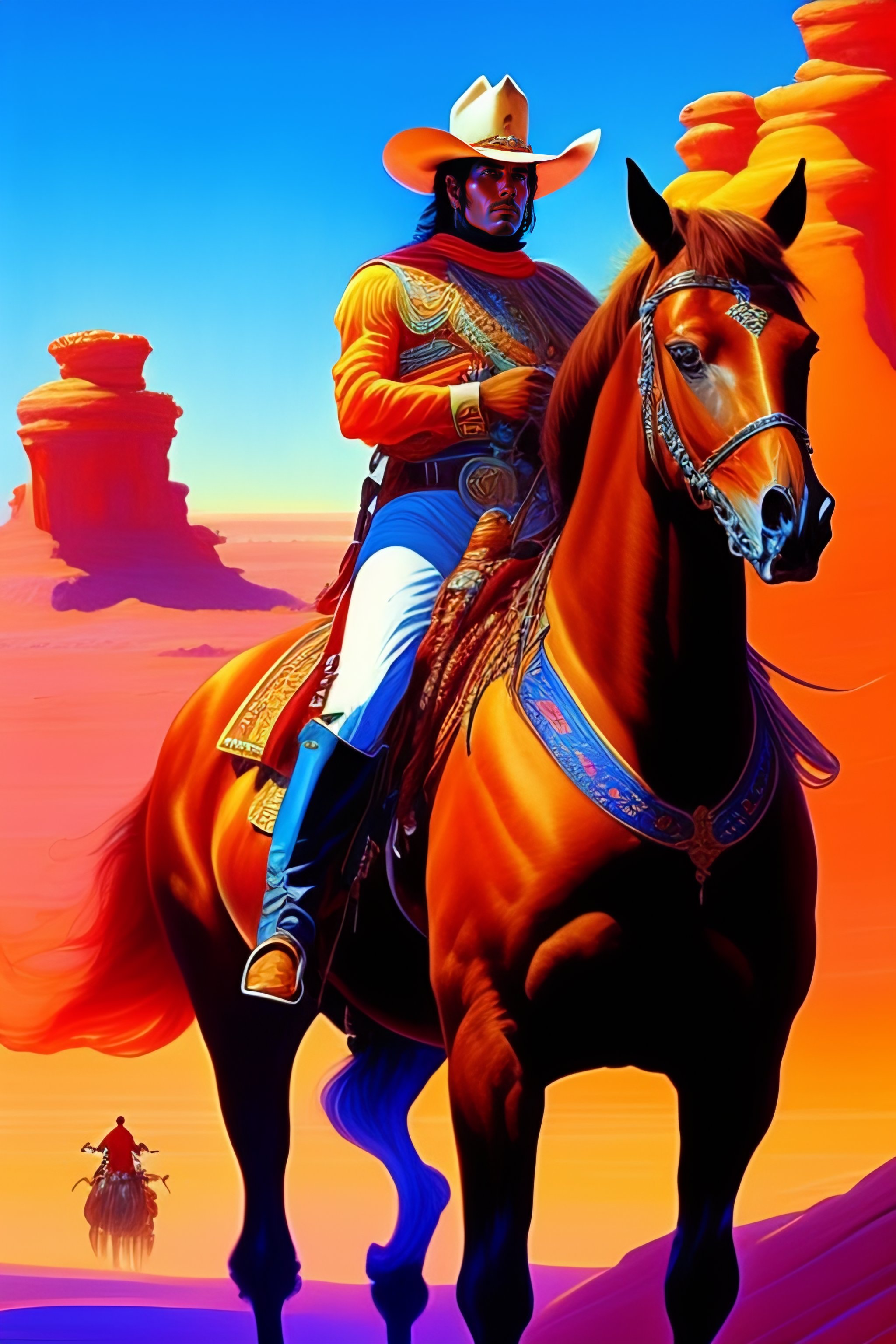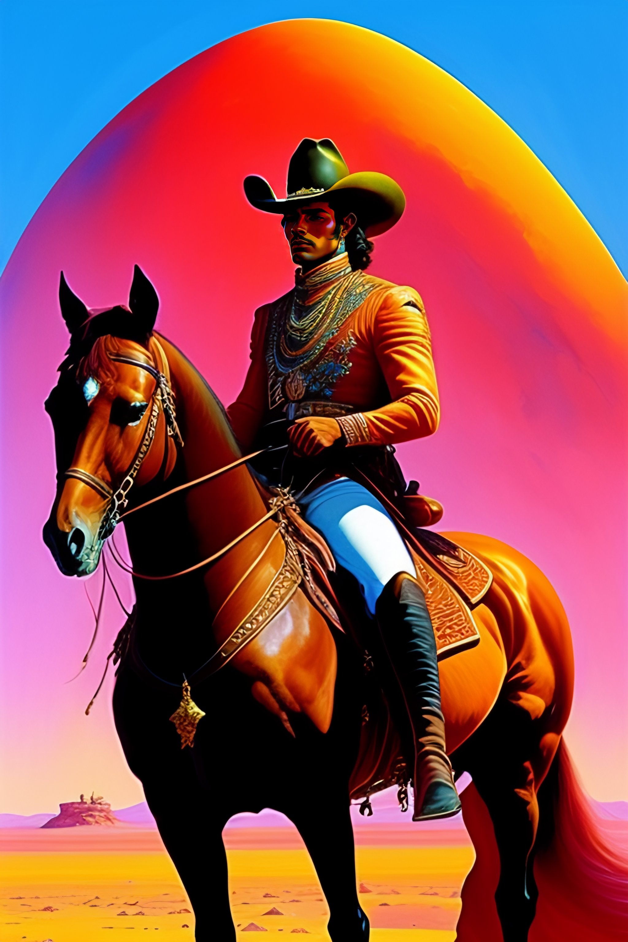 Scifi mexican cowboy sitting on giant arabian horse with solar paneled saddle, science fiction, art by jean giraud, moebius, juan gimenez, greg manchess, in watercolor gouache detailed paintings, in style of syd mead, colorful comics style, artstation