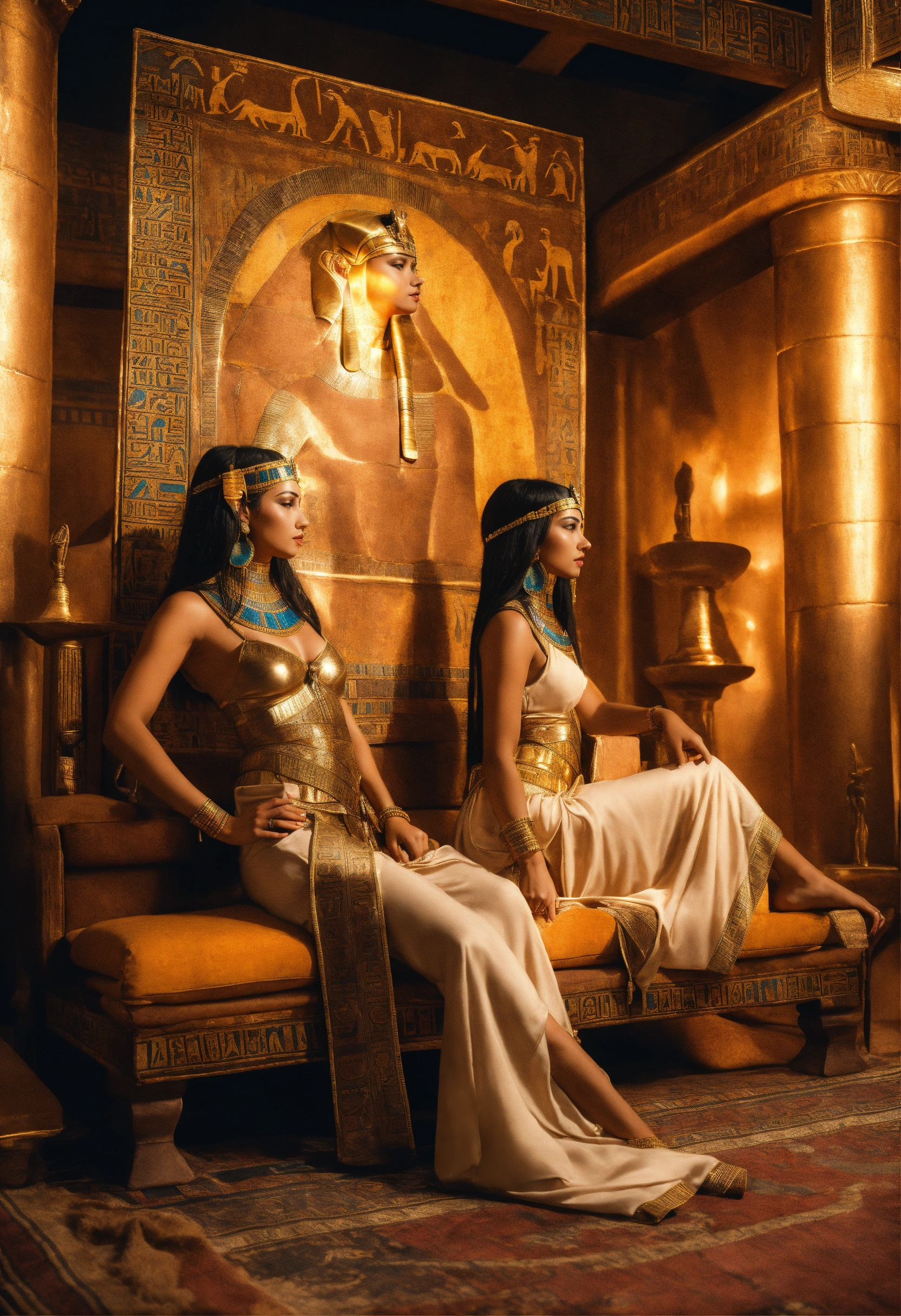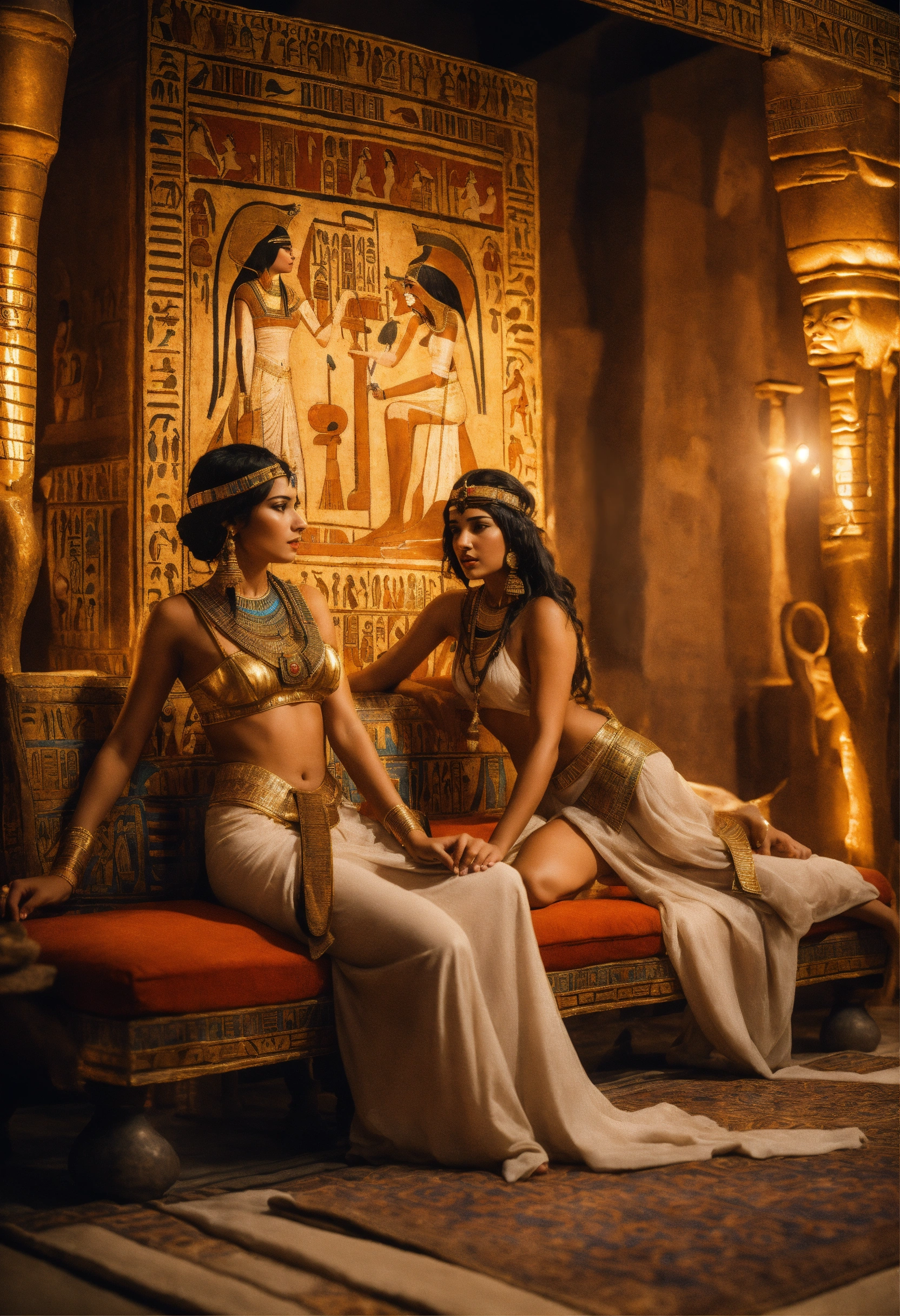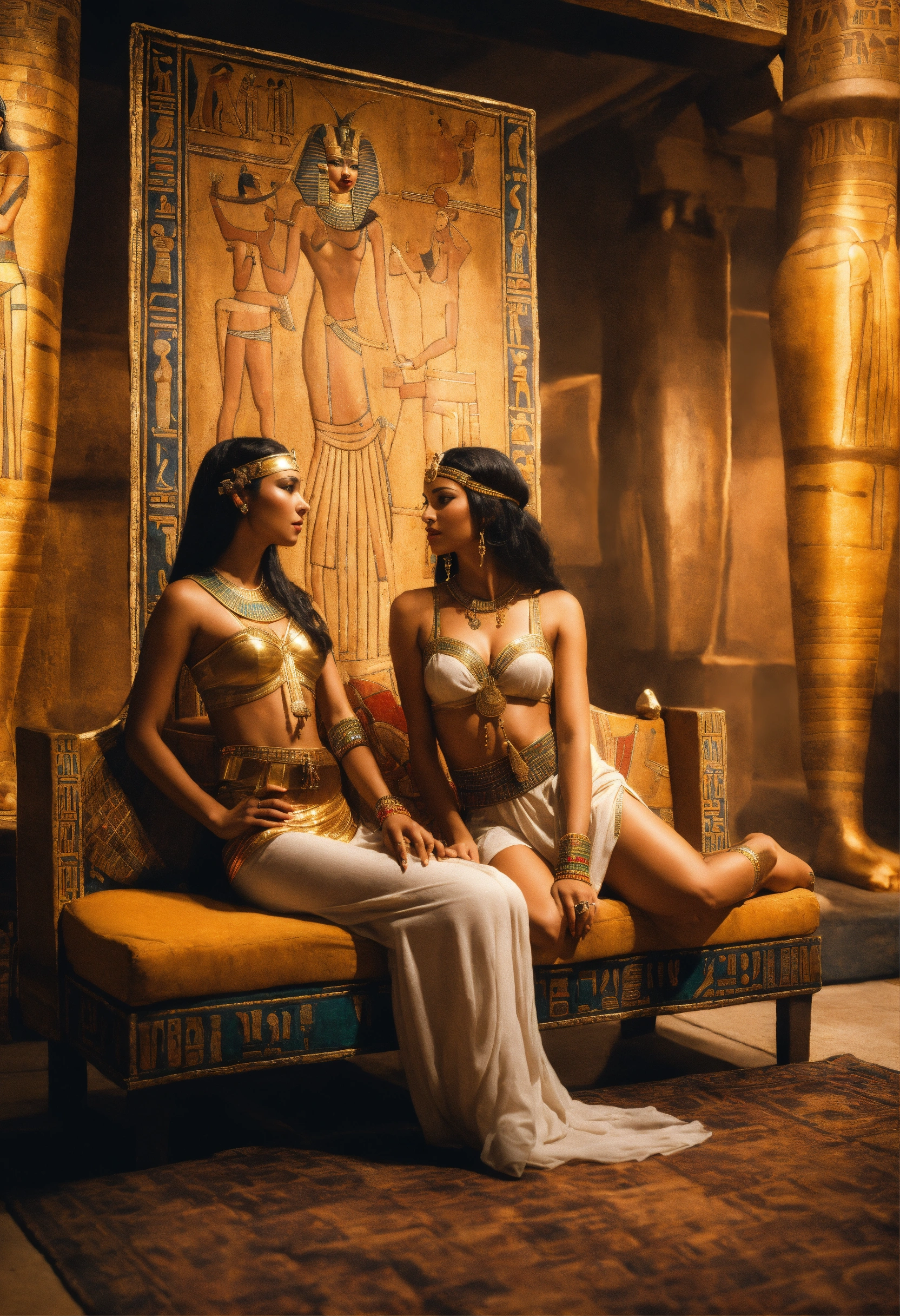 An epic fantasy scene in ancient egypt featuring two gorgeous beautiful charming females in very attractive odalisque outfit standing by an ancient egyptian couch. side view, sharp detail.