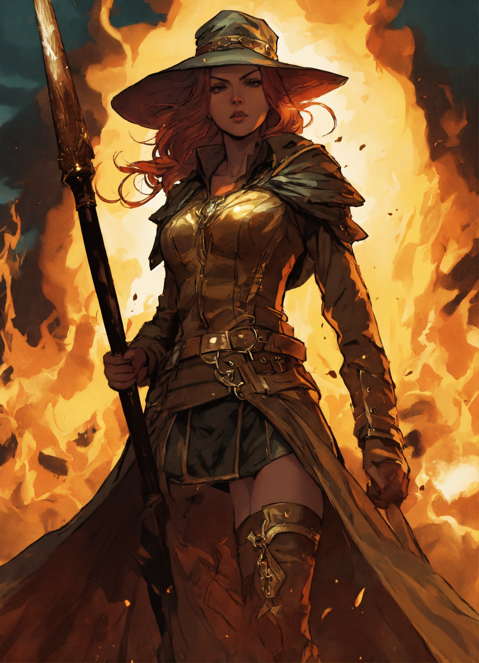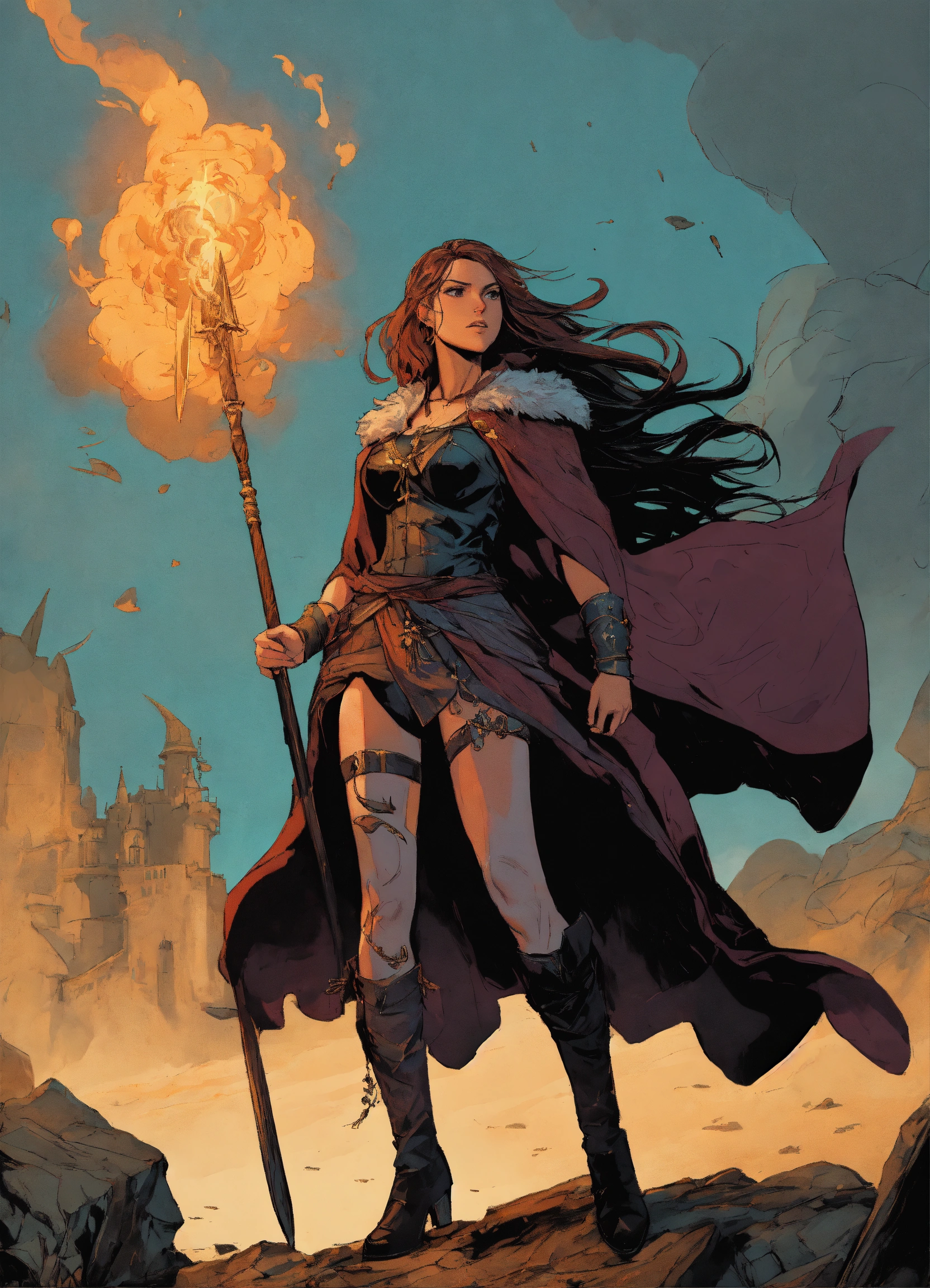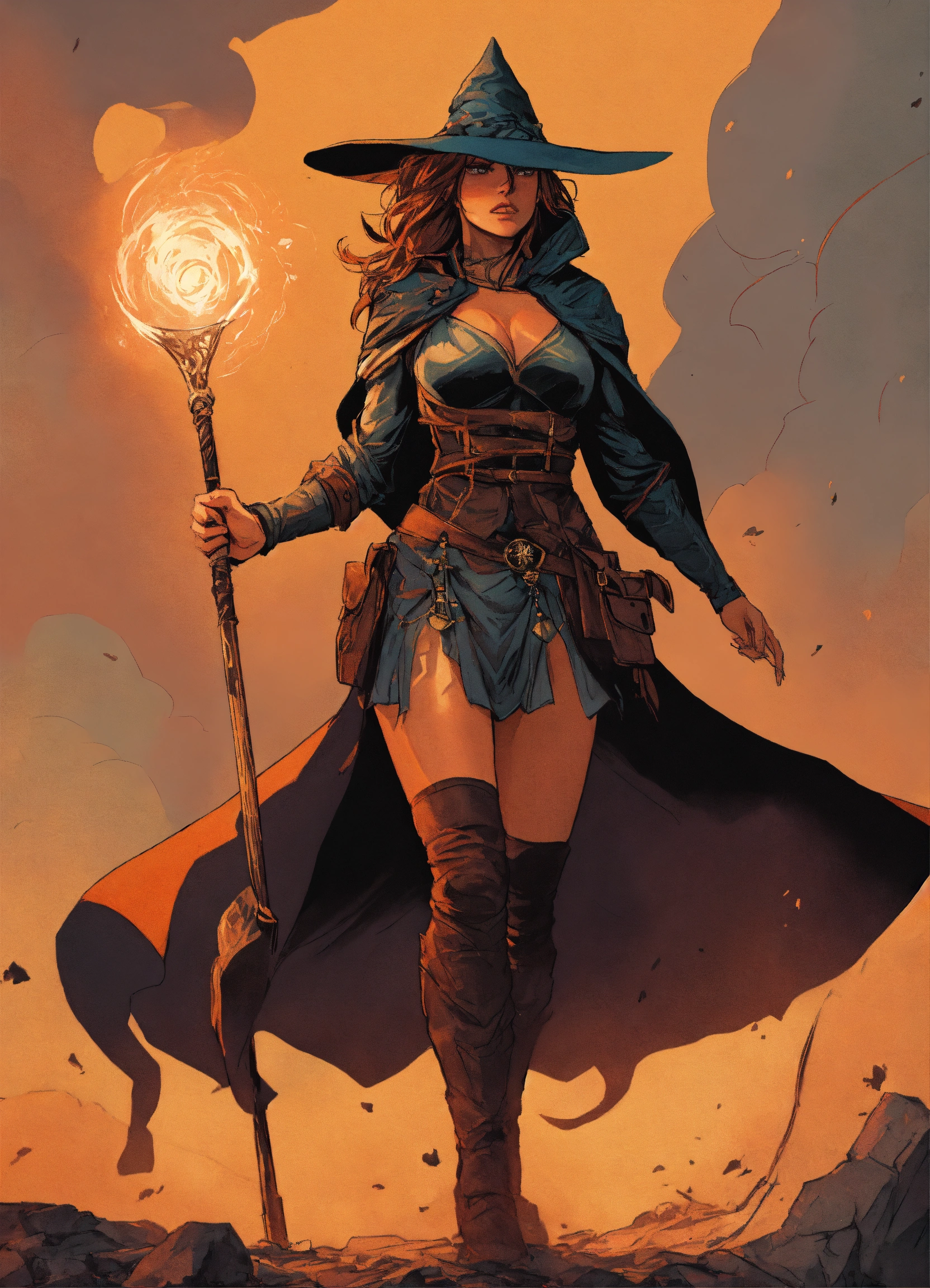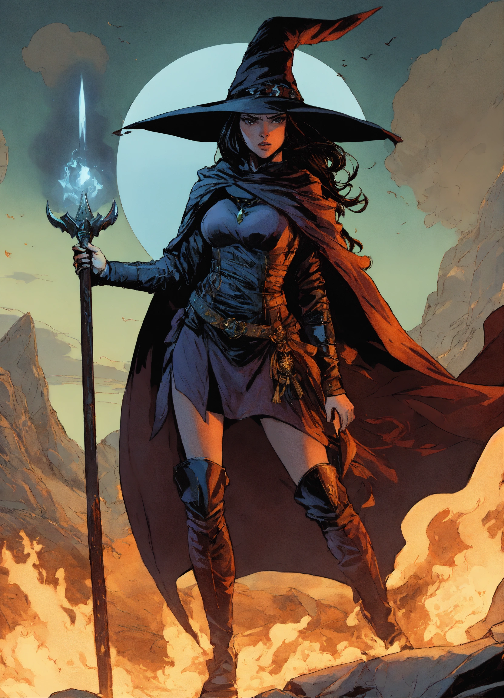 Full body image, a witch warrior, commanding presence, emanating strength, cinematic light, in graphic novel art form