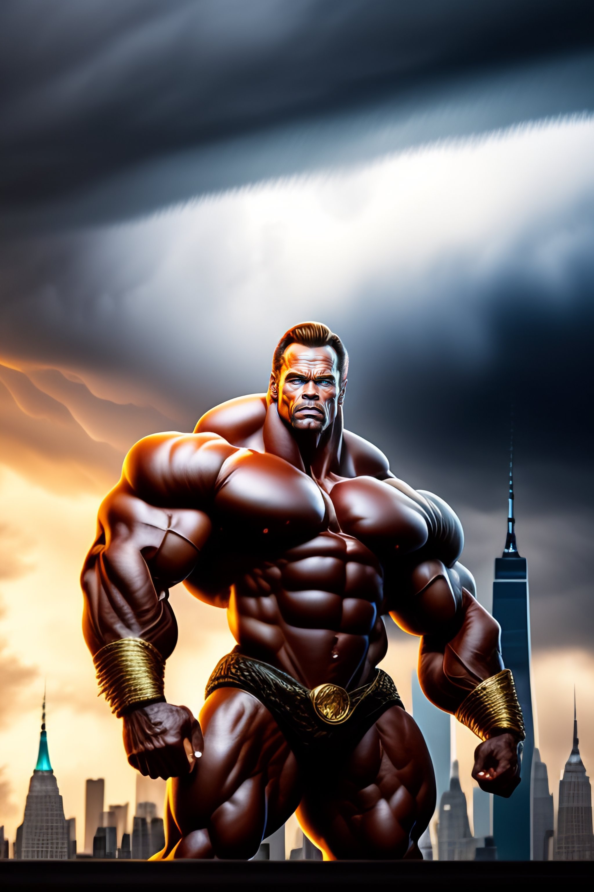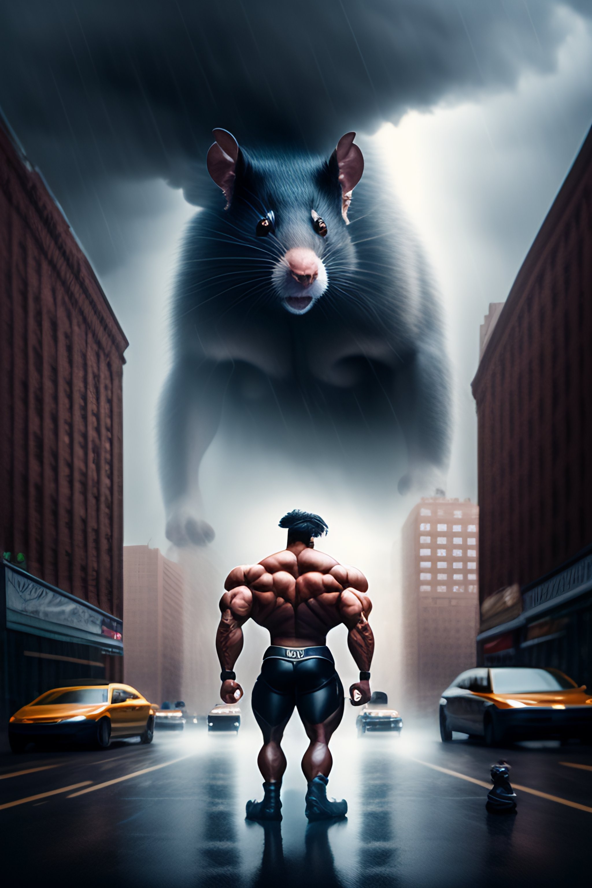 A massive muscular humanoid rat as tall as a building who looks like arnold schwarzenegger, in new york city, highly detailed, epic storm, in a dramatic atmosphere, dramatic lighting