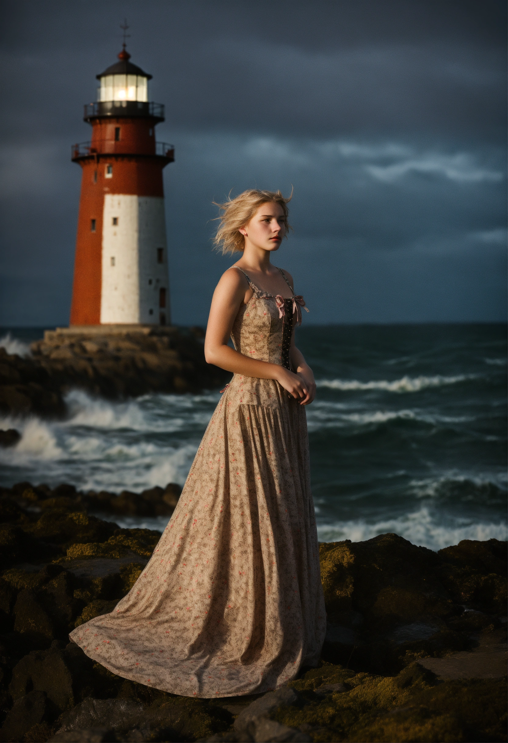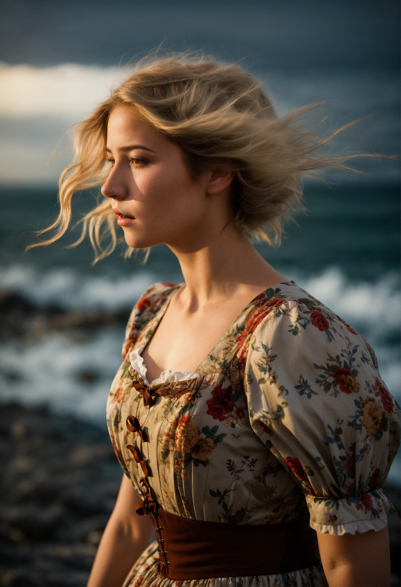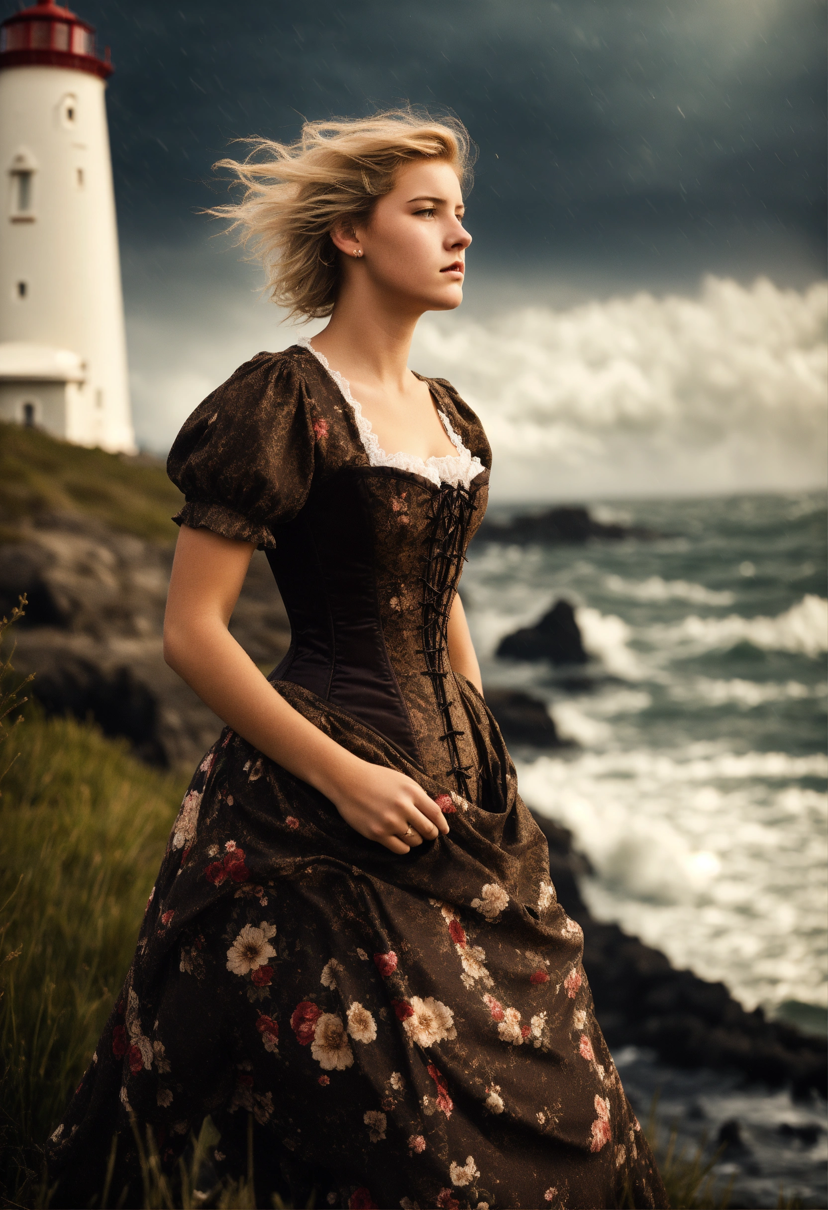 1910's 18 year old girl, wearing 1900's floral dress brown corset, sad, short light blonde hair blowing in the wind, by the dark ocean, in storm, lighthouse