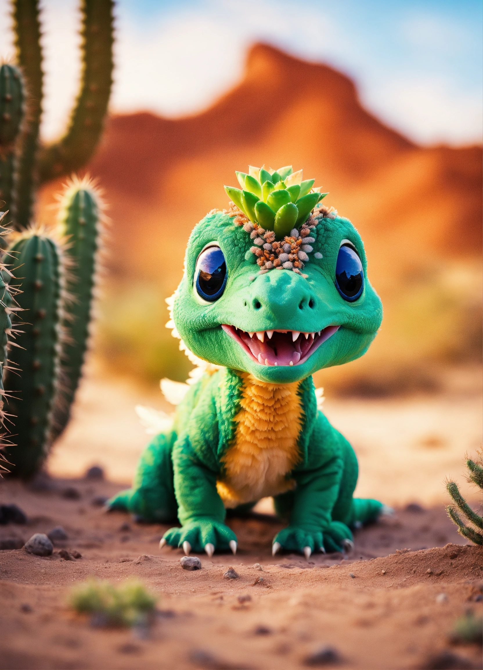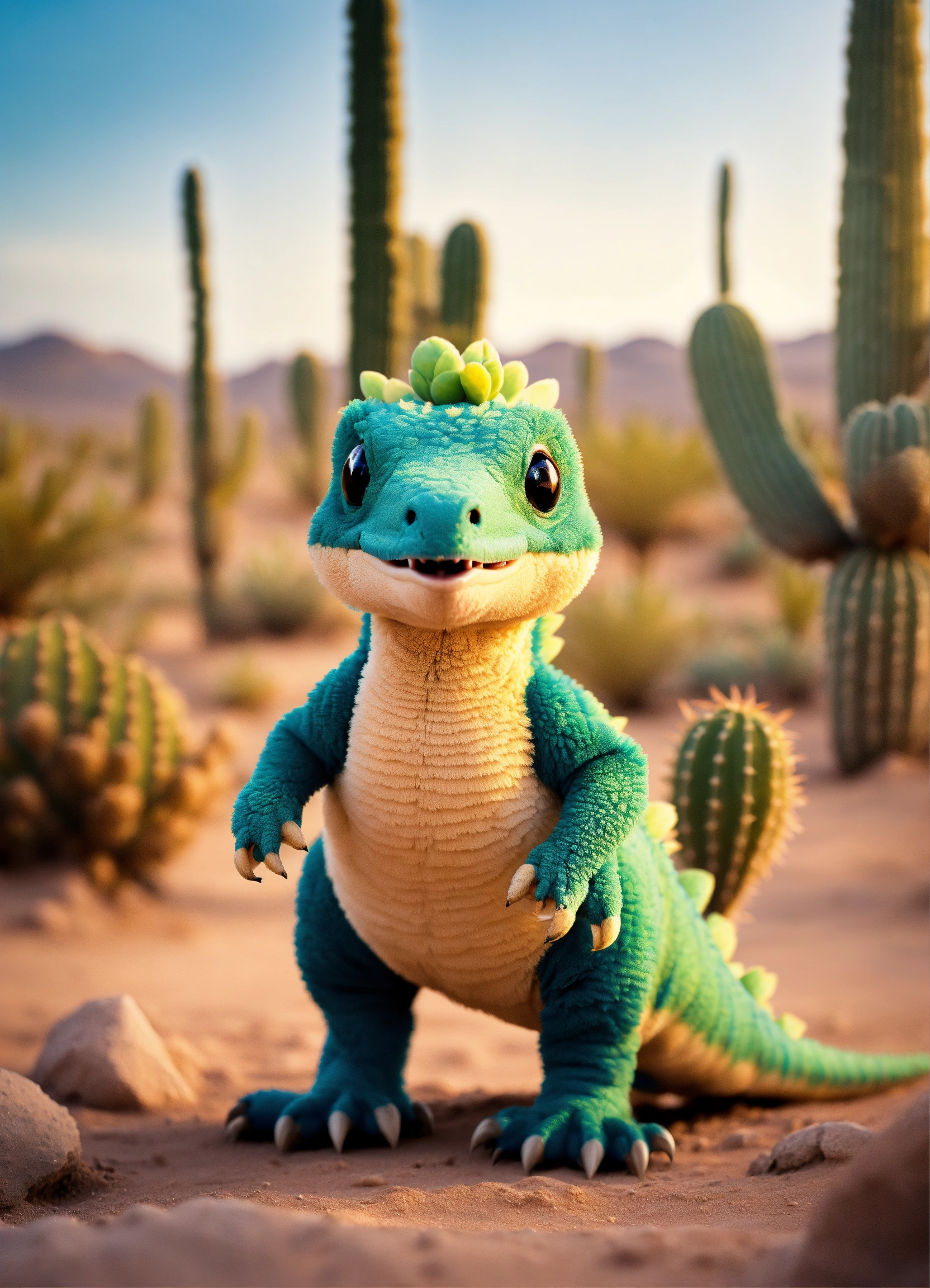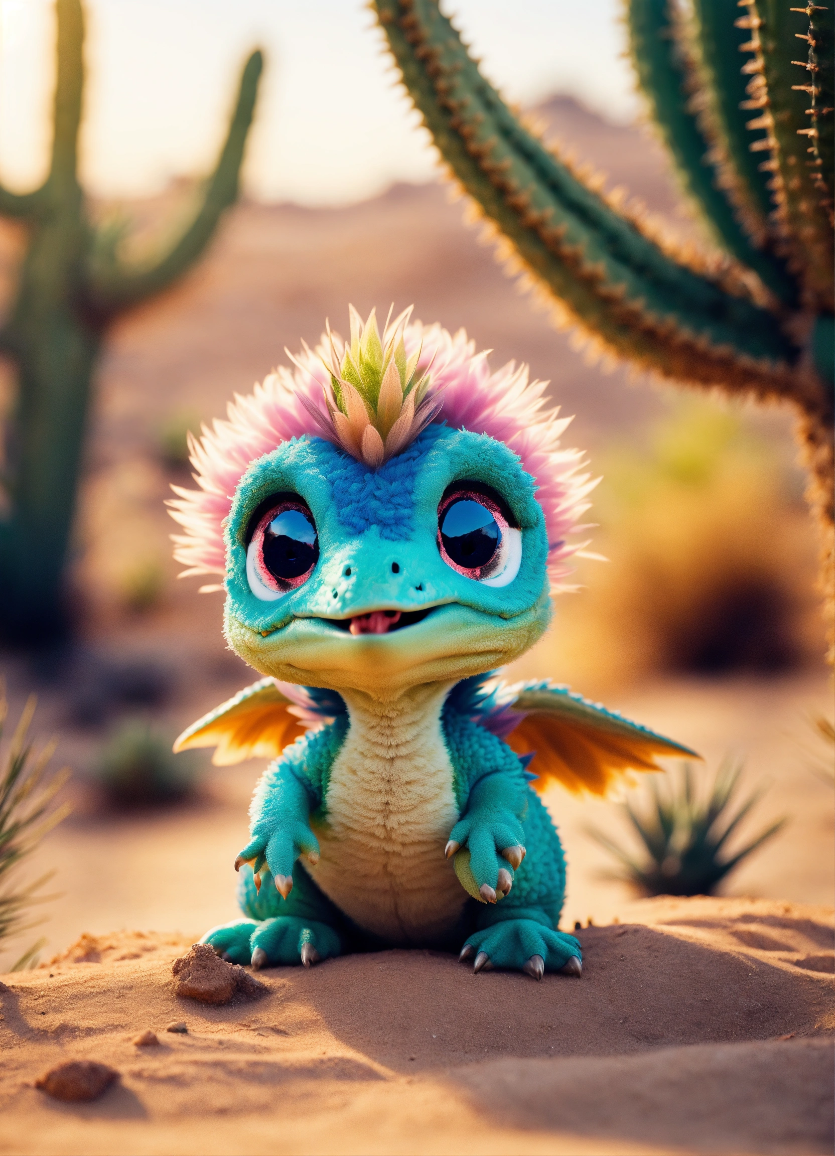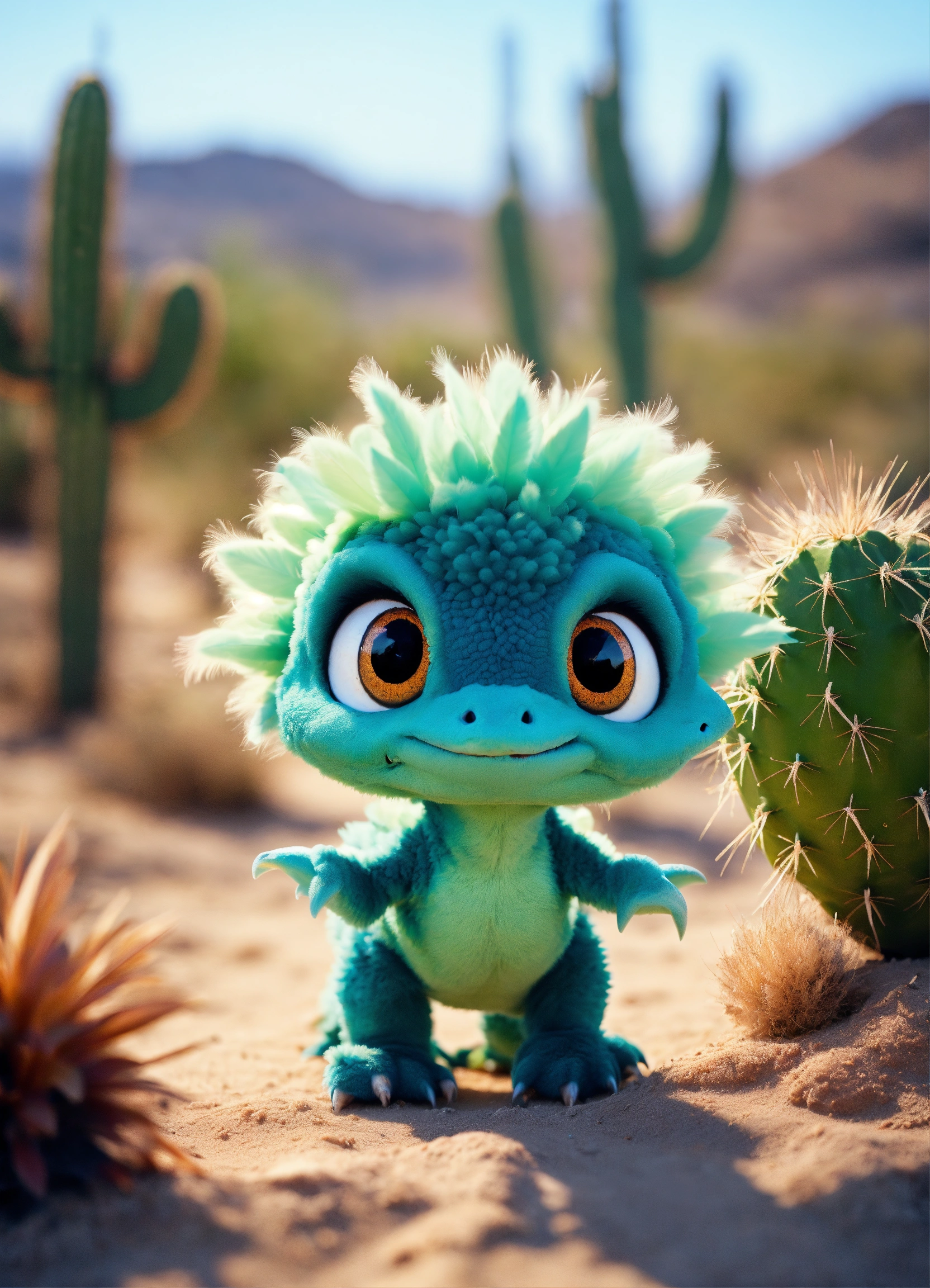 An adorable and fluffy baby dinosaur with big color eyes, with soft feathers and wings, in the desert with cactus, with blur background, high quality, 8k