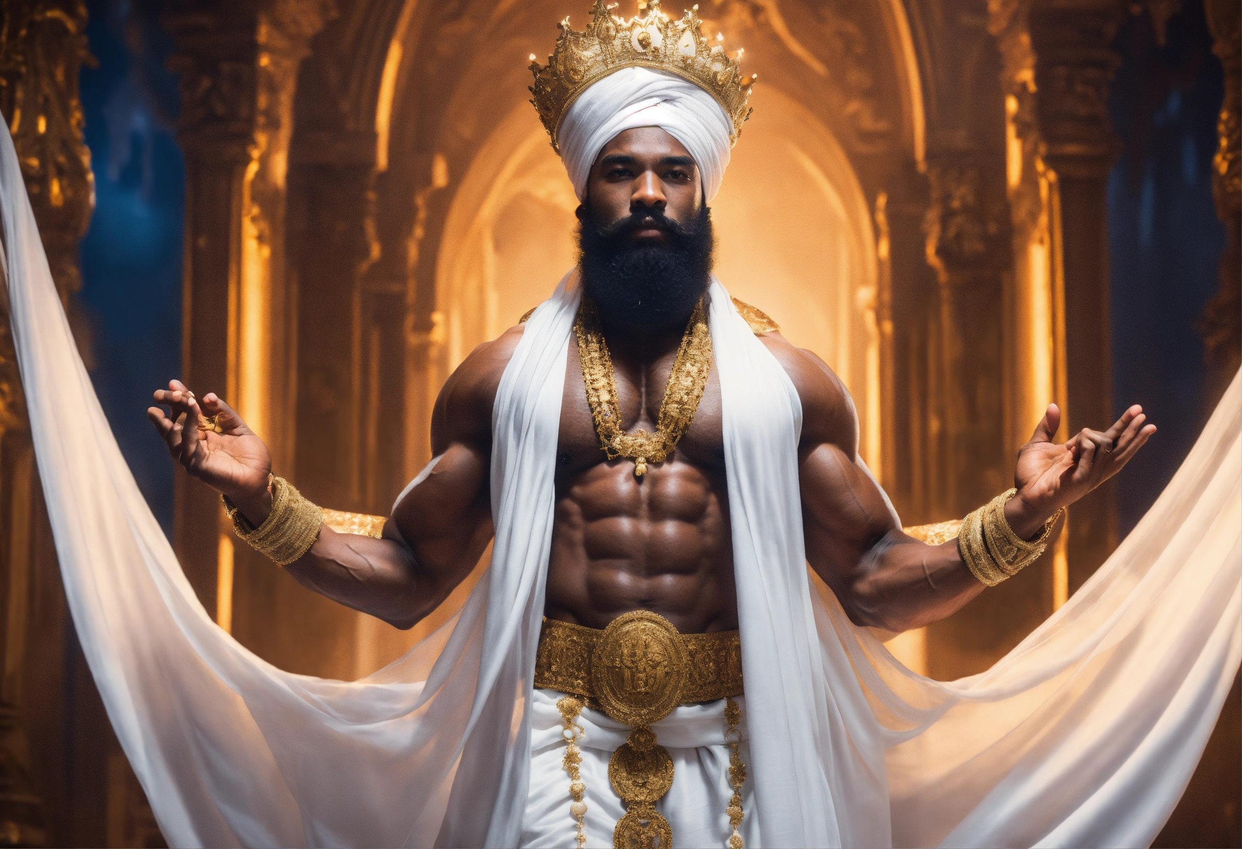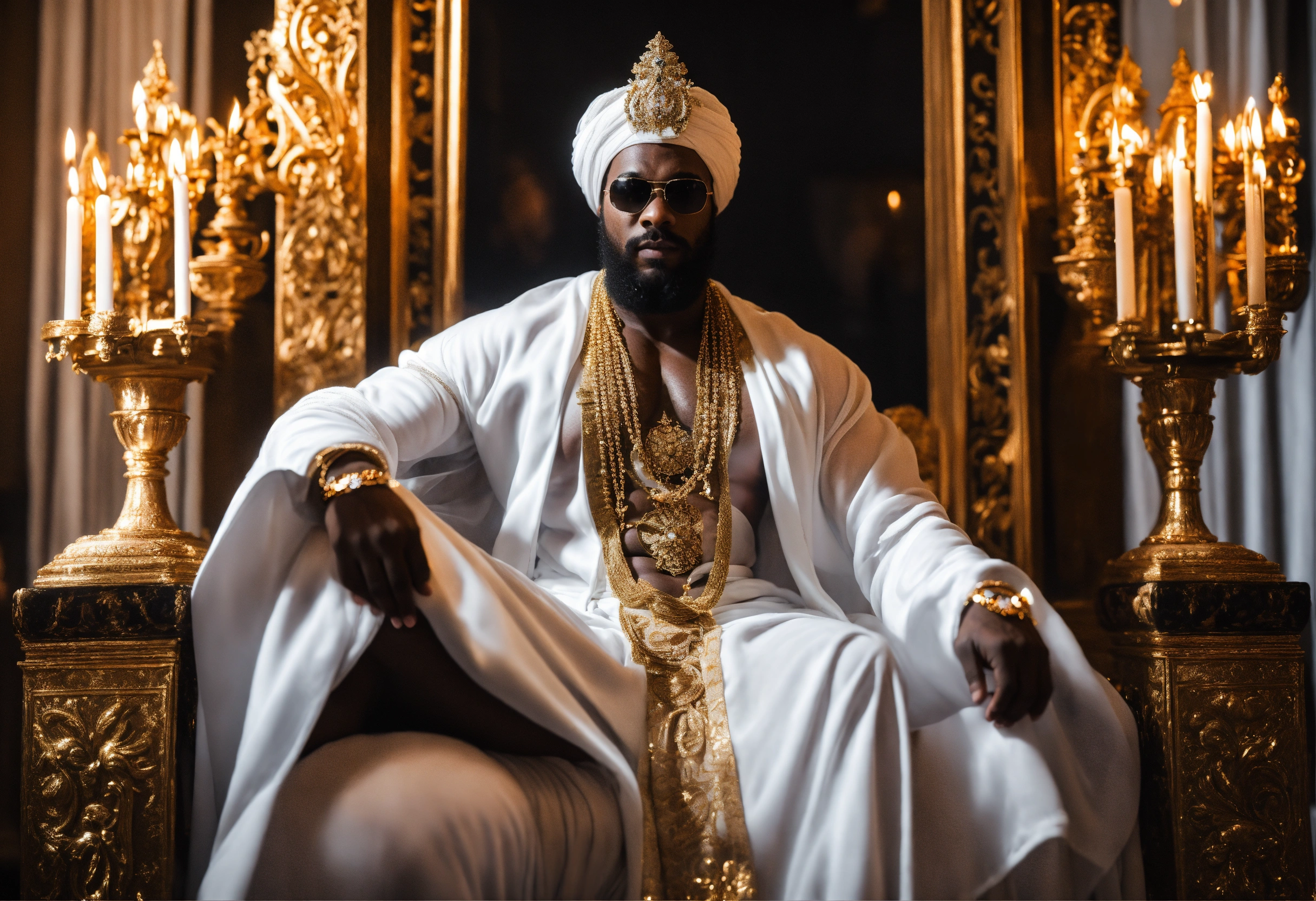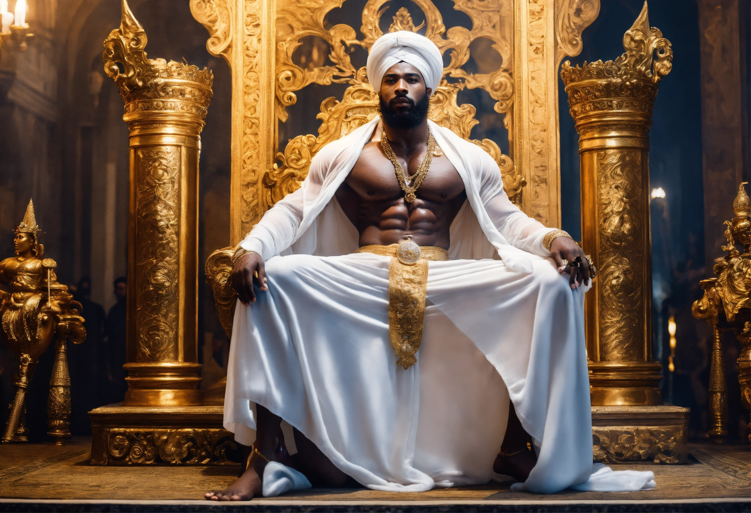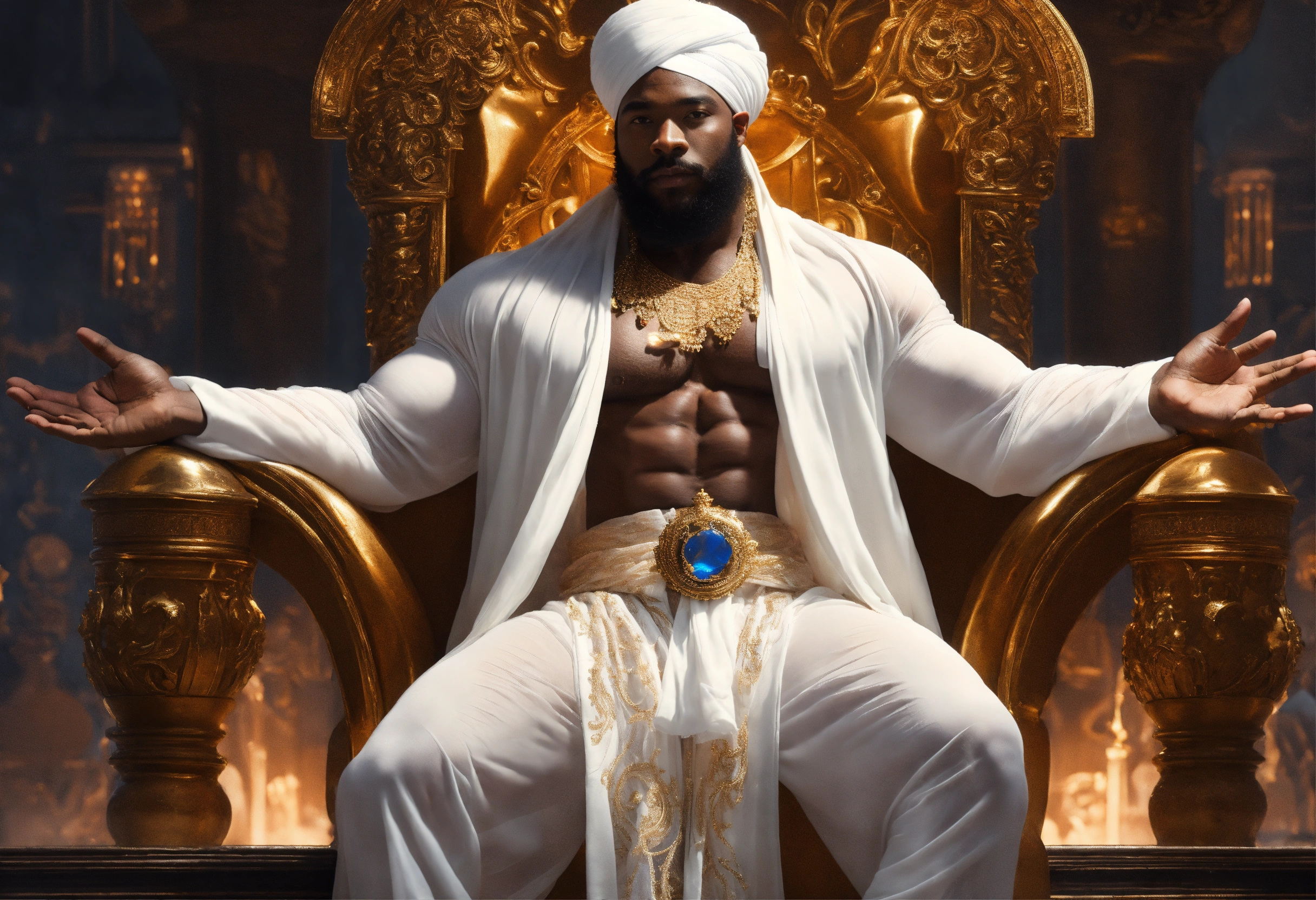 A black god king in white turban, in beautiful sheer and white sheer robe, bodybuilder, beard, black magic, strong legs, palace