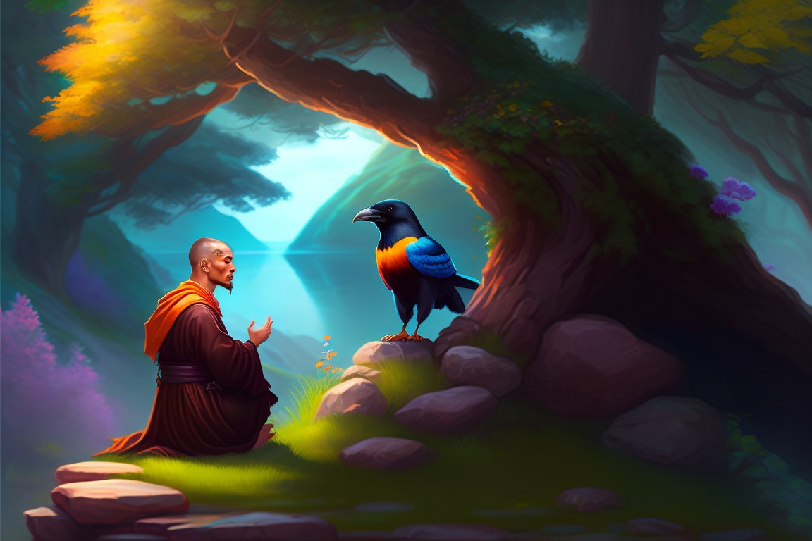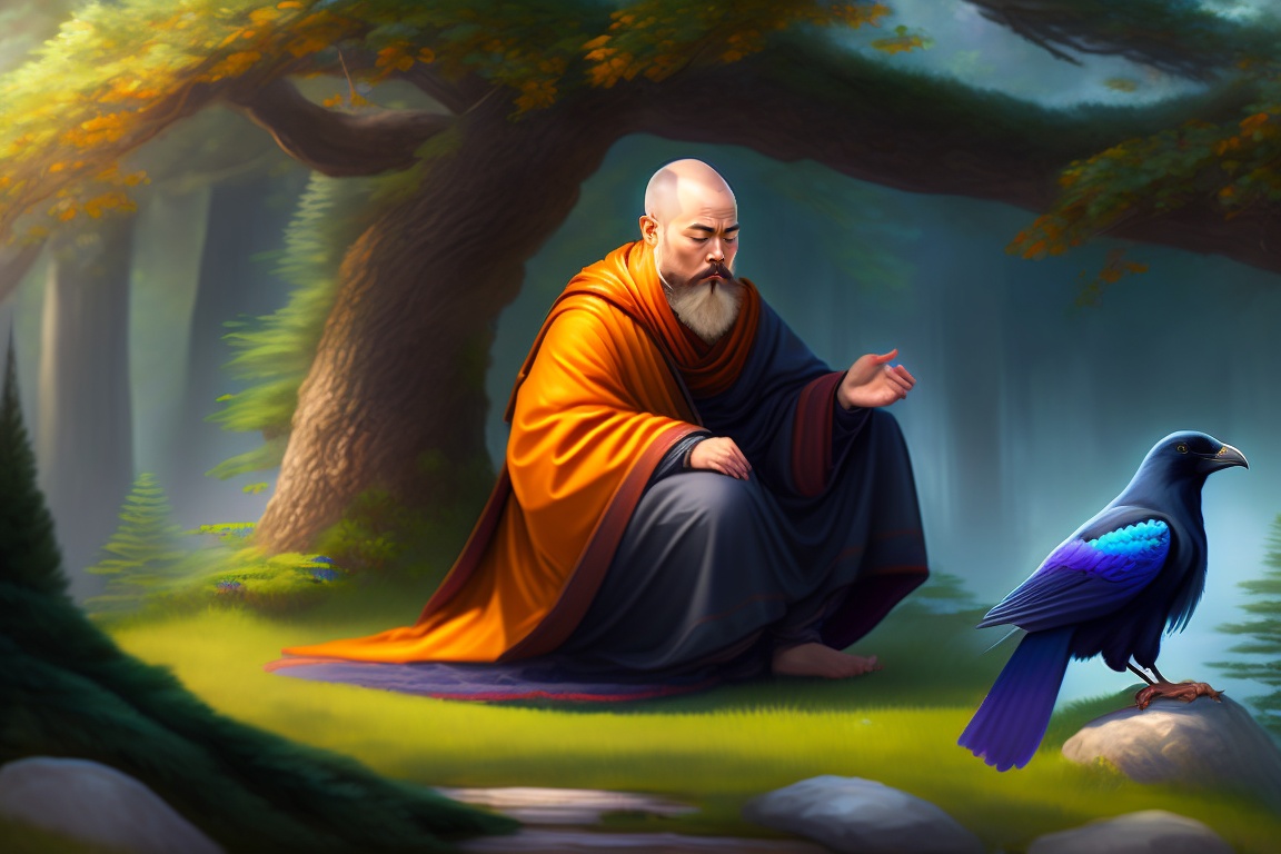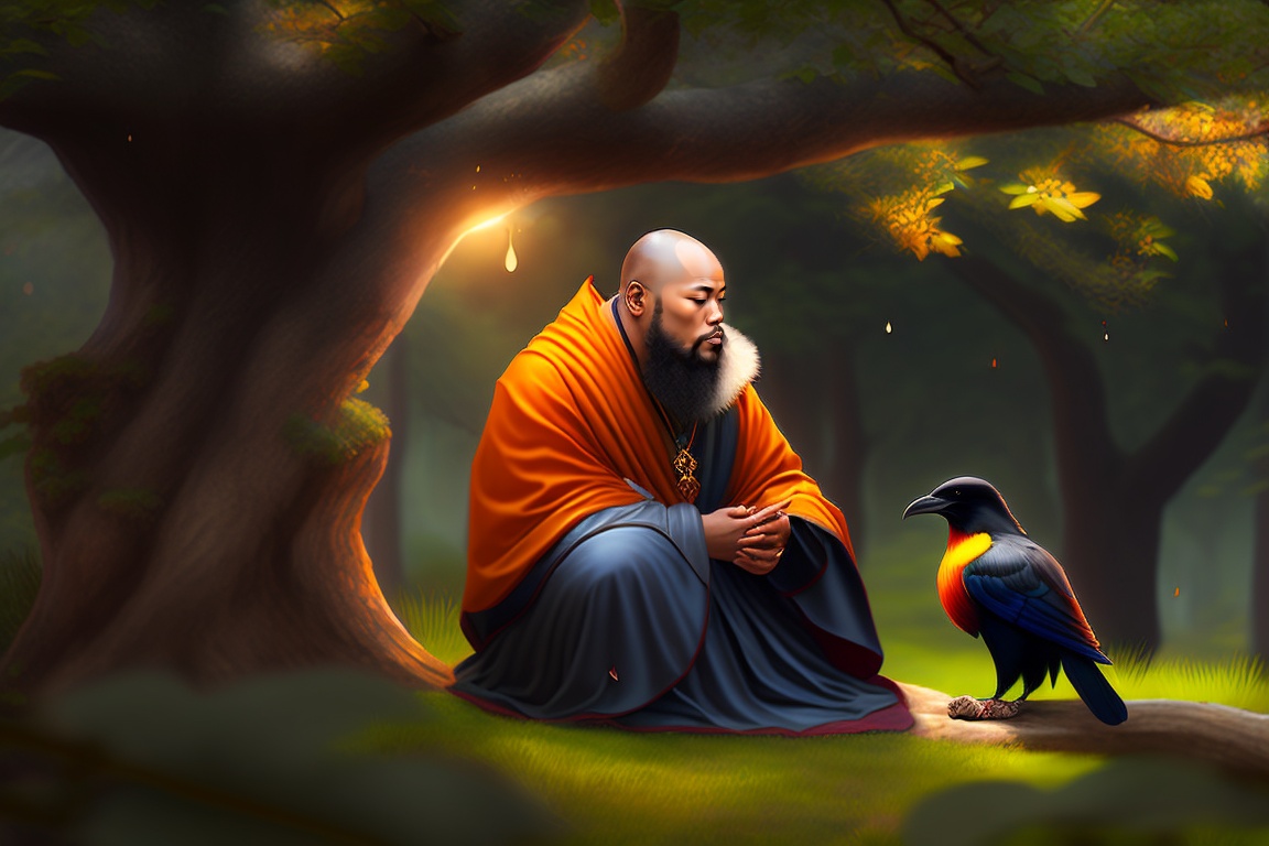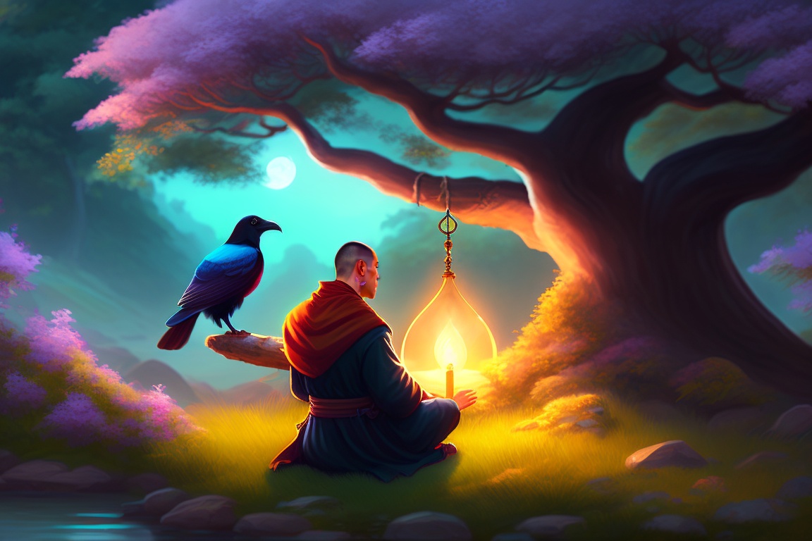 Digital painting of a wise monk meditating under a tree, with a crying raven watching on a tree branch