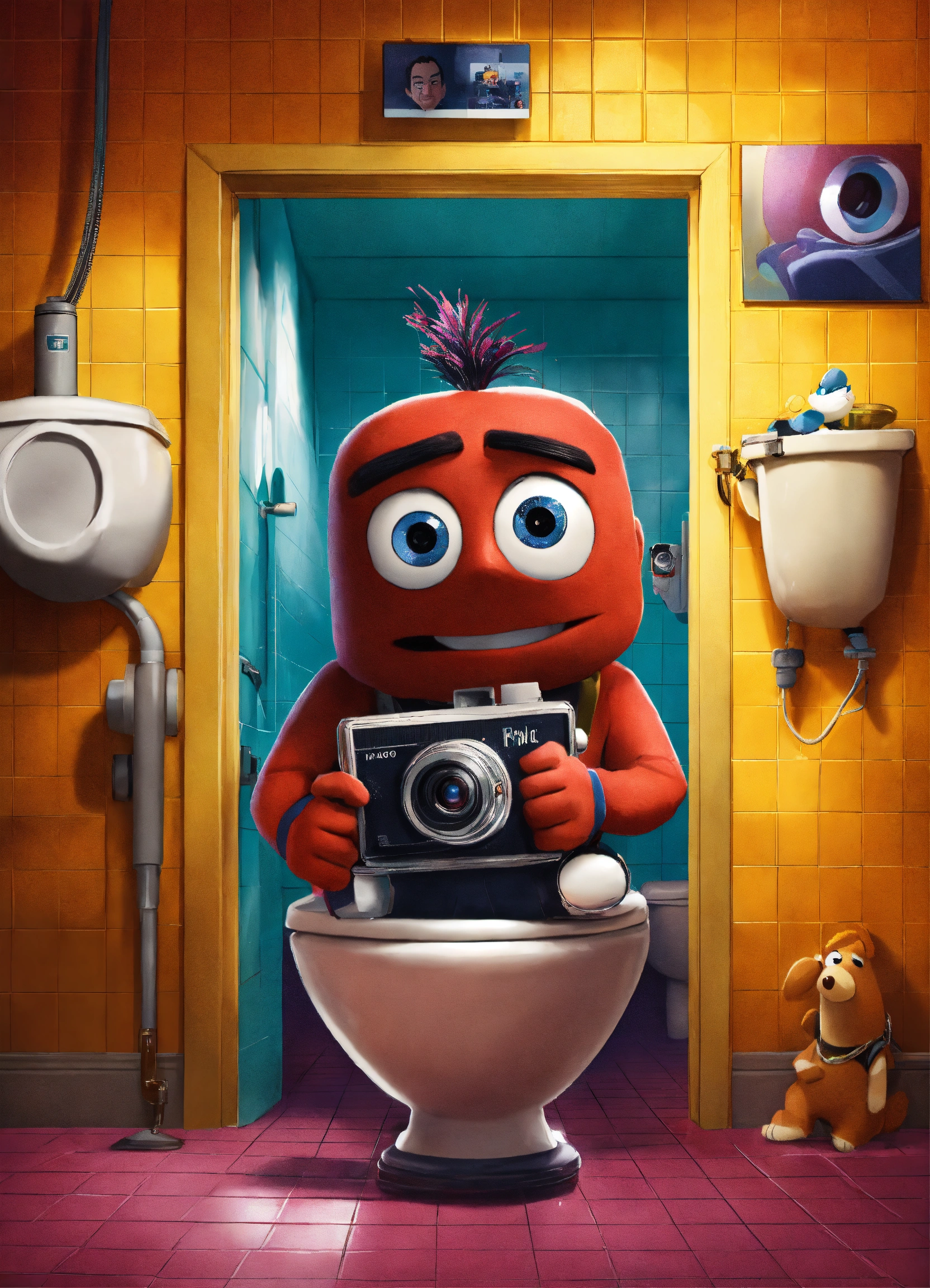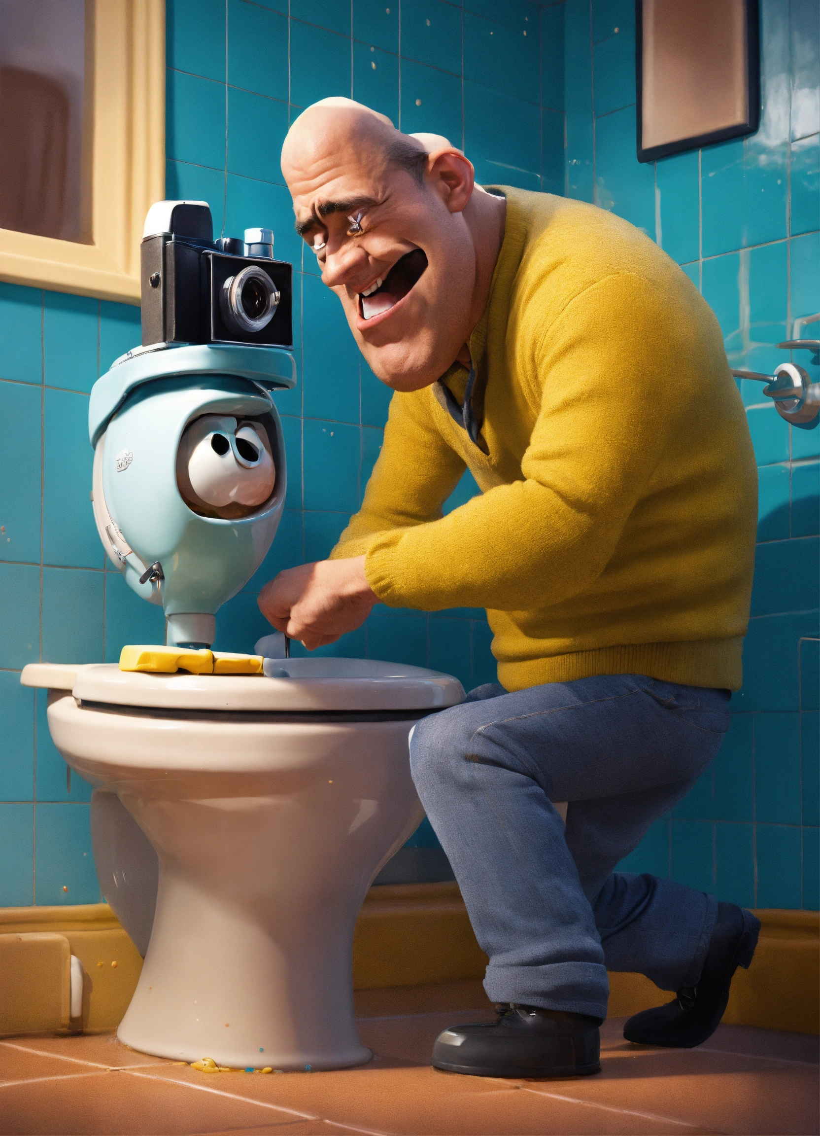 A pixar movie cover of a mans head in a toilet titled "skibidi toilet" and a man with a camera for a head fighting him