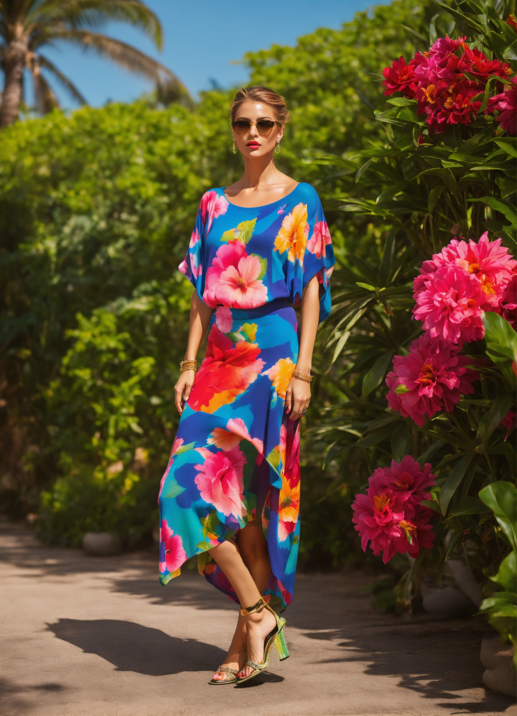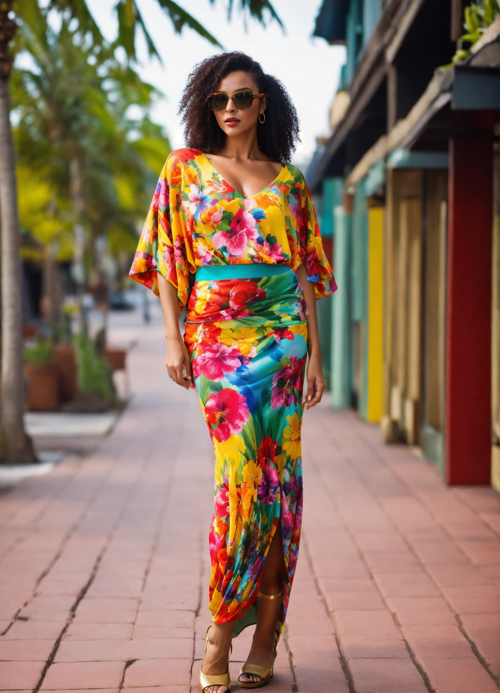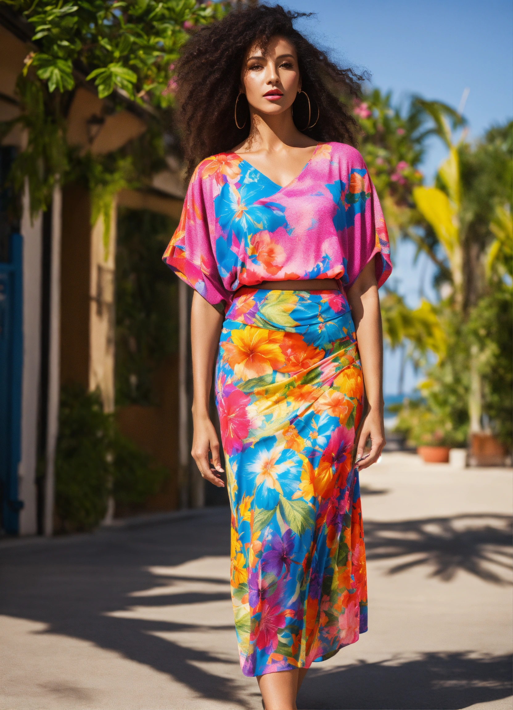 Ultra realistic full body photo of female model natasha modeling coordinated novelty interesting complex unusual street modern brave funky summer outfit in very heavy opaque spandex knit printed with multicolor bright flowers dolman sleeve donna karan outfit dress skirt top shirt at tropical morning
