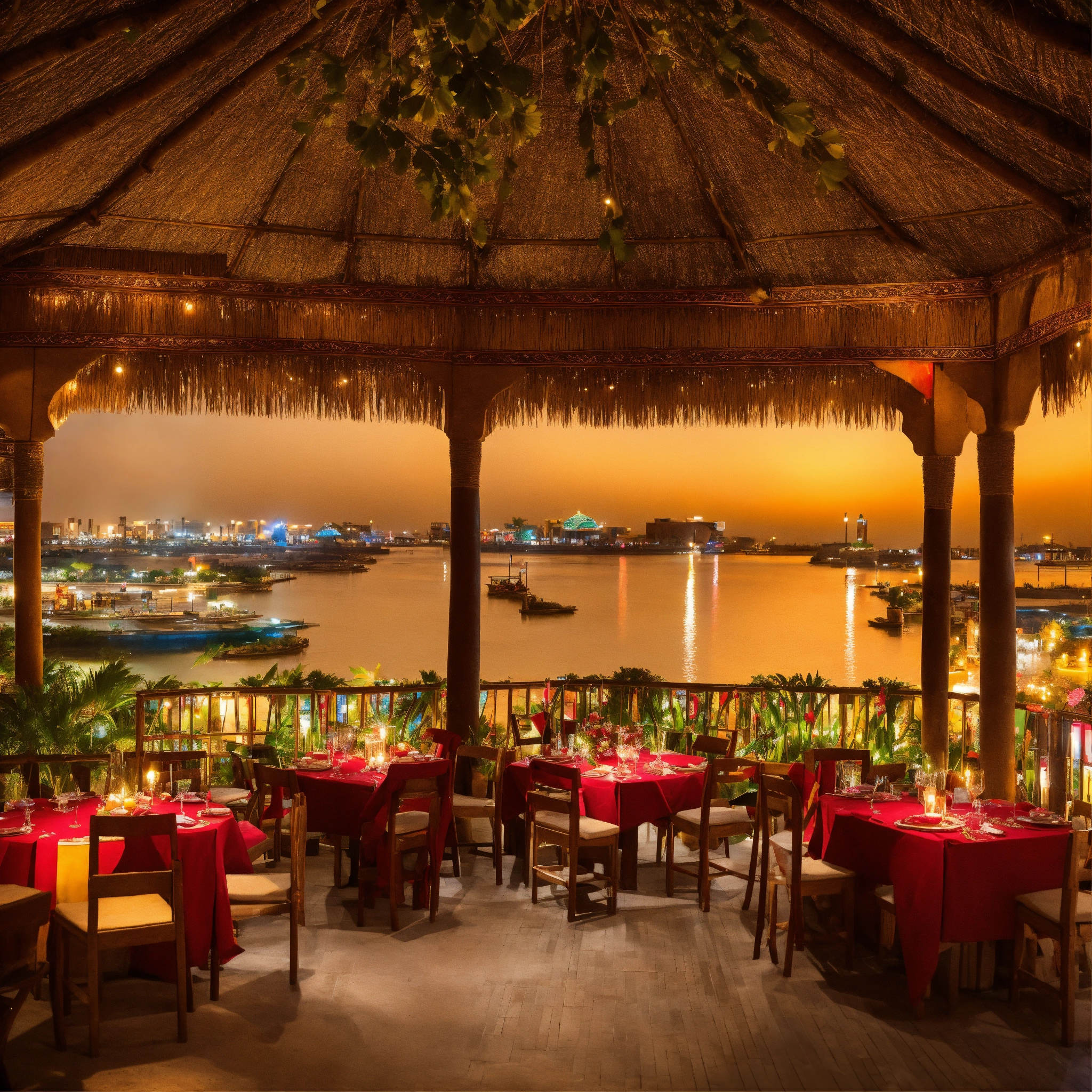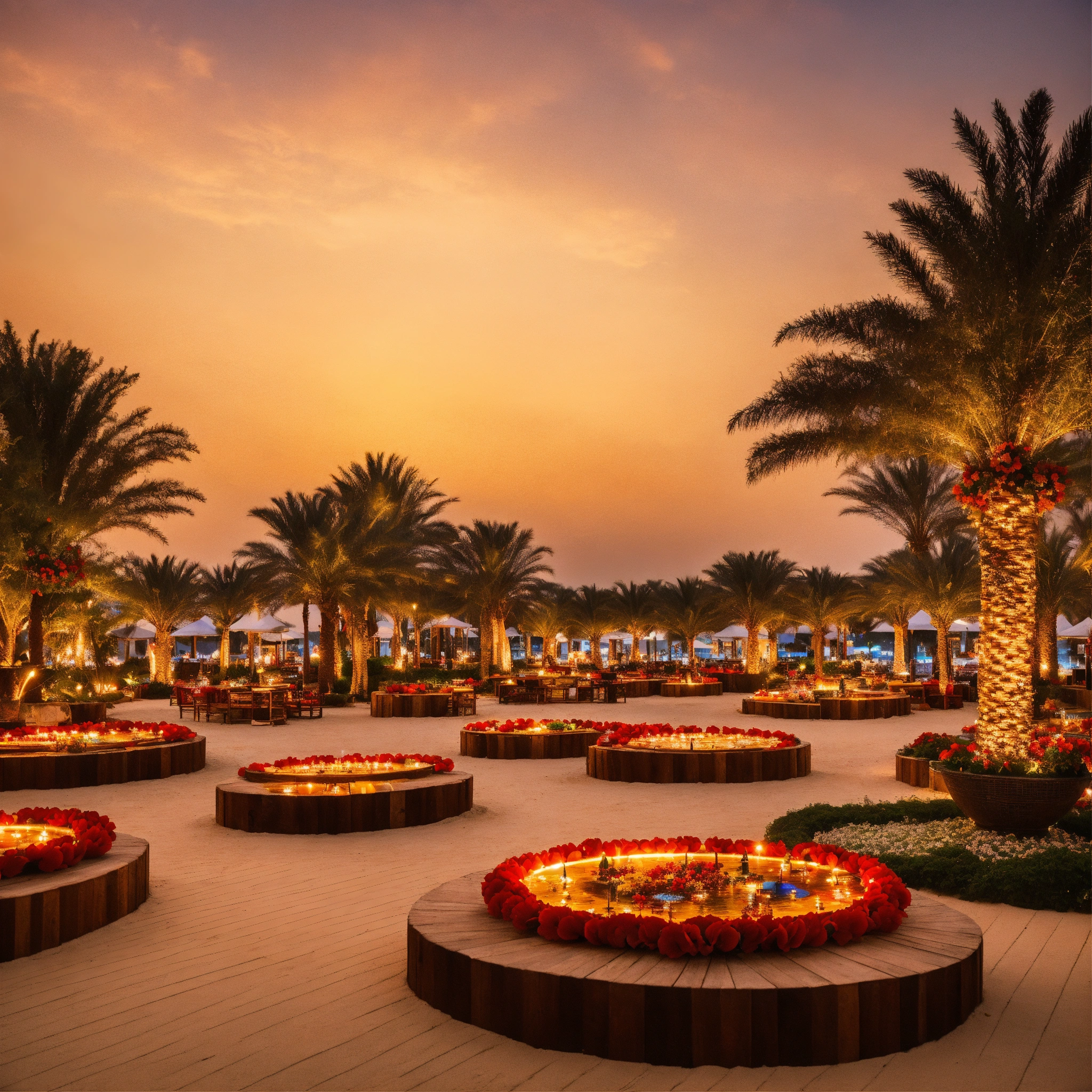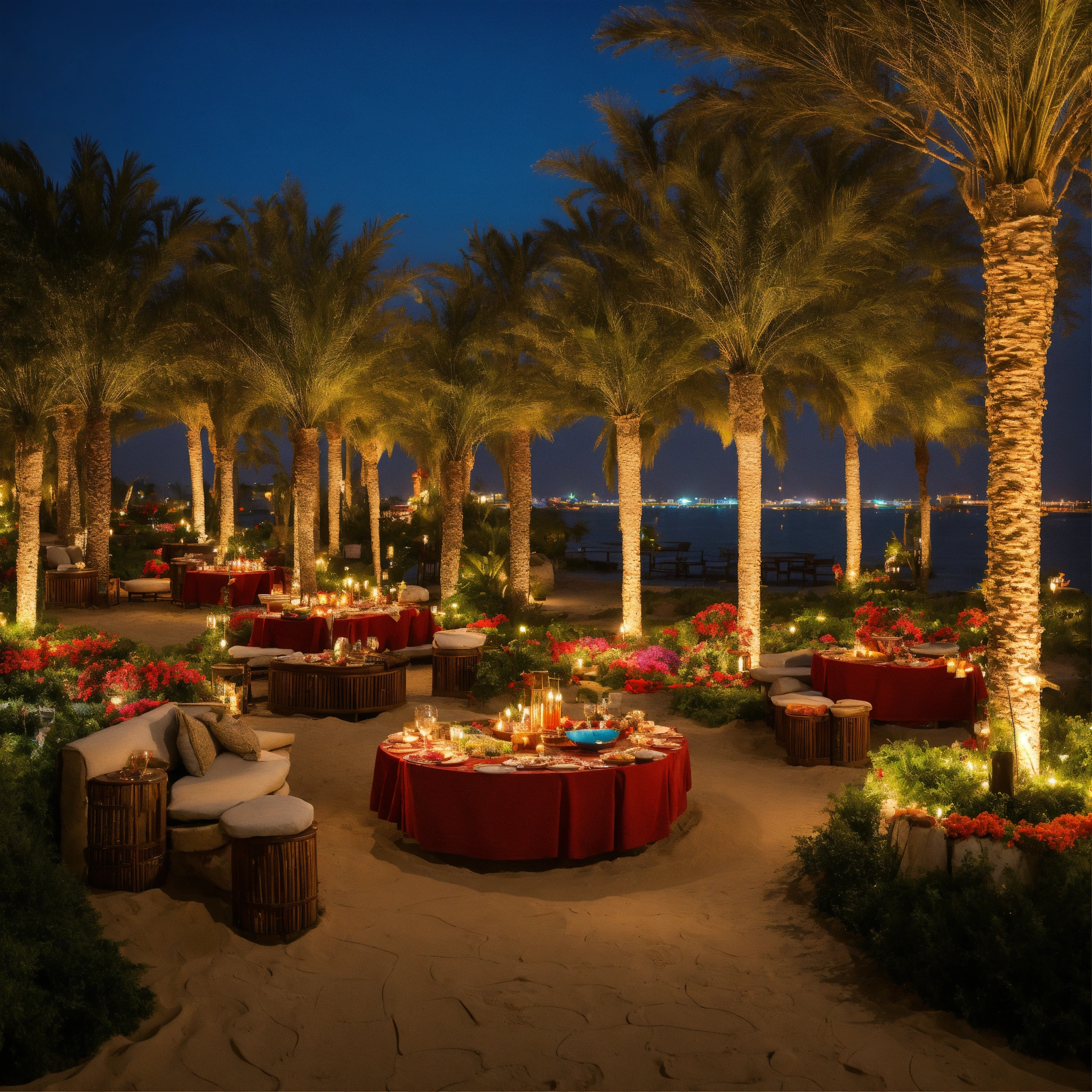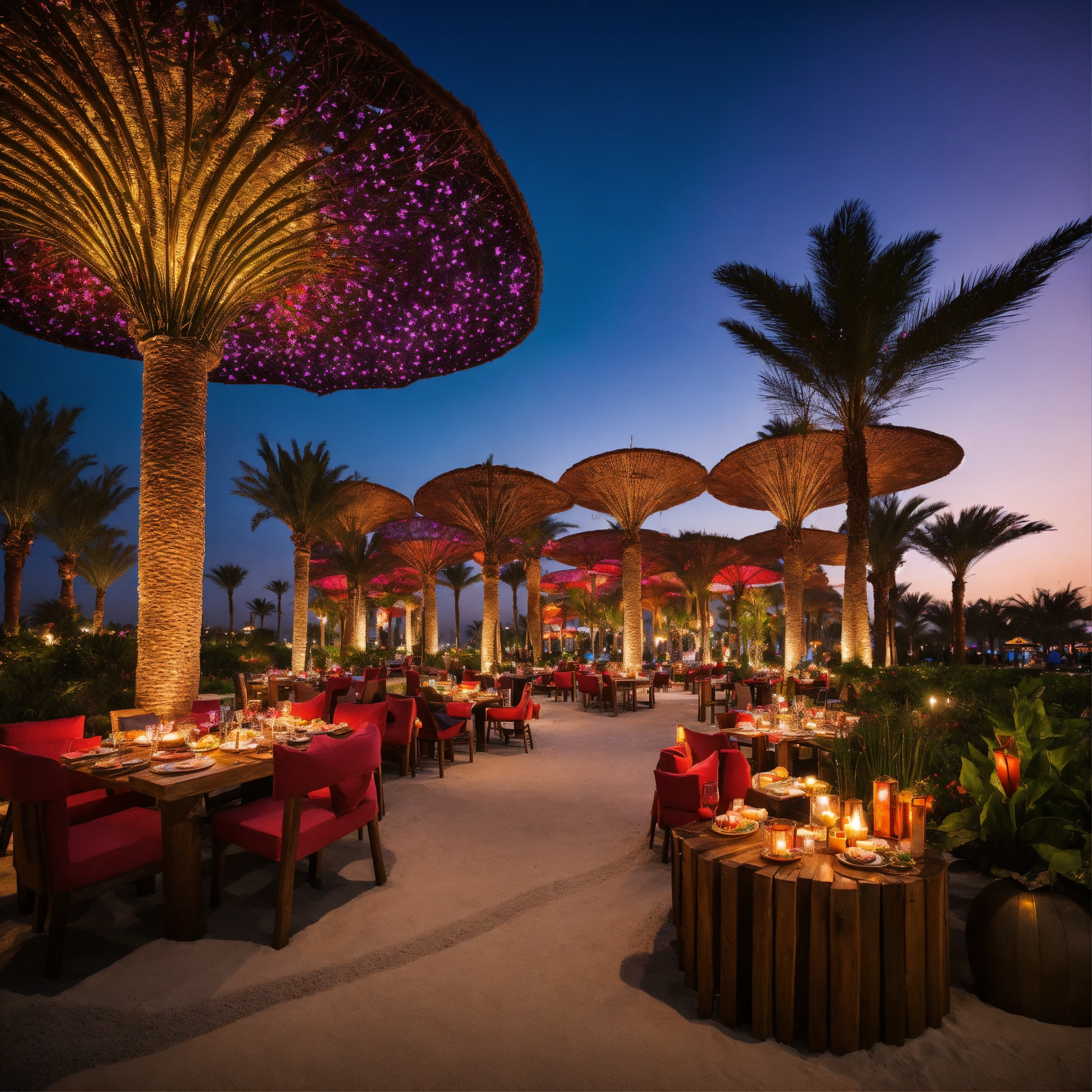 Imagine a captivating scene at the 'taste of bahrain' food festival, where a symphony of flavors converges in a vibrant celebration of bahrain's culinary heritage. the central theme invites you on a sensory journey through the diverse tastes of bahrain, merging traditional bahraini delicacies with international influences. as you step into the festival grounds, you find yourself immersed in an arabian oasis, a lush garden-like haven, complete with swaying palm trees, enchanting water features, and a riot of colorful blooms, evoking the essence of an arabian oasis. underfoot, the festival's pathways and seating areas blend a harmonious mix of sand, faux grass, and wooden decking, mirroring the picturesque landscapes of bahrain. prepare to embark on a gastronomic adventure like no other, where every bite tells a story of this enchanting island nation's rich culinary tapestry.