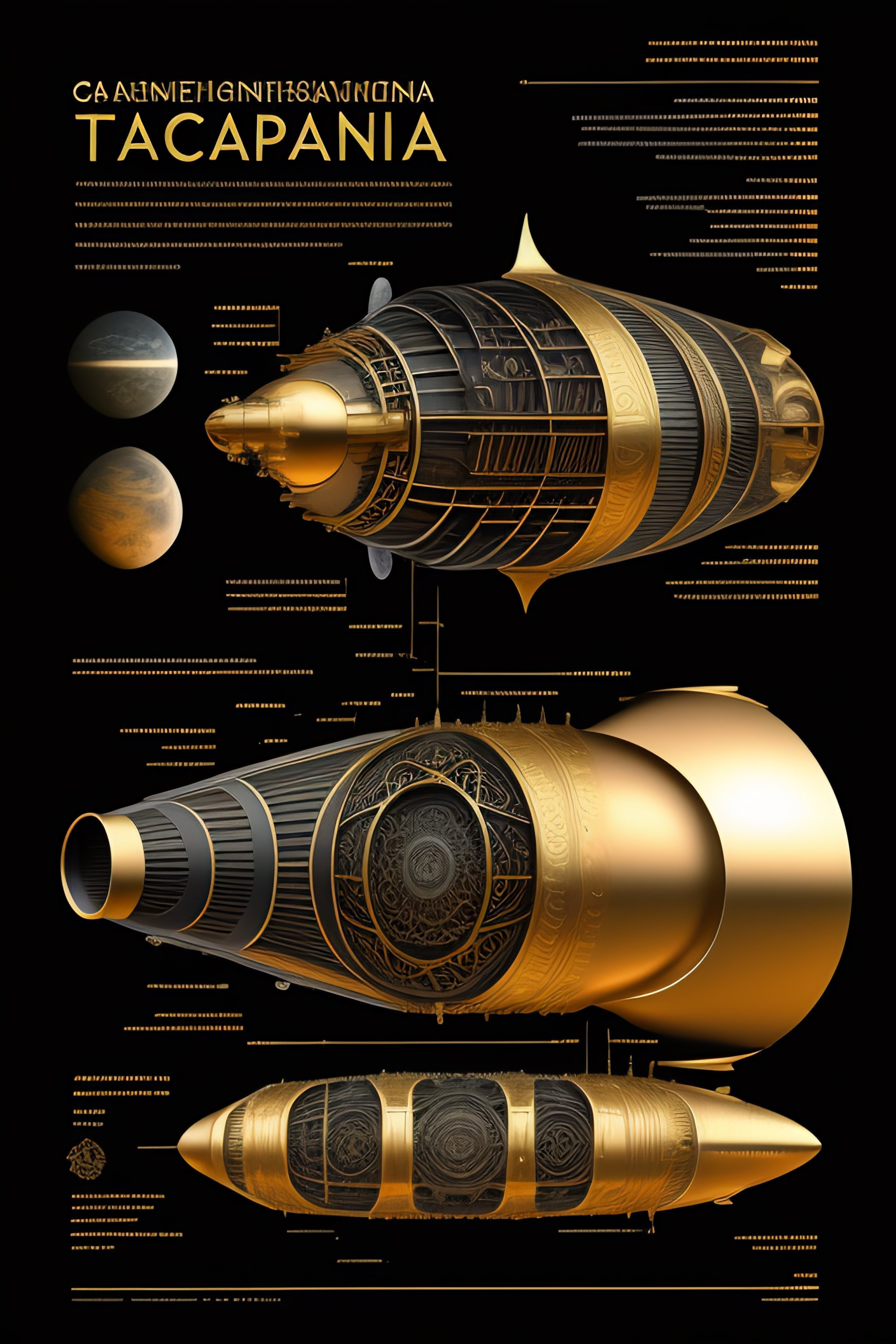 Ta full page design of spaceship engine, black and bronze paper, intricate, highly detailed, epic, infographic, marginalia –ar 9:16