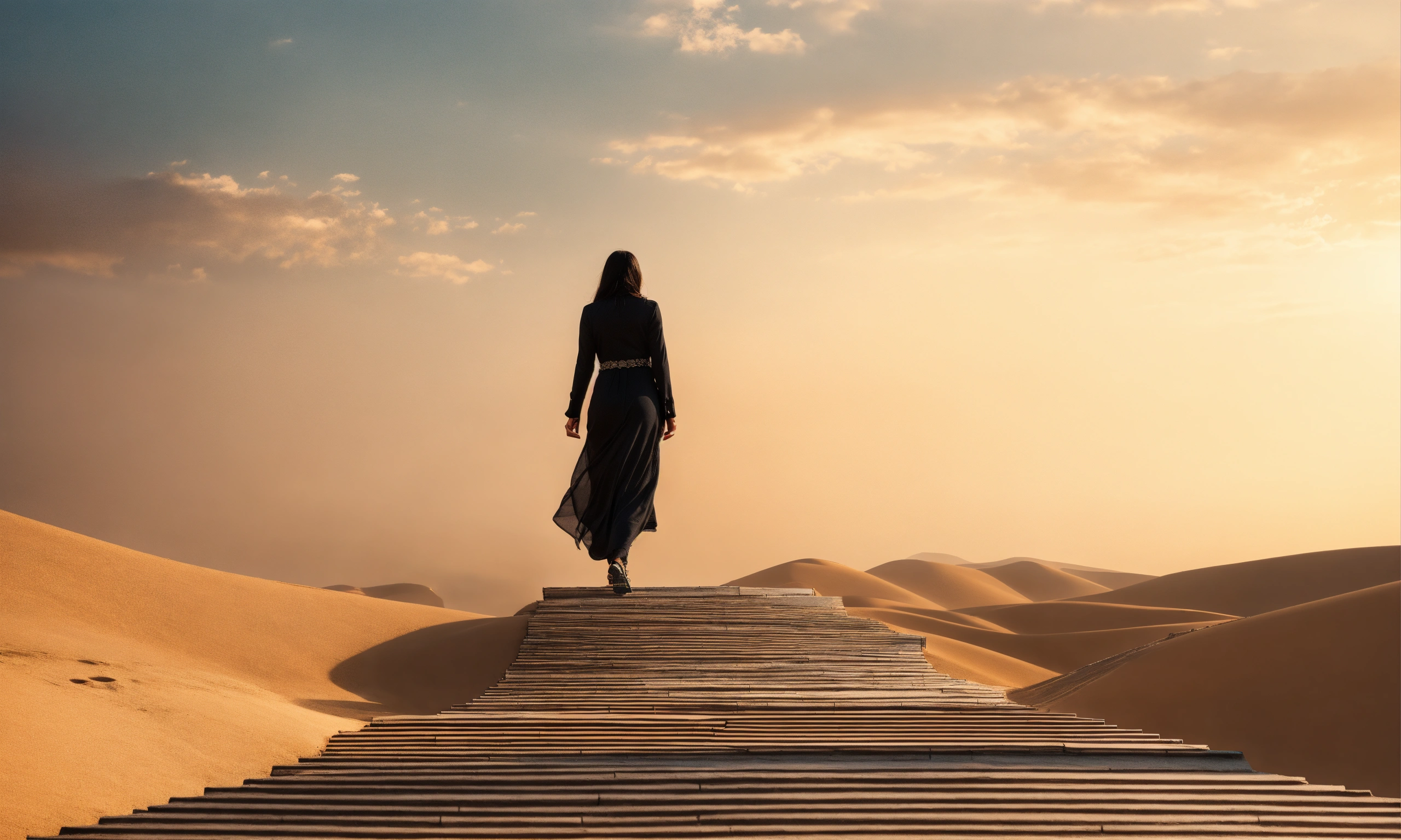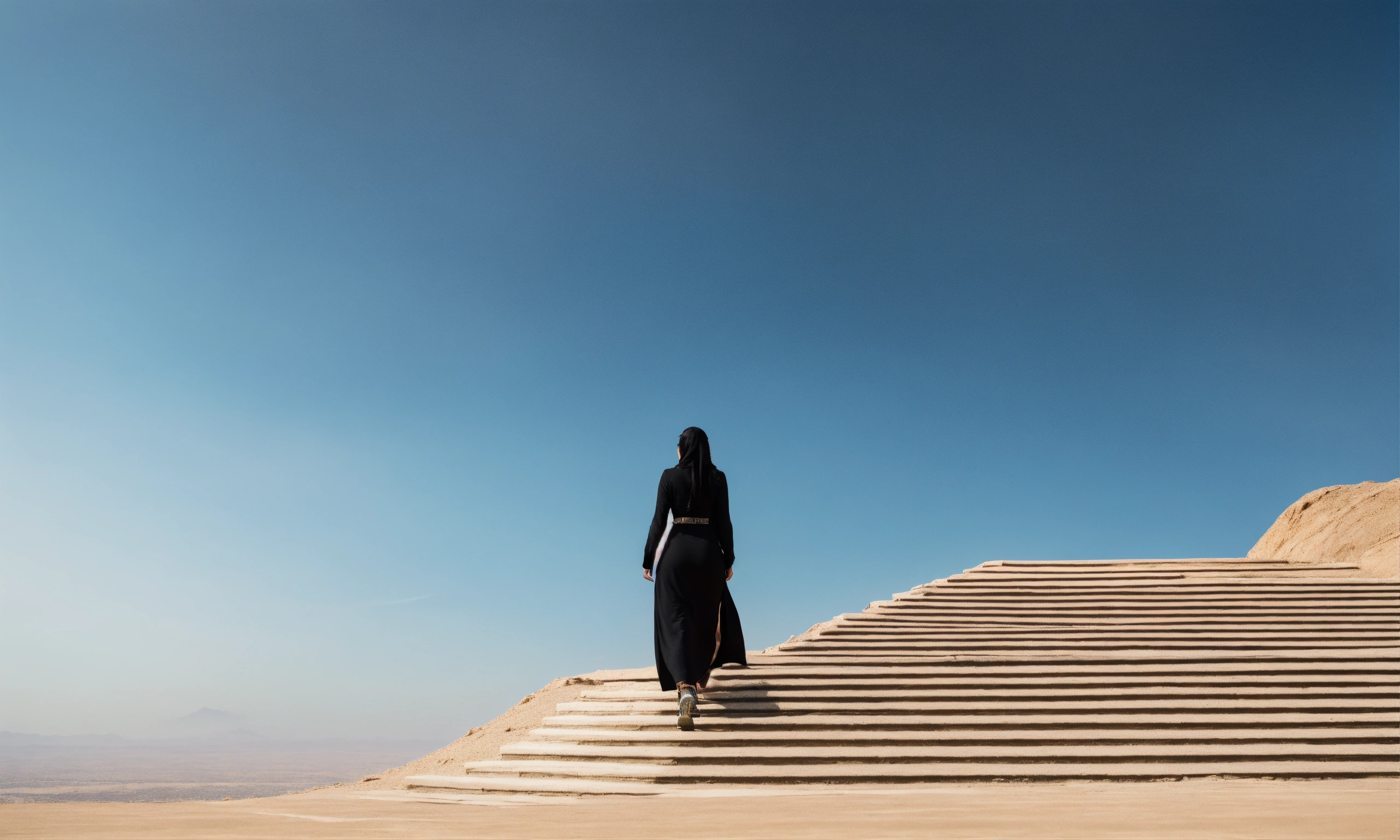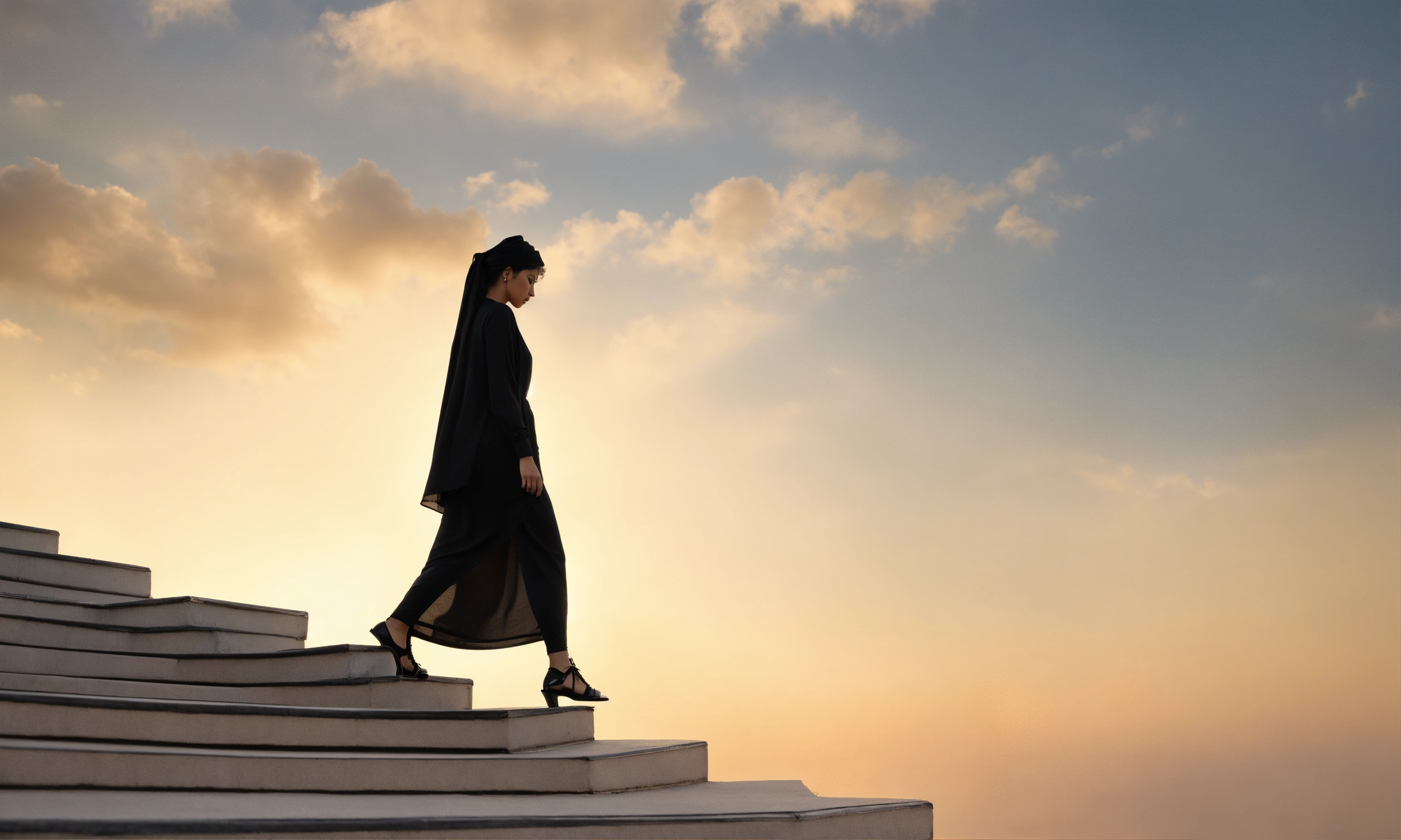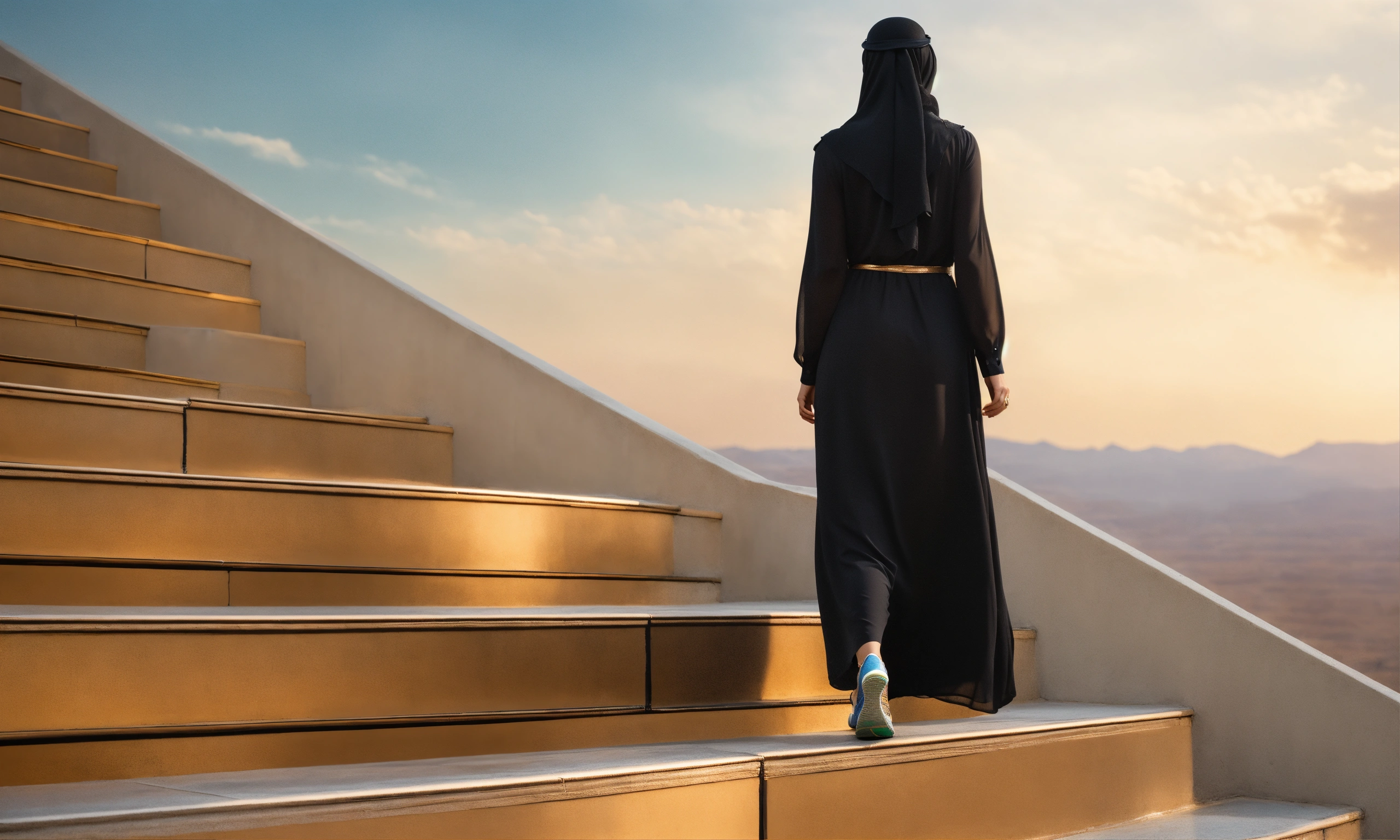 Saudi woman climbing six steps only, walking upward, right side, side-way, close up, glass, black dress, modern, sky, horizon, natural light, warm, photo-realistic, 8k, high definition