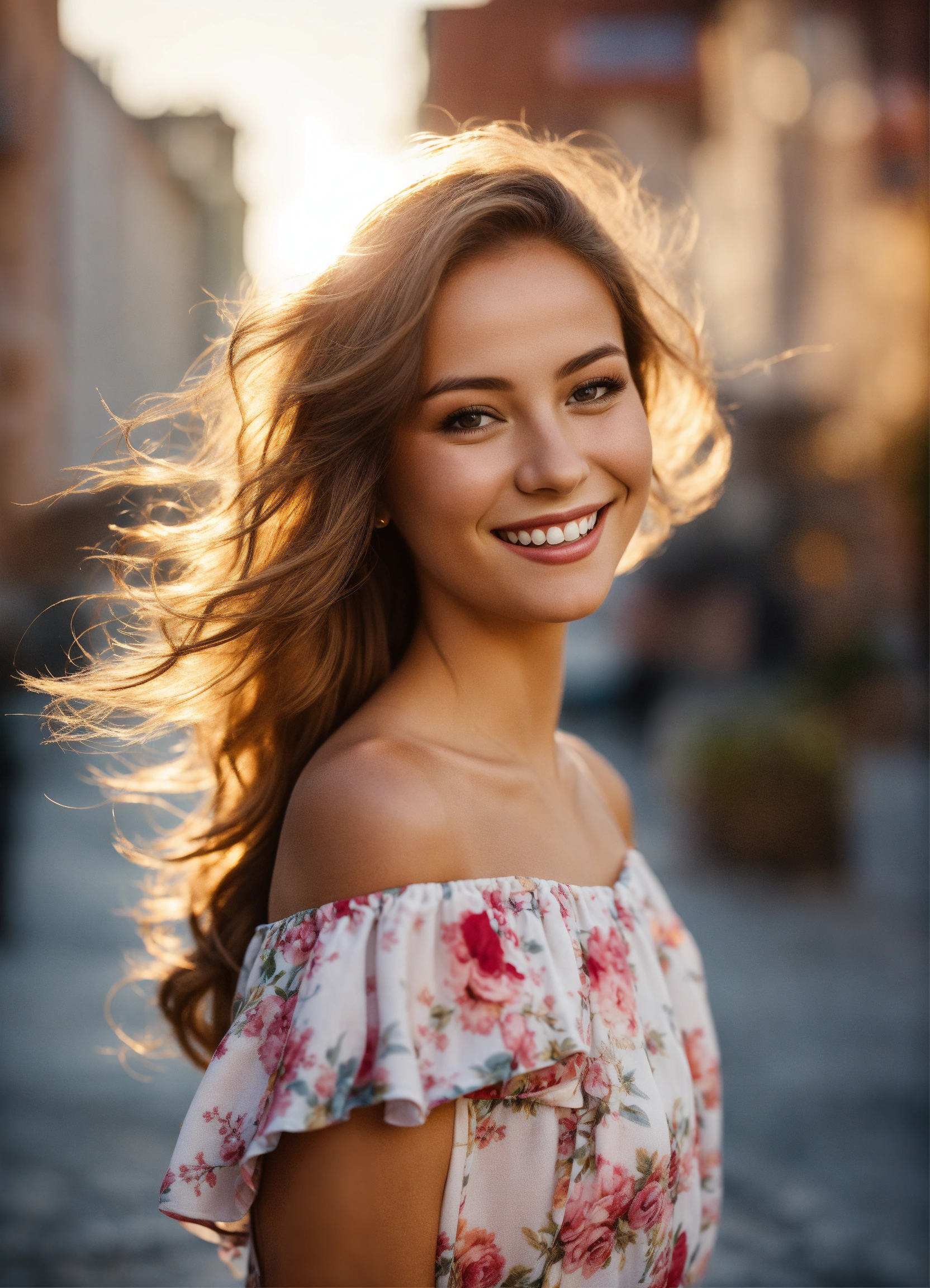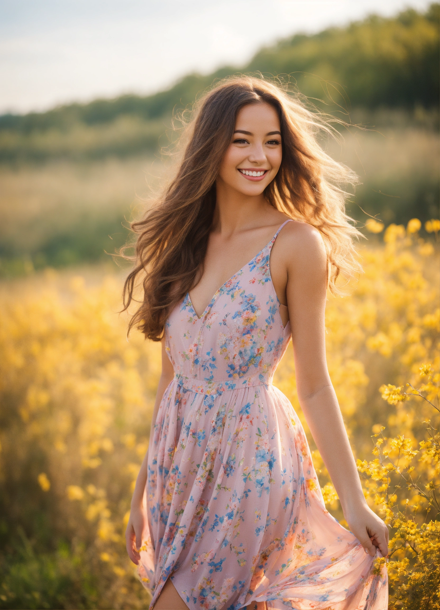 Portrait of a beautiful girl in a dress, she smiles, her hair is developing in the wind, sunny weather