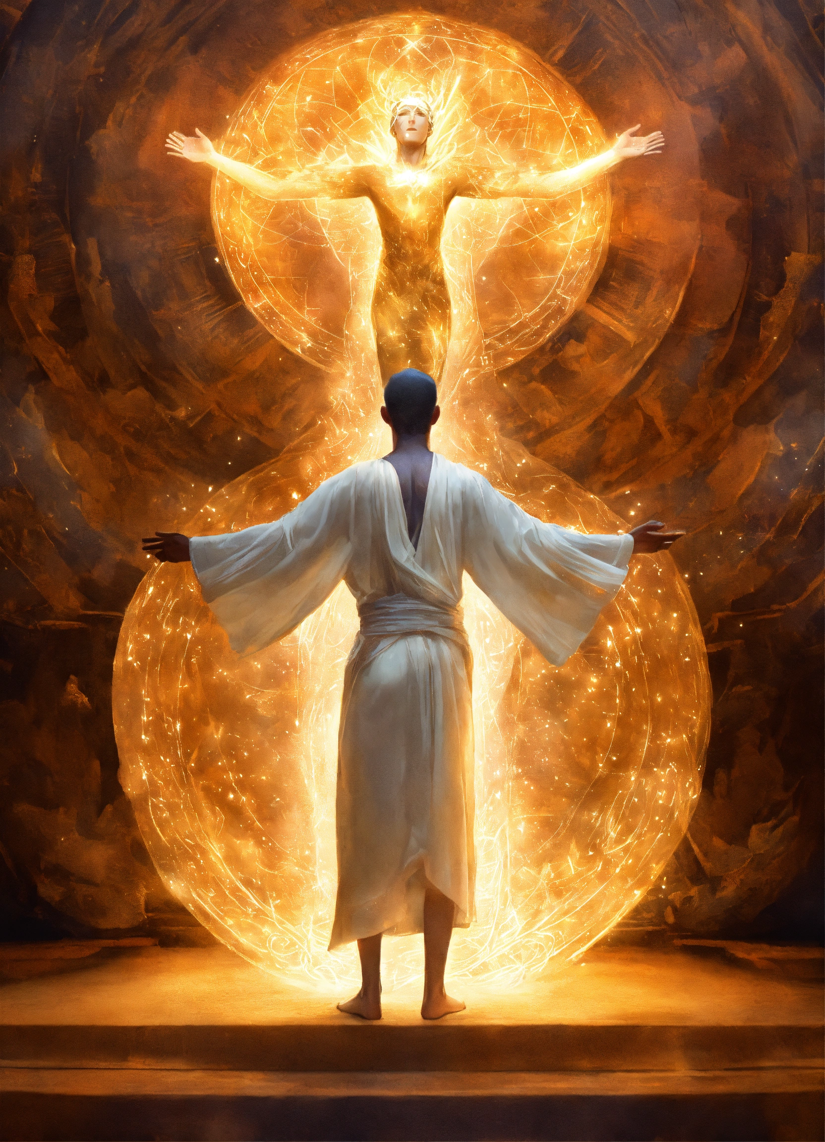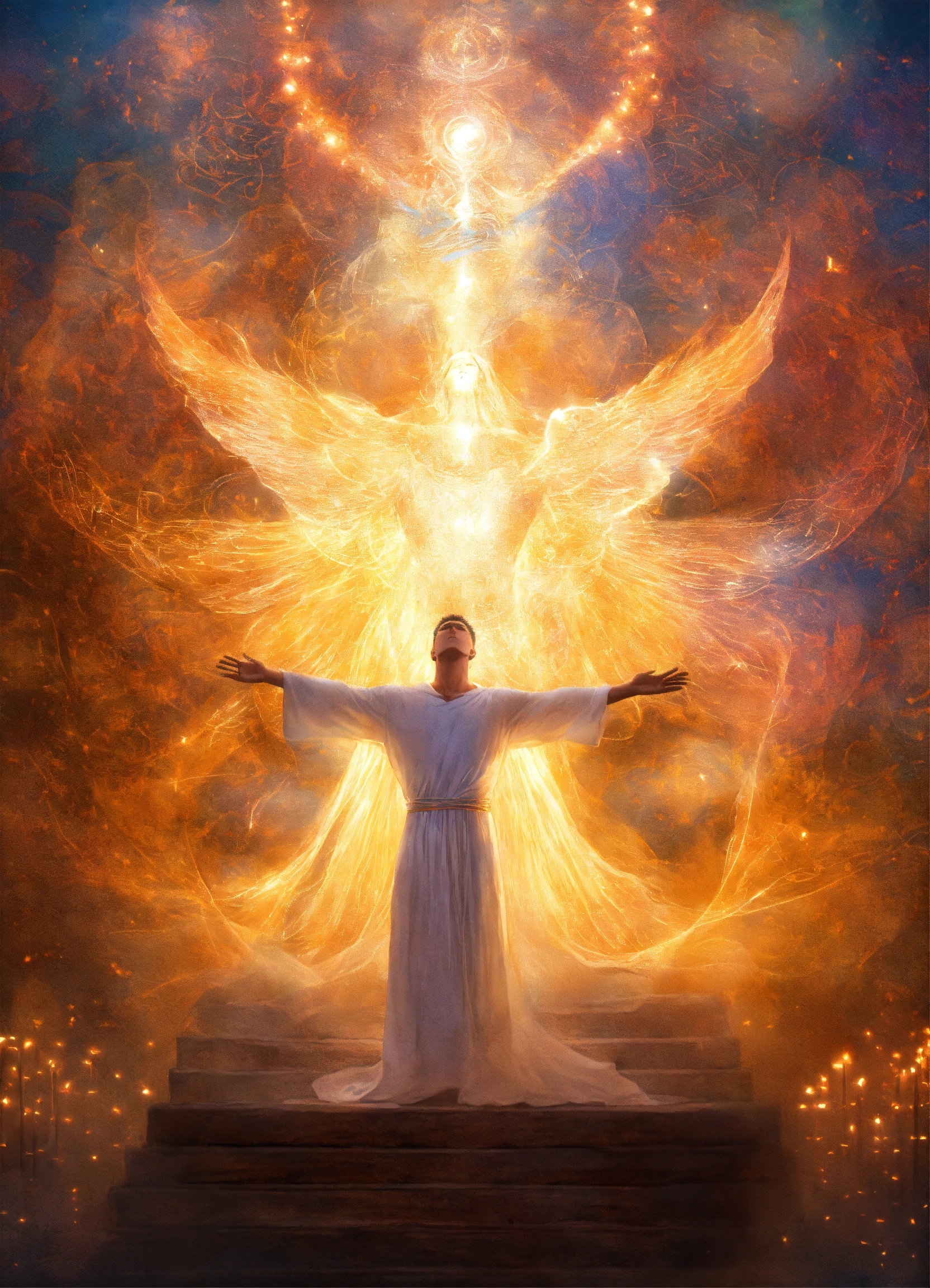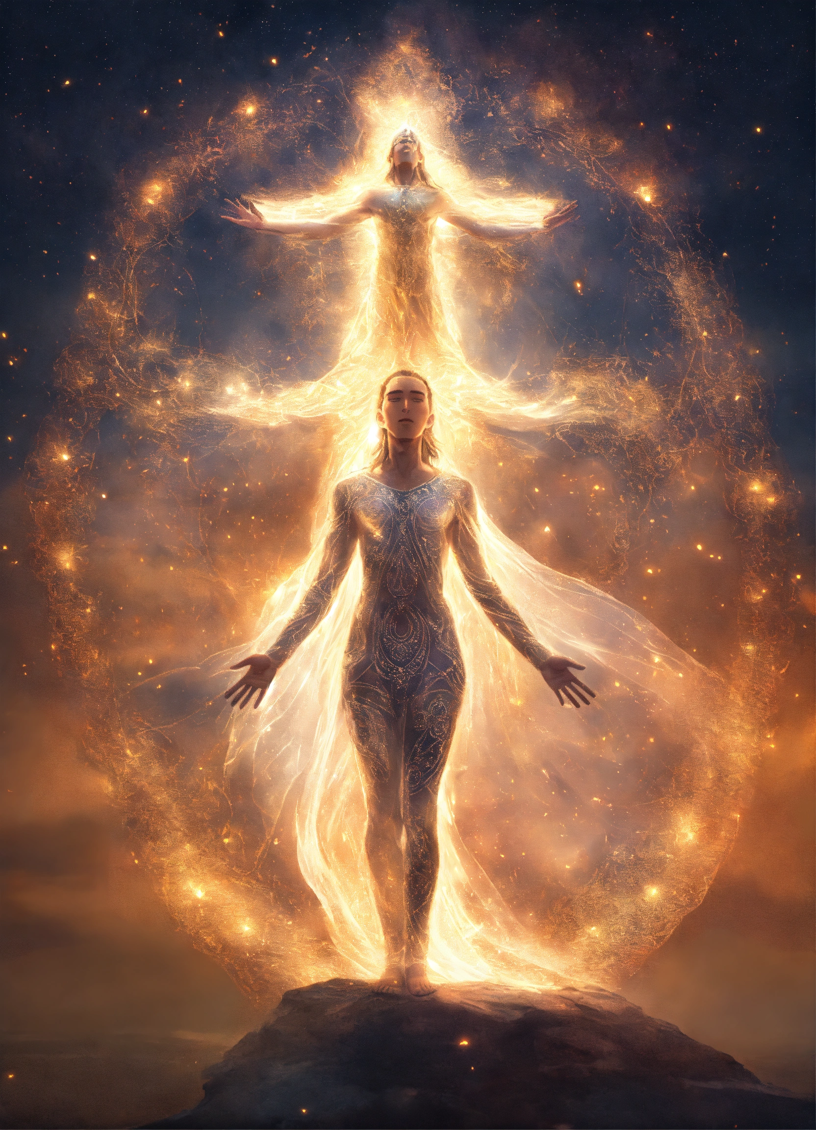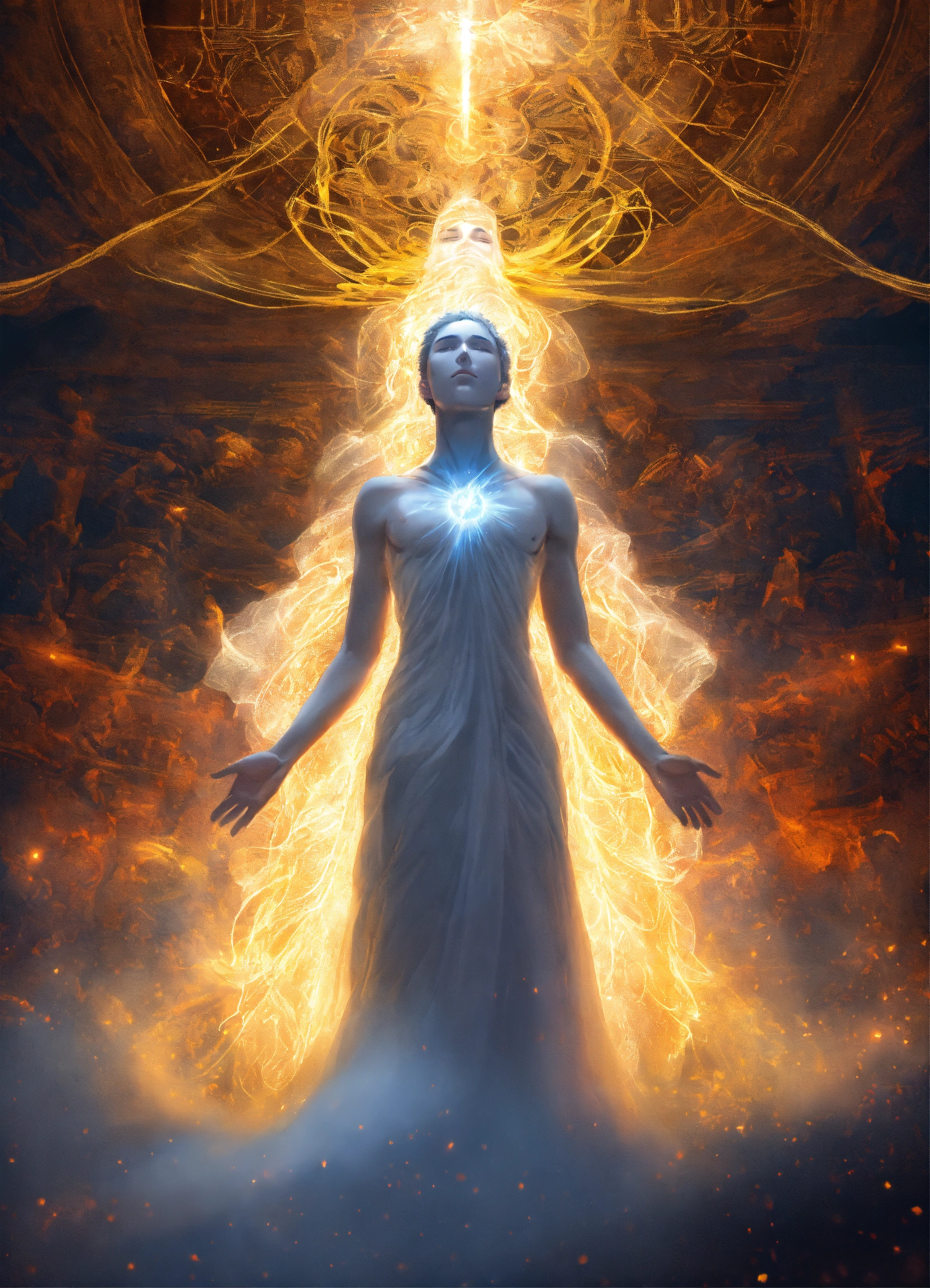 Captivating design, spirit man ascend, the spirit being's arms are spread out, white body, light all over his body, lights on her body
