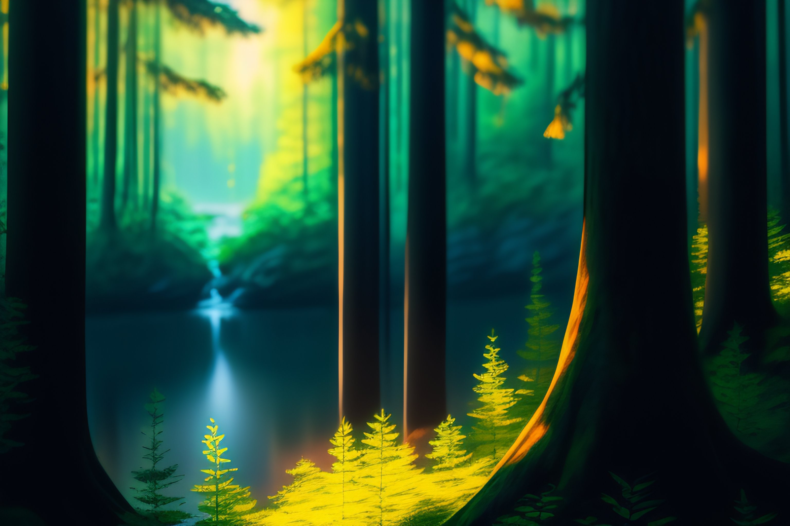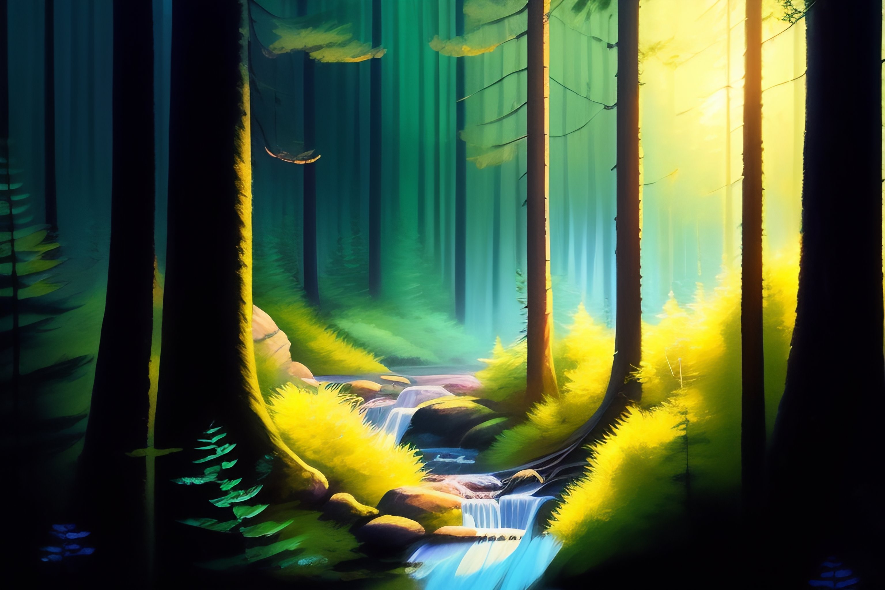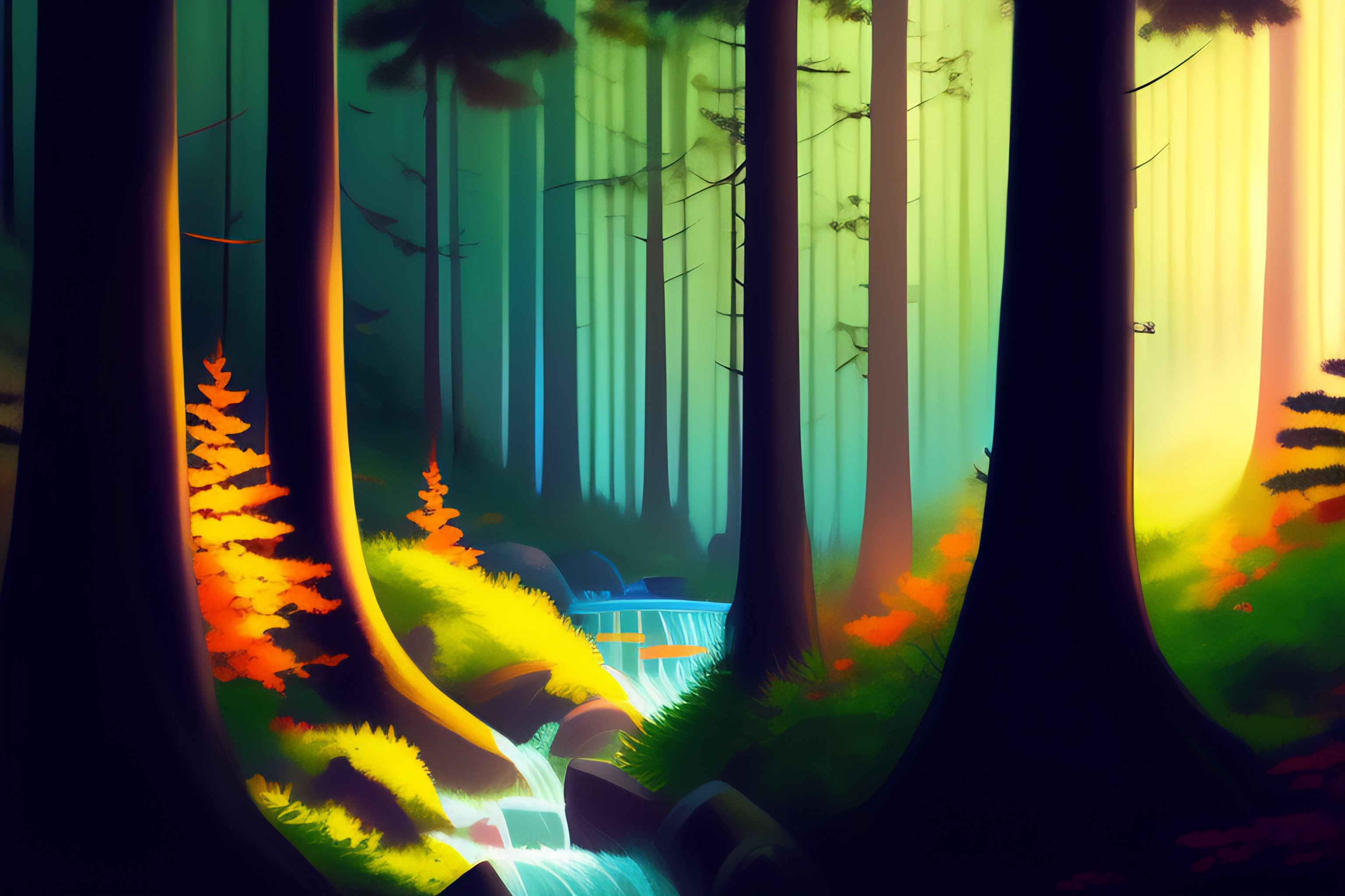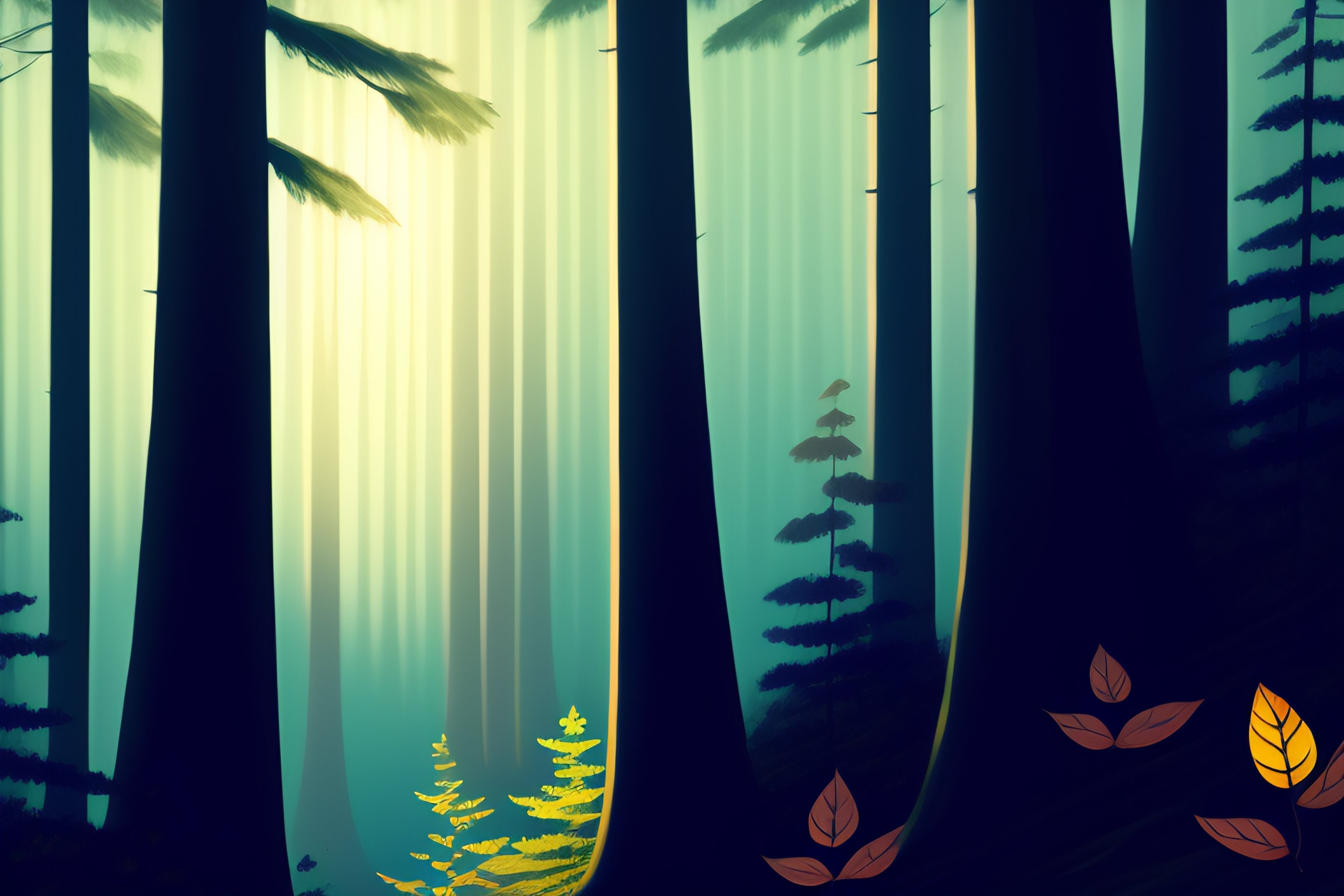 Nestled in the heart of a dense, shadowy forest, this anime-style landscape is a mysterious and intriguing place. the forest is filled with tall, dark trees, their branches reaching up towards the sky like twisted fingers. a small stream winds its way through the forest, its black waters rippling gently in the shadows. the forest floor is carpeted with a thick layer of fallen leaves and pine needles, and wildflowers peek out from between the trees, their pale petals almost glowing in the darkness. the overall atmosphere of the forest is one of mystery and intrigue, and it's easy to see why it's a beloved spot for all who visit. the trees and plants are depicted with bold, sweeping lines and vibrant colors, giving the forest a dynamic, anime-inspired look.