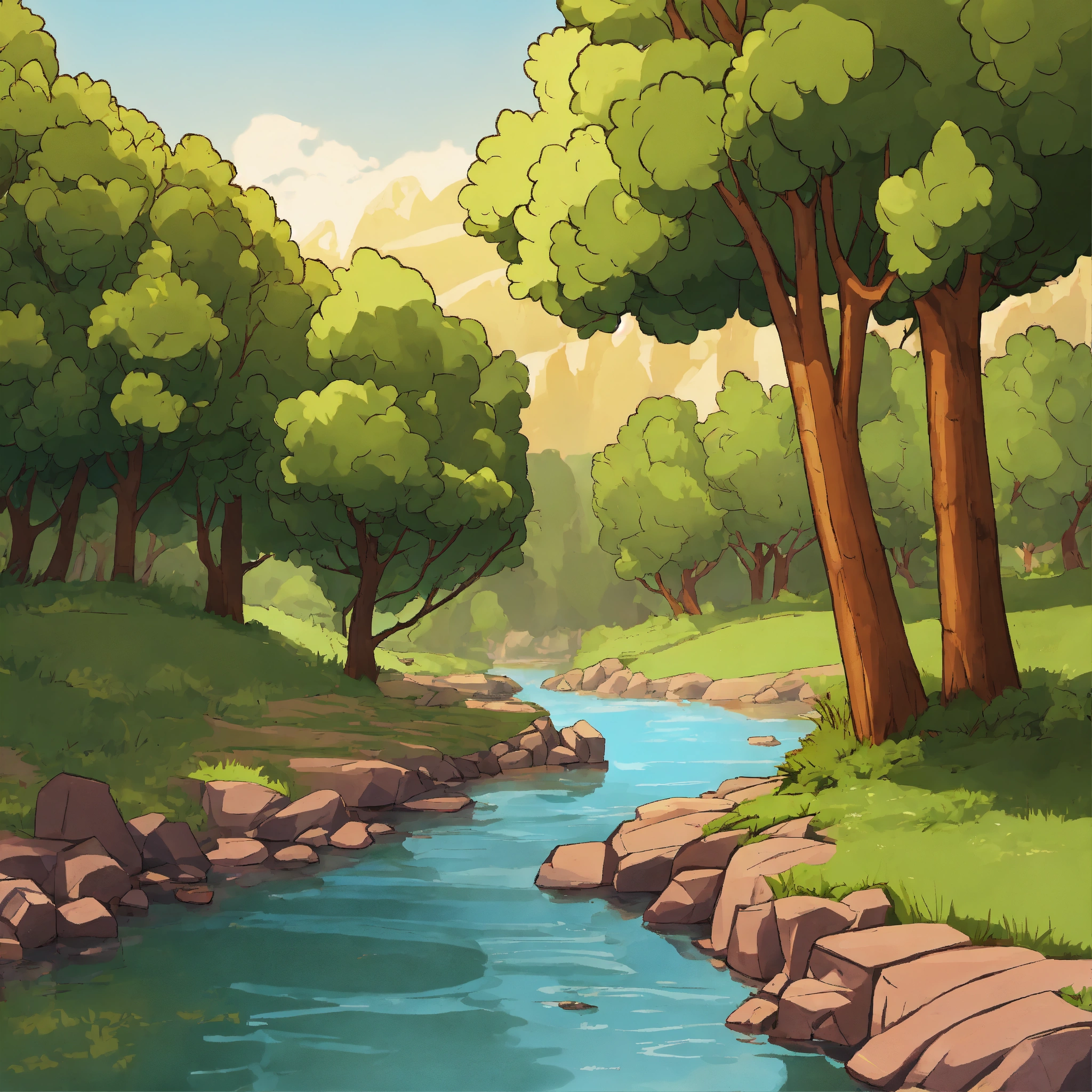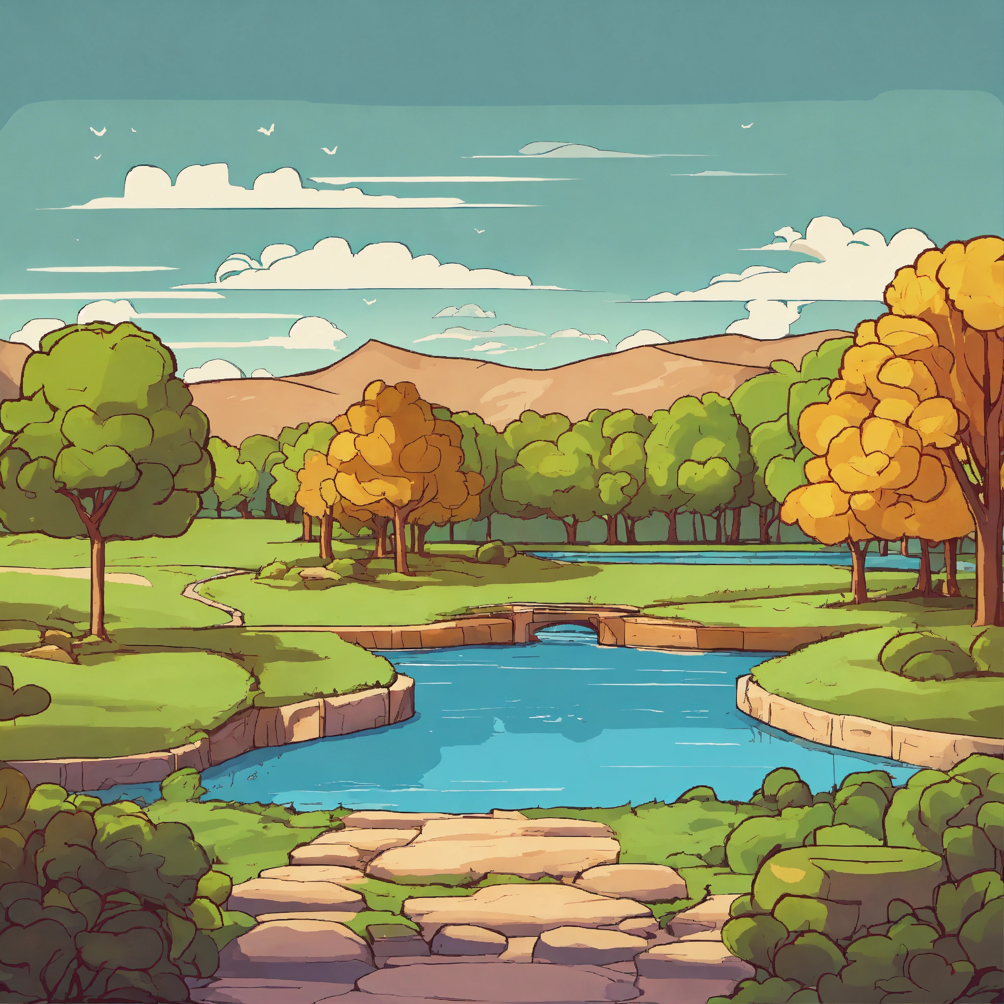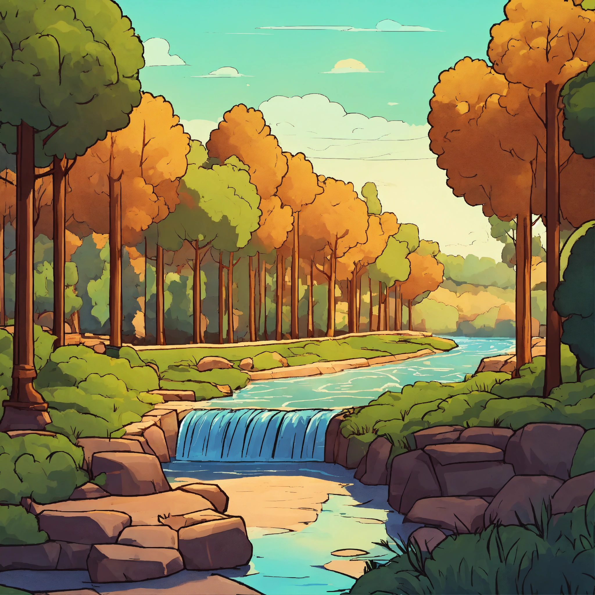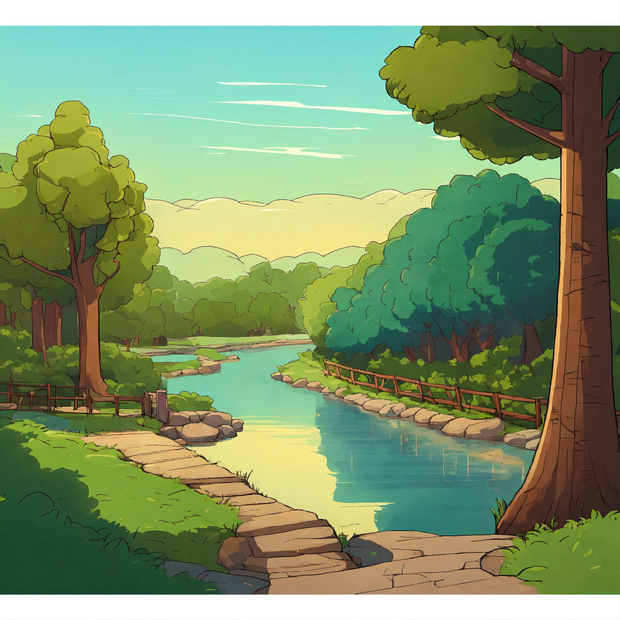 Low wall and trees behind it with a river behind the trees in cartoon style
