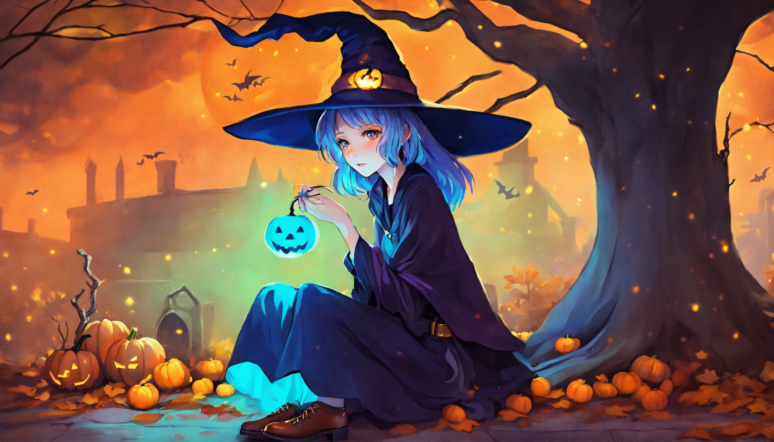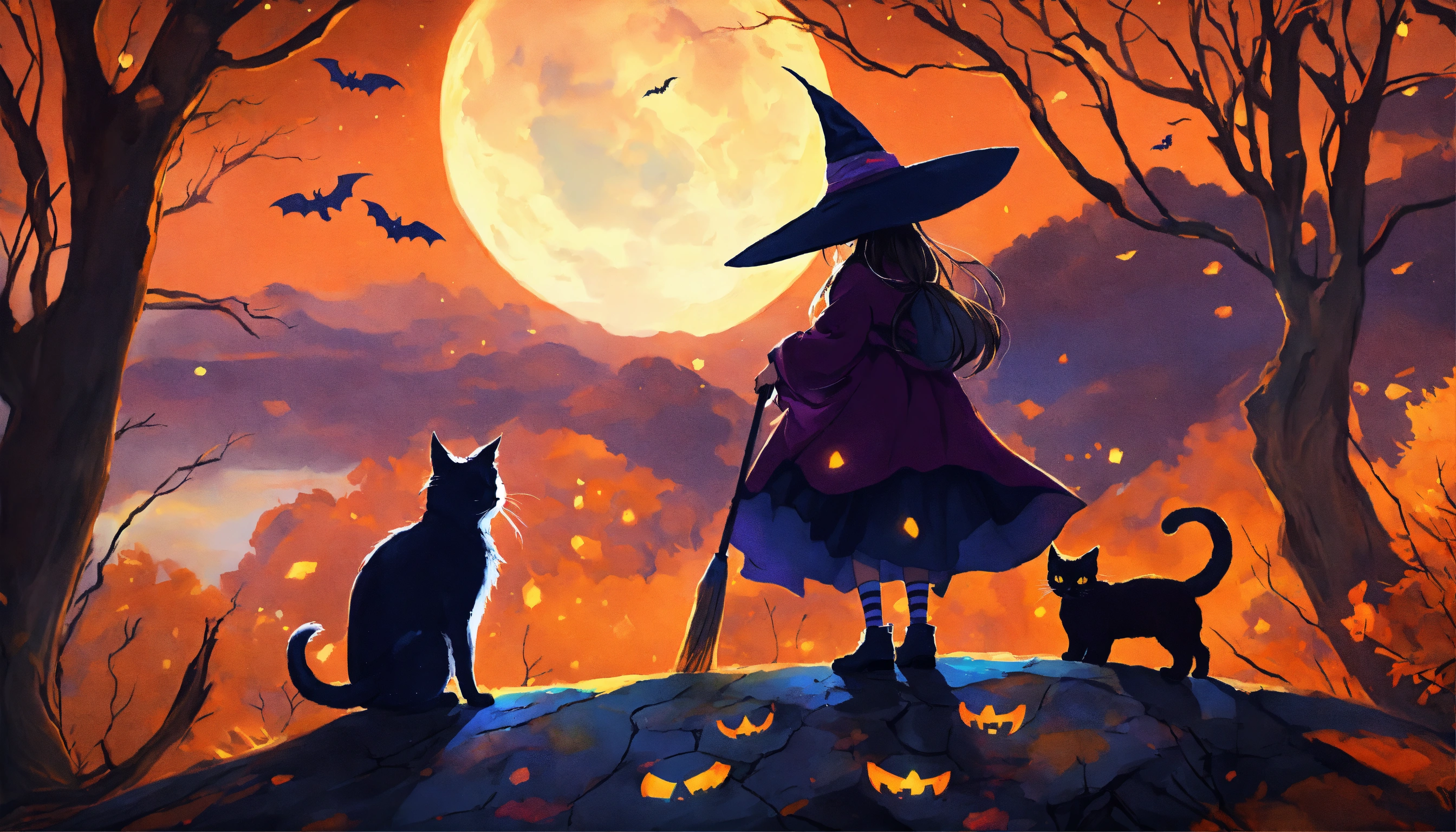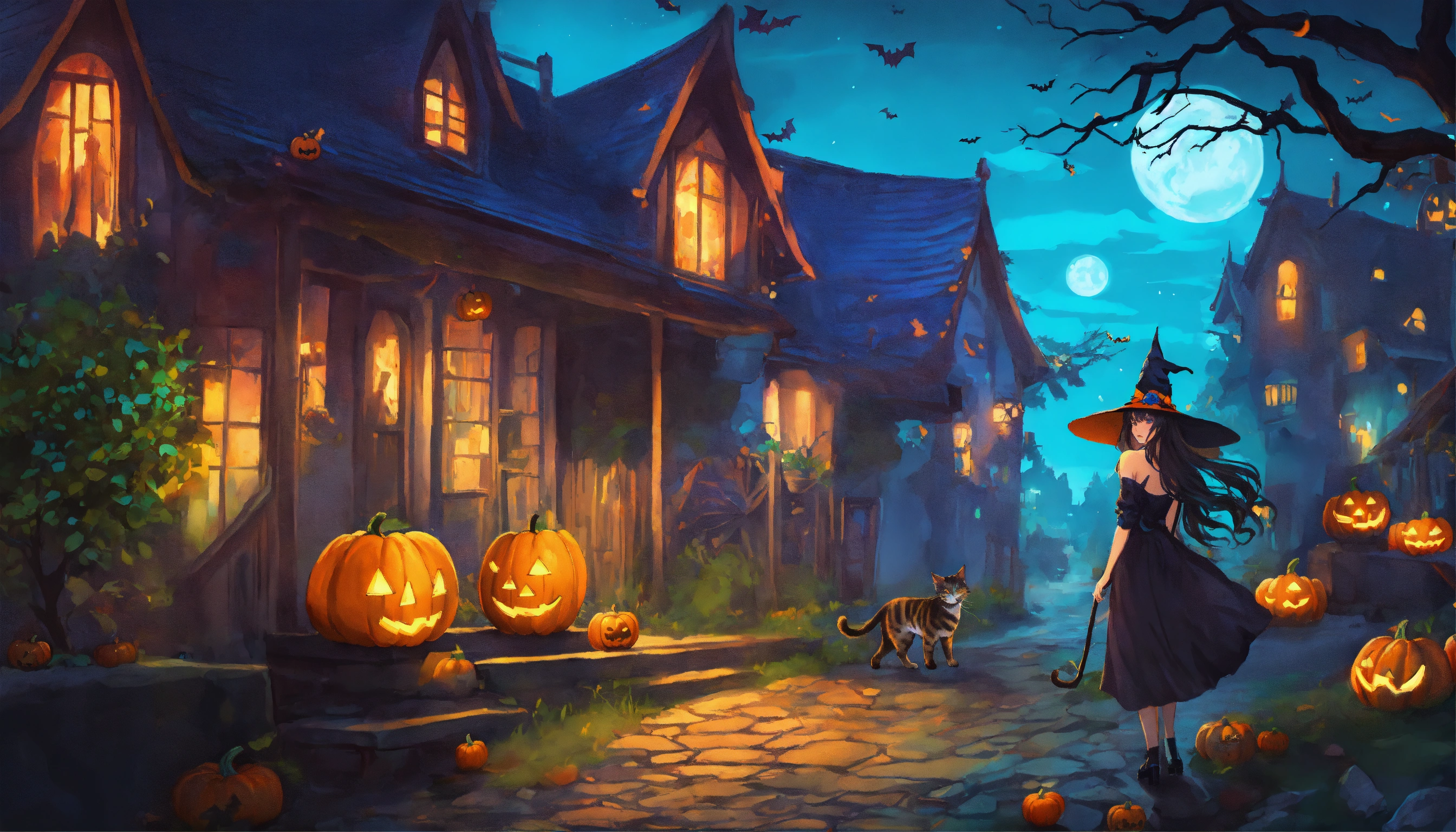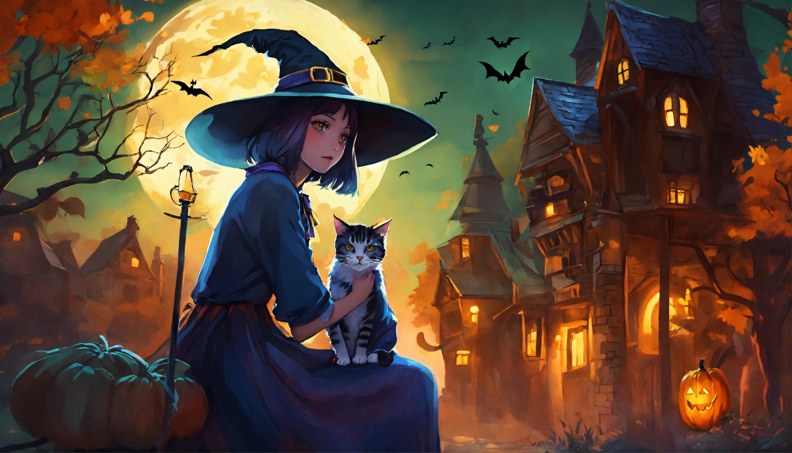 Opal stone color halloween witch with cat illustration art, llena de pinturas callejeras, arte callejero, 2d estilo anime y manga, de noche