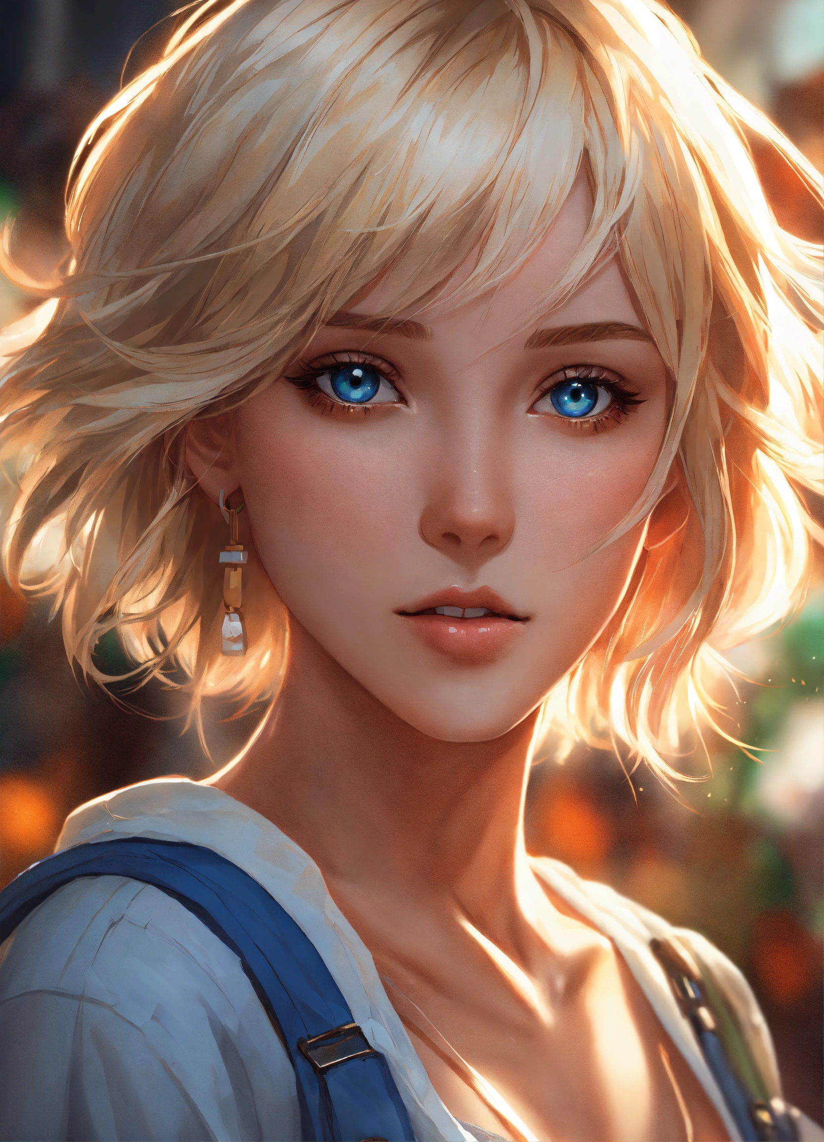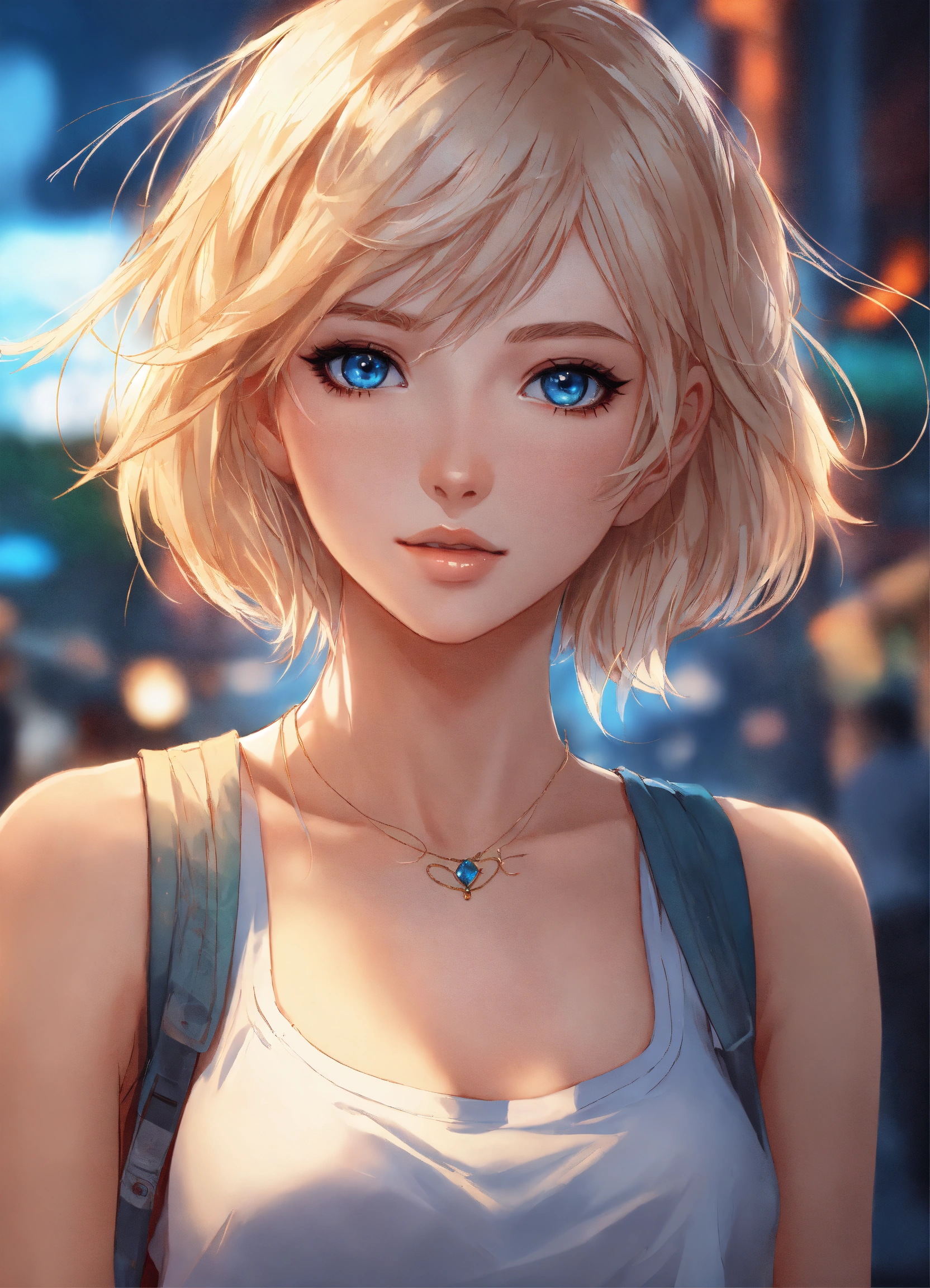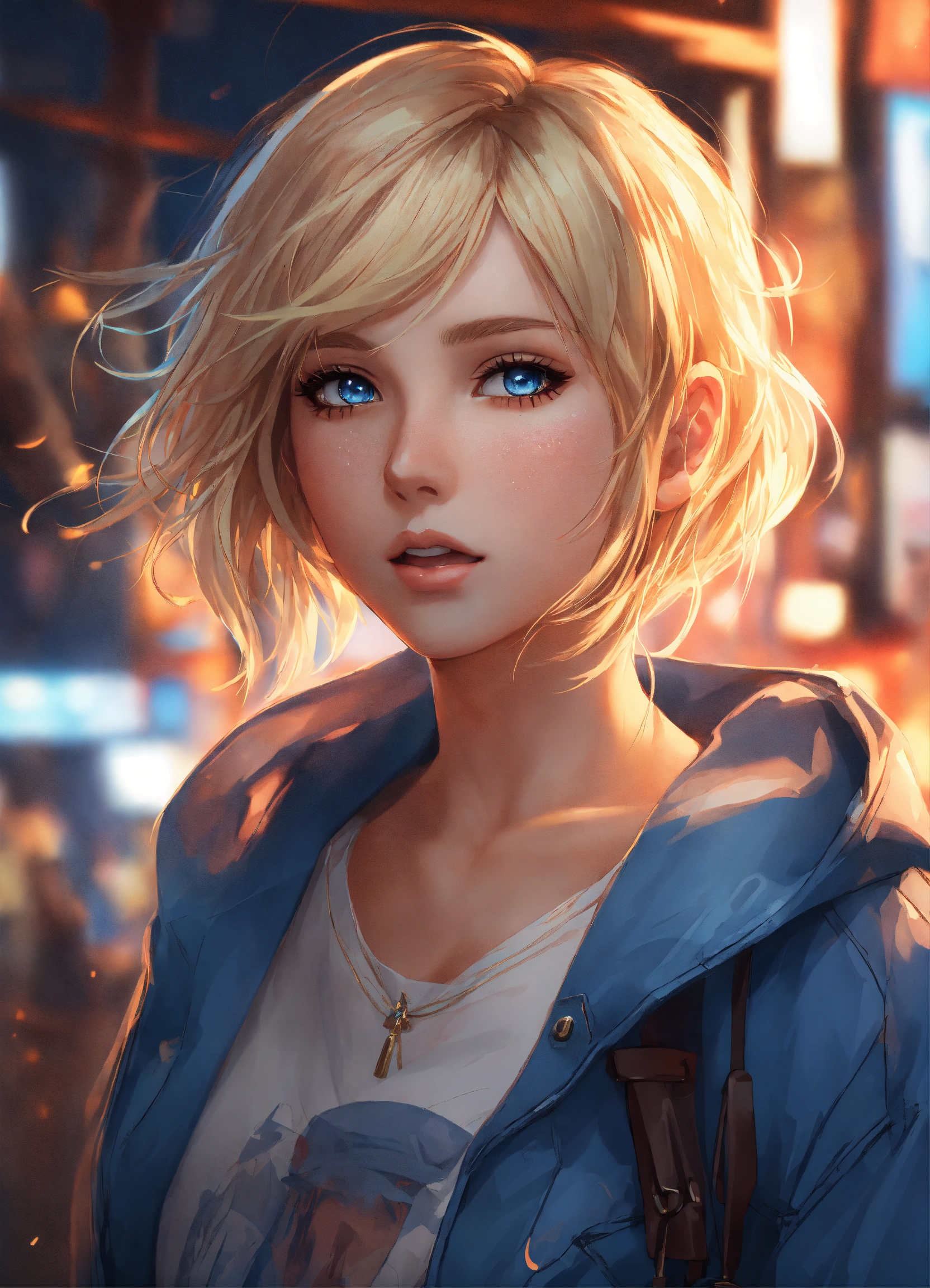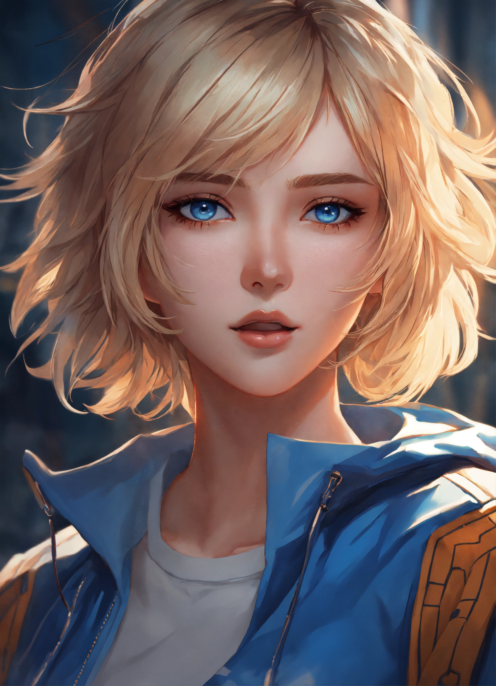 8k wallpaper of a beautiful anime girl wearing casual clothes, short blonde hair and blue eyes, by artgerm, intricate detail, trending on artstation, 8k, fluid motion, stunning shading