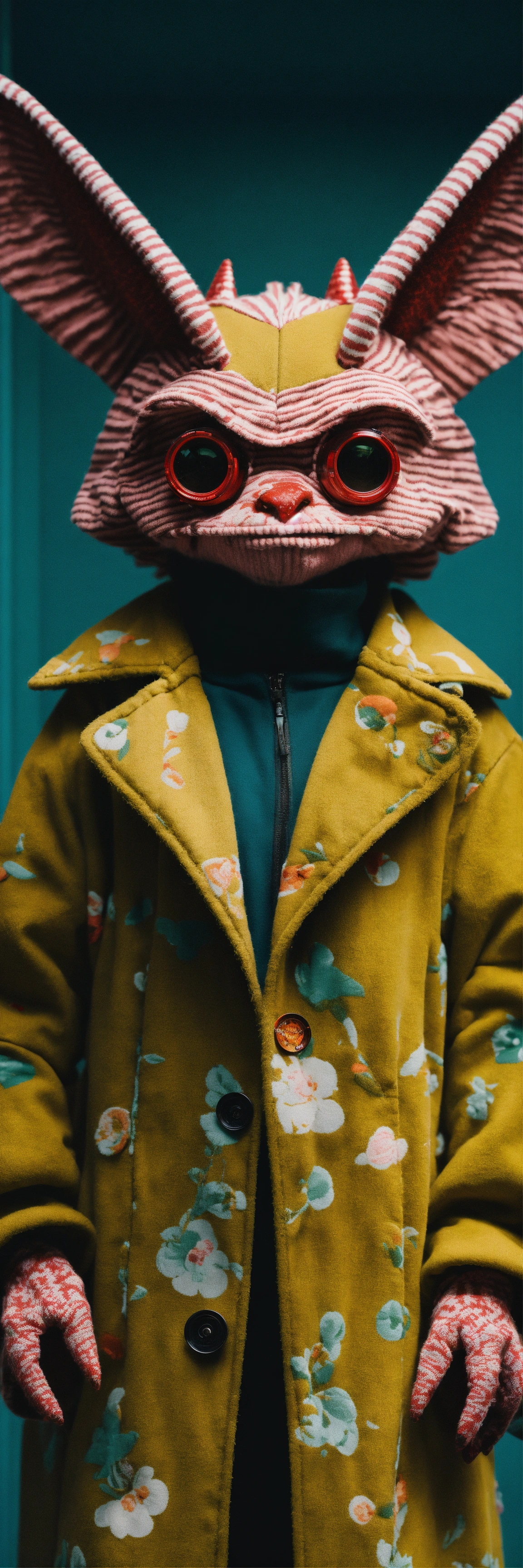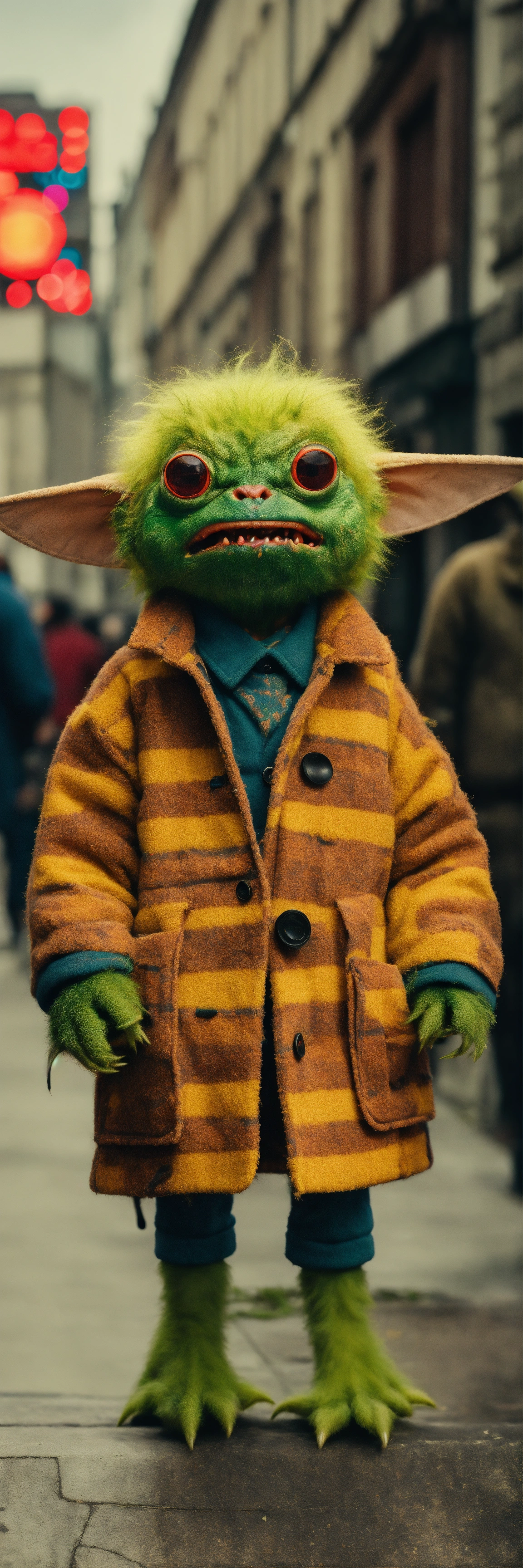Leica portrait of a gremlin monster wearing a coat, coded patterns, sparse and simple, uhd image, urbancore, sovietwave, period snapshot