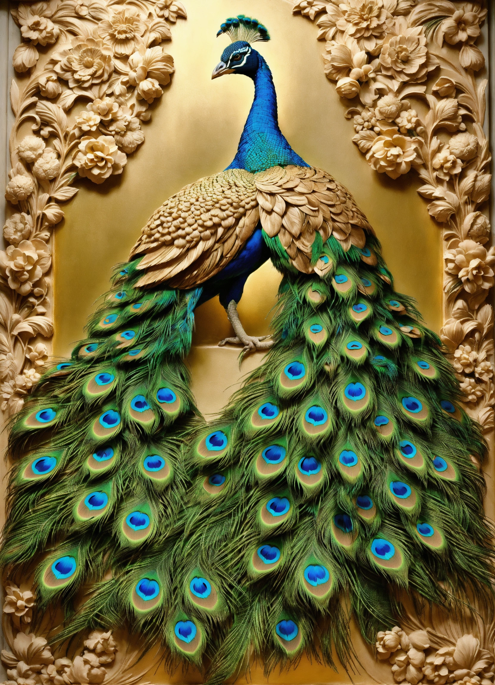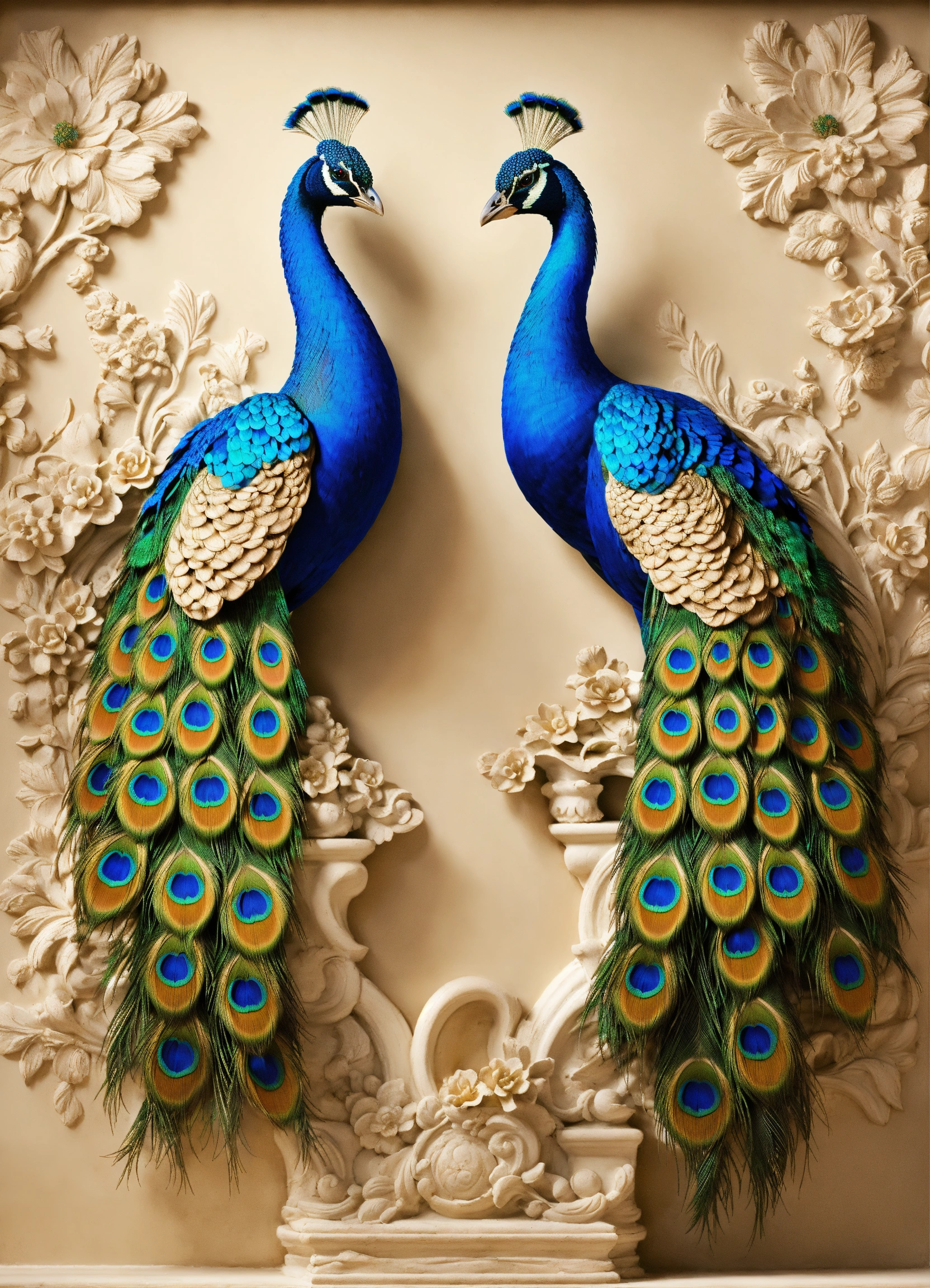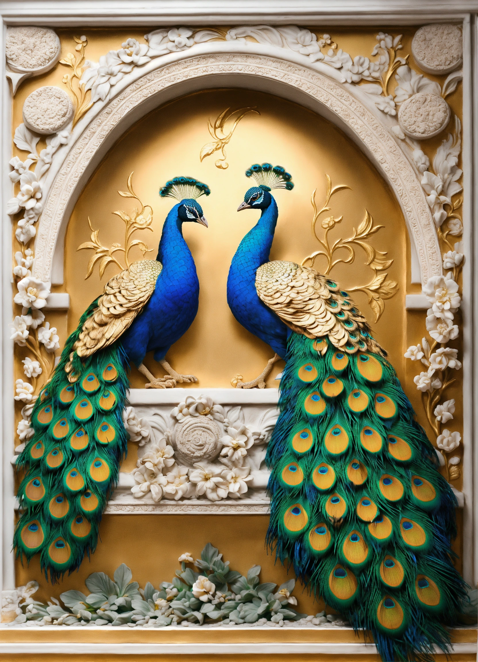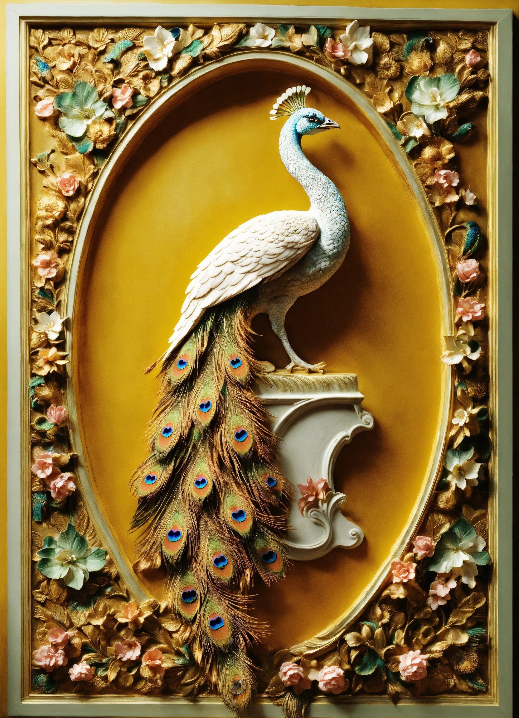 Relief, plaster, 4k, volume, high detail, sculpture, plants, the background is white, smooth, gypsum, bas-relief, center, decorative pattern, classical ornament, motif, symmetry, flowers, buds, blooming buds, highly detailed volumetric plaster work, exotic flowers, bas-relief of flowers, painting, beautiful composition, peacock with an open tail, a pair of peacocks, the golden ratio, the big picture, the open tail is beautiful, female peacock, male peacock, the composition is beautiful, male's open tail