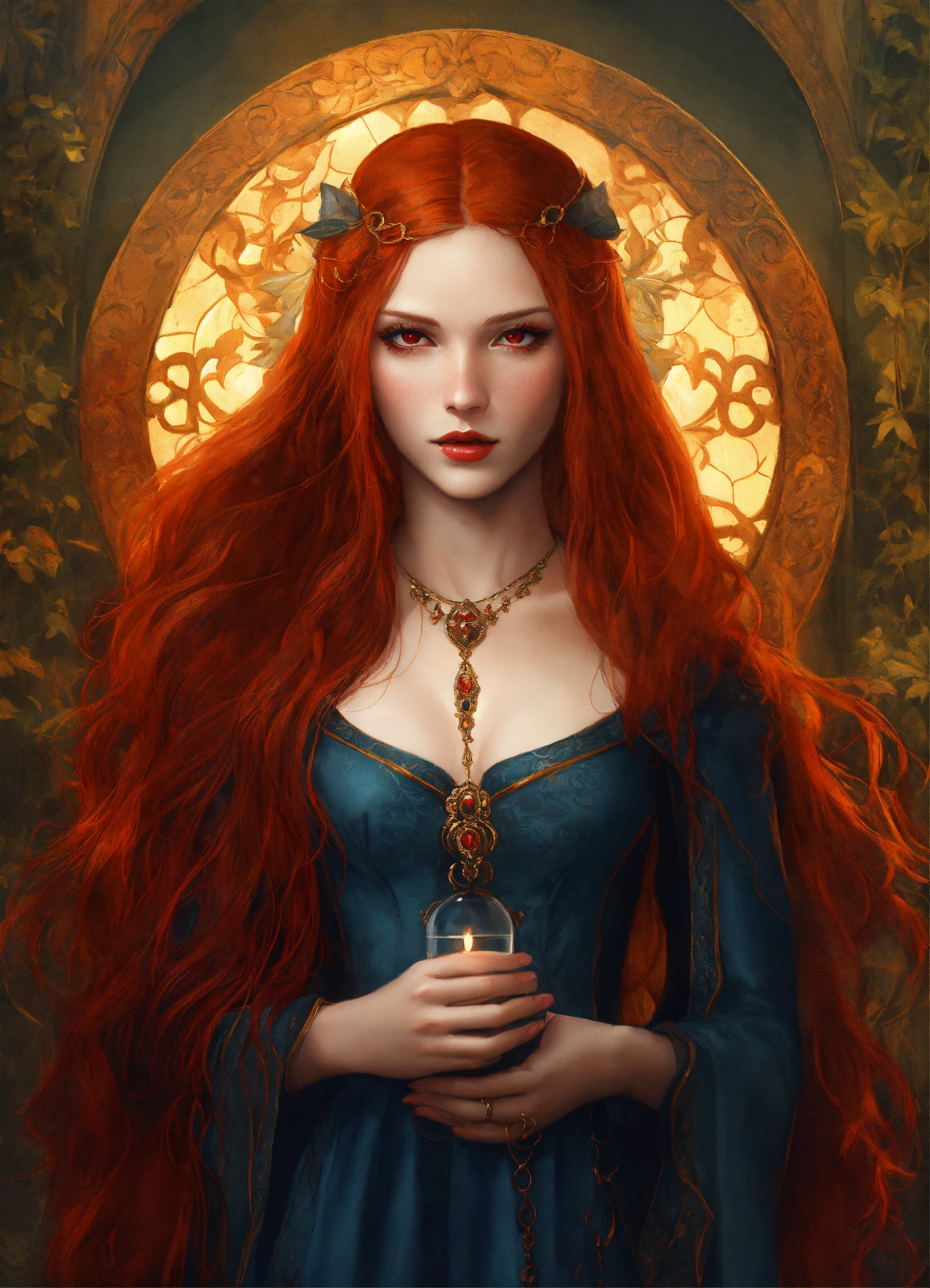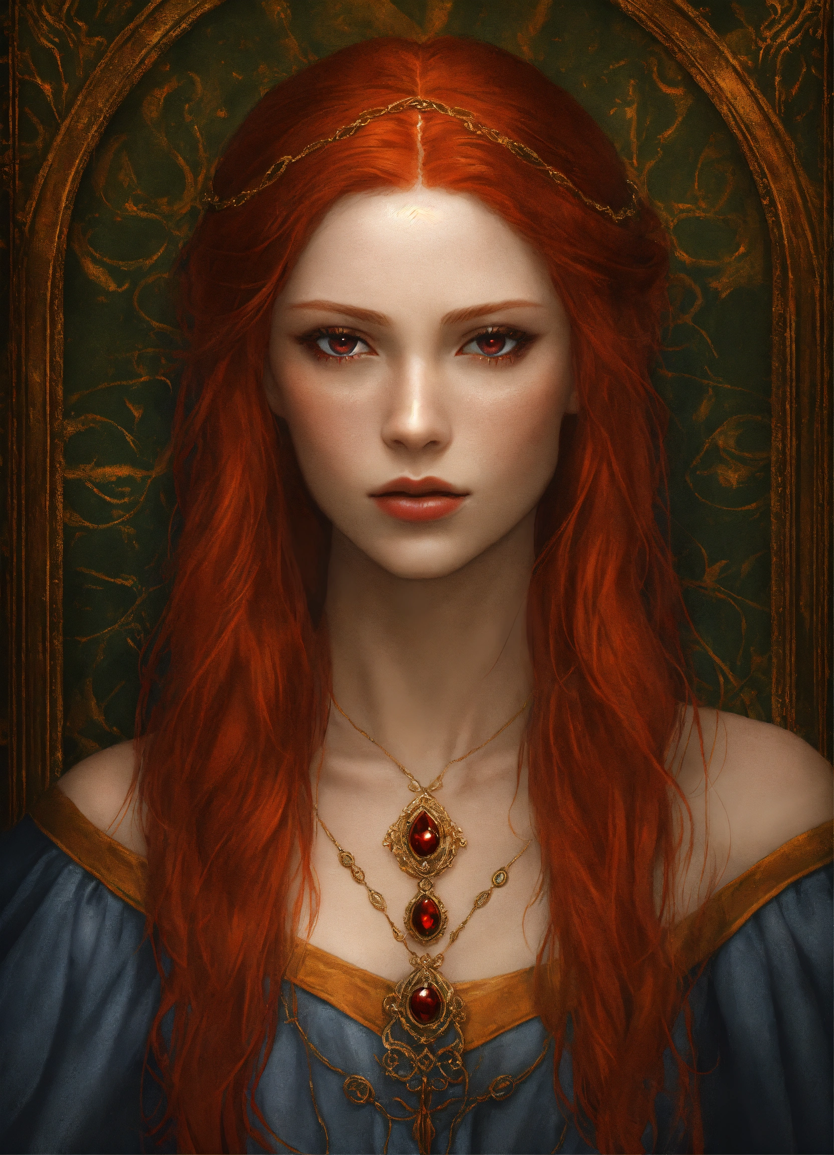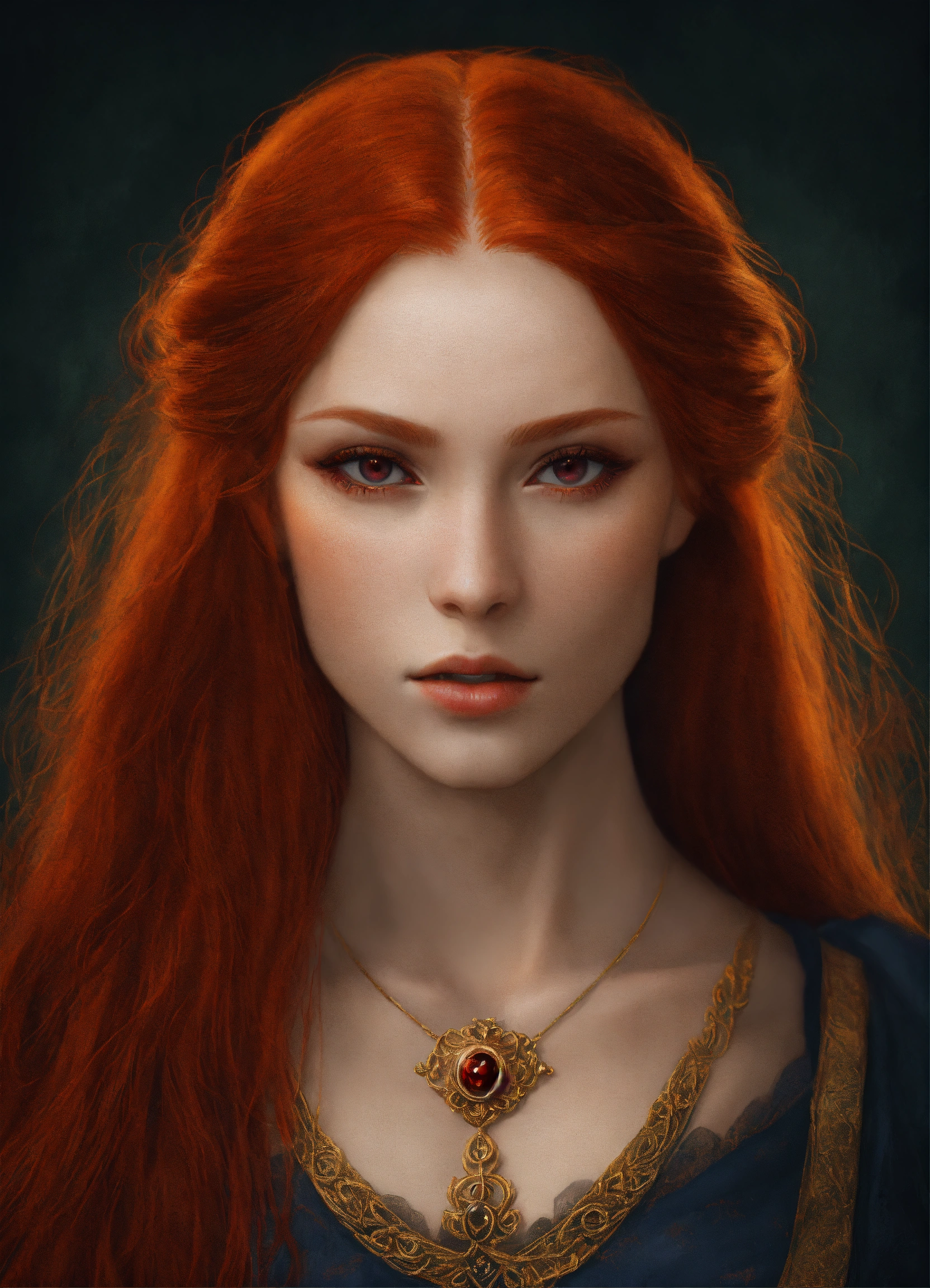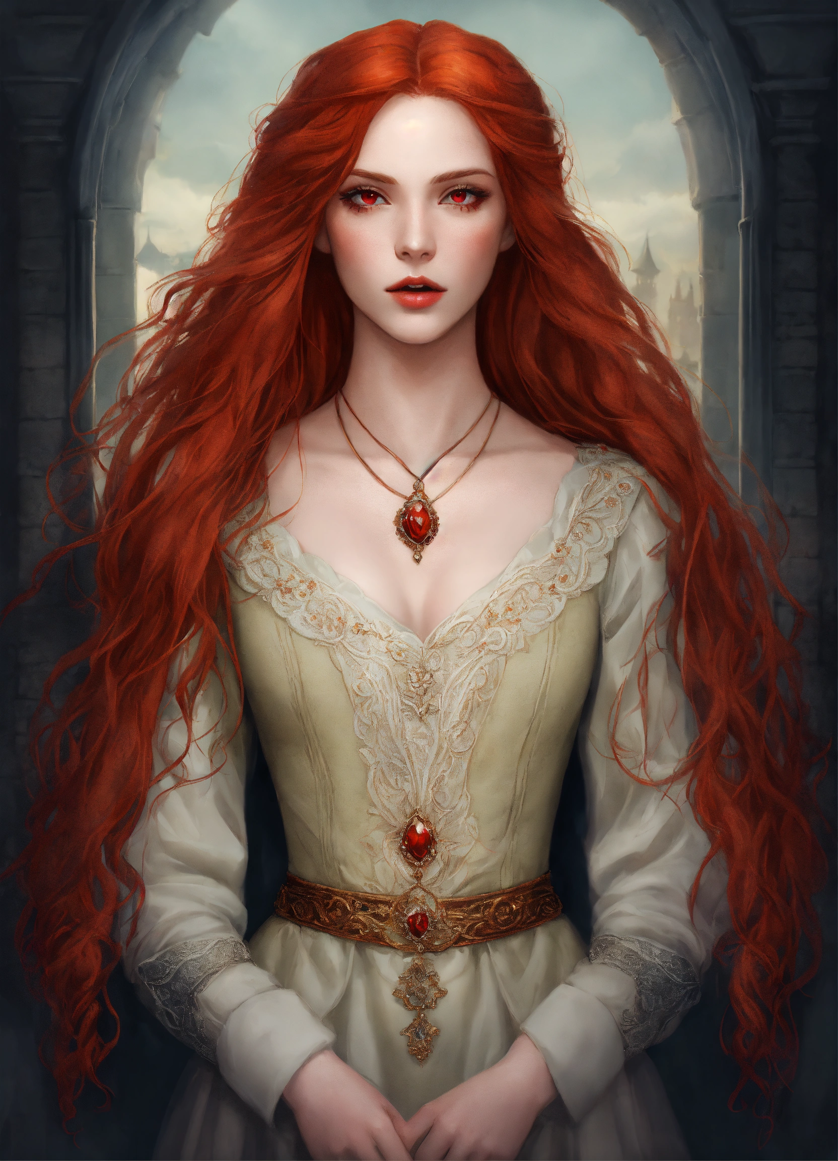 A portrait of a beautiful redhead vampire, symmetrical face, red eyes, long red hair, medieval fantasy, digital art, semi realistic, fantasy. delicate features.