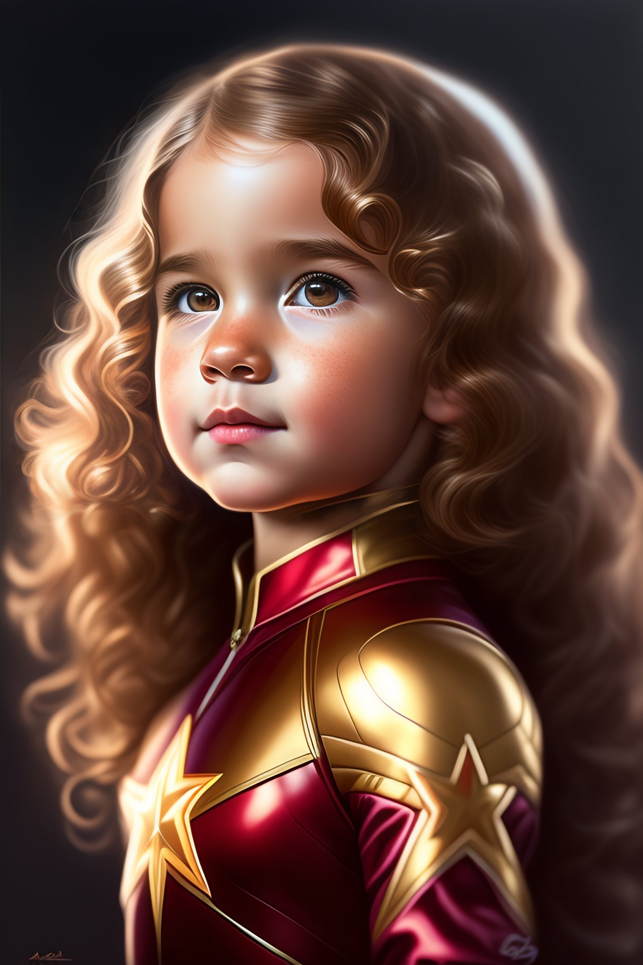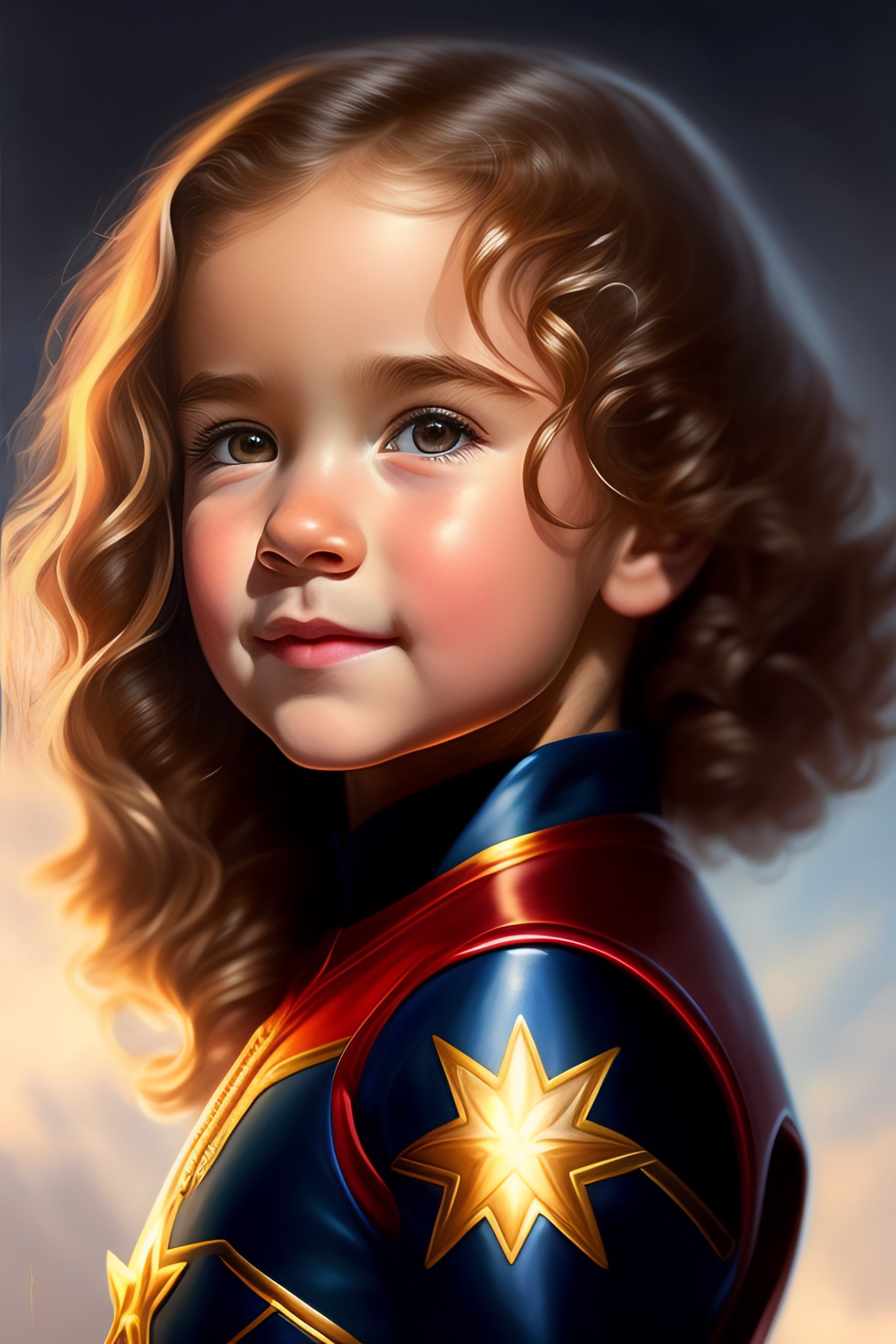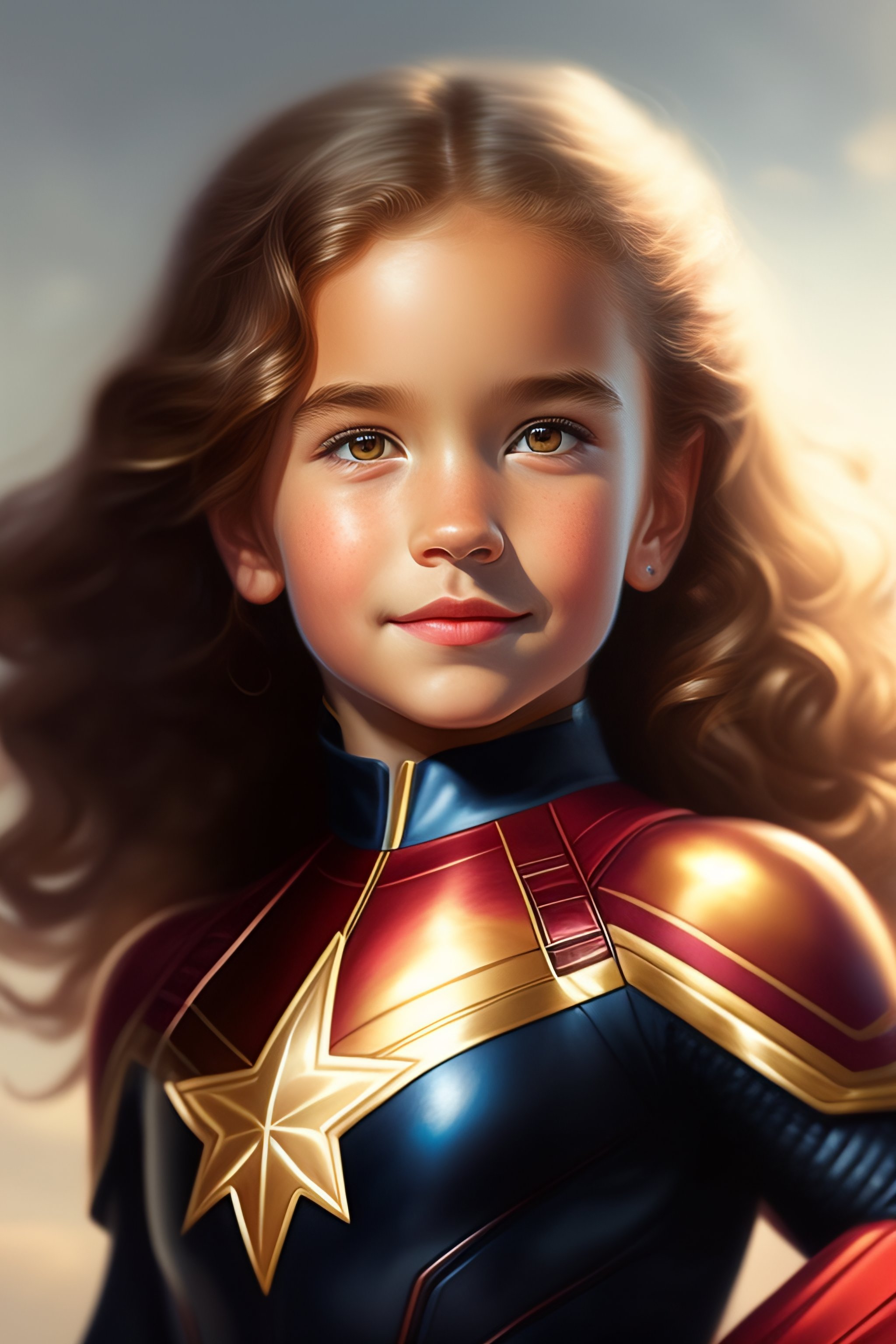 A little girl with a michievous face and wavy curly light brown hair. she is dressed as captain marvel, a superhero. clean elegant painting, beautiful detailed face. by artgerm and greg rutkowski