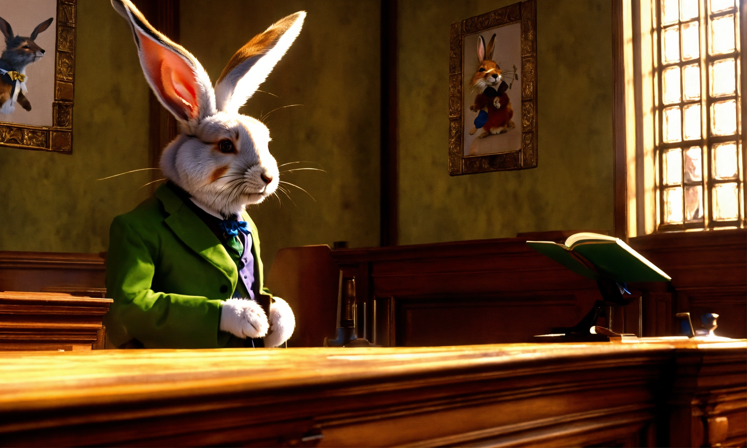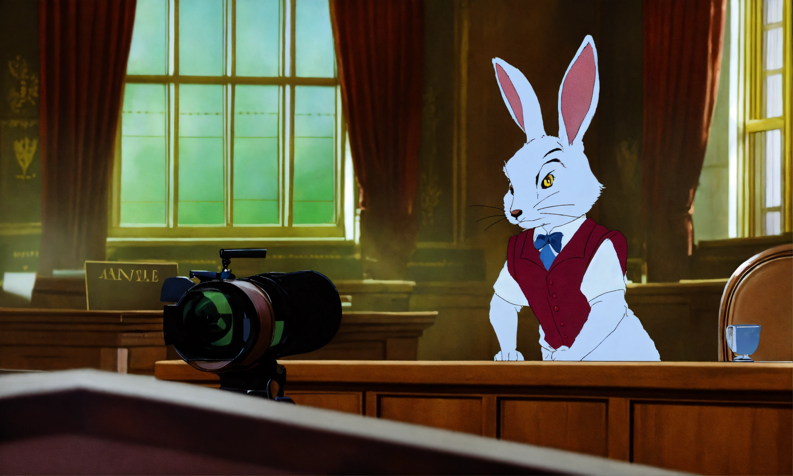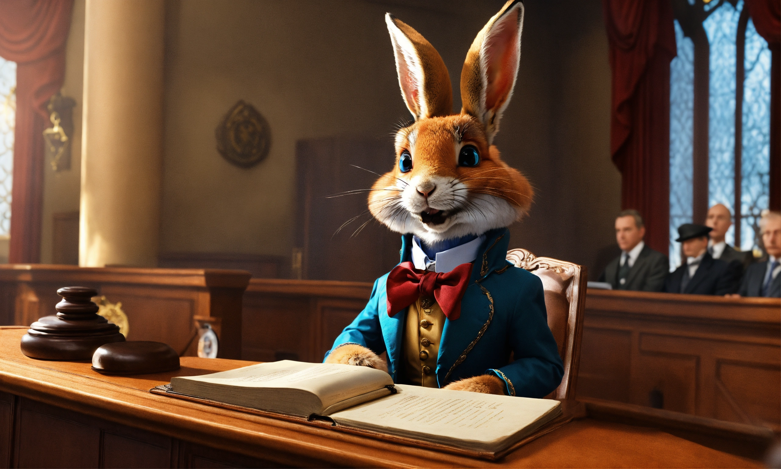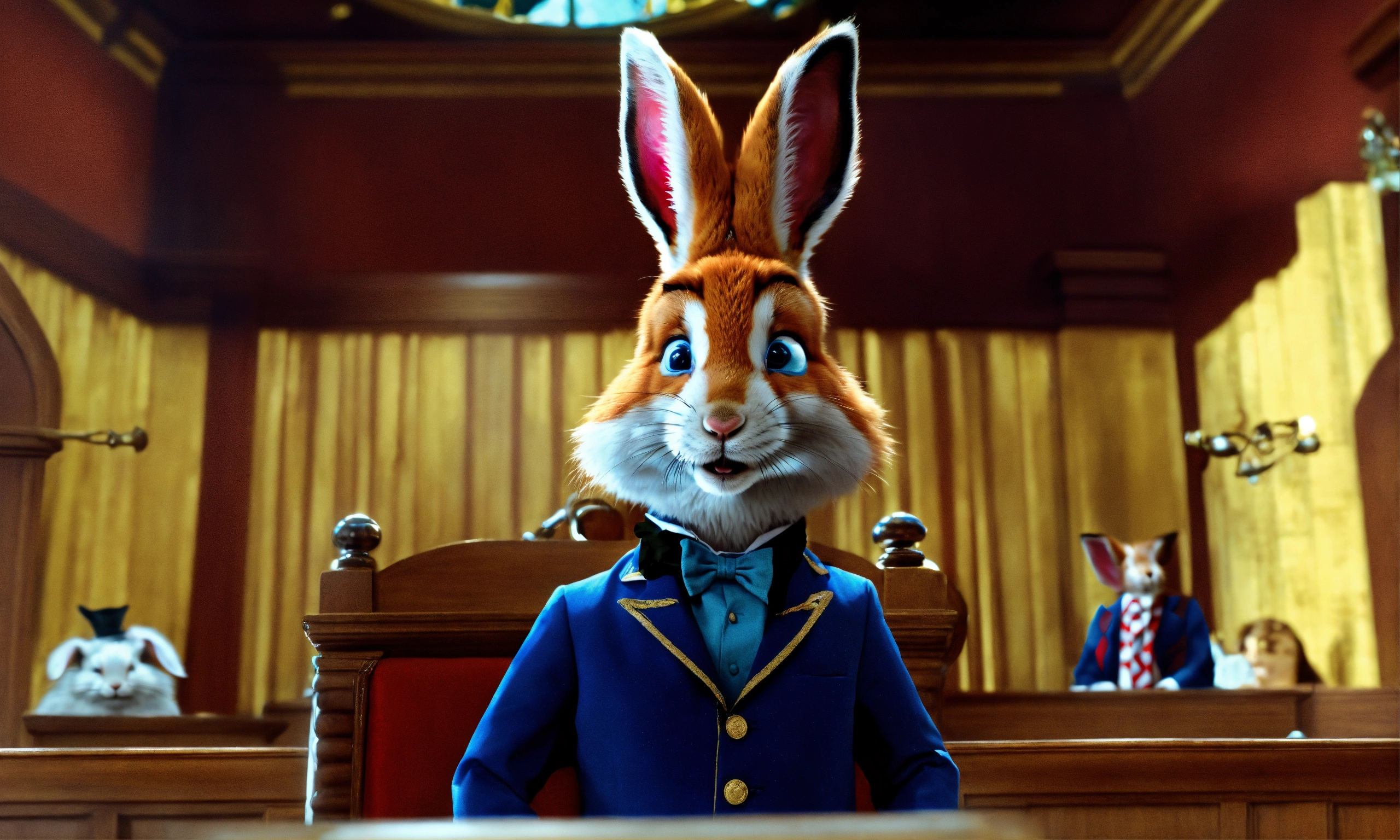A rabbit from alice in wonderland in court on the witness stand testifying and answering the question of a lawyer, that is a fox