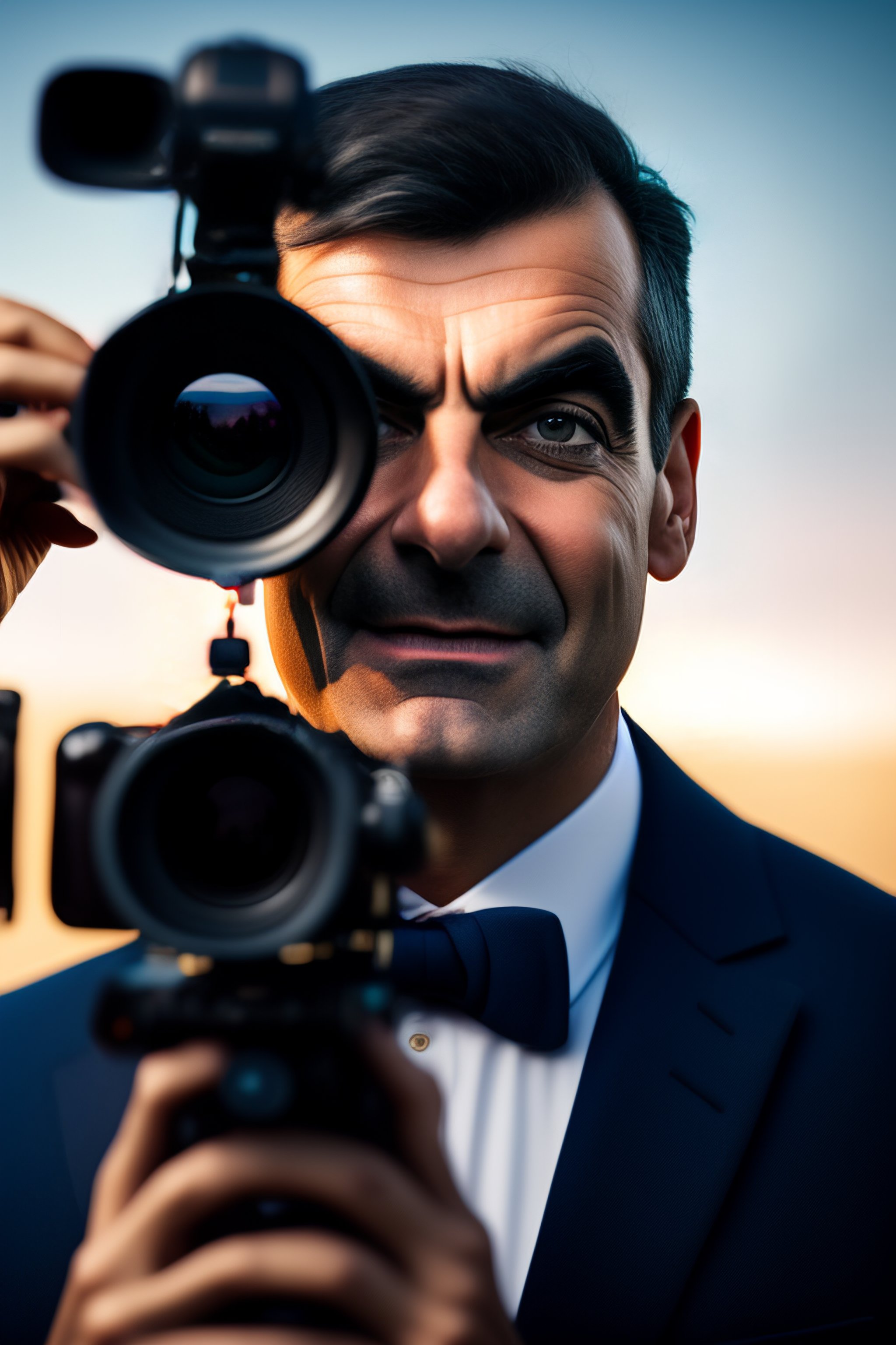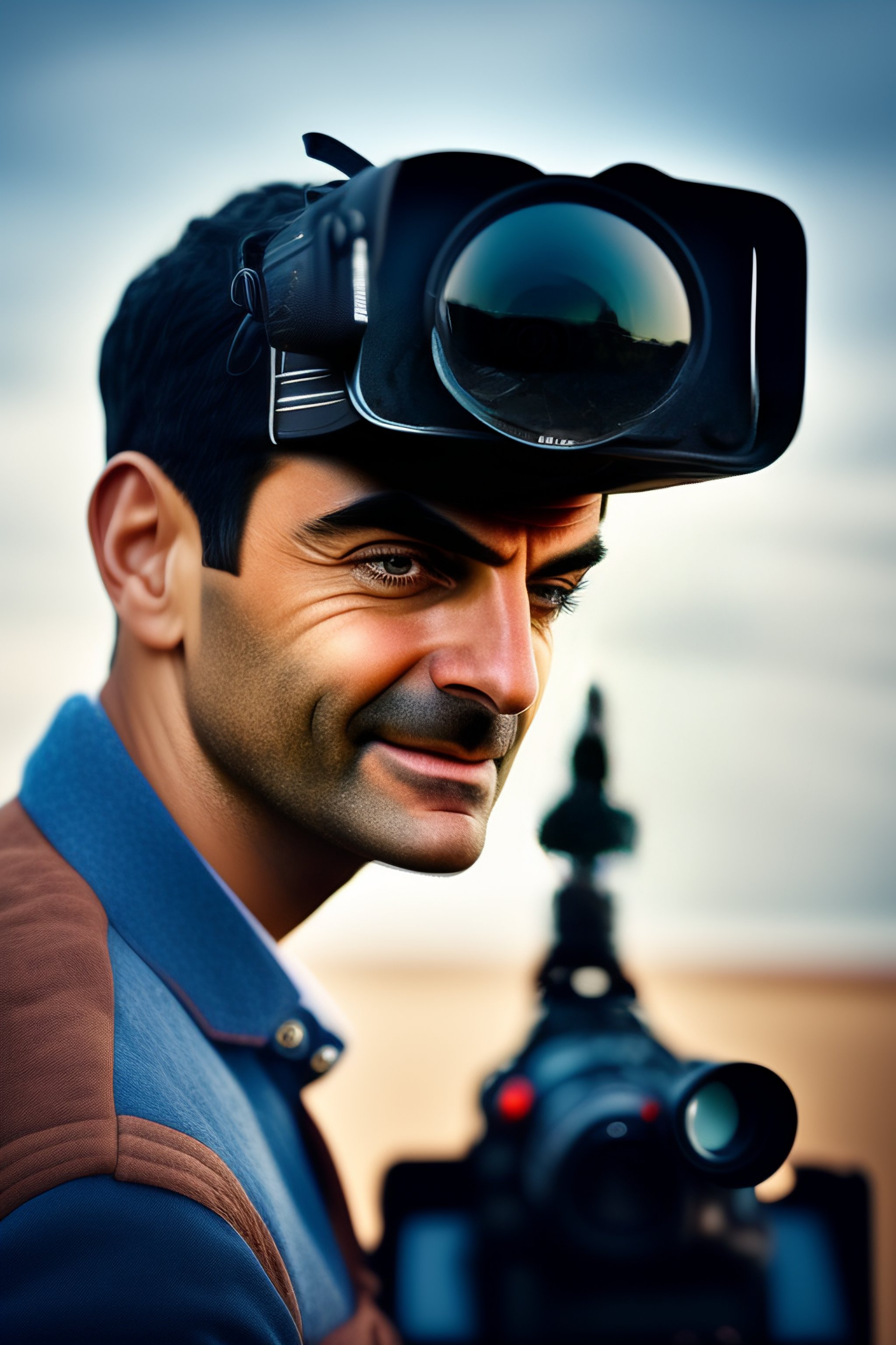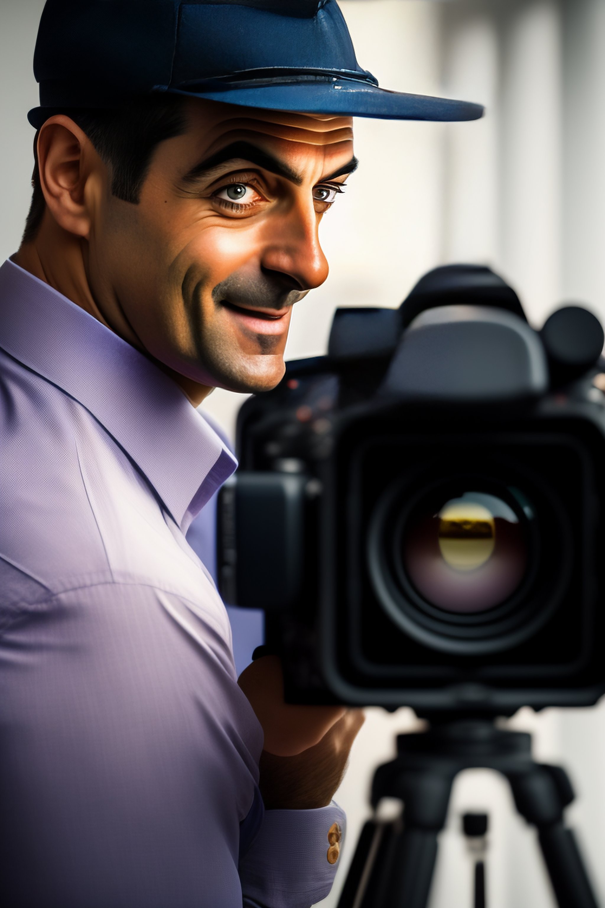 Create an image of a cameraman standing behind a video camera, with a questioning expression on his face. the cameraman should be a mix of mister bean and thomas the tank engine, and the image should be shot from the waist up. the camera should be slightly out of focus, while the cameraman should be sharp and clear. the cameraman should be peering over the top of the camera with a look of confusion or uncertainty
