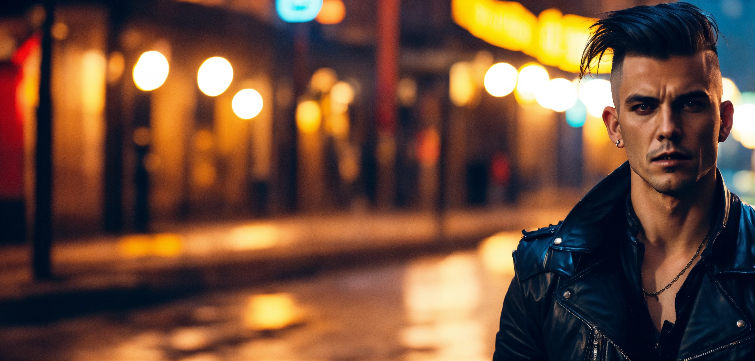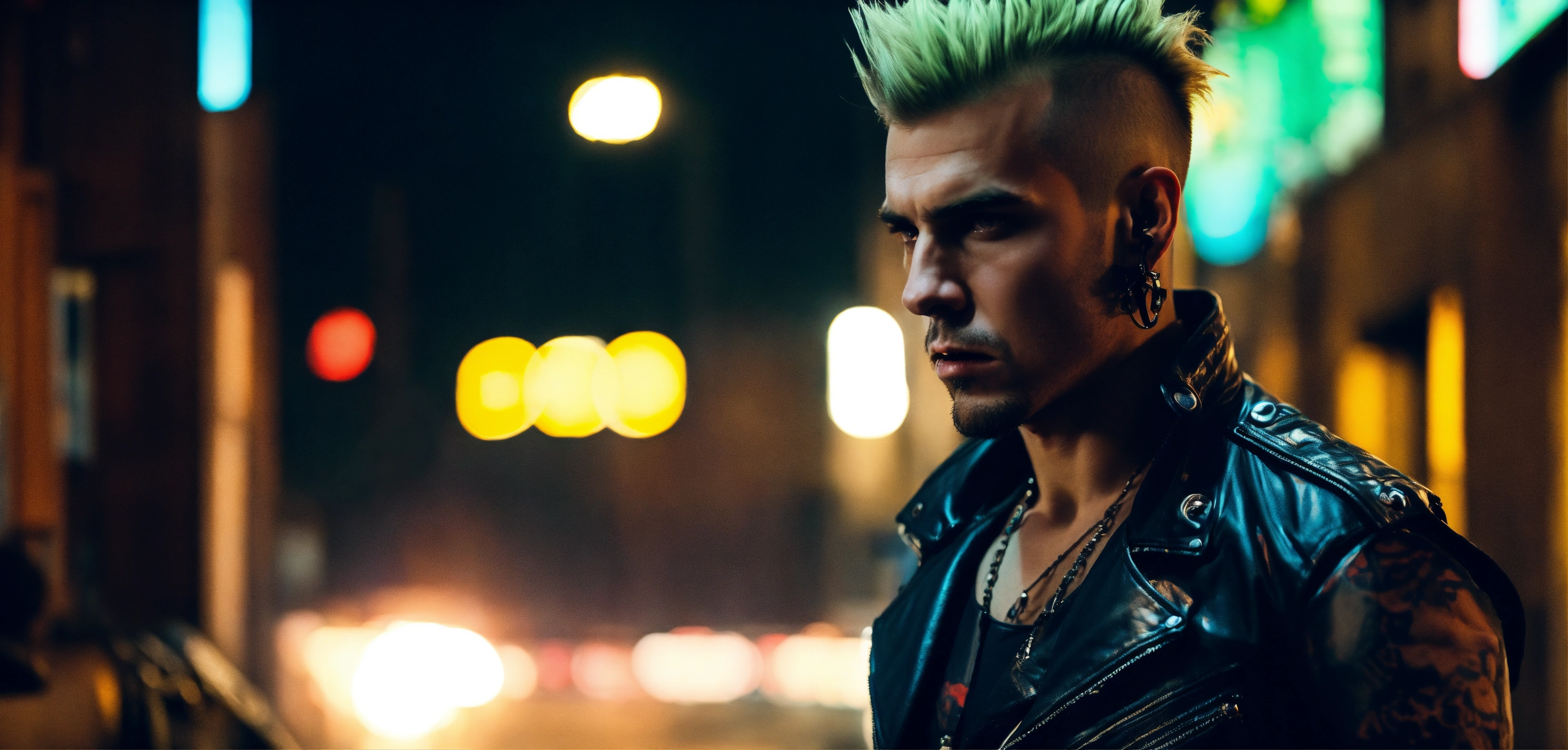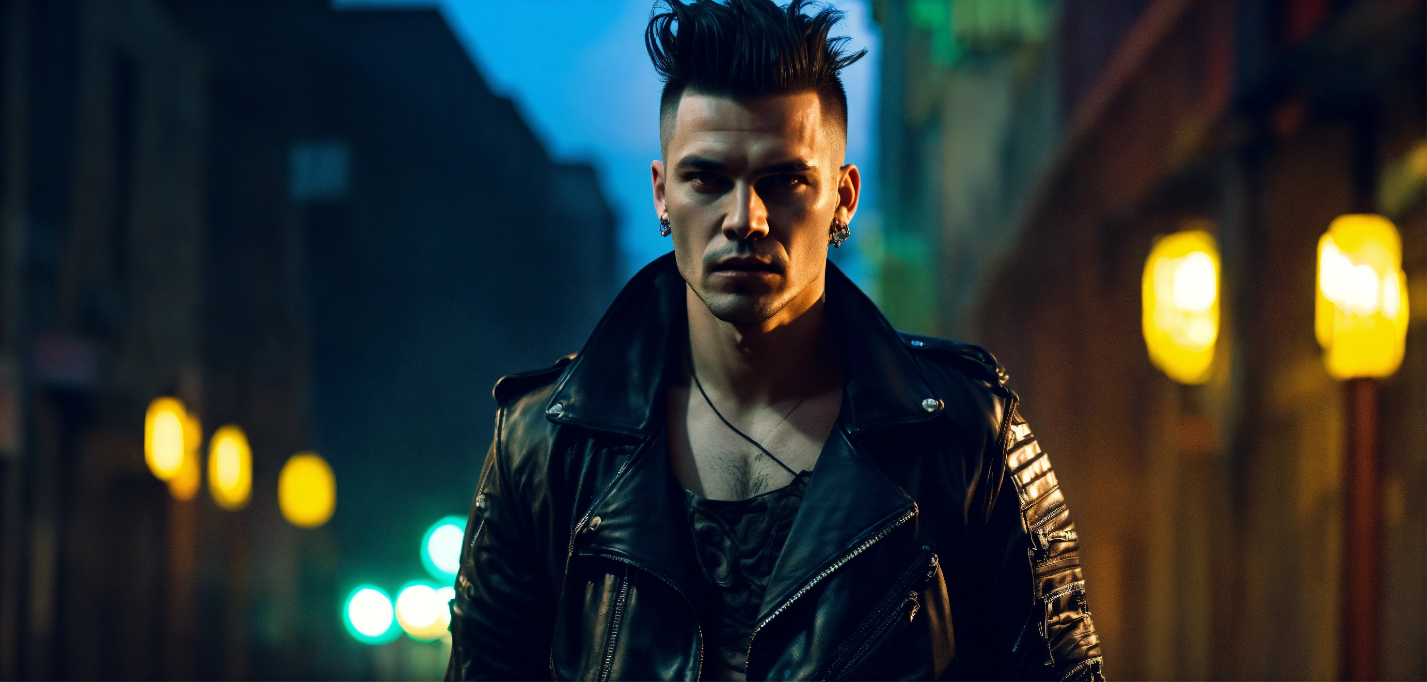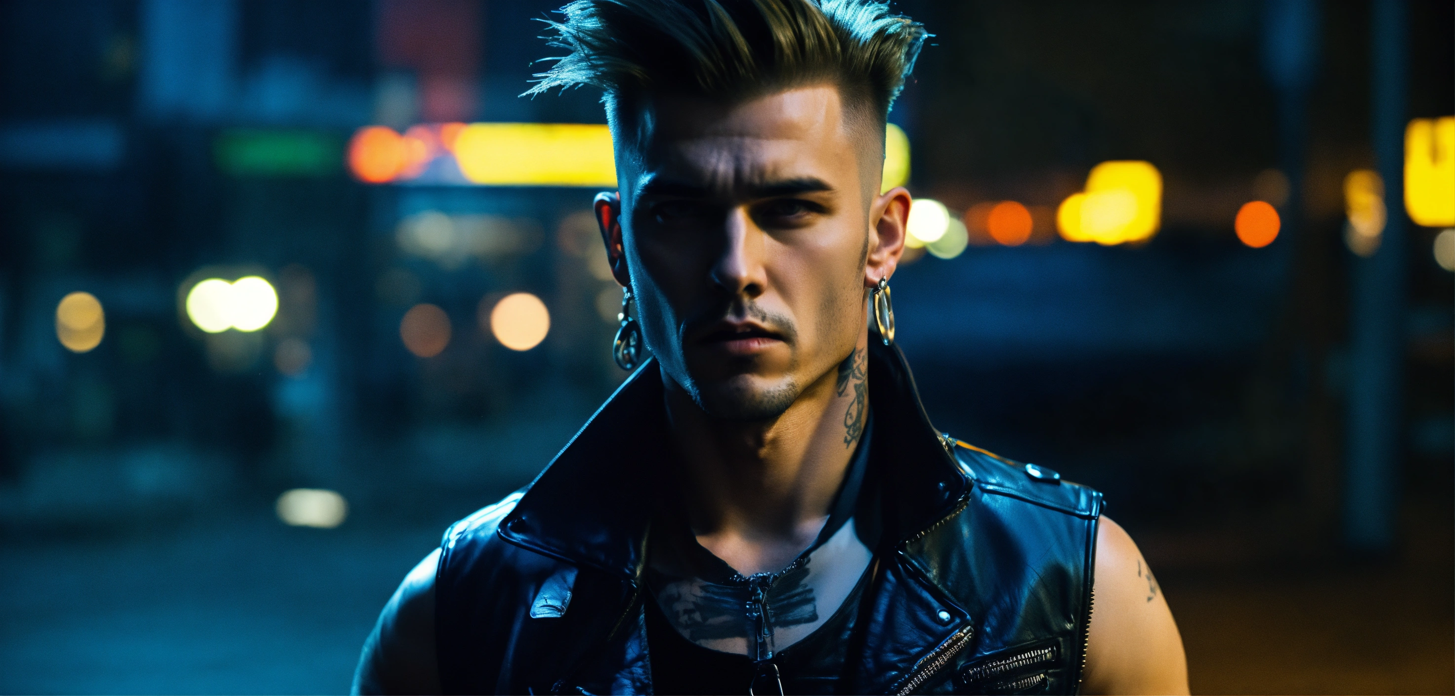 Cinematic look, male punk, leathr biker vest, undercut hairstyle, urban city street by night, haze, underworld vampire movie style