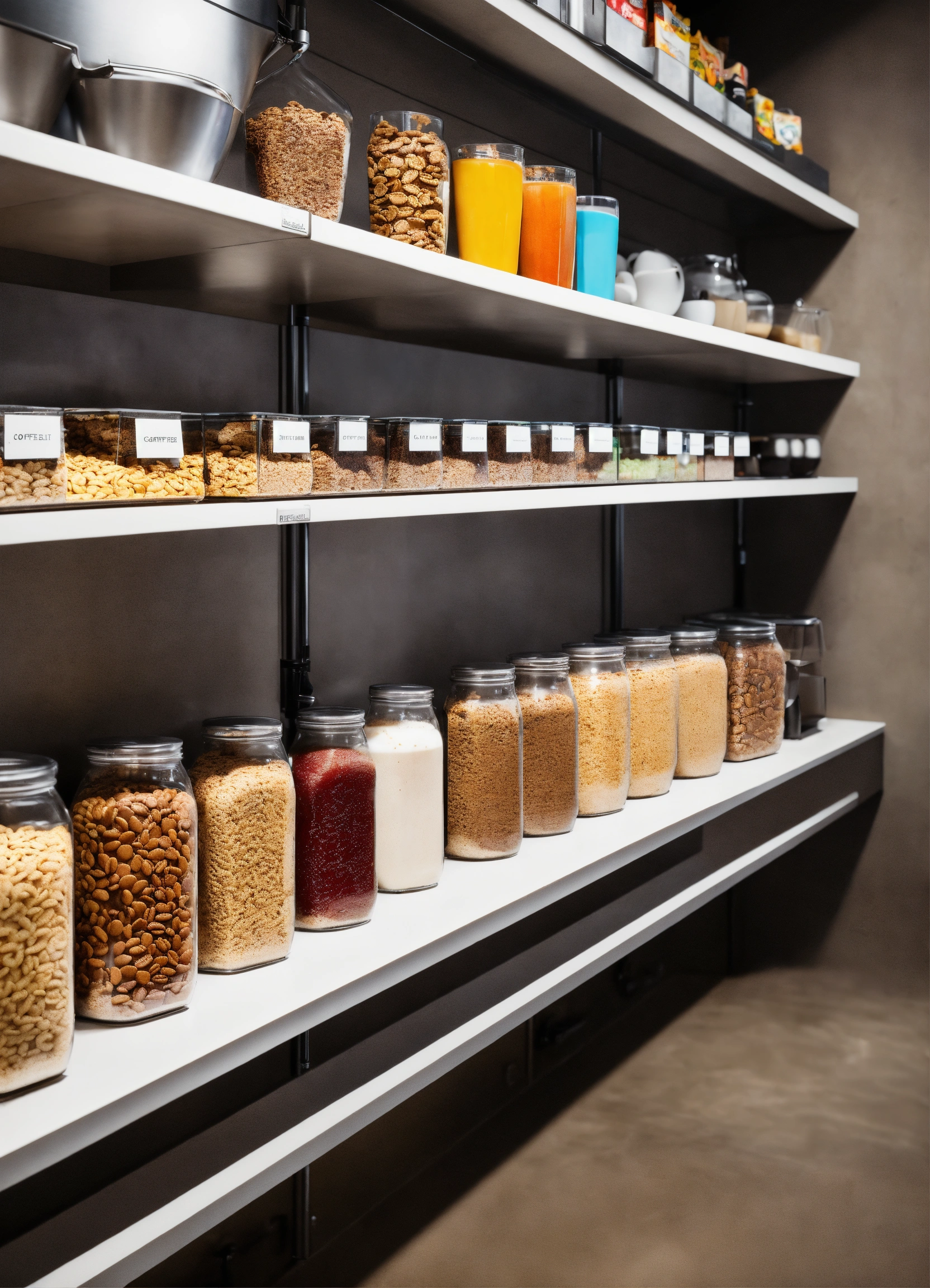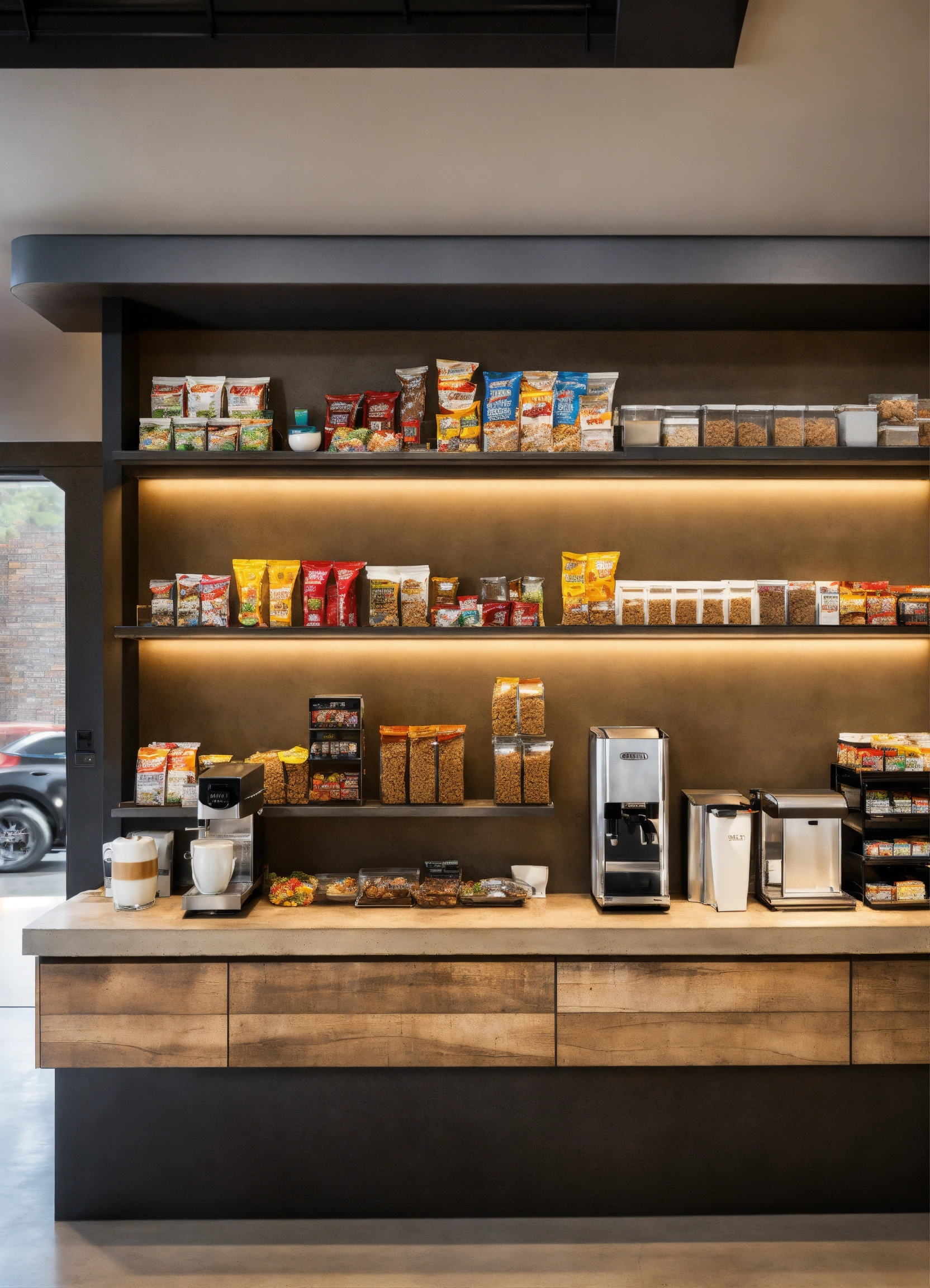 A self serve breakroom cereal shelf with snacks on an easy to reach shelf for employees to take from as they need. modern design, cafe interior, industrial effect, ultra-realistic, show all details of cafe bar and celling show espresso machine, concrete celling, cafe will be in car show room, architectural design