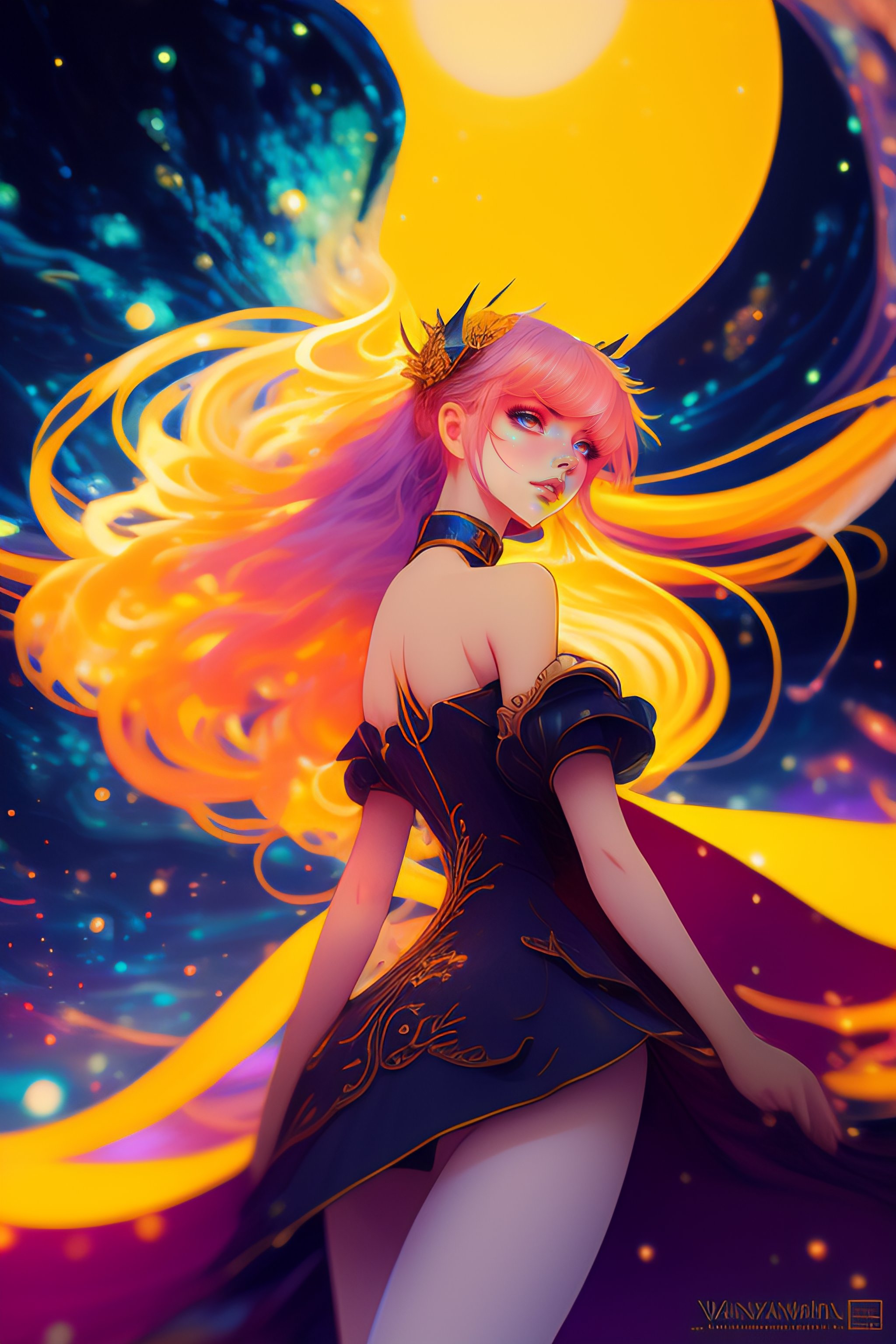 Dreamy mixed media artwork, hyperwave cover art, anime character design, low-angle:: personnification of the annual hypocrisy of false good resolutions, mad dancing, dynamic pose, expressive, jean-baptiste monge and vincent van gogh and anna dittmann art style:: pointillism, poster, dark light, minimalist, anime rendering, well detailed, cel shading, bokeh