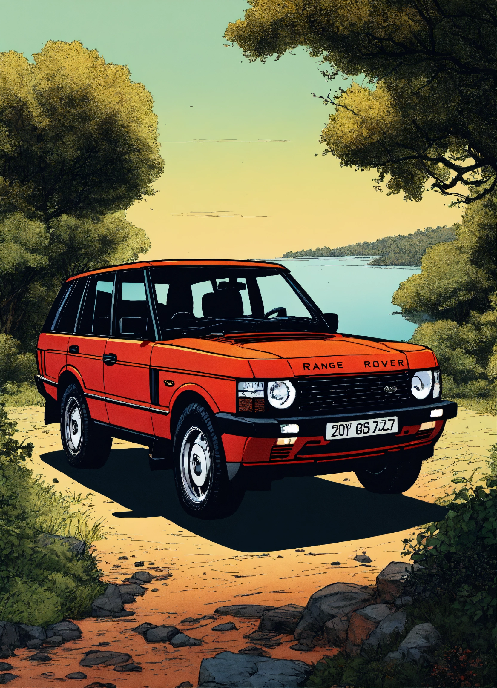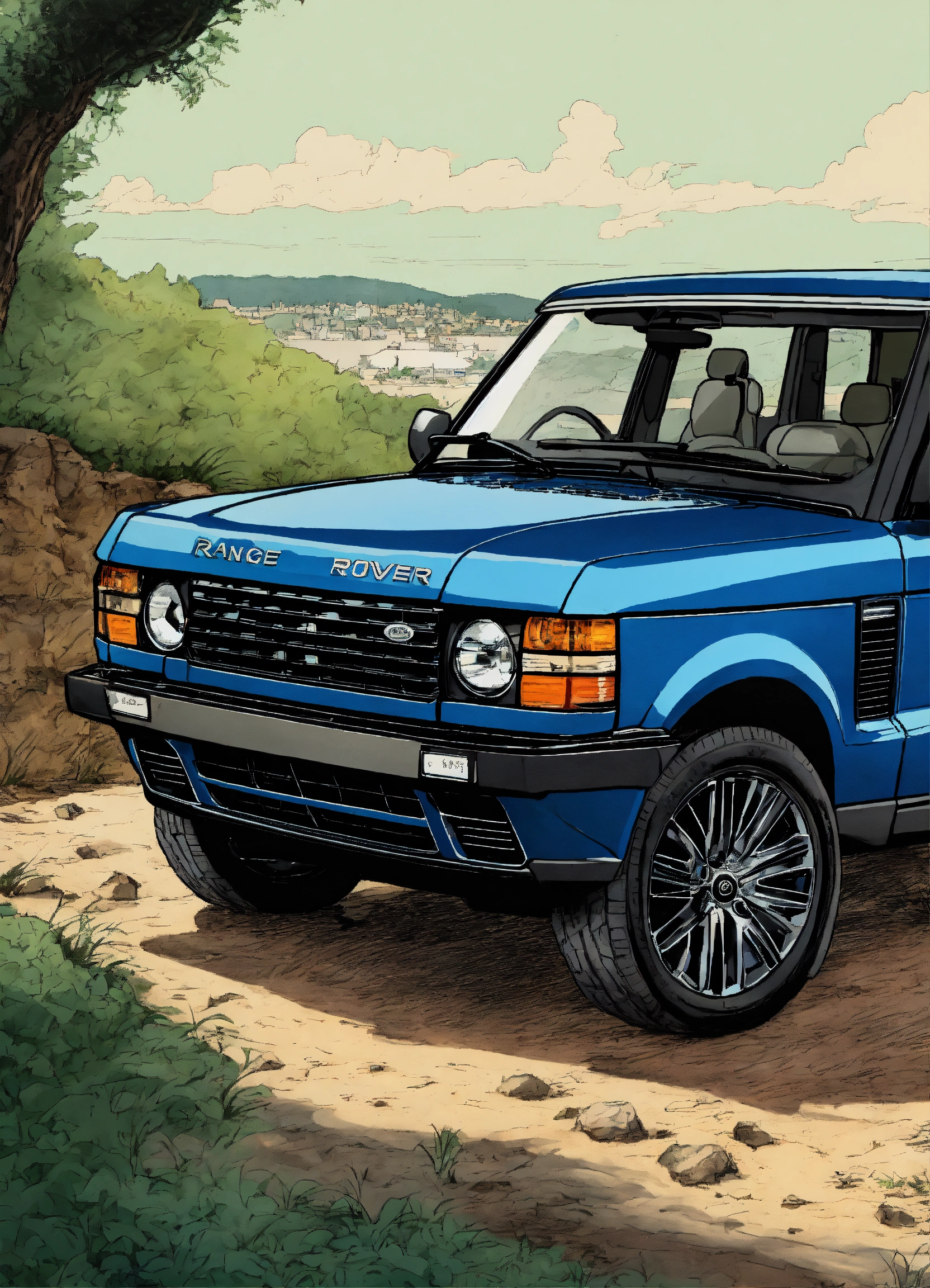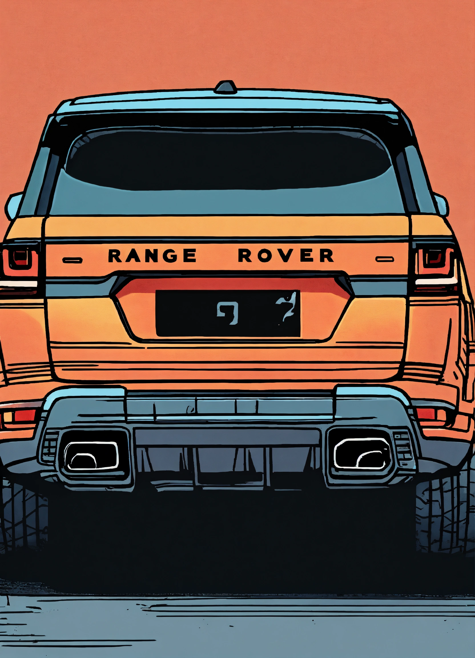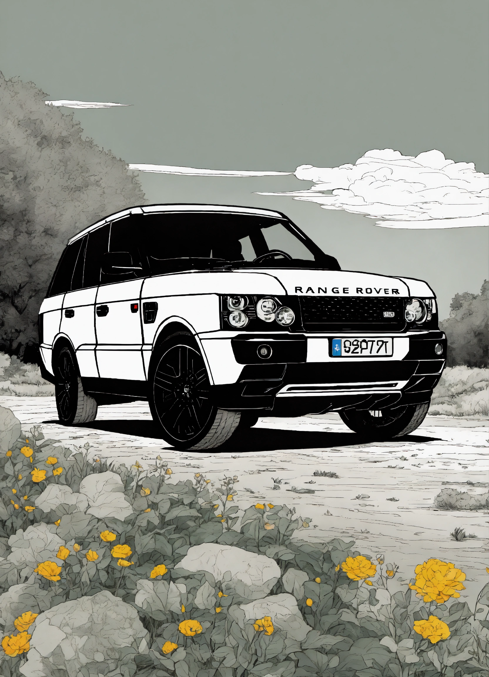 Detailed pen and ink illustration of range rover sport 2022, dark color of the car, by herge, in the style of tin-tin comics, colorful, detailed, high quality, minimalism, aesthetic