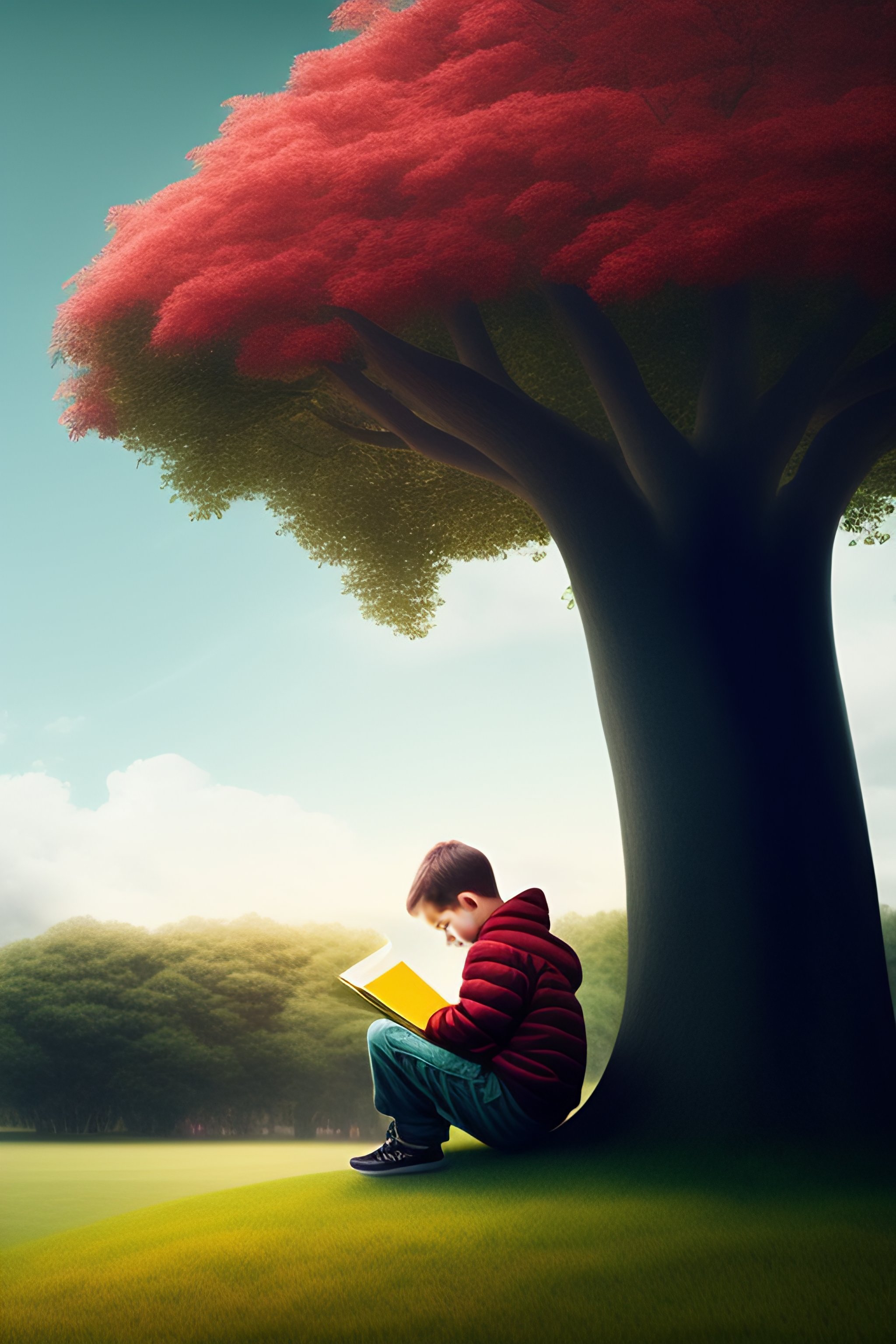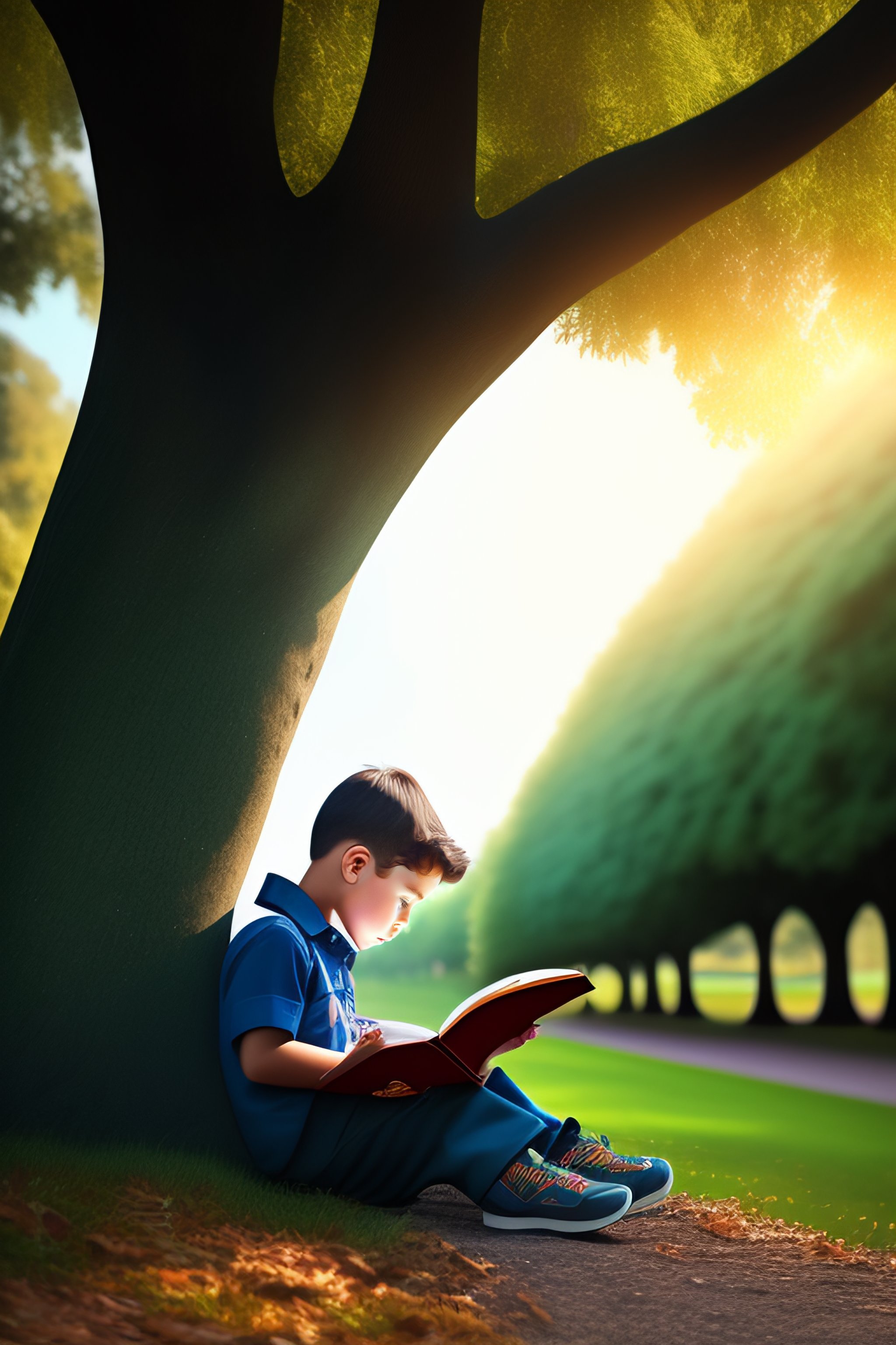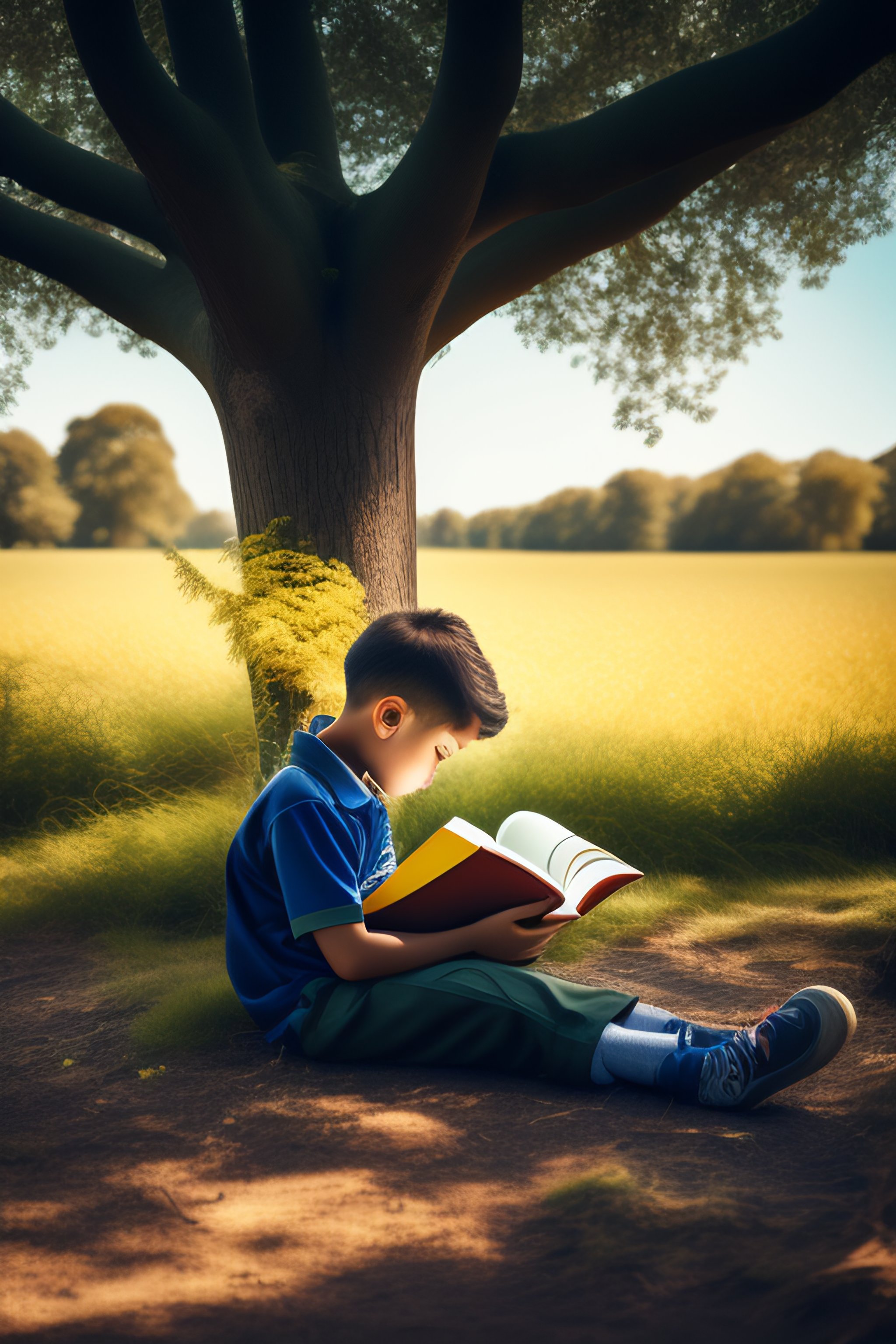 A boy sitting under a tree reading a book