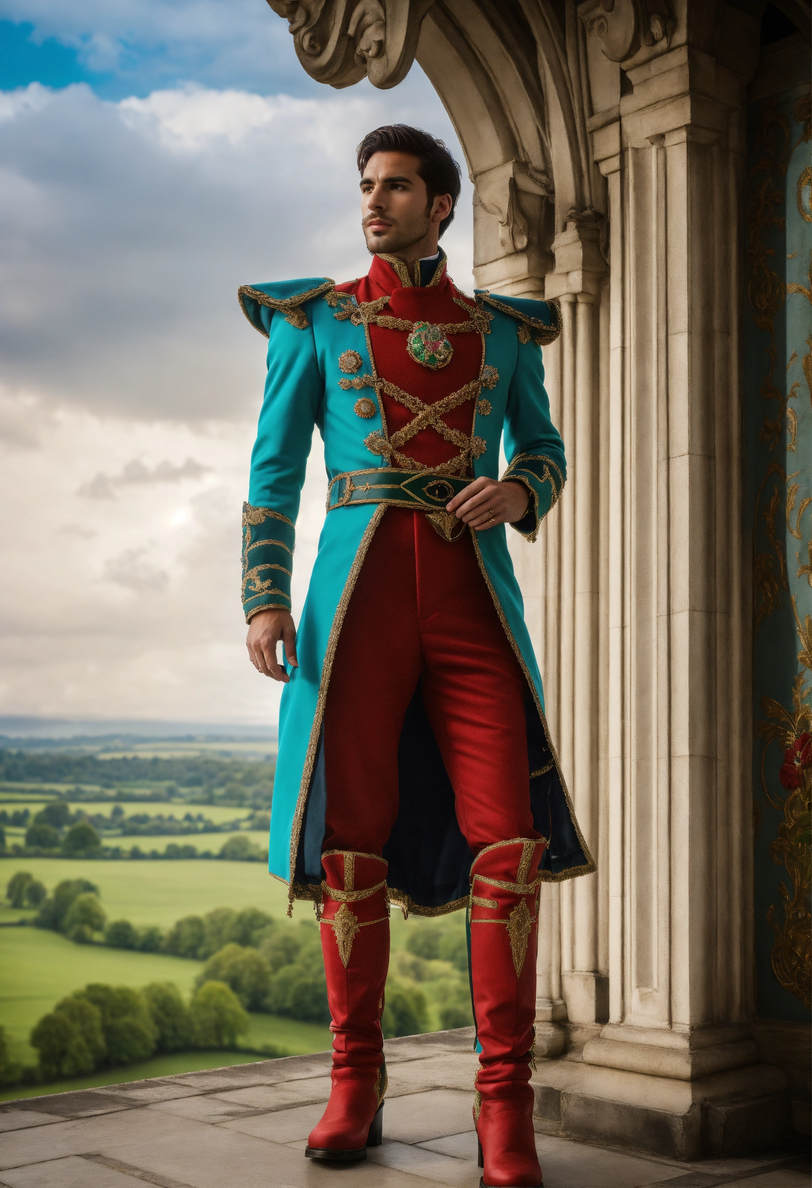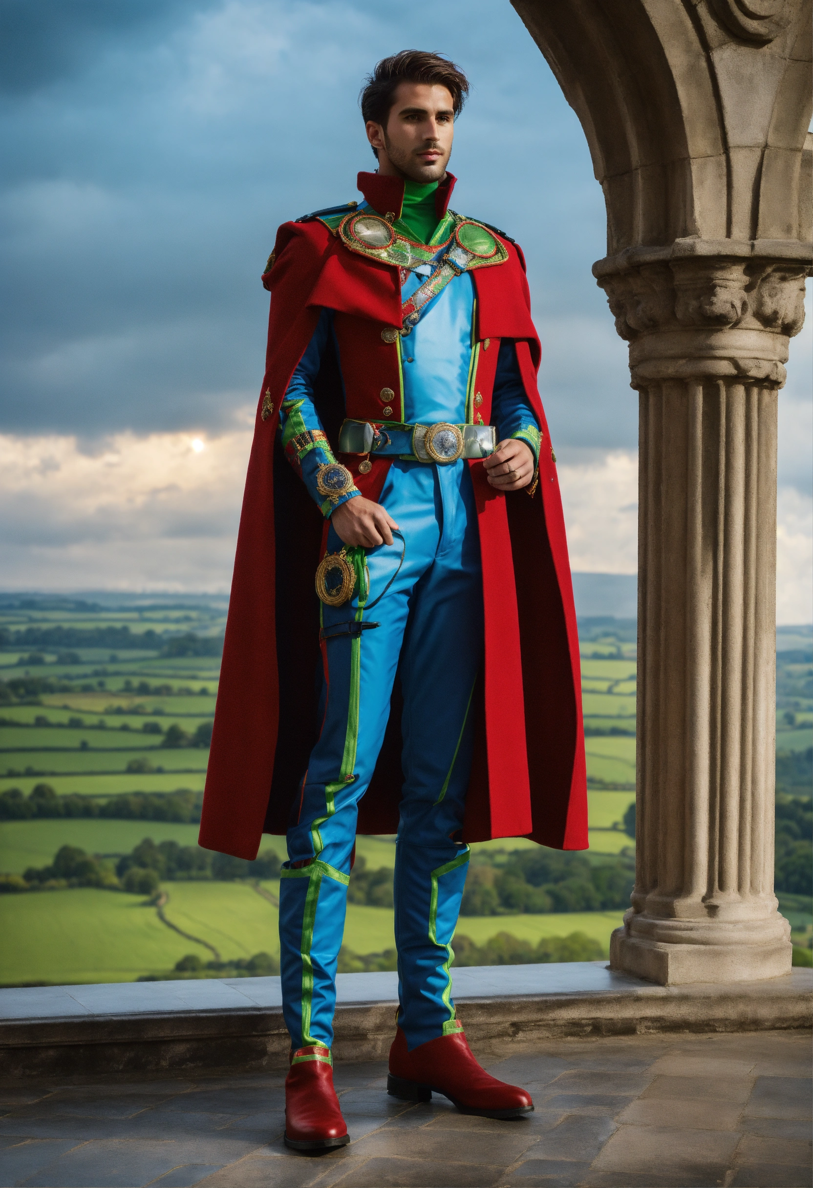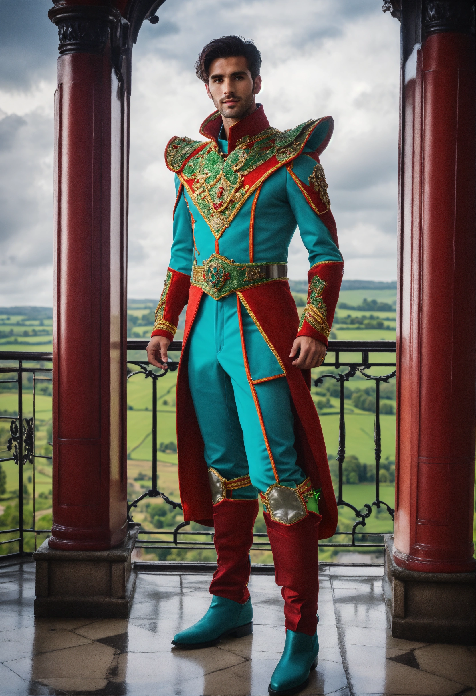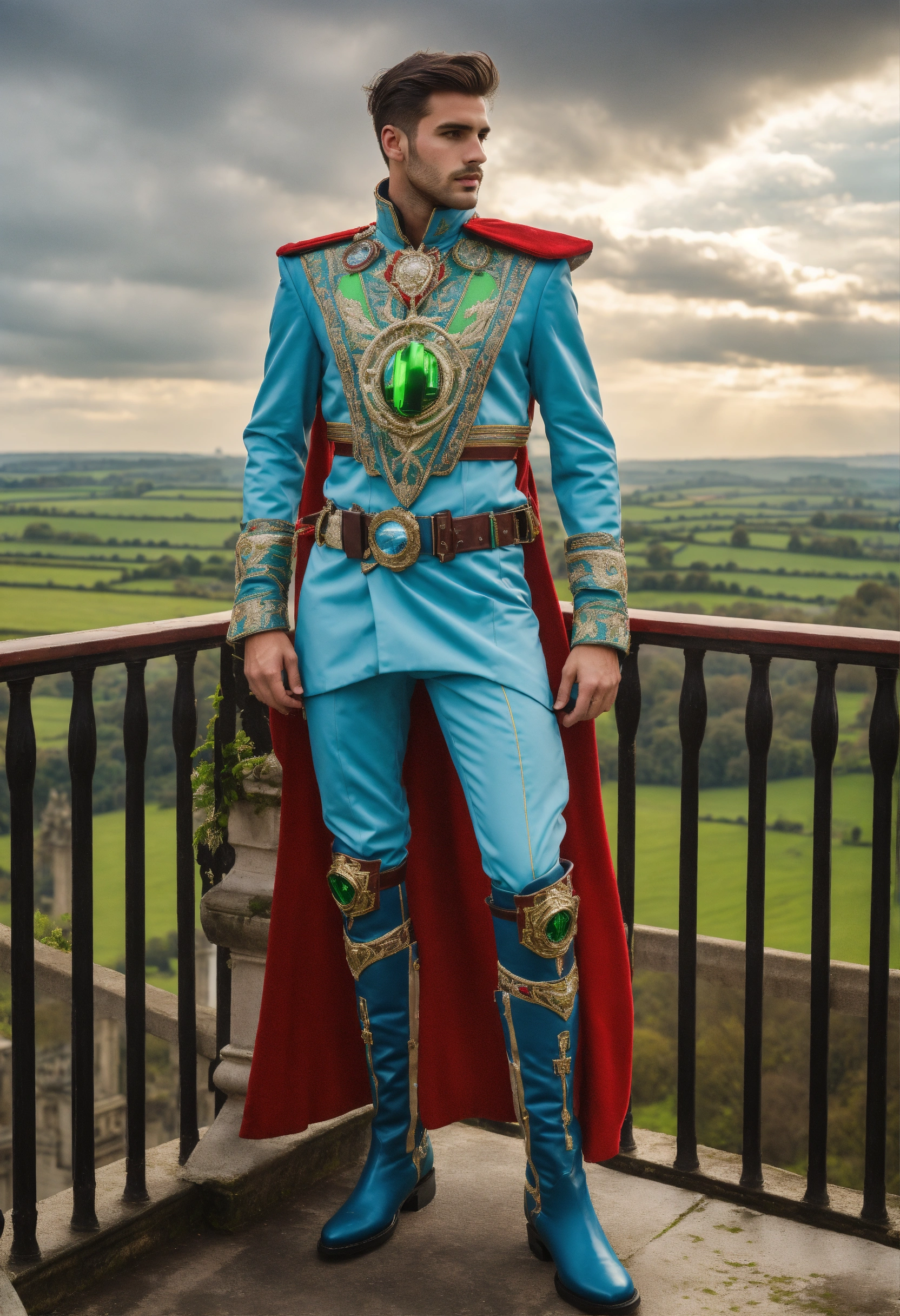 Highly detailed full body of a sci fi aristocrat, royalty, light blue and red and volt green futuristic outfit and boots, standing on palace balcony overlooking the english countryside on a cloudy day, male, handsome, 29 years old, highly detailed