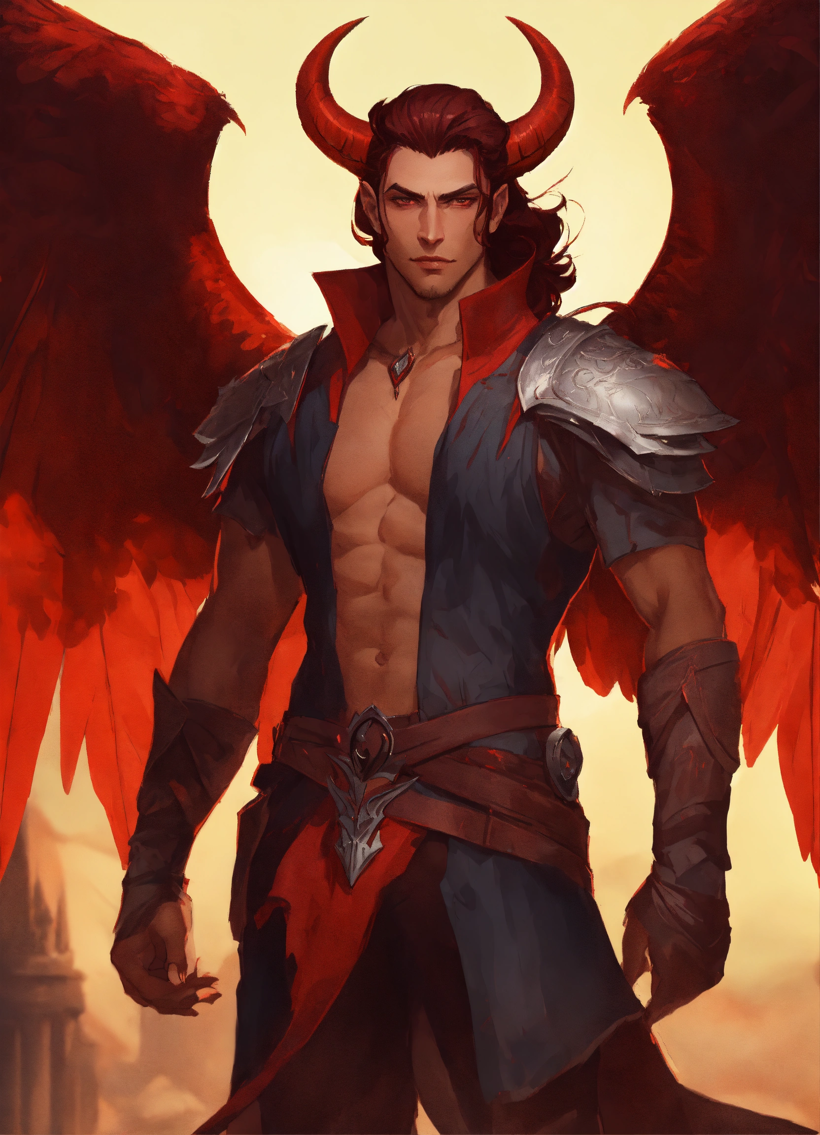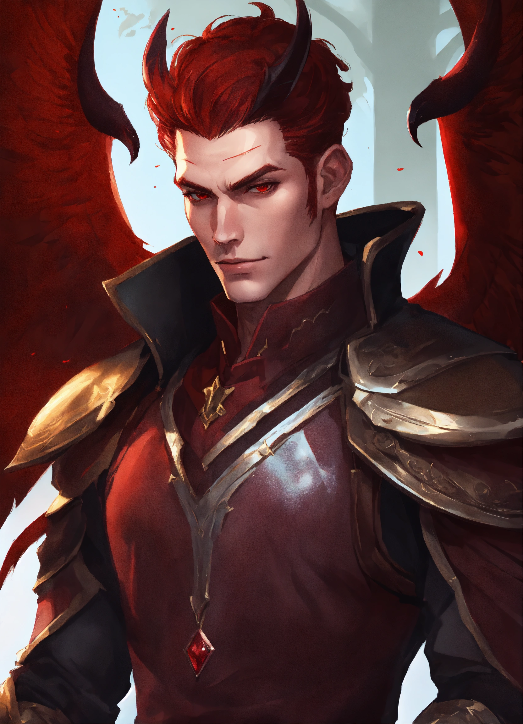 A handsome demon man with shoulder length dark red hair slicked back horns and wings dnd character art