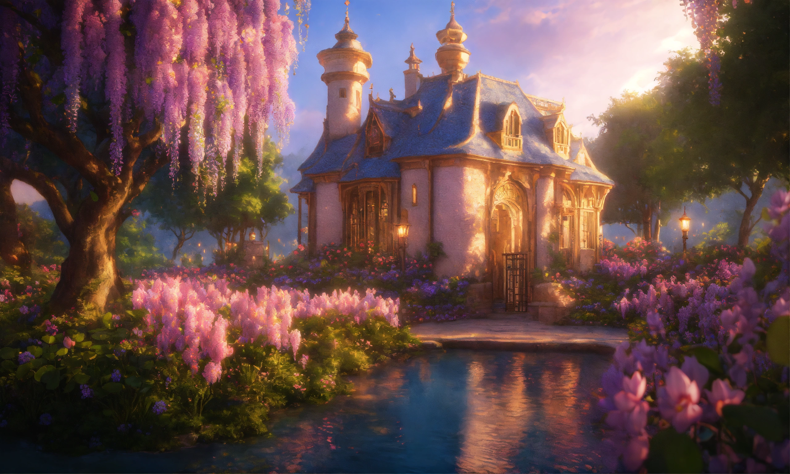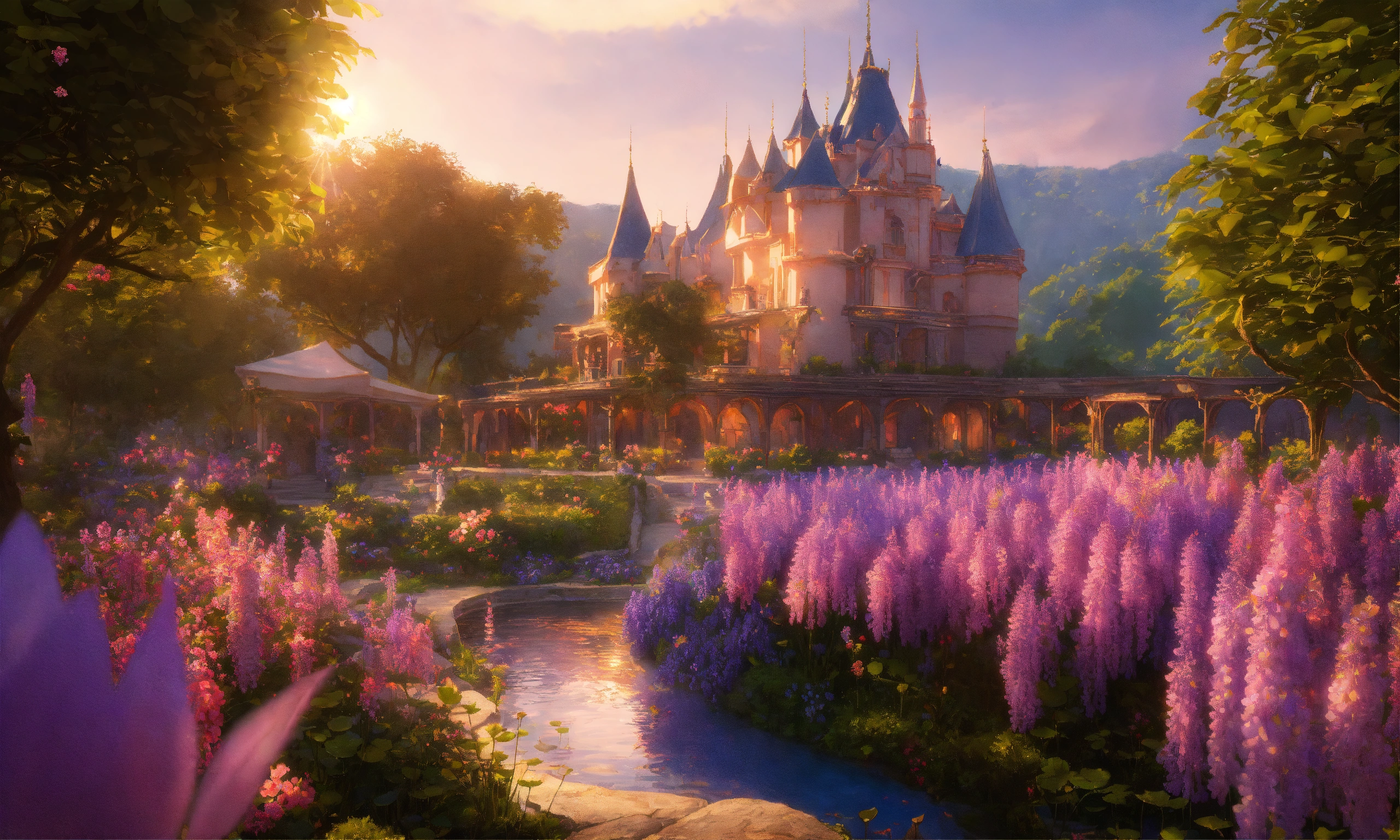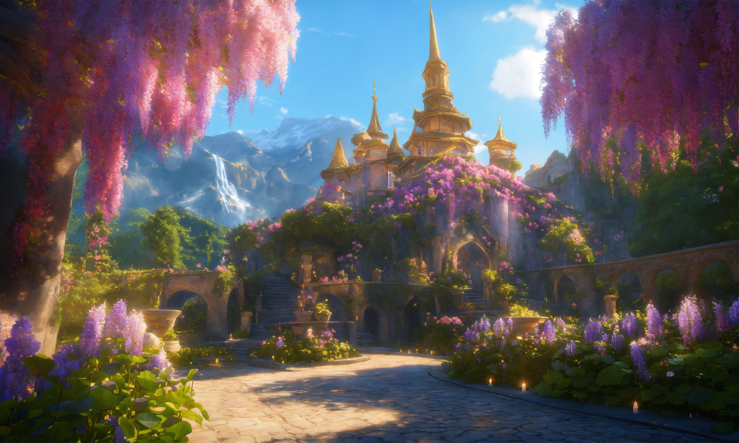 Disneland castle, bucolic campanules flowers, eastern ogives gold flowered rose and gold, blue, parma, waterfal, very fine chiseled with basins covered with beautiful pink lotus and paths colored with bright reflections, create a heavenly world with pastel landscapes covered with flowers and trees covered with realistic wisteria, photorealists colorful vintage pastel, sunlight by candlelight natural light, oriental, ogive, flowery, wisteria, complex sharp image fine octane details unreal engine ultra realistic 16k cinema