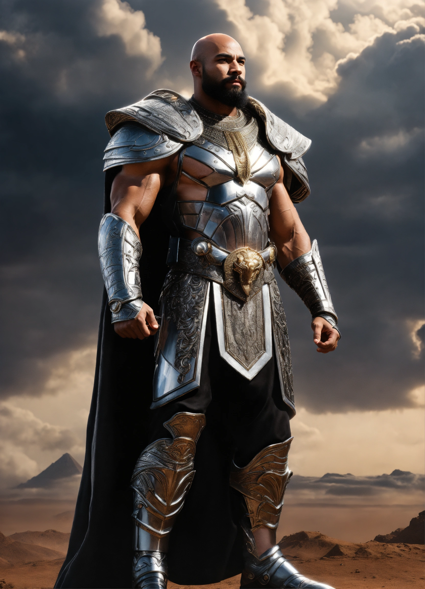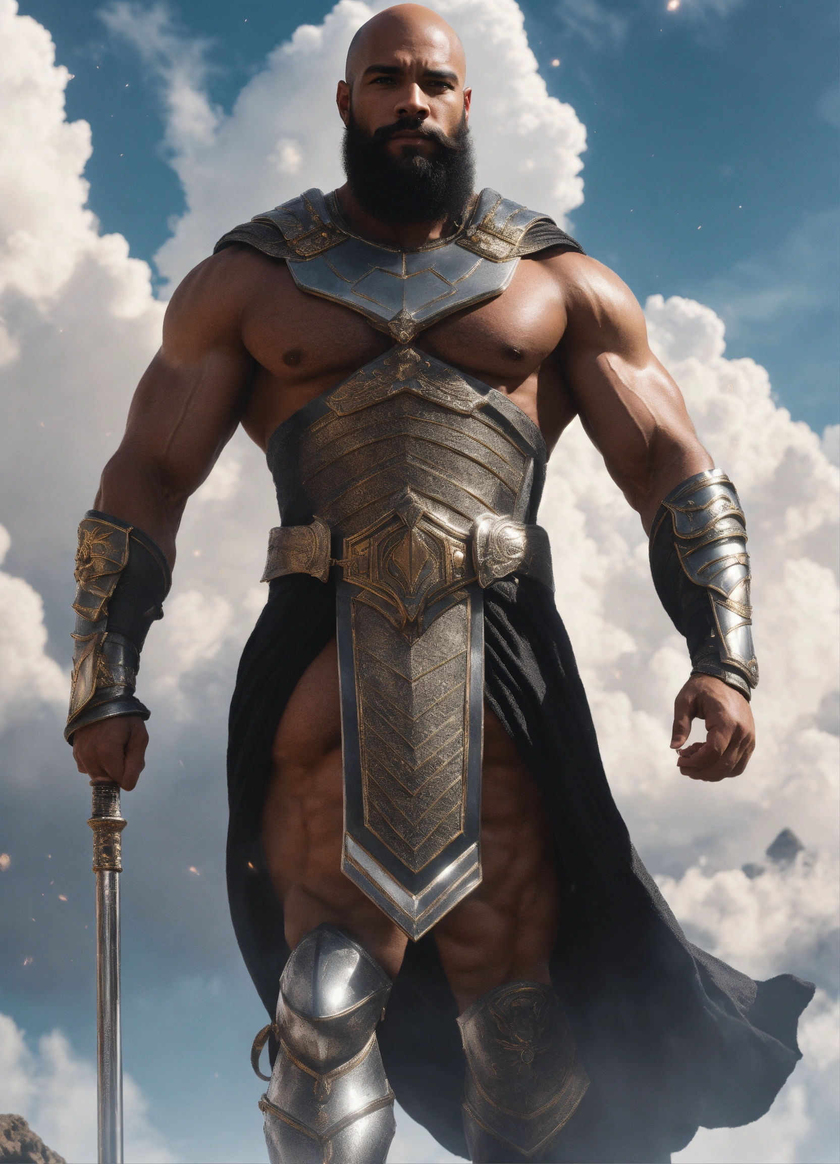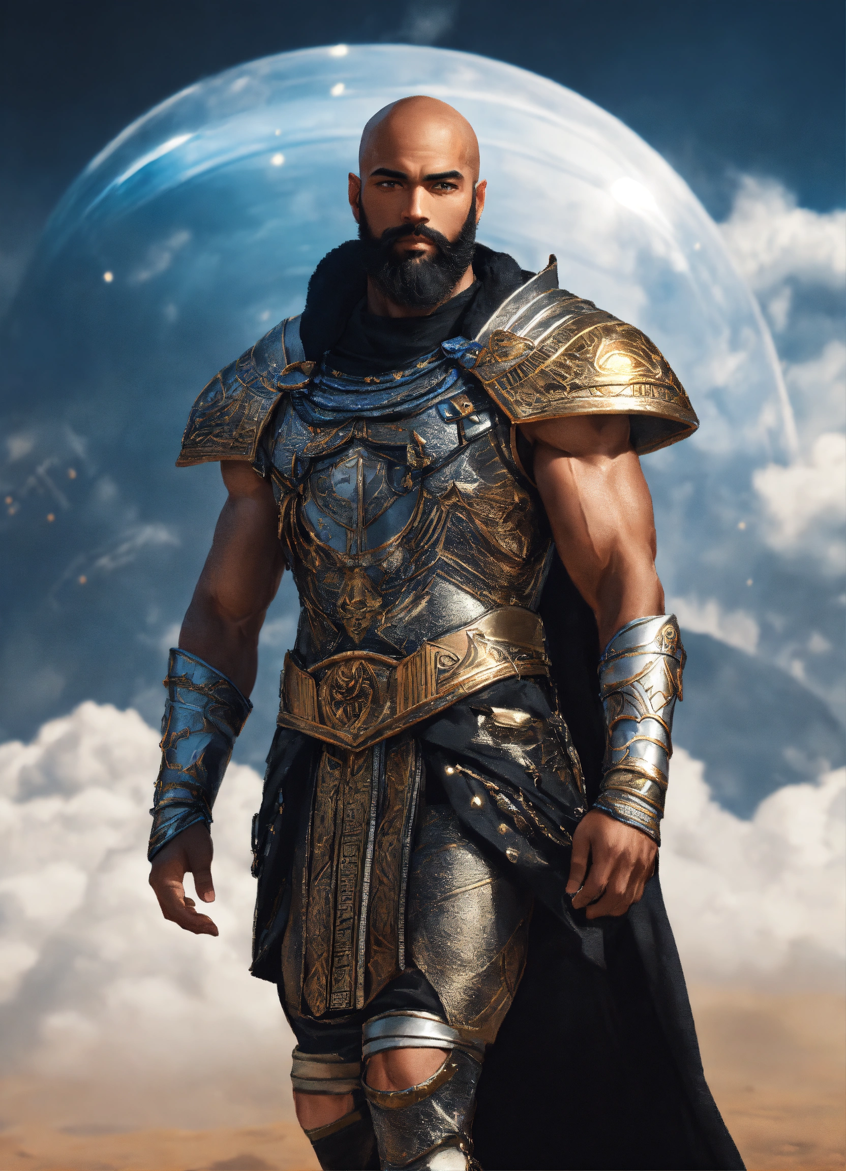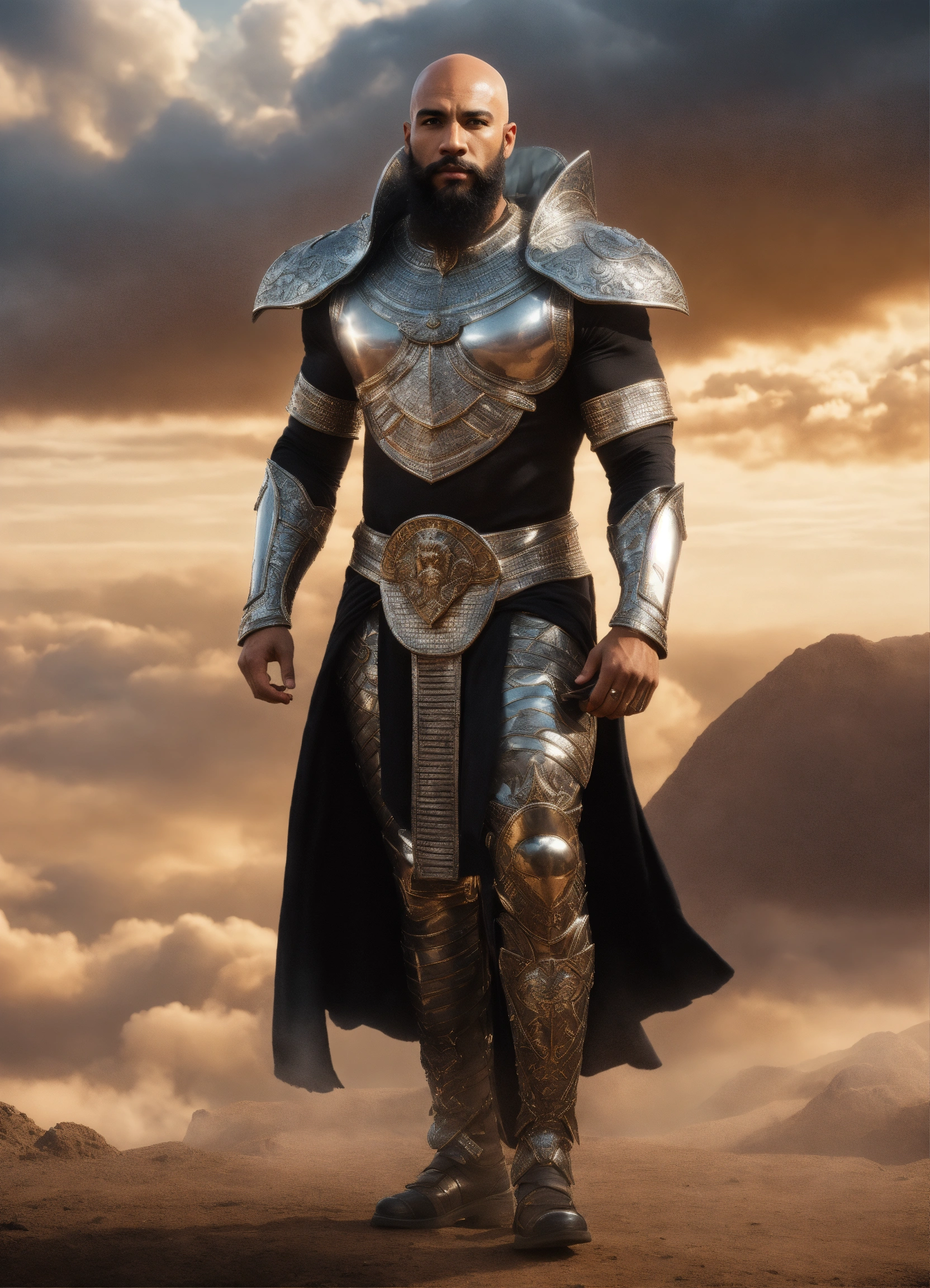 Bald well groomed bearded man, a strong muscular handsome mixed race black god wizard with light brown skin, a strong handsome god with a bald head and short beard, muscular physique wearing futuristic silver and black egyptian armor, walking in the clouds resolution 8k, insanely detailed