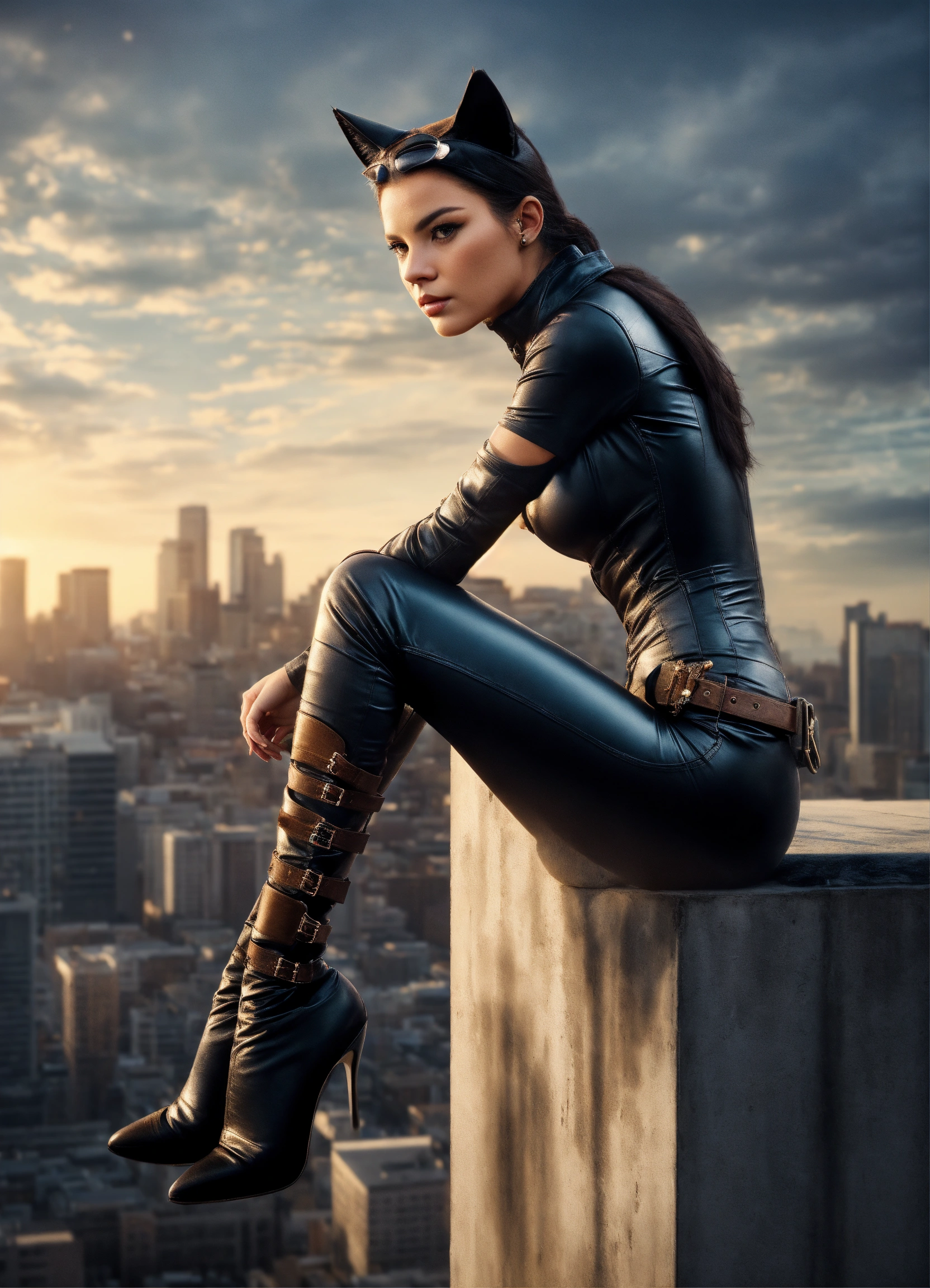 Ultra realistic beautiful cat woman sitting on top of a building over looking the city perfect clarity photorealistic high definition