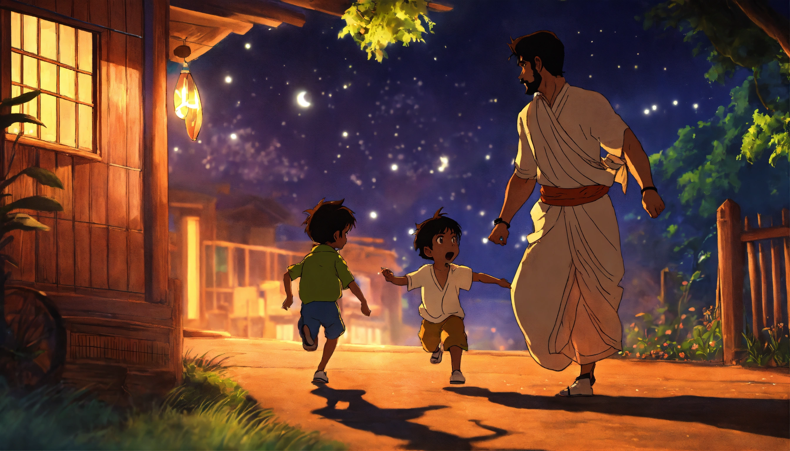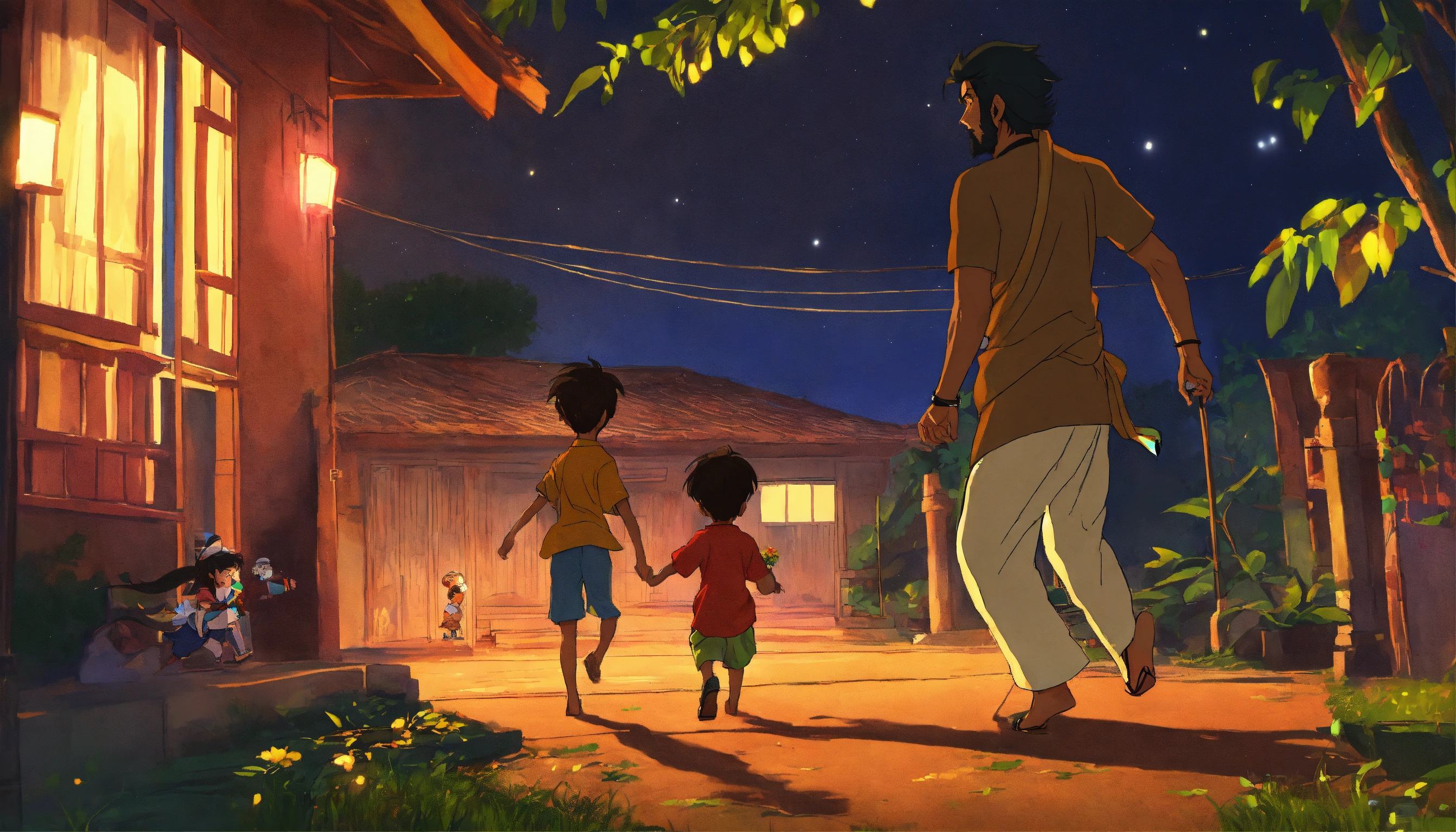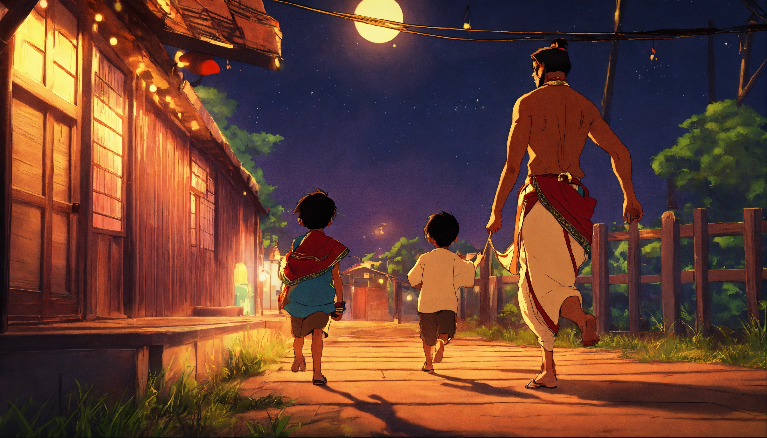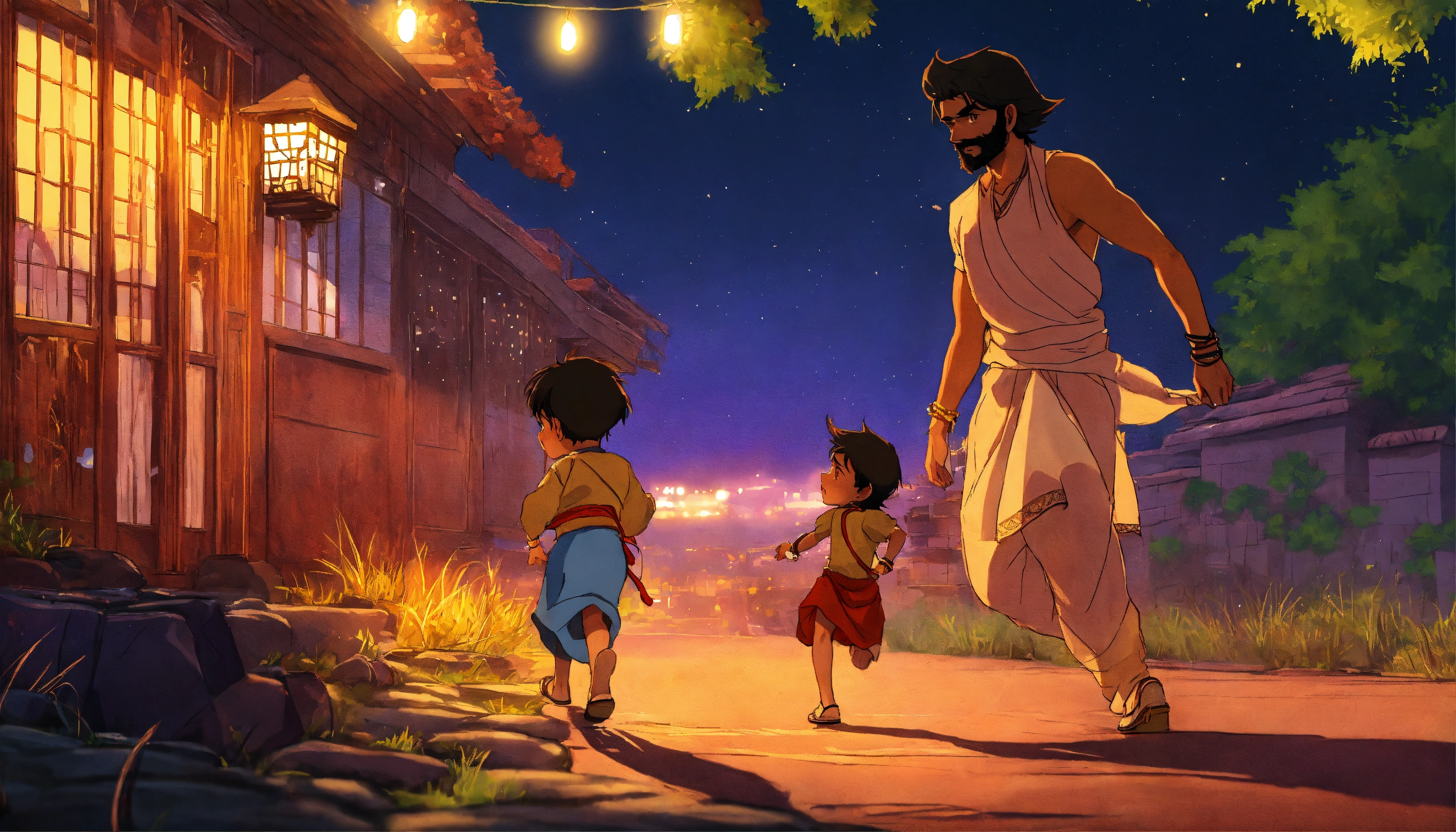 An anime-style picture of a indian dad chasing his little indian boy in the night